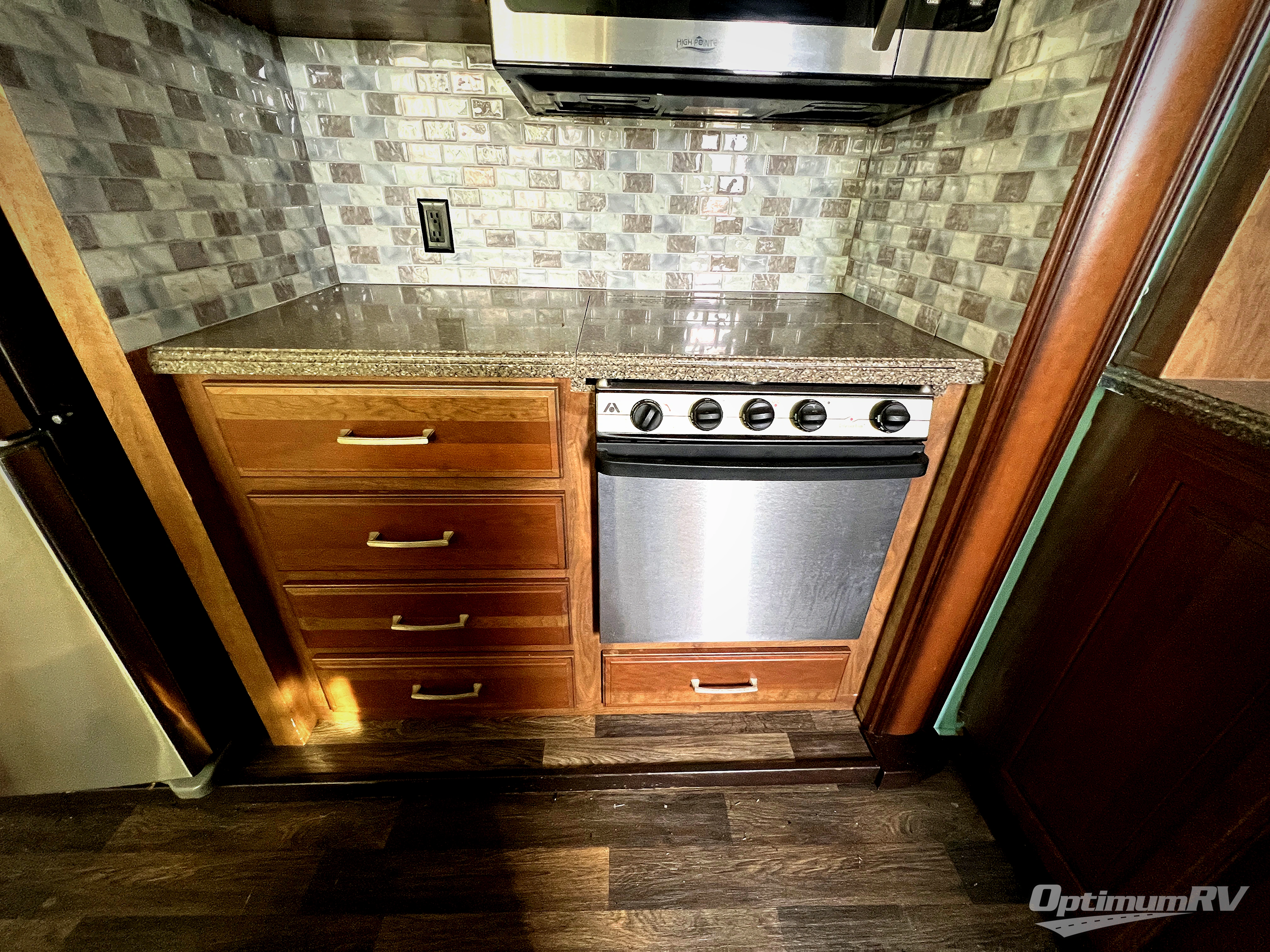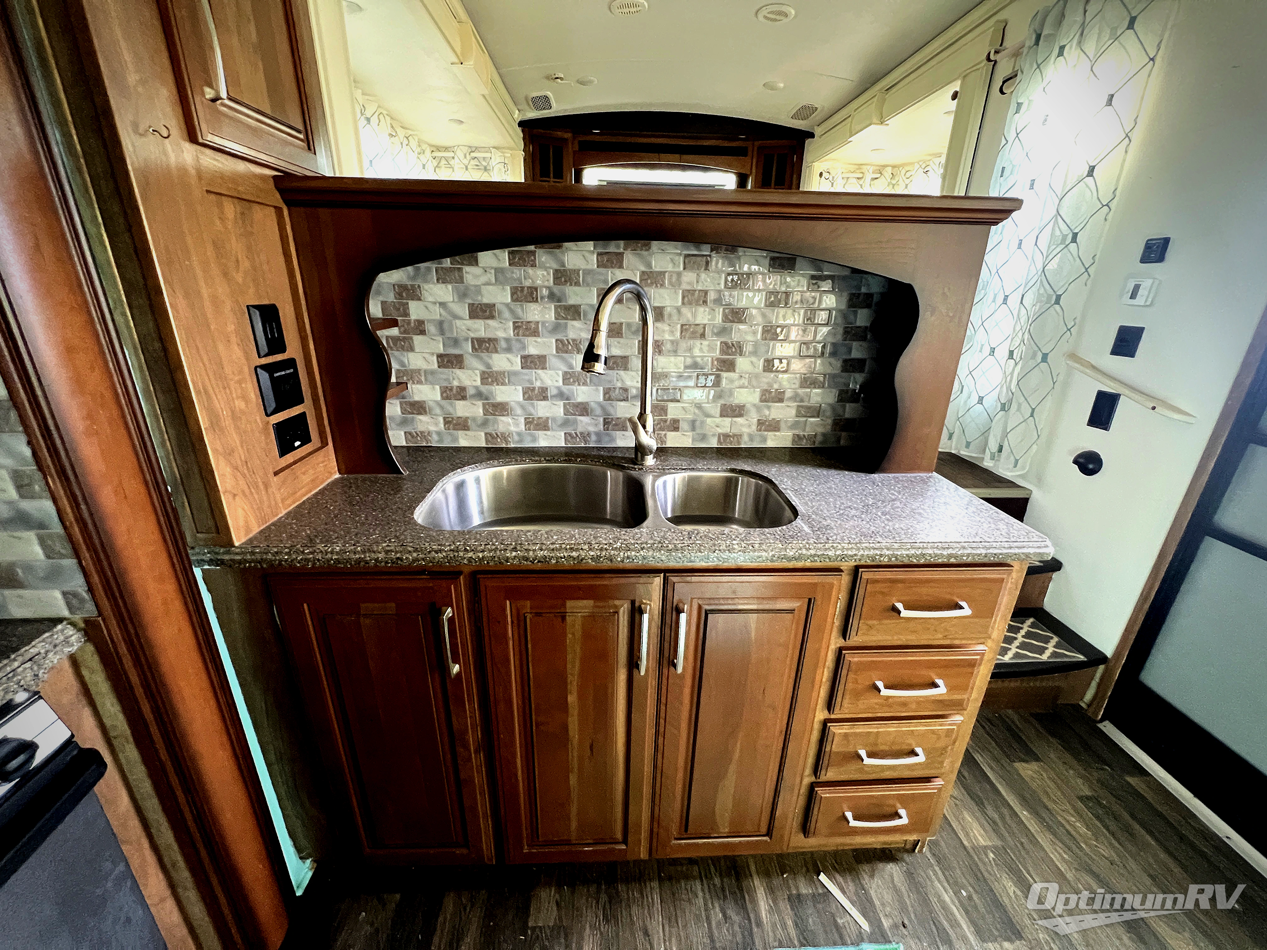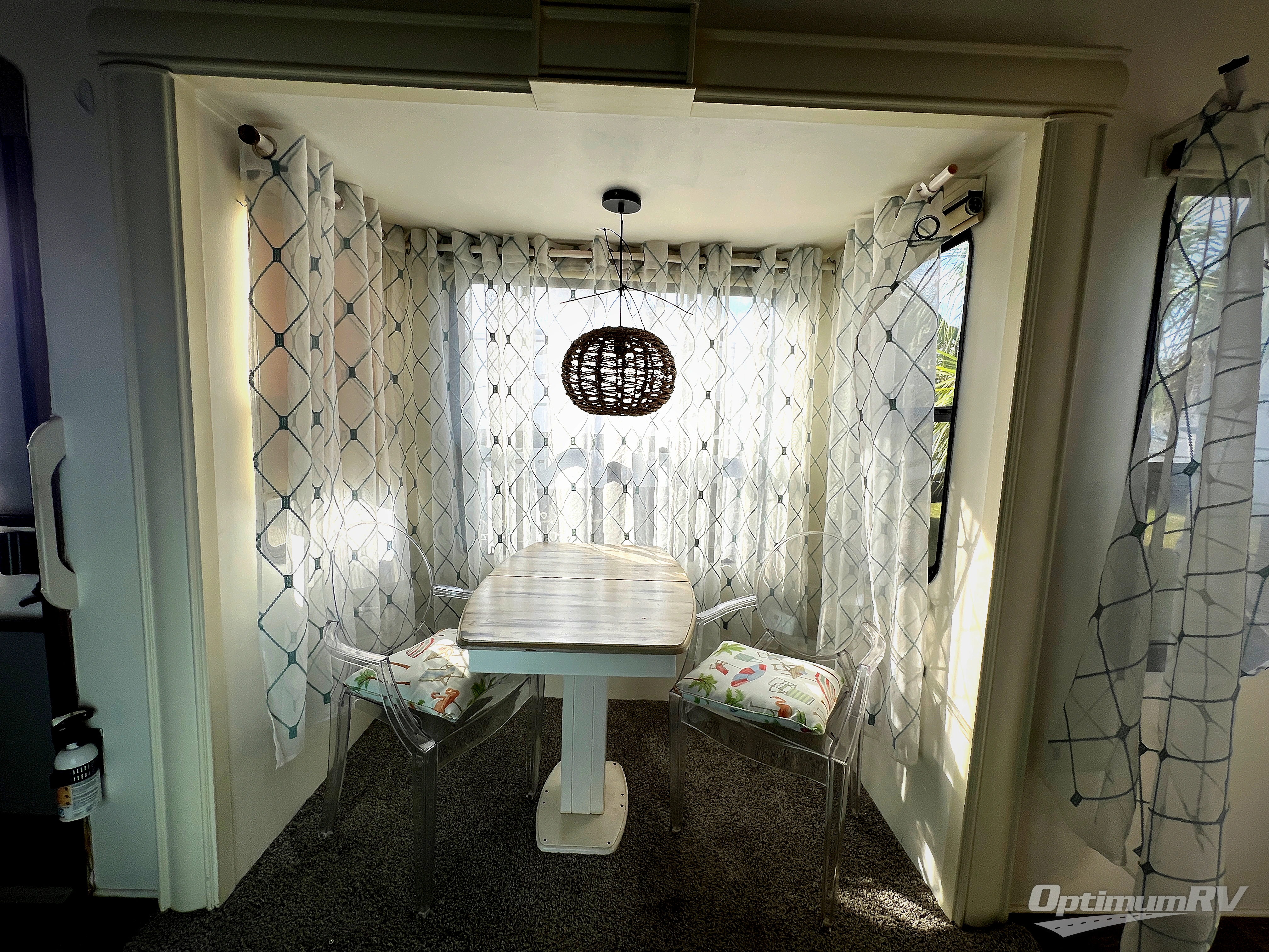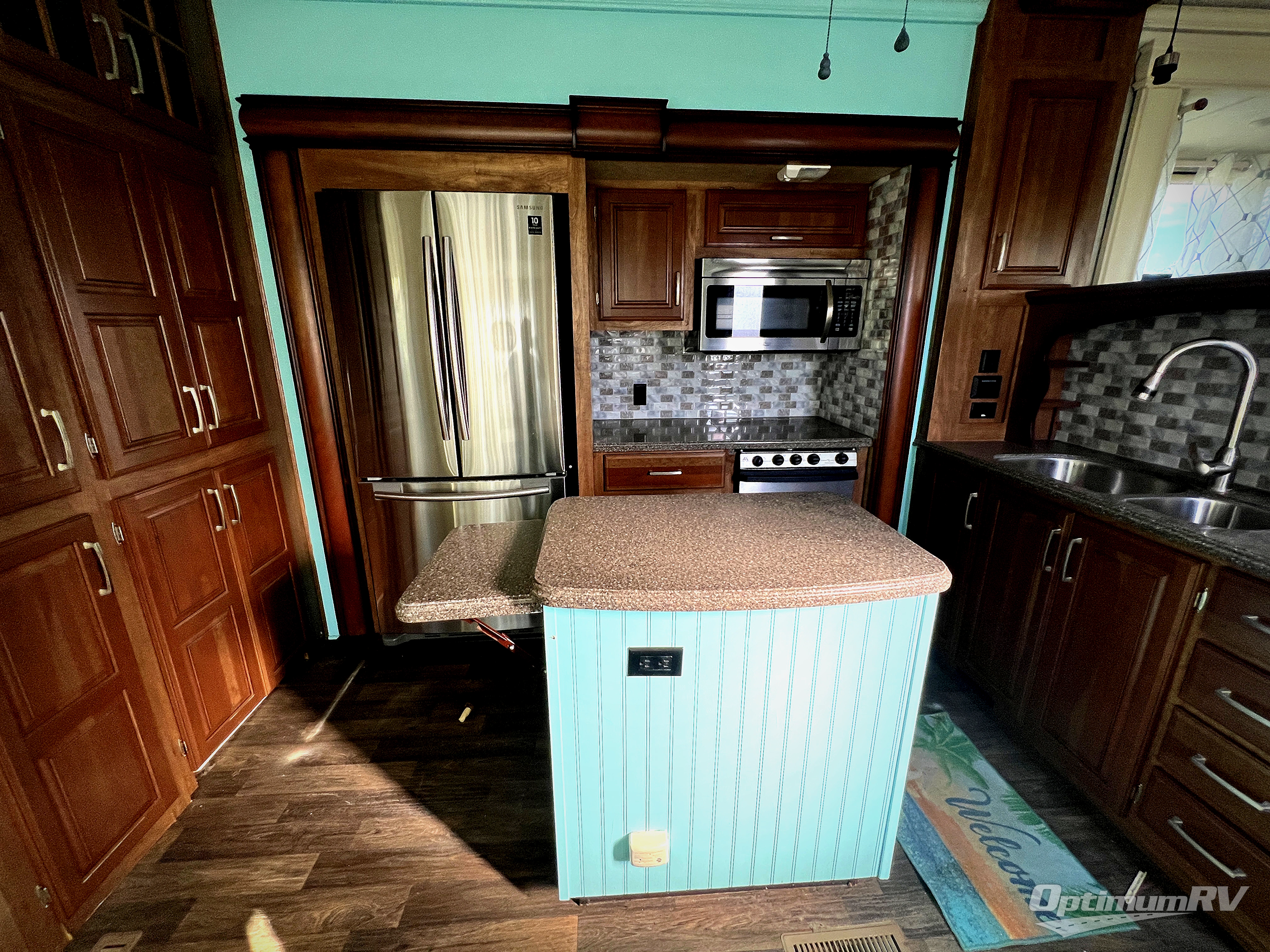 Step inside the centrally located entry door and find yourself in this 3711FL kitchen with dual opposing slides. There is a slide out for the dining table with two chairs to the left of the door. Straight ahead is a counter with double sink, and the slide opposite the door offers a three burner range, counter area, and 18 cu. ft. residential refrigerator. There is a small pantry just off the appliance slide, and a space prepped for a washer and dryer if you choose to add. You will also enjoy the convenient kitchen island which provides added food prep space and more.