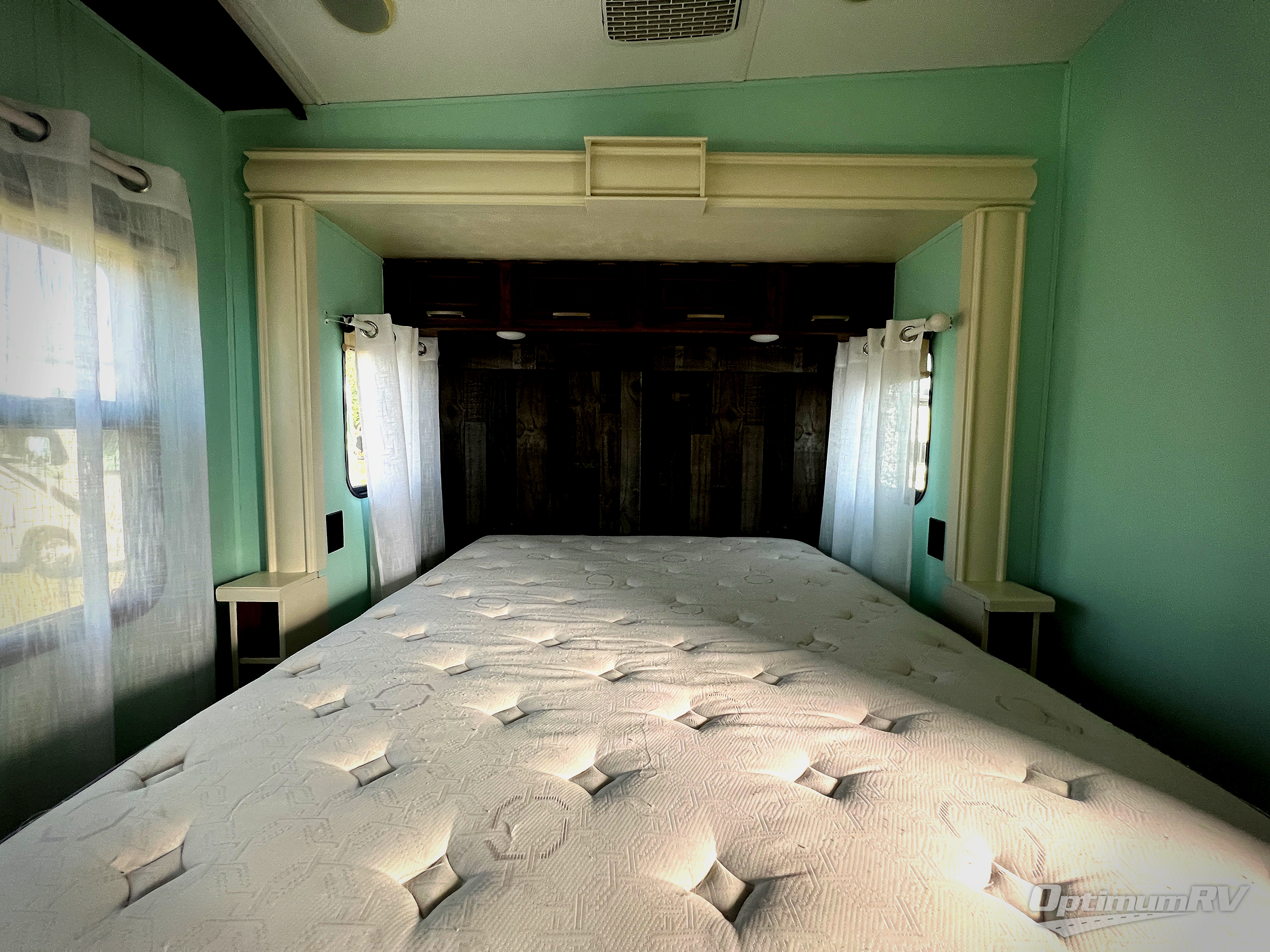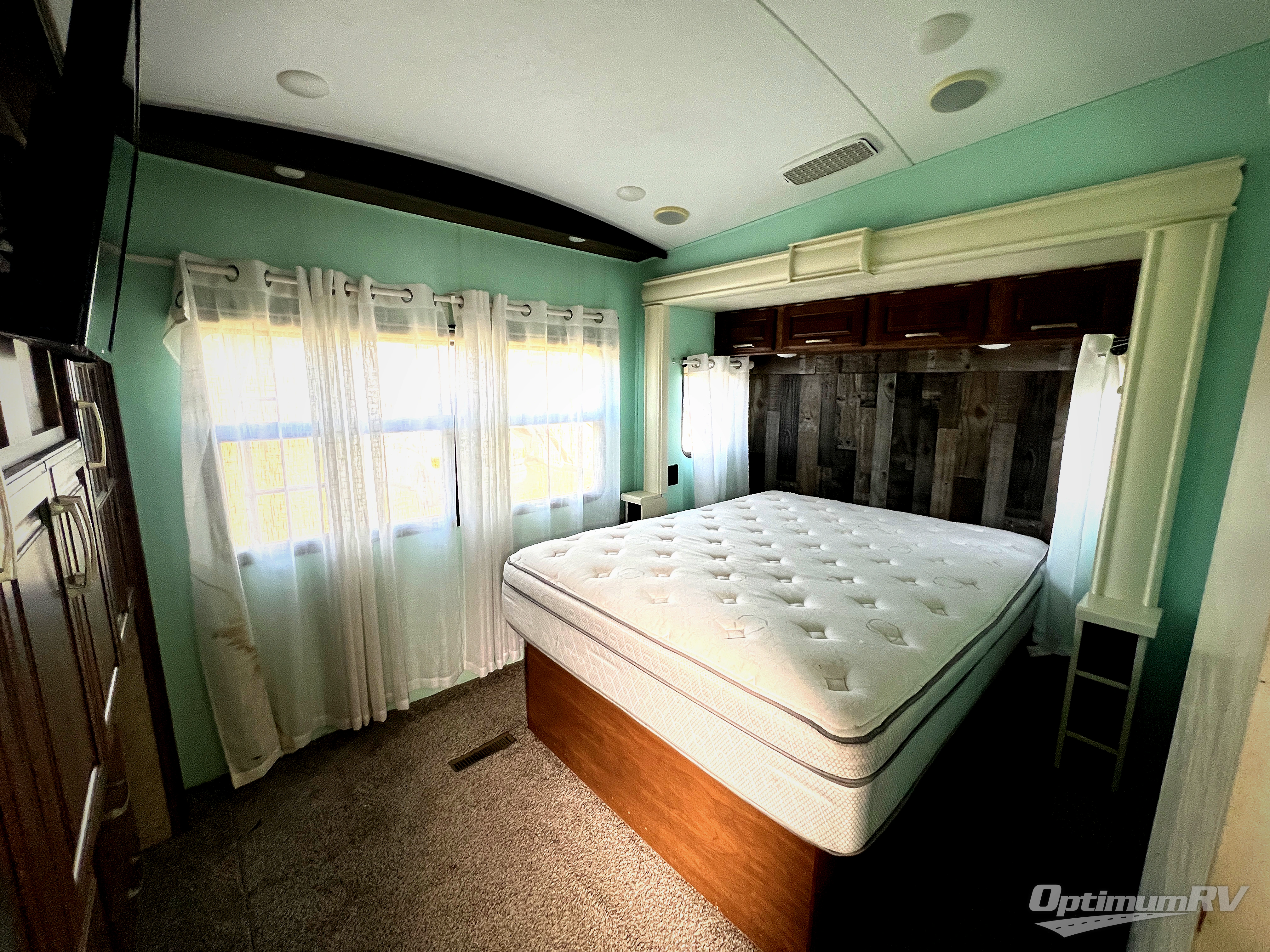 Continue on toward the rear and find a queen bed slide or optional king with storage beneath, and a slide out wardrobe opposite.