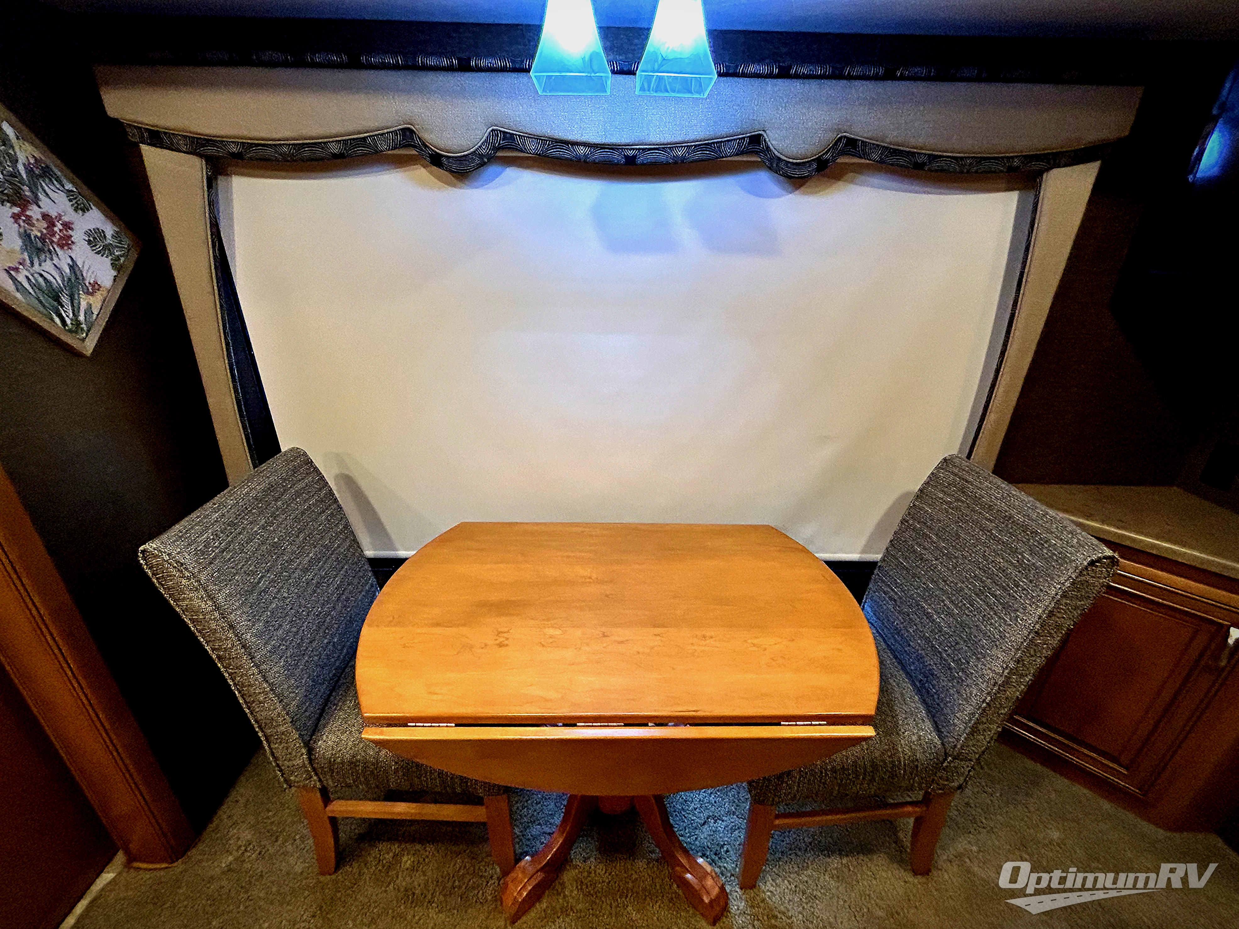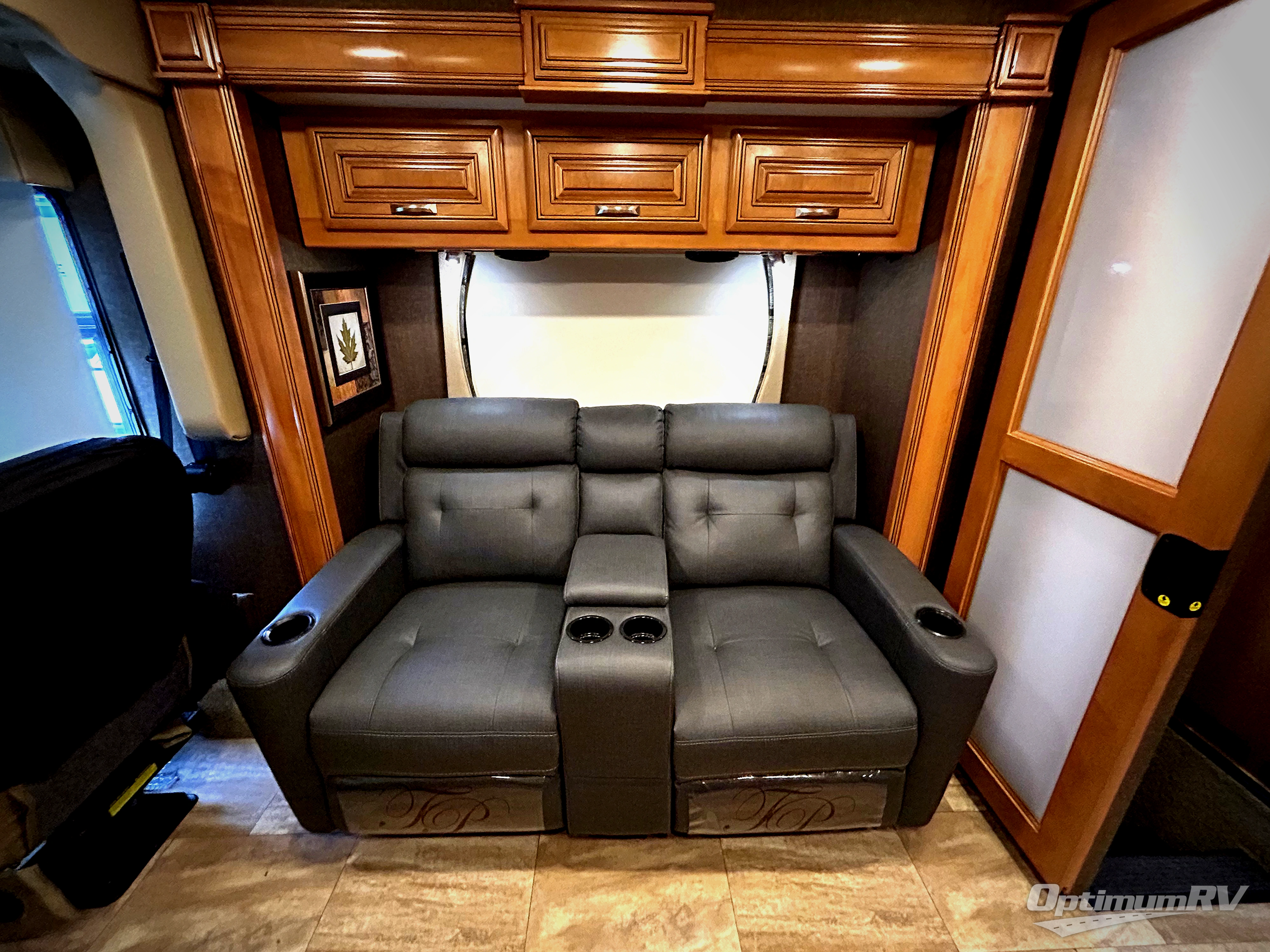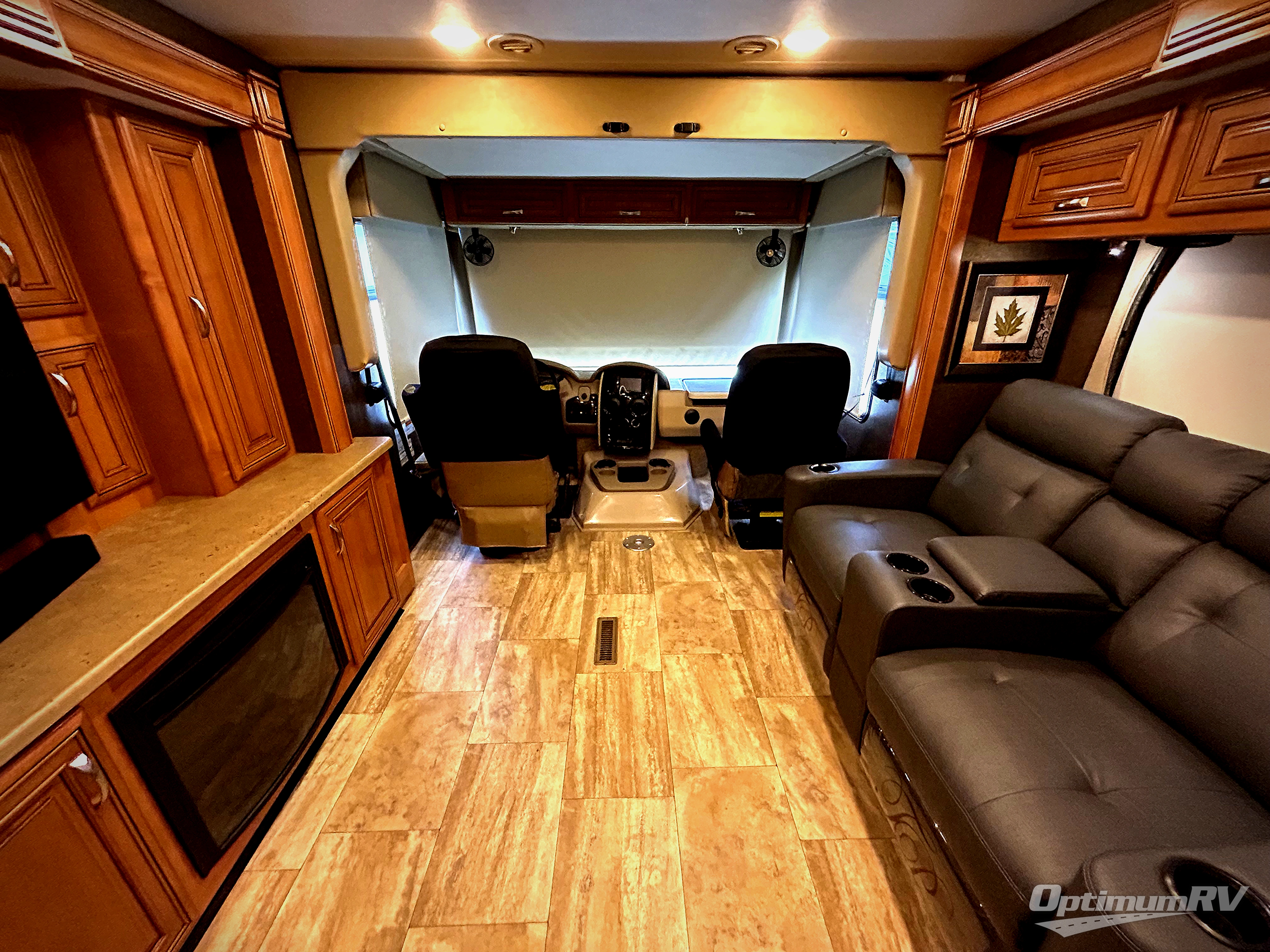 Back up front there is a coffee table between the two captain's chairs. If outside relaxing is something you enjoy, the 32" LED TV is located beside the entry door.
