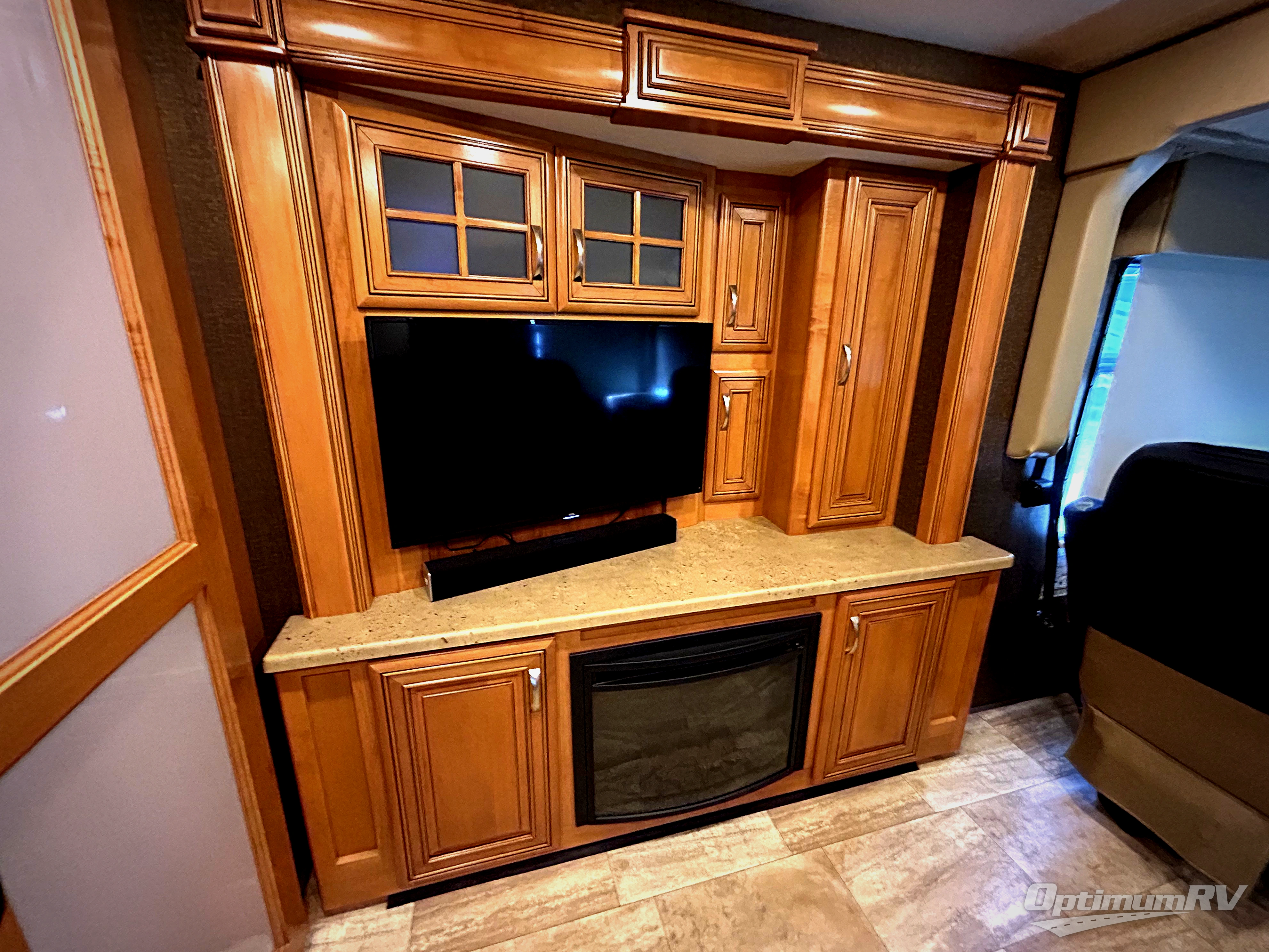 Step inside and find a front living room beyond the cab area featuring dual opposing slides. The door side slide features a sofa with 59" x 75" sleeping area as well as overhead storage. You can choose optional theater seating in place of the sofa. The opposite side features a slide with an electric fireplace with a remote and a 40" LED TV just above. Pocket doors separate the living space from the kitchen for added convenience when using the room for sleeping space. There is also an drop-down overhead bunk above the cab area for even more sleeping space for guests.