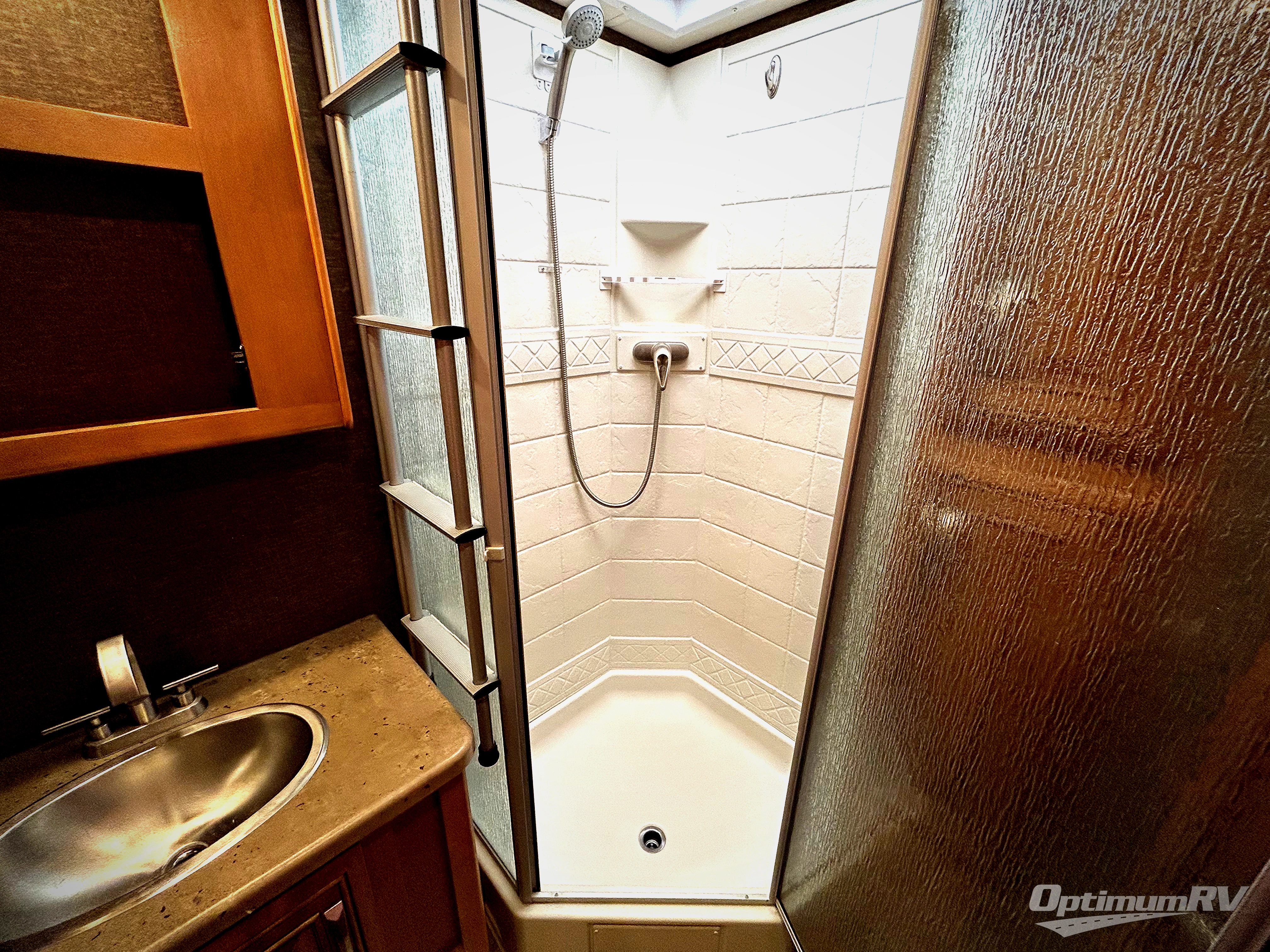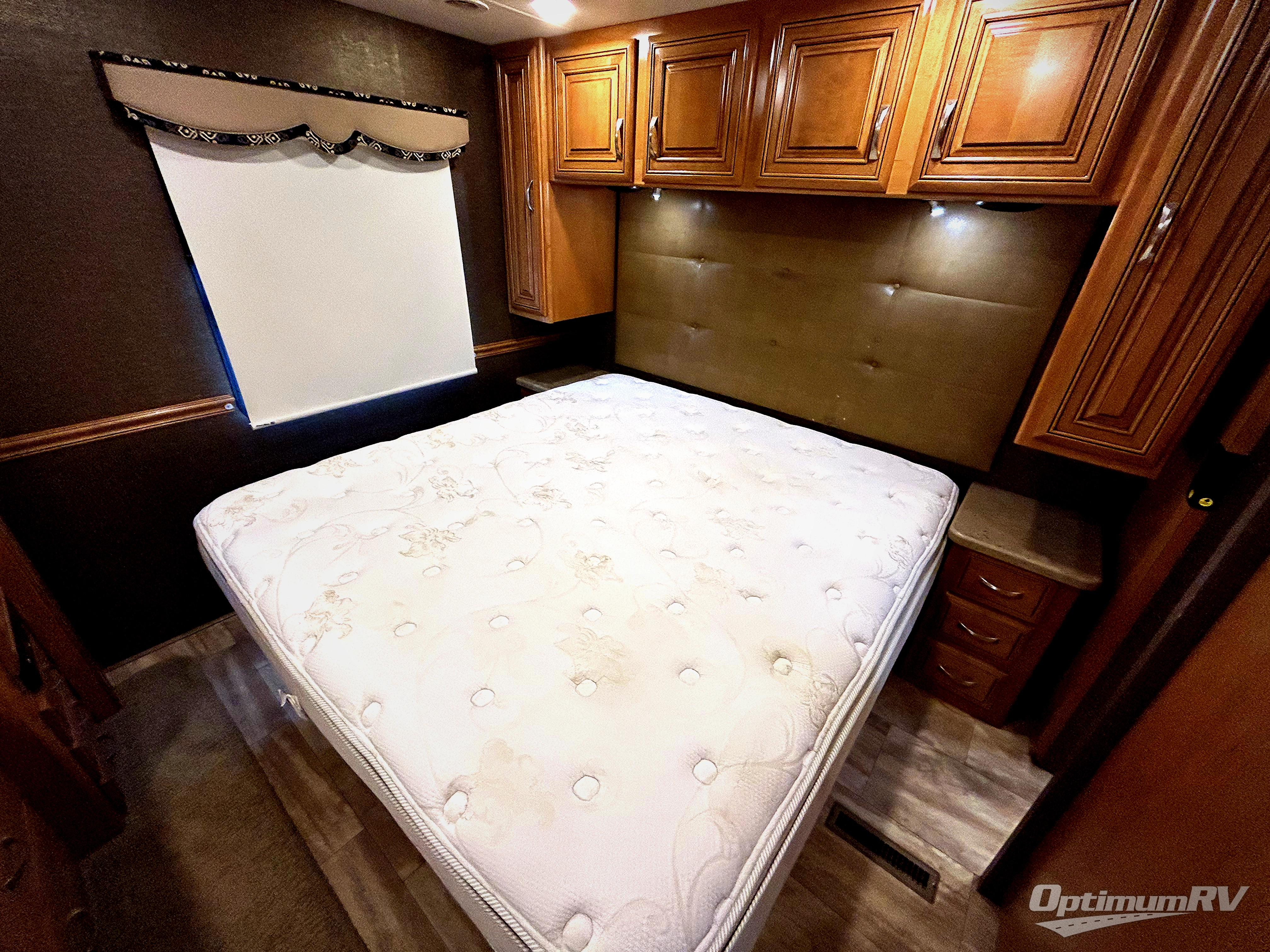 The rear bedroom features a king size bed with nightstands on either side. The master bath is accessible from within the bedroom or from the dining area. The bath features a 34" x 34" angled shower, a toilet, a sink with overhead cabinet, and linen cabinet too.