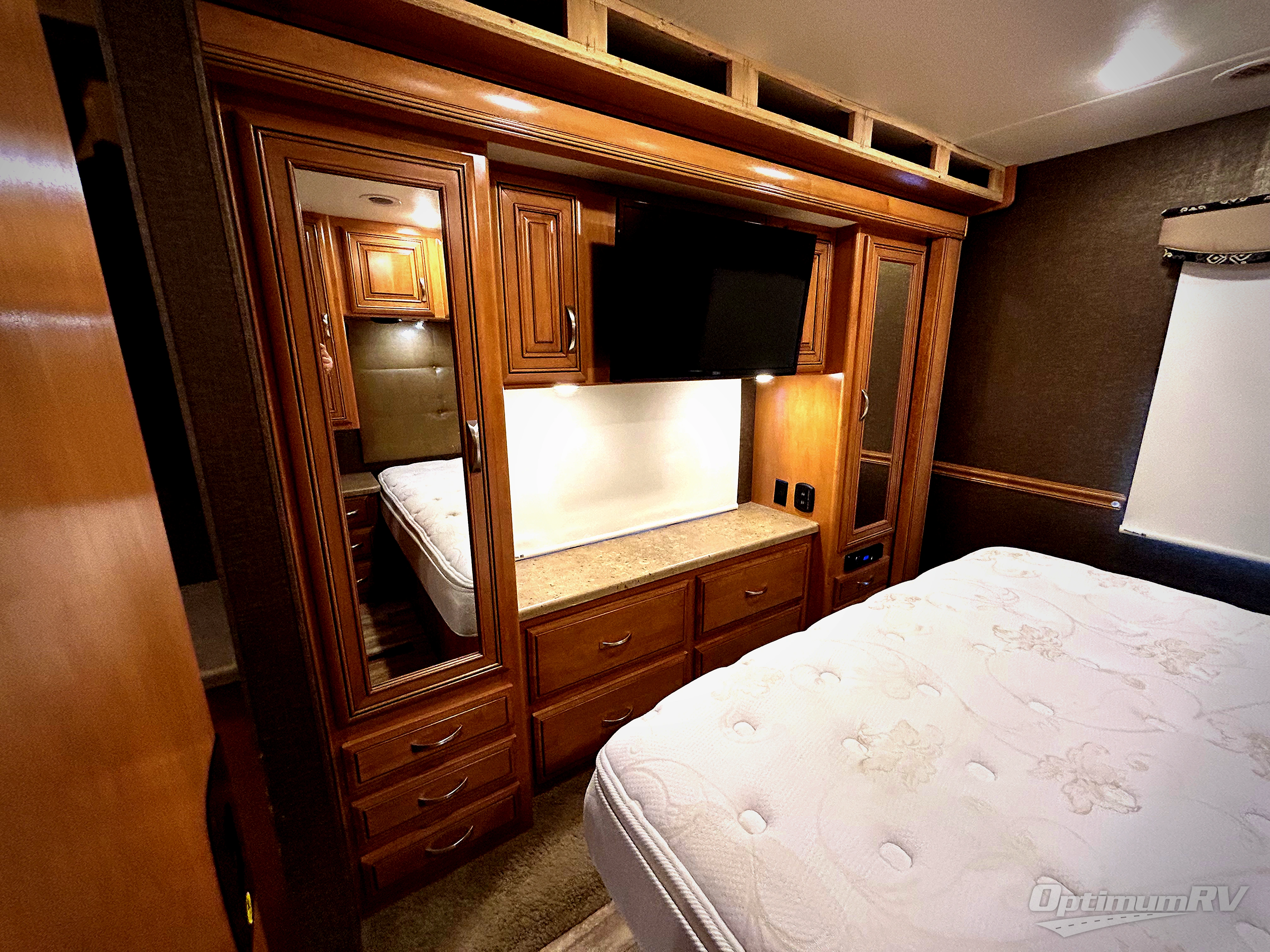 A slide out with a free standing round dinette table and corner 28" LED TV will seat four comfortably while eating, playing games, or watching shows. The rest of the slide continues into the bedroom. This slide features closets on both sides of the dresser with a 32" TV above.