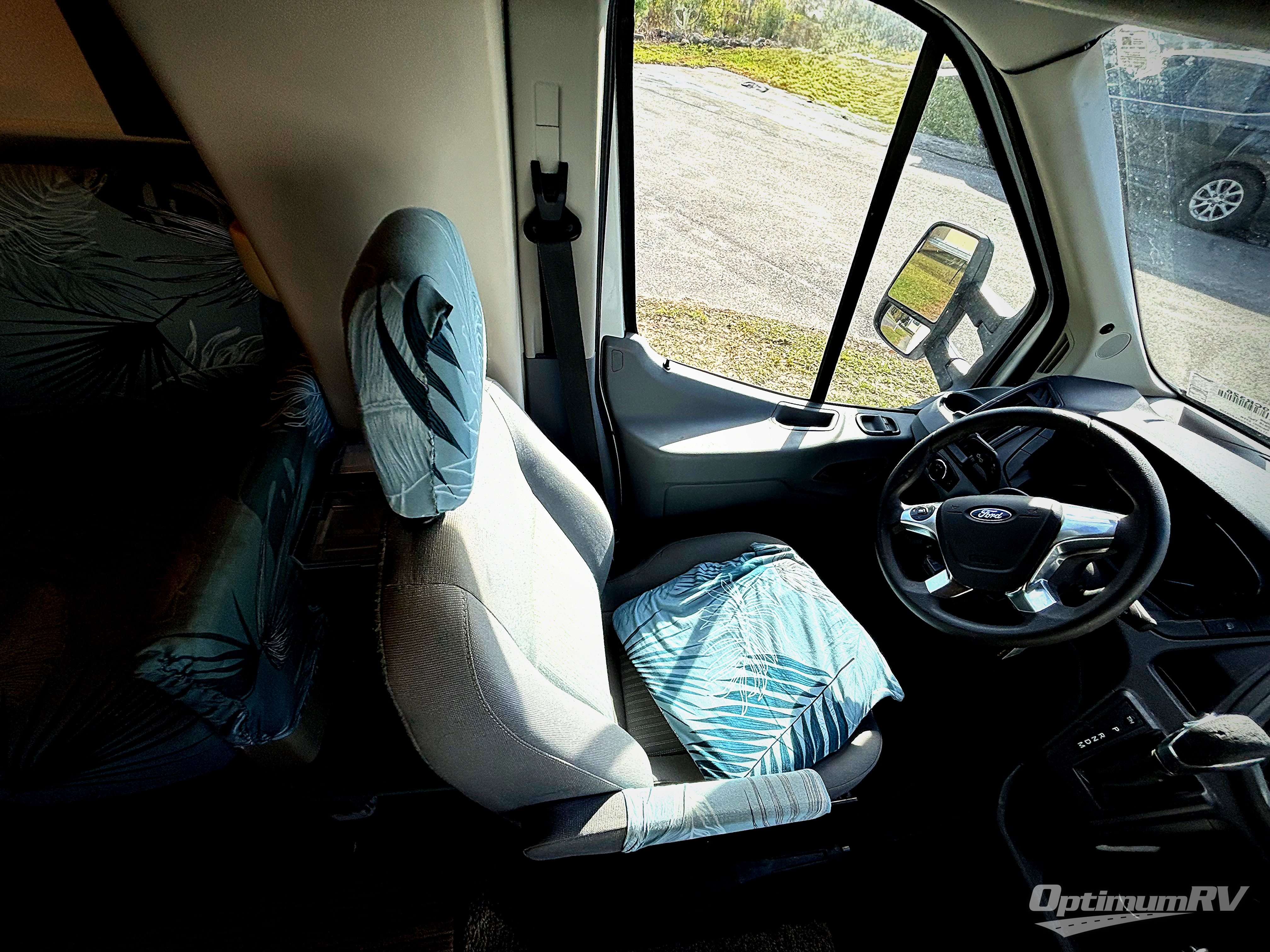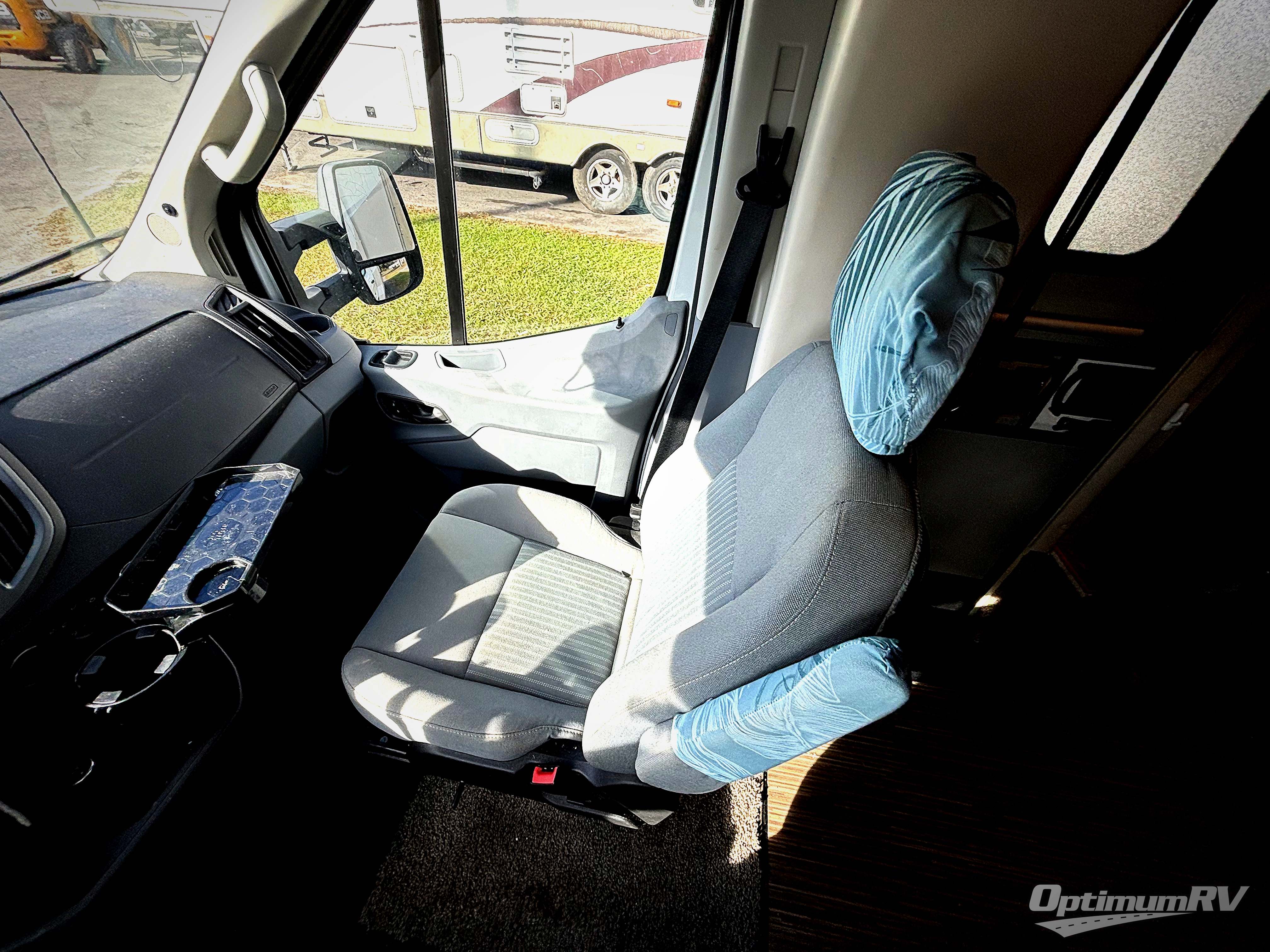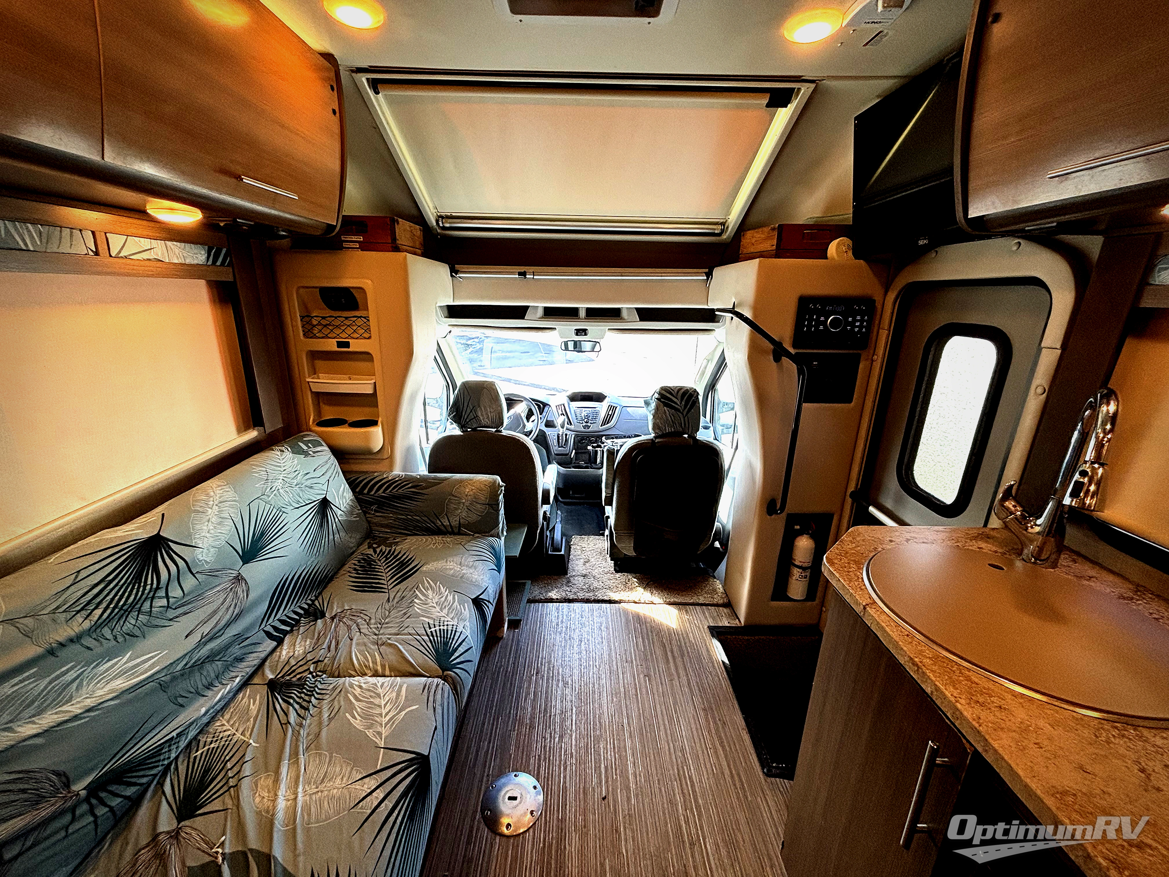Enter in front behind the passenger seat and notice a 32" LED TV overhead. This can easily be viewed from the sofa opposite. There are two sets of seat belts for your rear travelers, and the sofa can easily be turned into a 42" x 64" sleeping space for on board campers or overnight guests. A removable pedestal table creates a nice dining space up front. Plus there is a built-in skylight over the cab area providing more natural light inside.