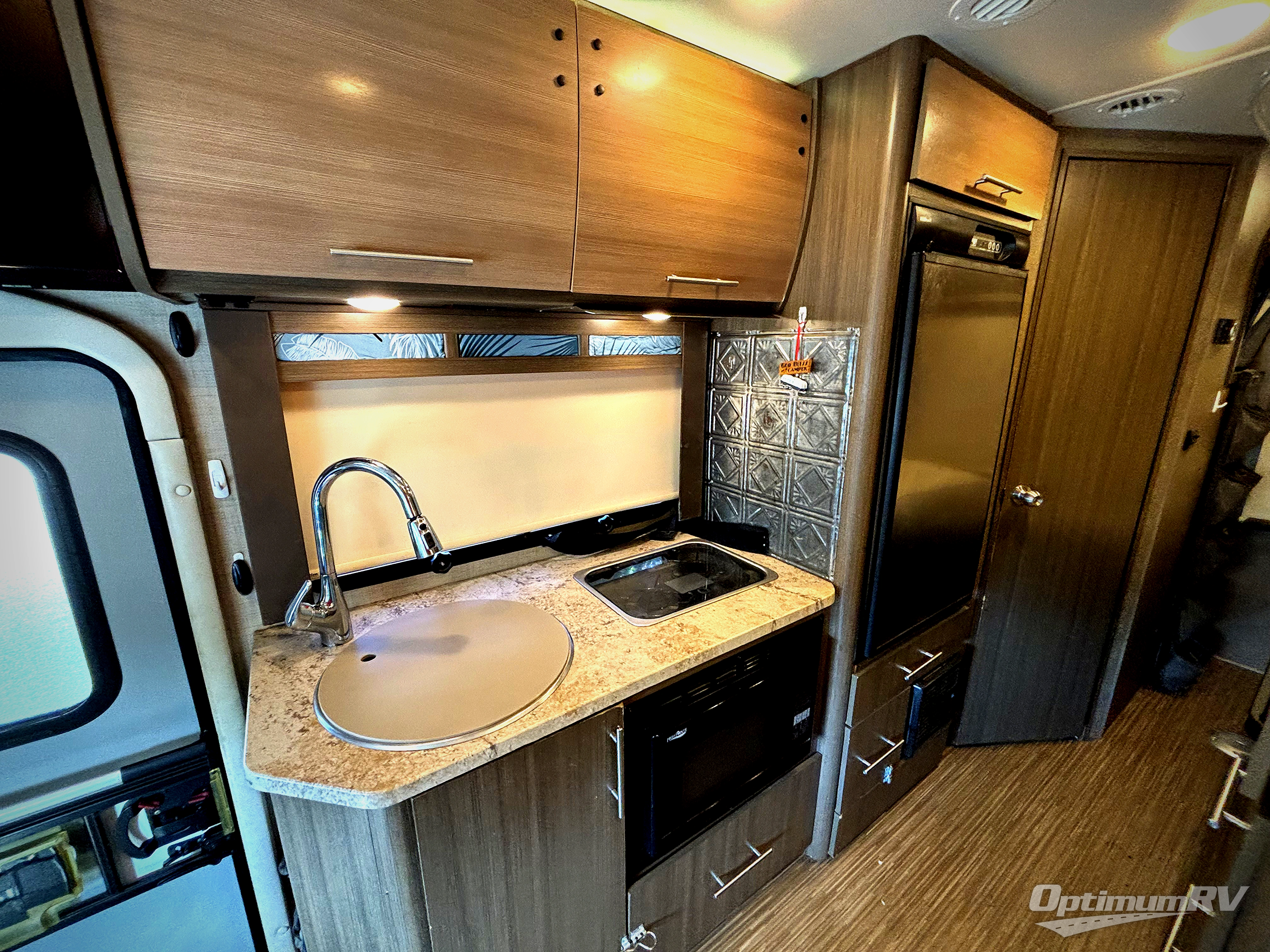 To the left of the entrance enjoy cooking and preparing light meals and snacks with a two burner cook-top, convection microwave oven, overhead cabinets, refrigerator, and round kitchen sink. There are ample overhead cabinets for stowing away your dishes and things.