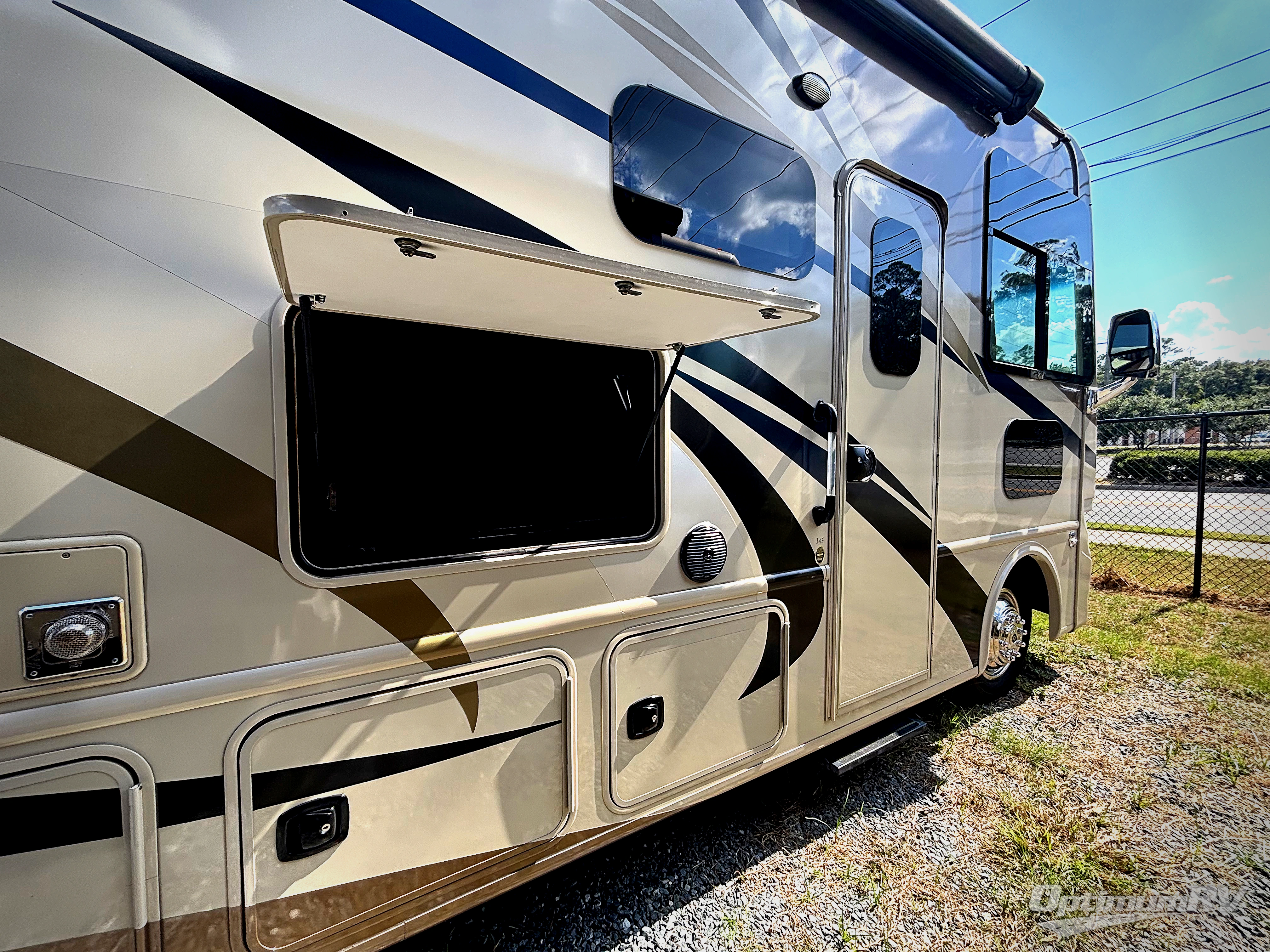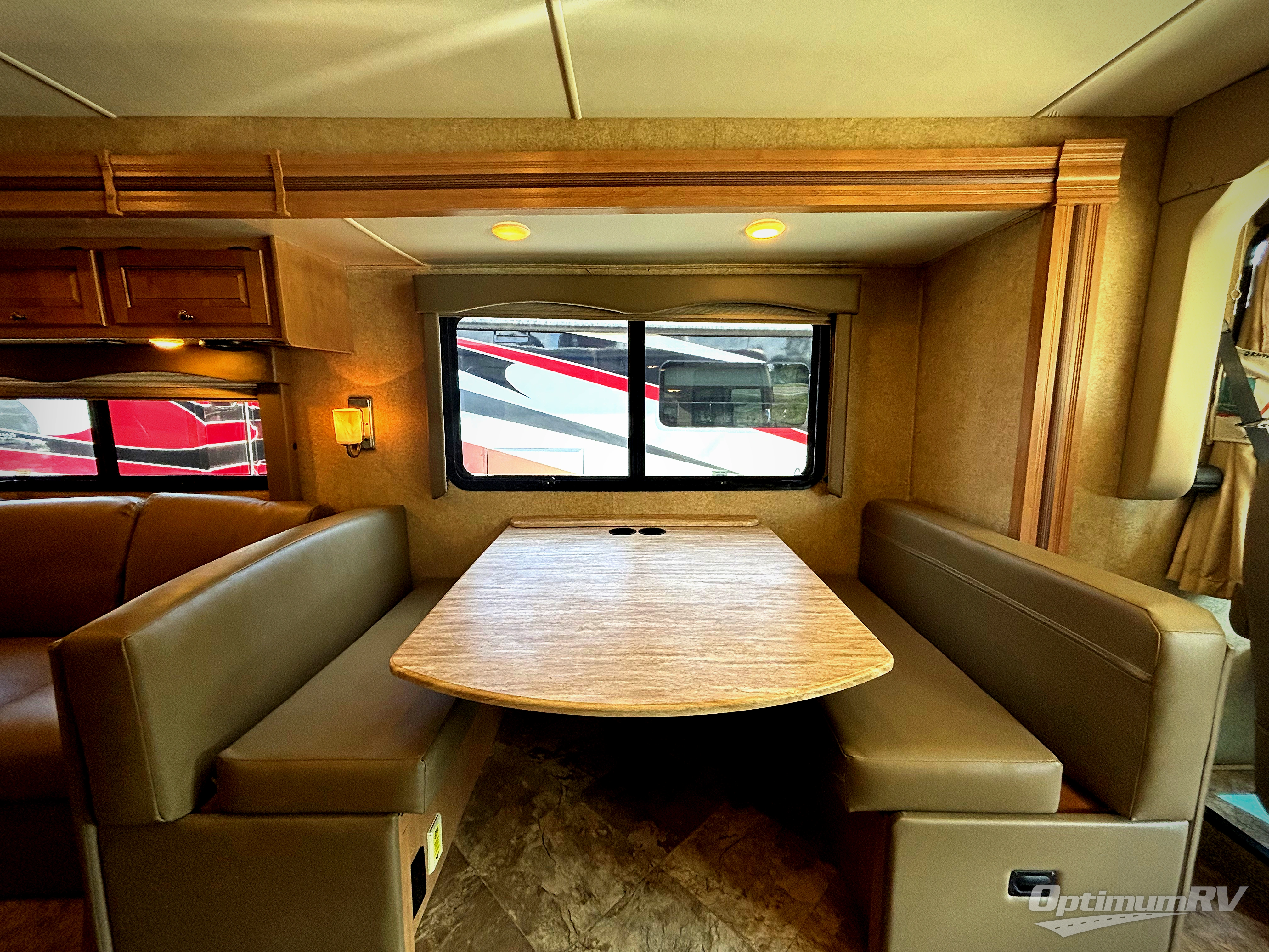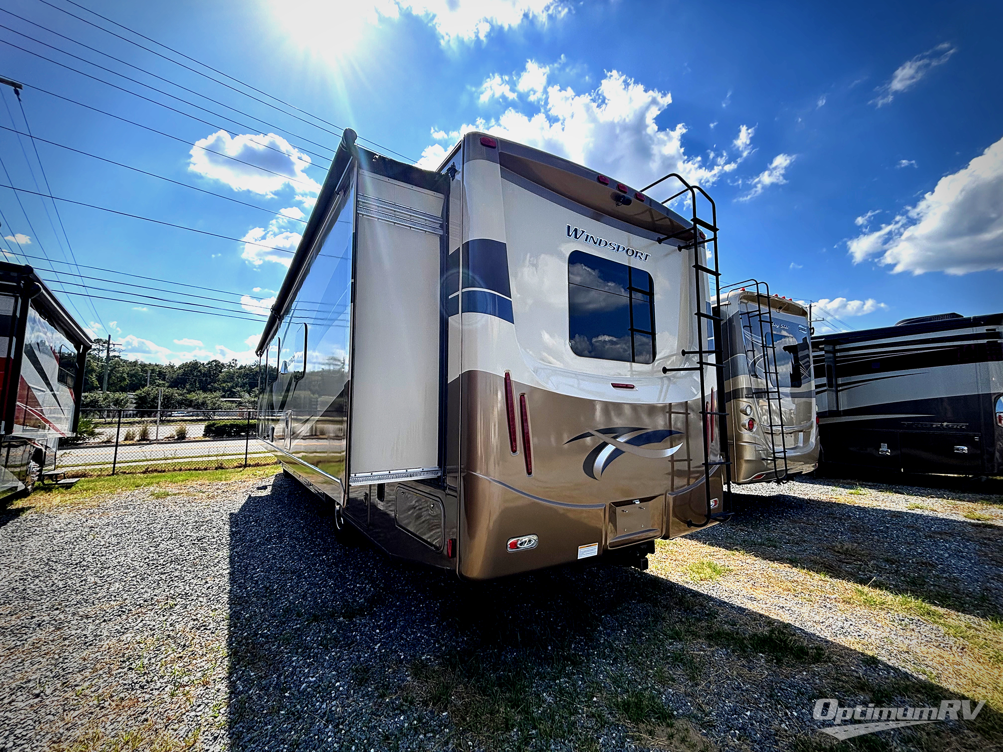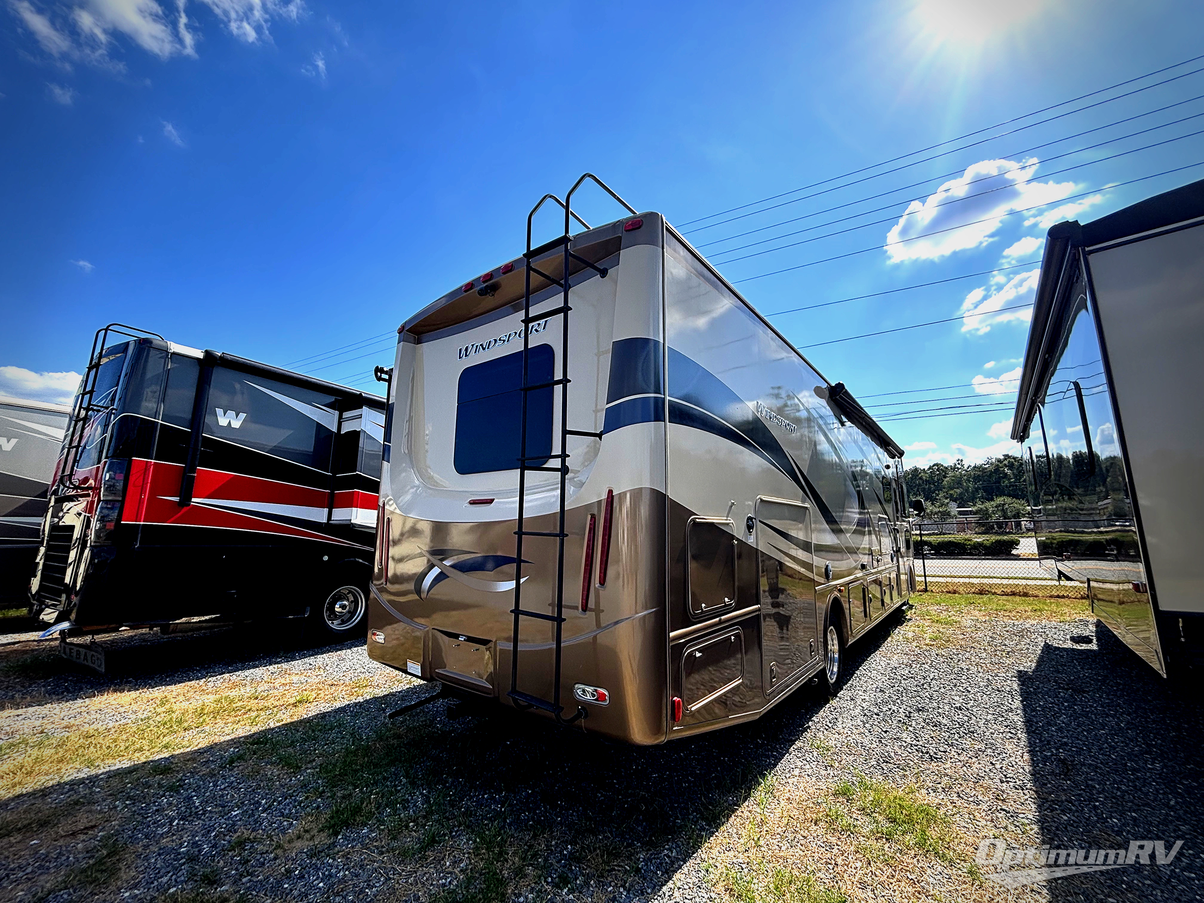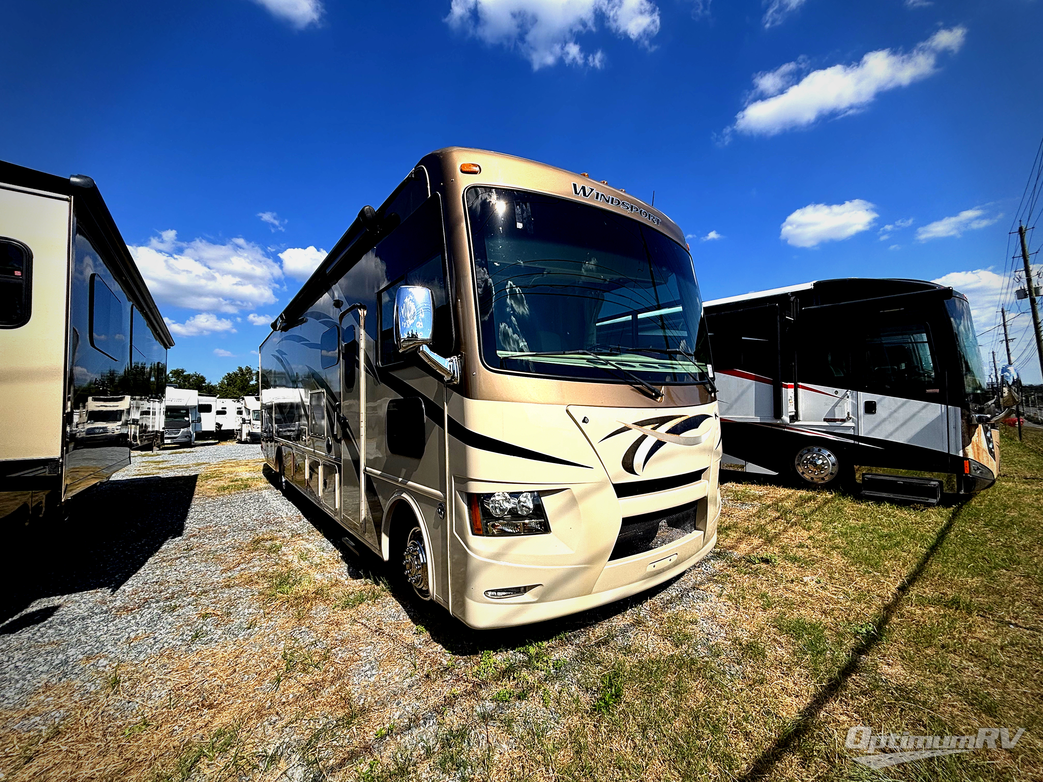 As you enter this Windsport 34F class A gas motor home by Thor Motor Coach, you will notice a full wall slide out along the driver's side that opens up this whole unit. Within the living area, there is a dream dinette, and a sofa with air bed along with overhead cabinets. Just beyond the sofa there are two wardrobes, one that includes washer and dryer prep.