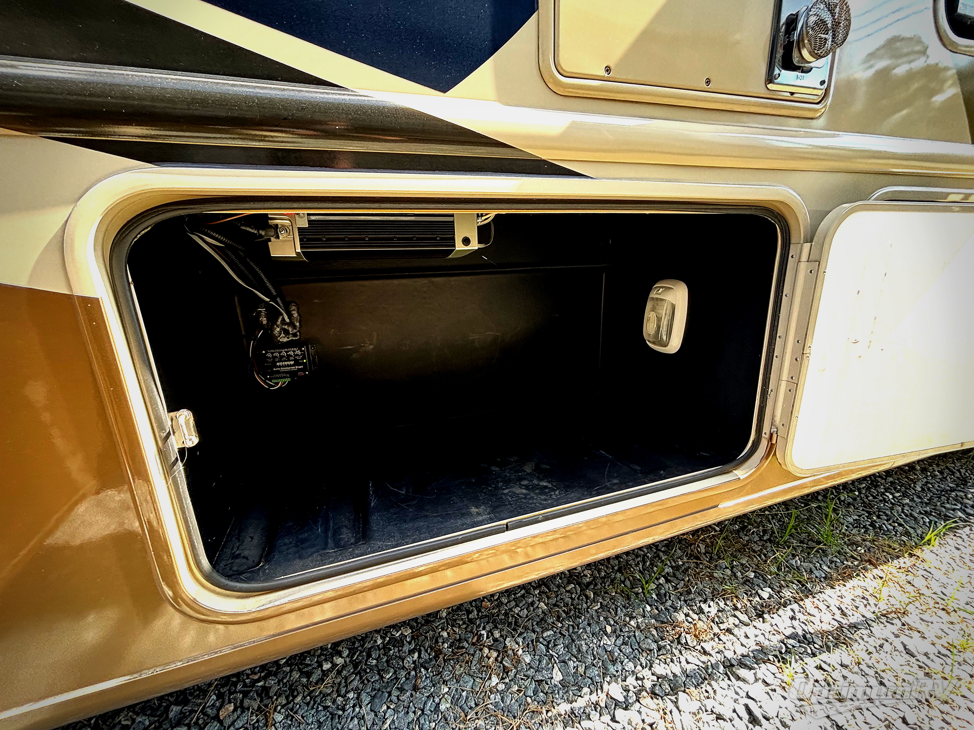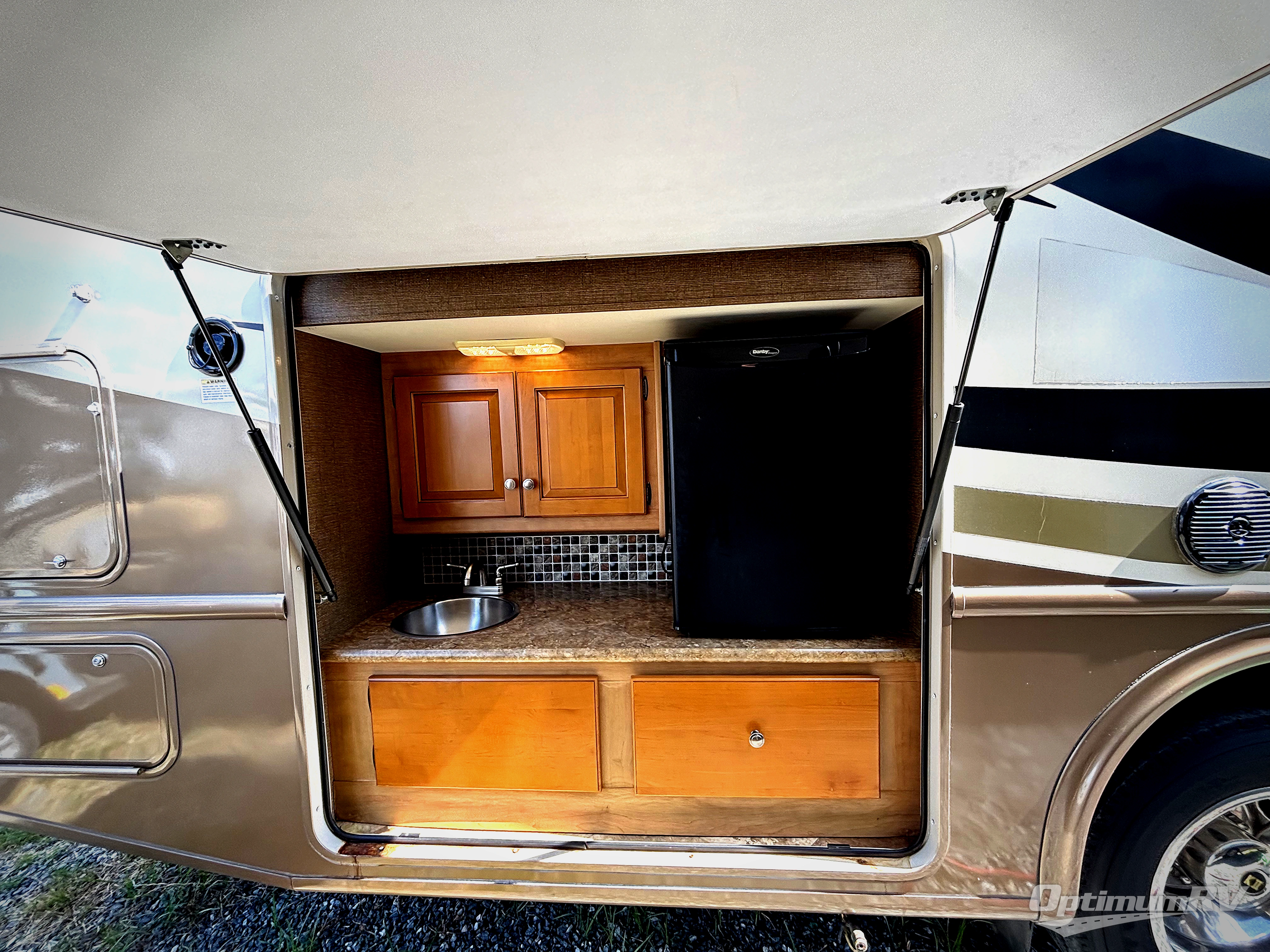 If you enjoy cooking in the outdoors, the optional exterior kitchen includes a 2.6 cu. ft. refrigerator, a sink, portable gas grill, and 1800 watt inverter, plus there is much more to enjoy outside and inside this coach.
