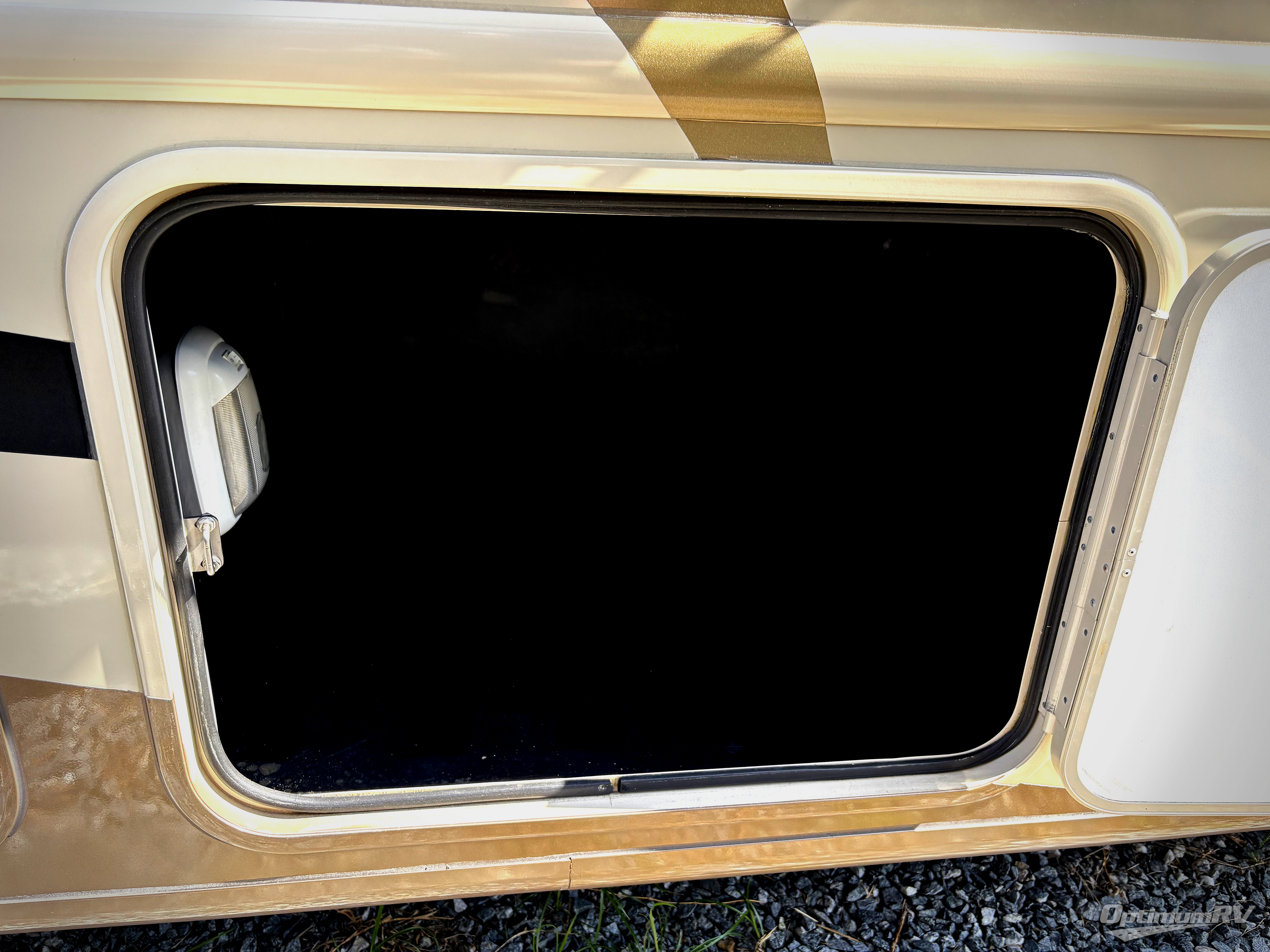 Across the front, you may use the drop-down overhead bunk above the cab area for additional sleeping space. A coffee table is in between the two captain's chairs for additional eating or table top space.