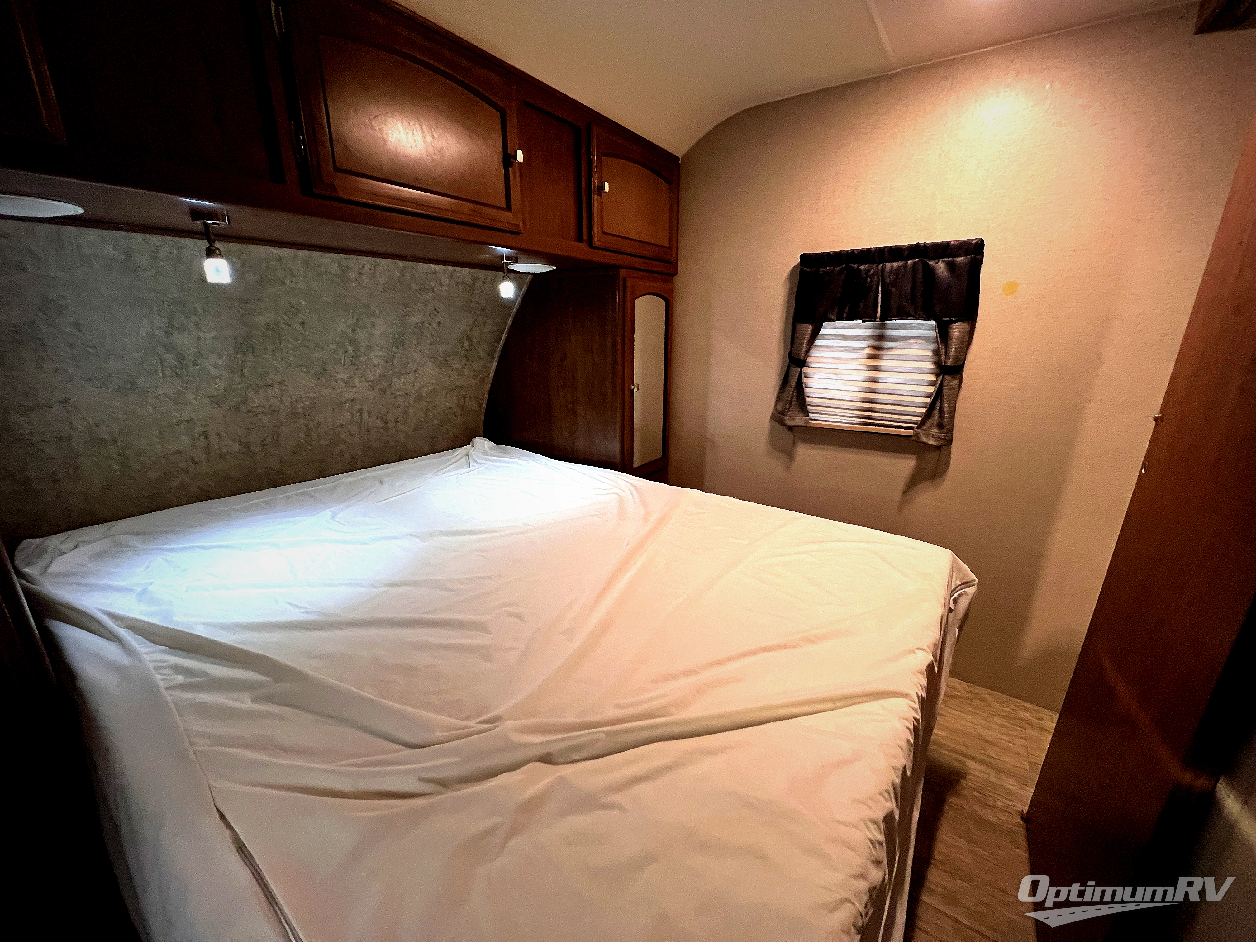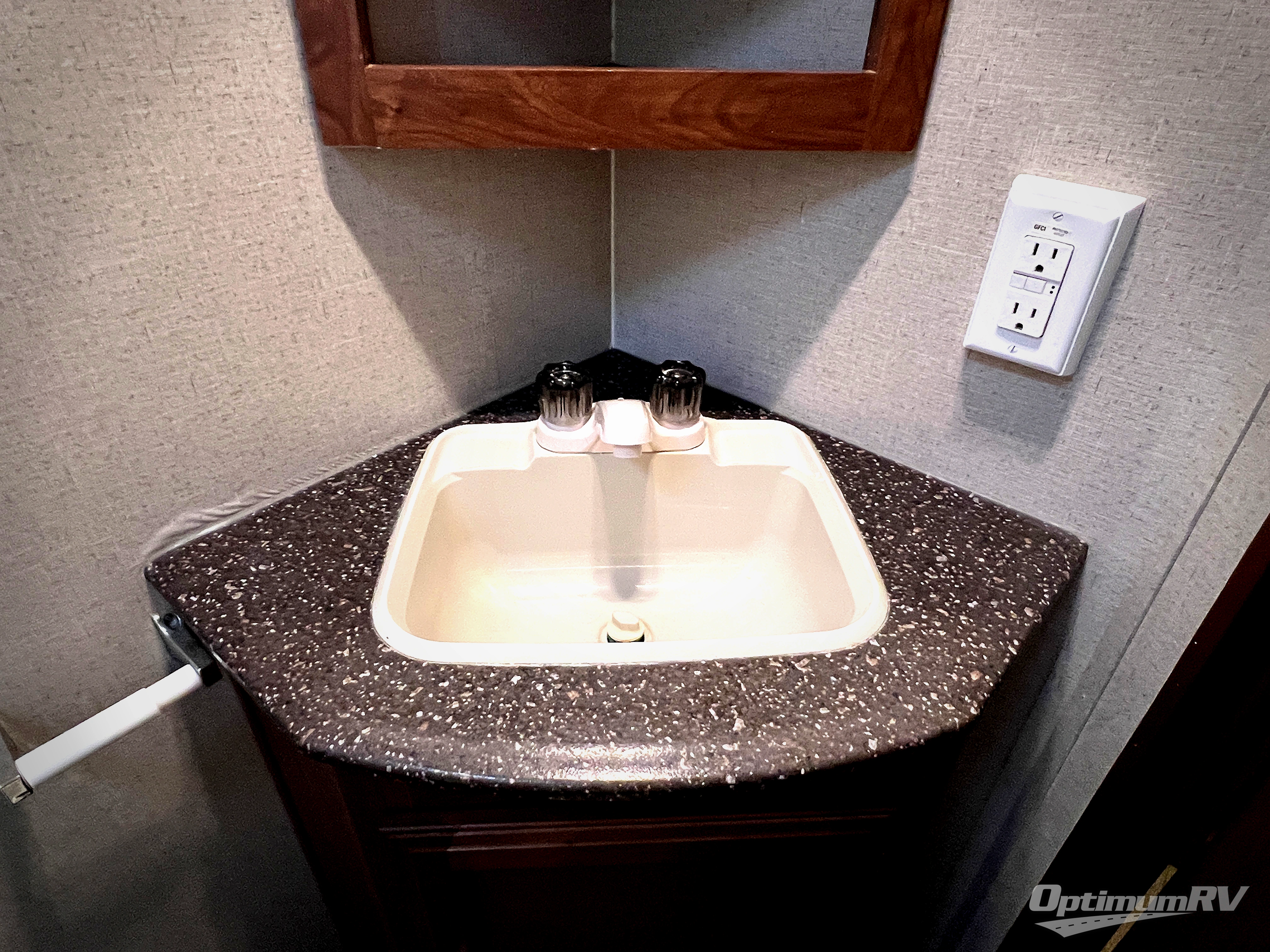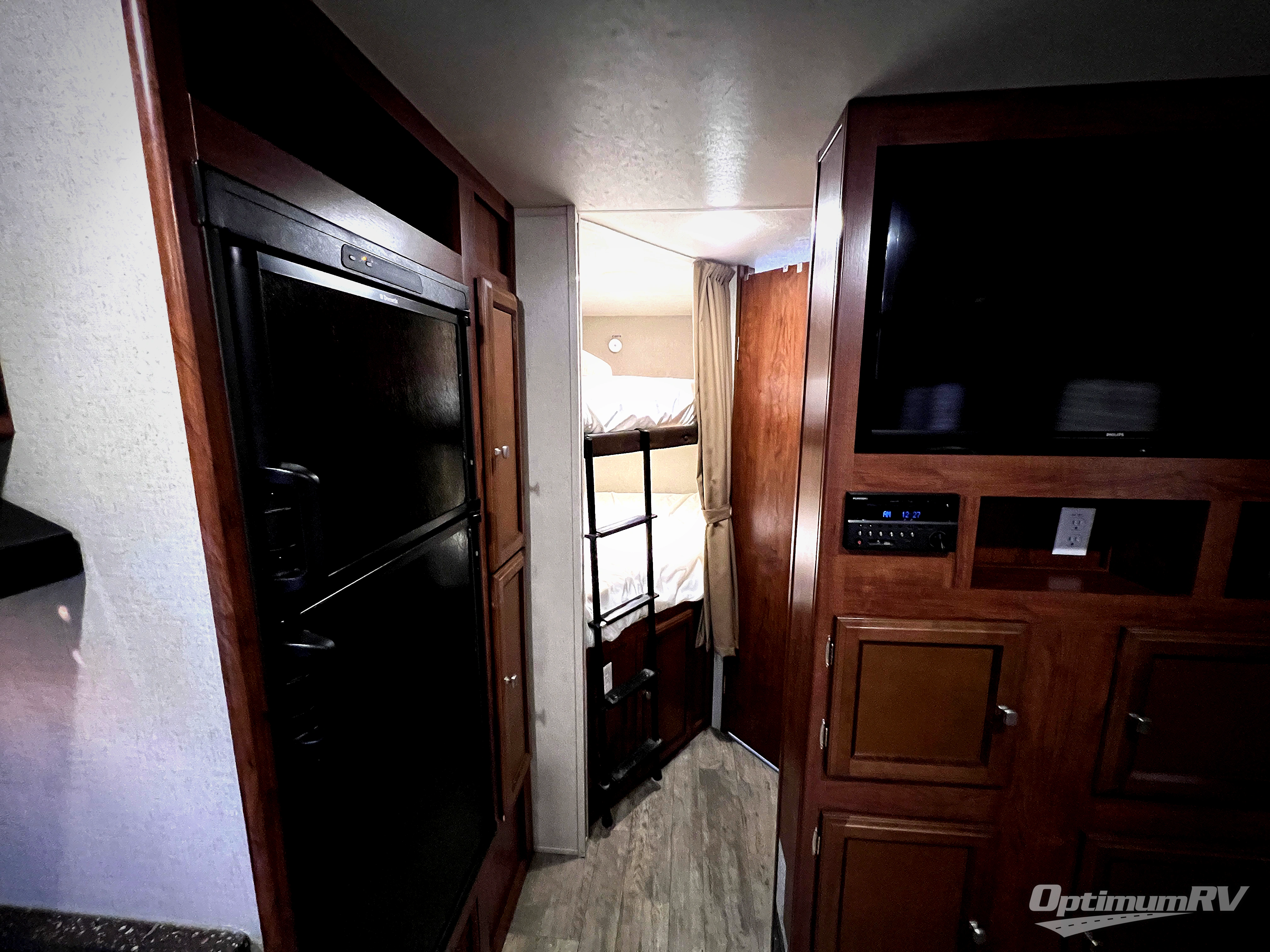 In the very rear of this model you will enjoy the convenience of a complete bath. In the rear right hand corner facing towards the back you have a tub/shower, toilet, and a corner vanity with sink. There is also an overhead medicine cabinet, plus a wardrobe for hanging clothes just outside the door.