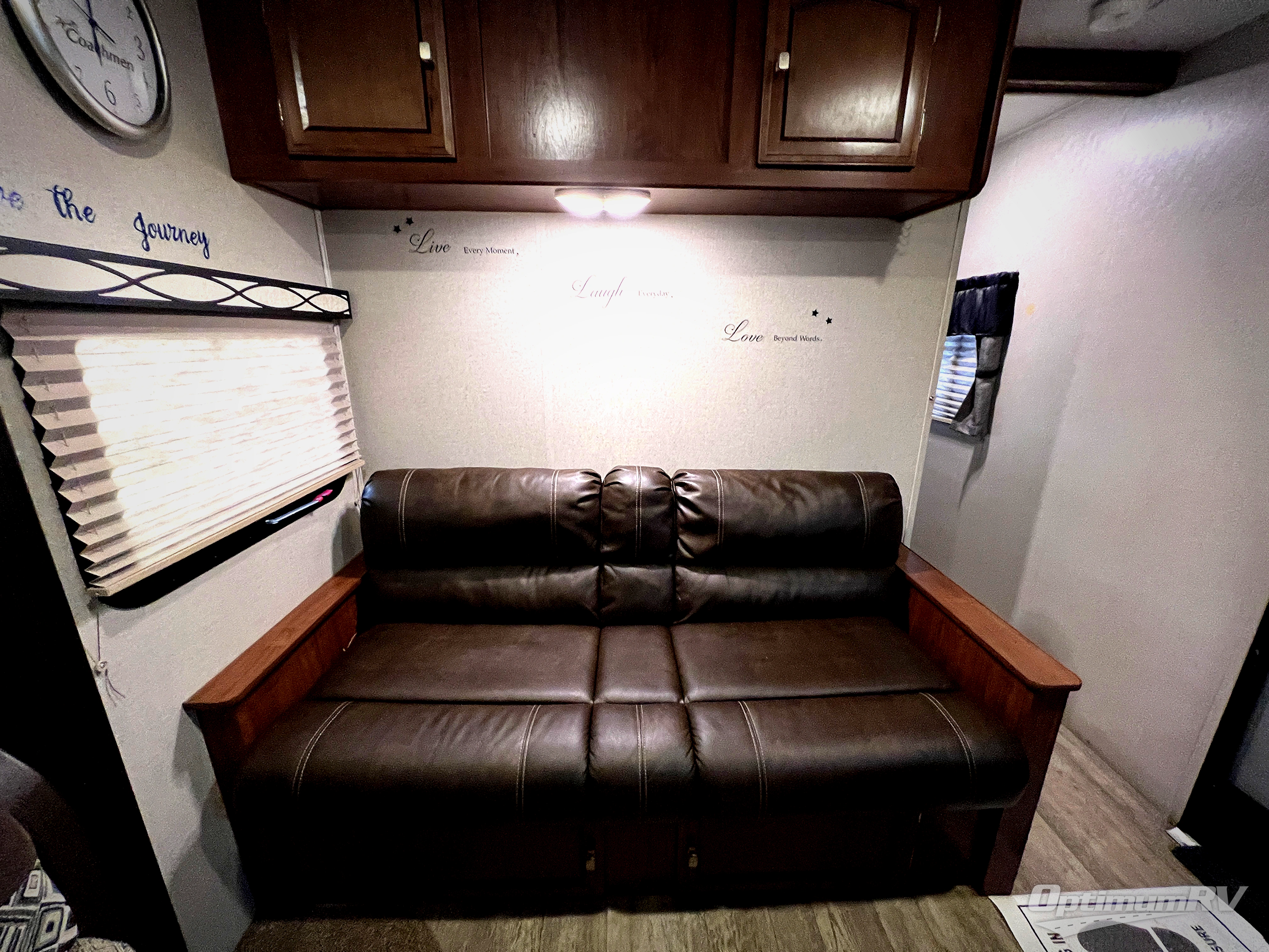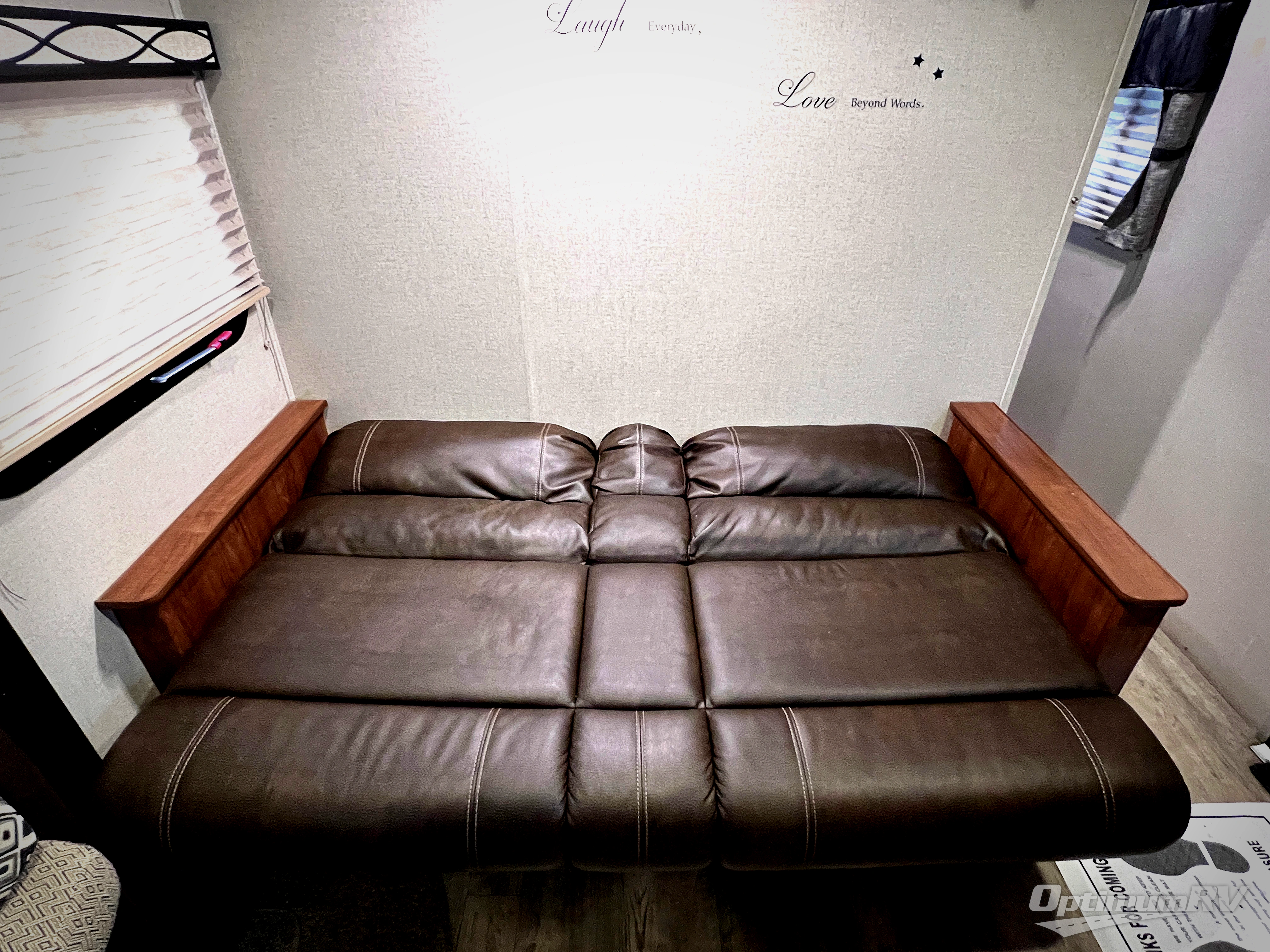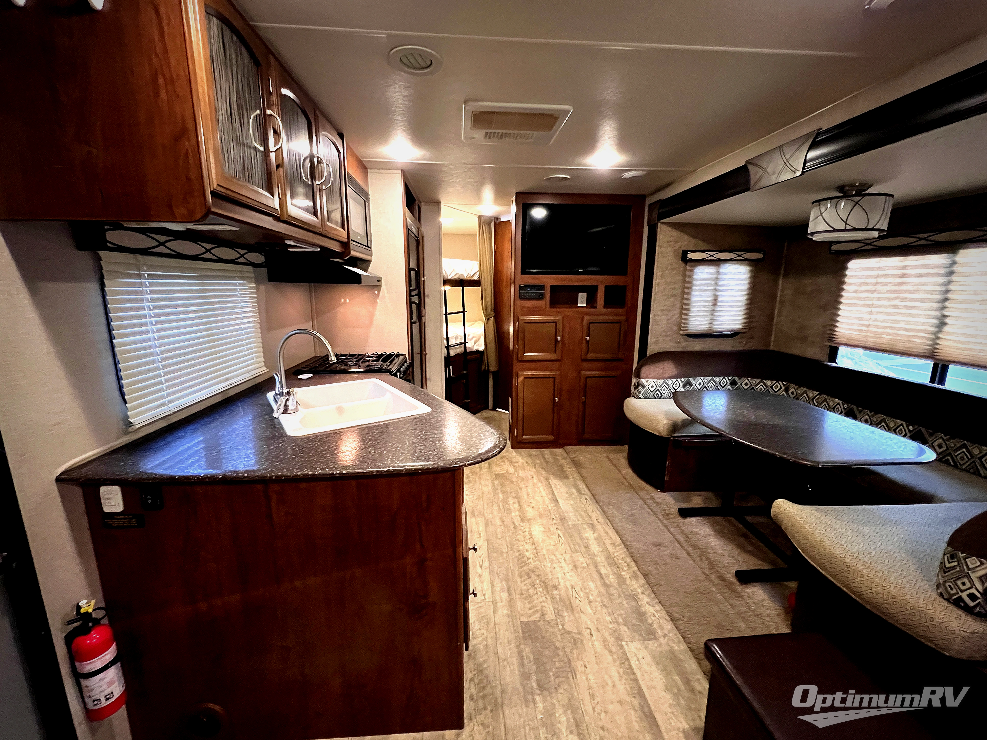 Straight in through the door you will find a sofa with storage overhead, and adjacent a slide out 88" wide u-shaped dinette. Both can also provide added sleeping space if needed at night. From either you can enjoy the entertainment center that is located just off the slide out dinette.
