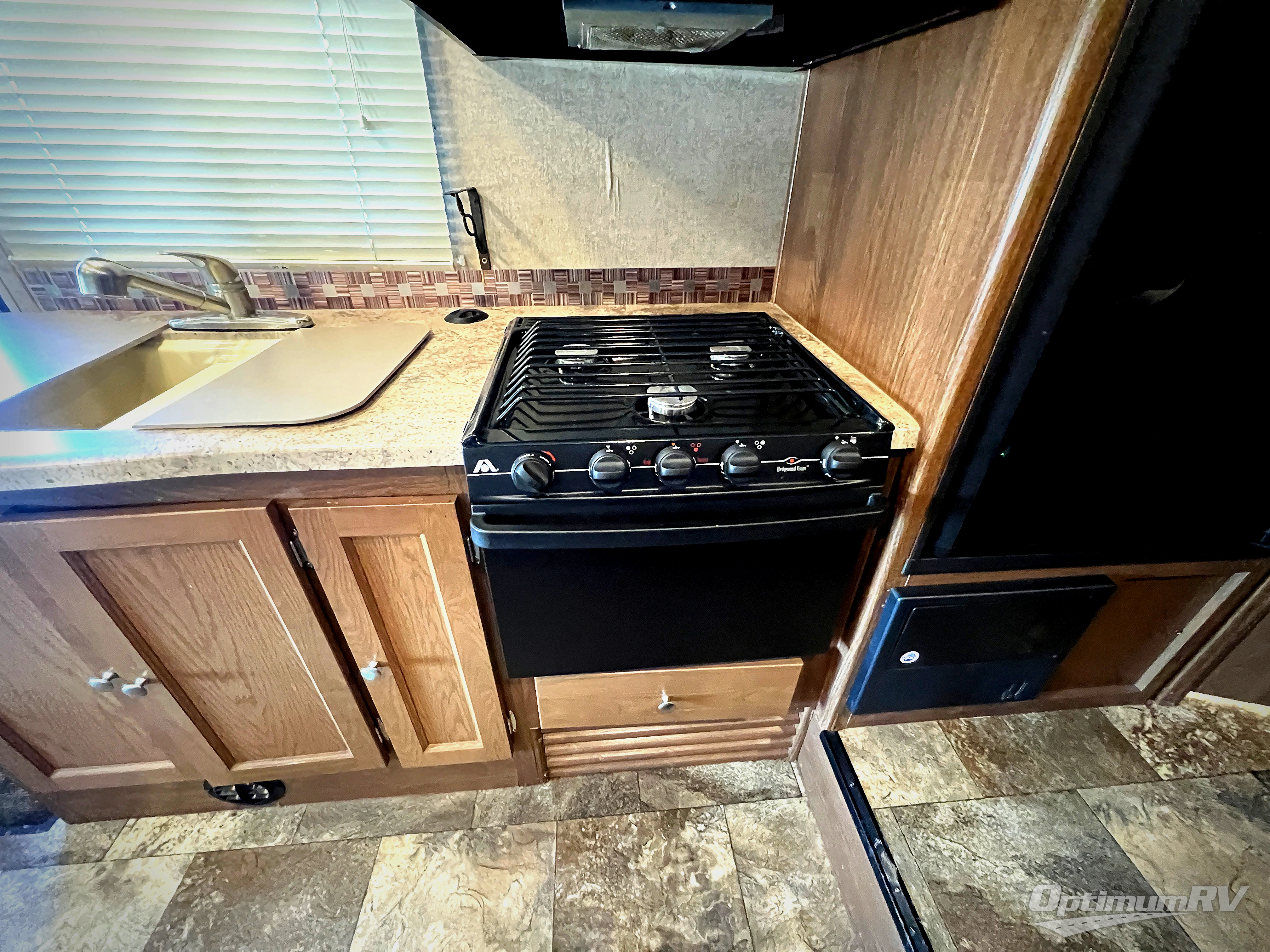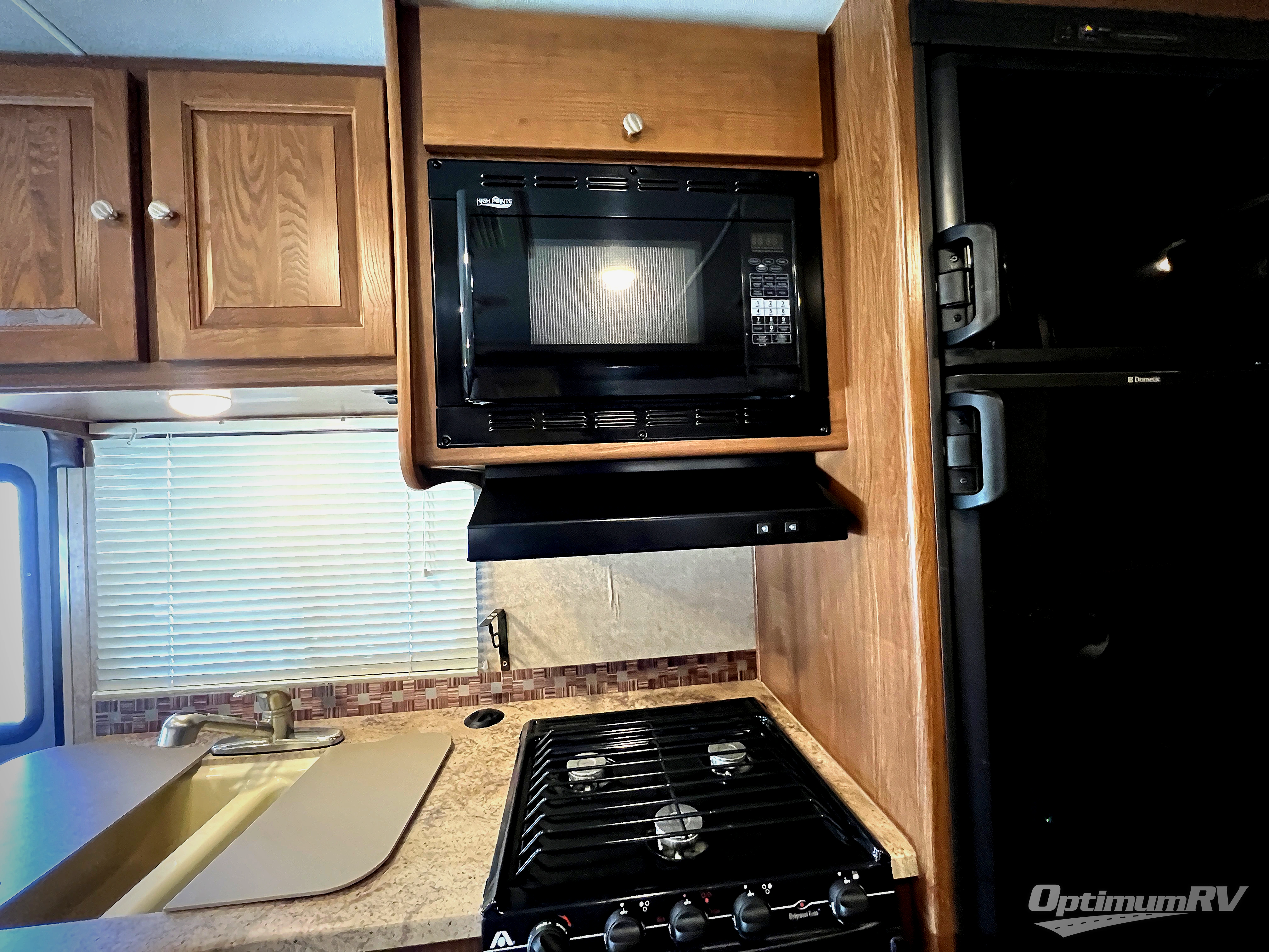 On the opposite side are the kitchen appliances. Here you will easily be able to whip up light meals and snacks for your family. There is a counter extension just off the sink area, a double bowl sink, a three burner range with overhead microwave oven, overhead cabinets, and a refrigerator. The refrigerator is a step up into the main kitchen and dining area.