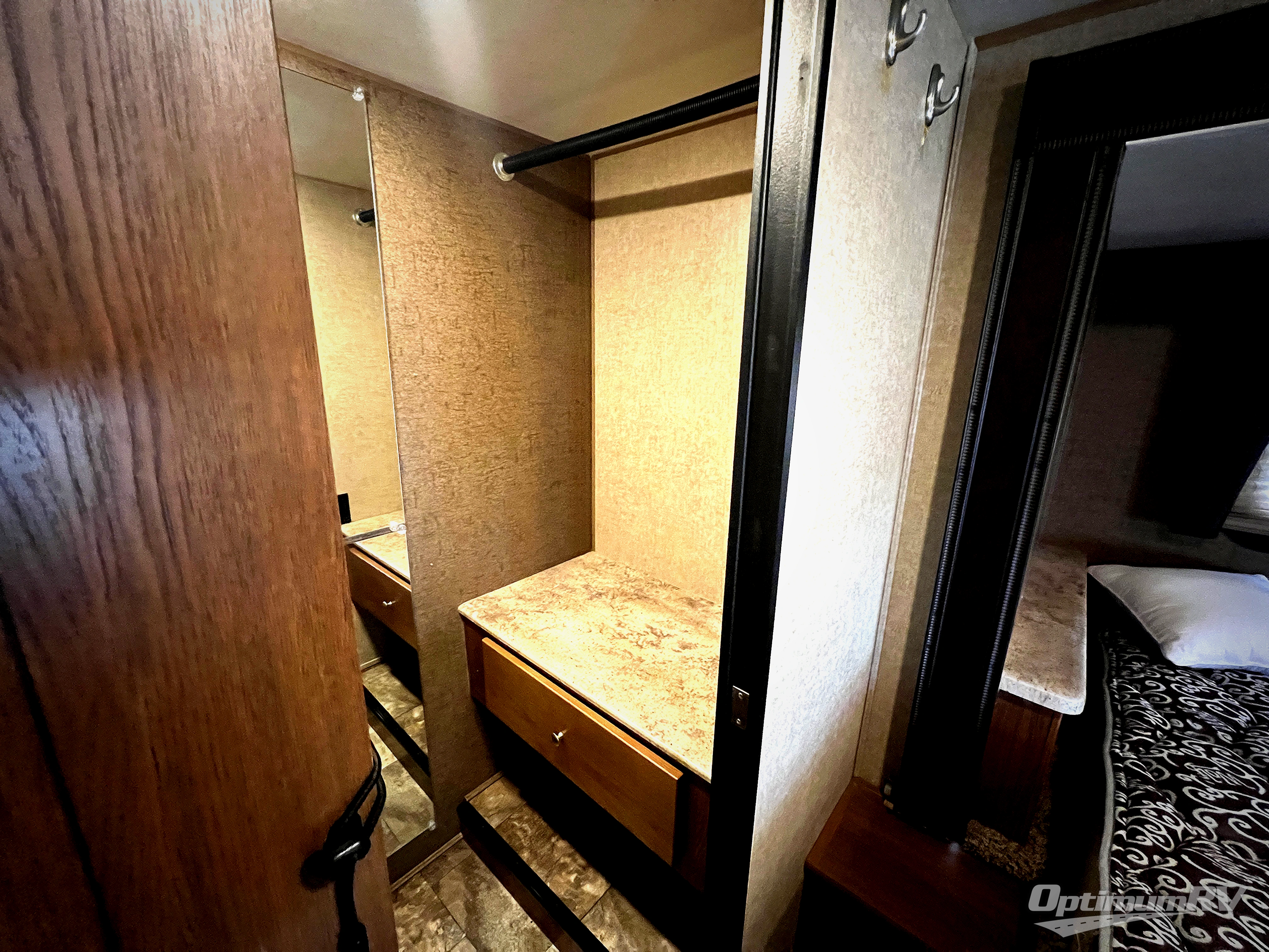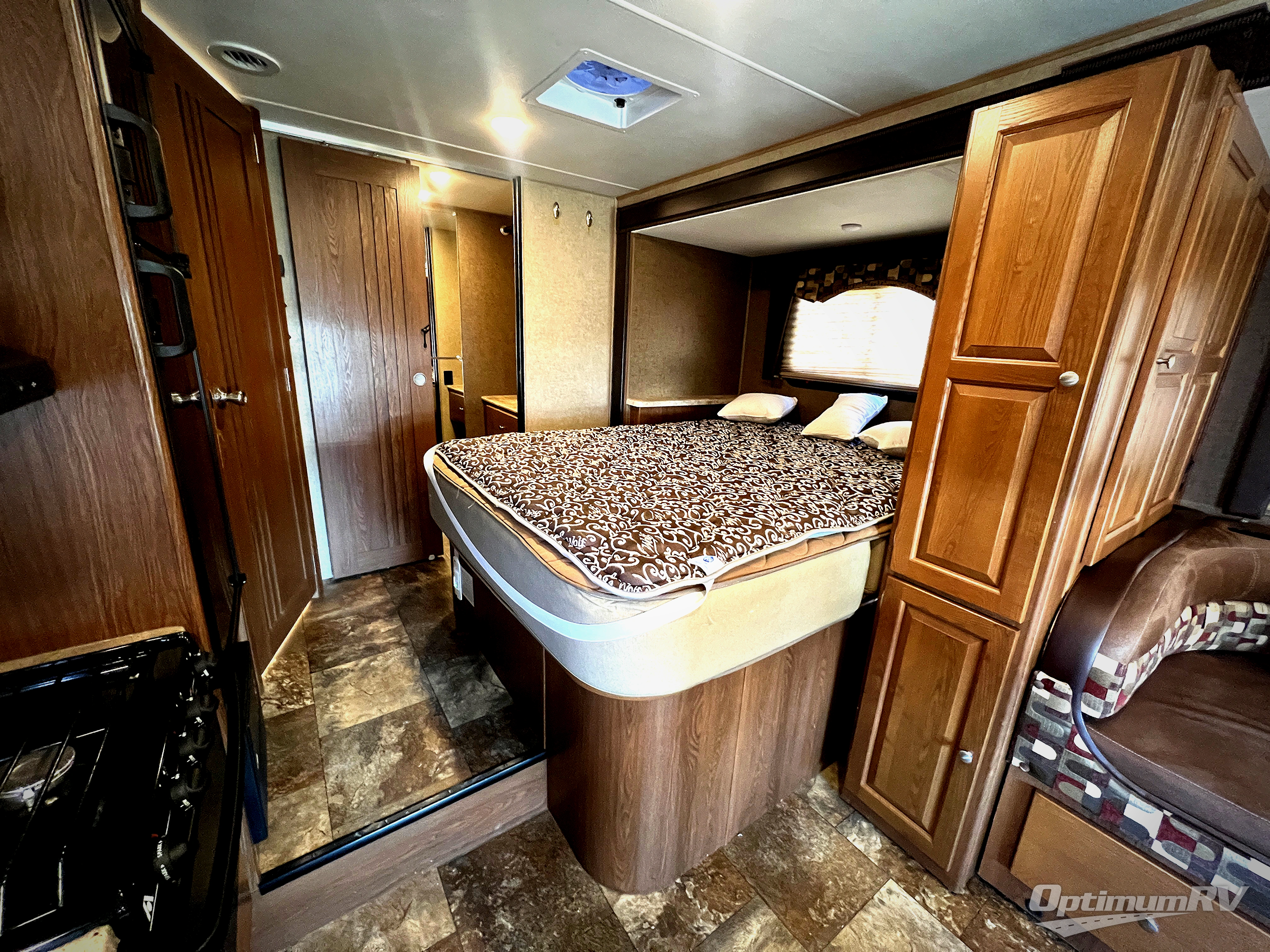 Straight ahead through the entry door find more seating in the slide out u-shaped dinette. Beside the dinette within the slide is also a combined full extended entertainment center/pantry/fireplace that provides separation from the living area and bedroom, plus a queen bed with nightstand and shelf. You may choose the optional recliners or a sofa in place of the u-shaped dinette. A walk-in closet is along the rear wall for all of your clothing.