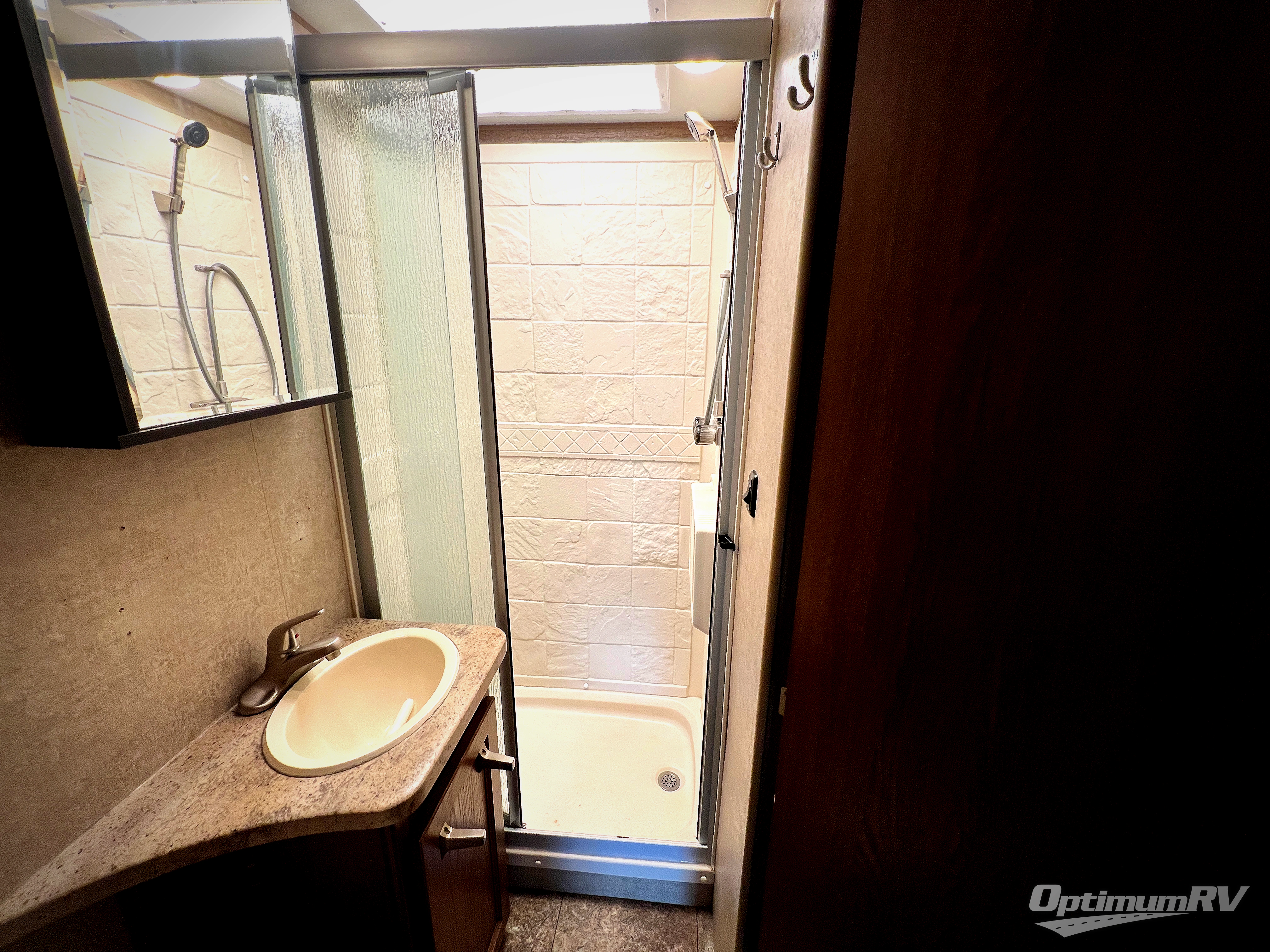 The curb side rear corner features a complete bath with a shower, toilet, and a vanity with sink. There is also a corner linen cabinet above the toilet.