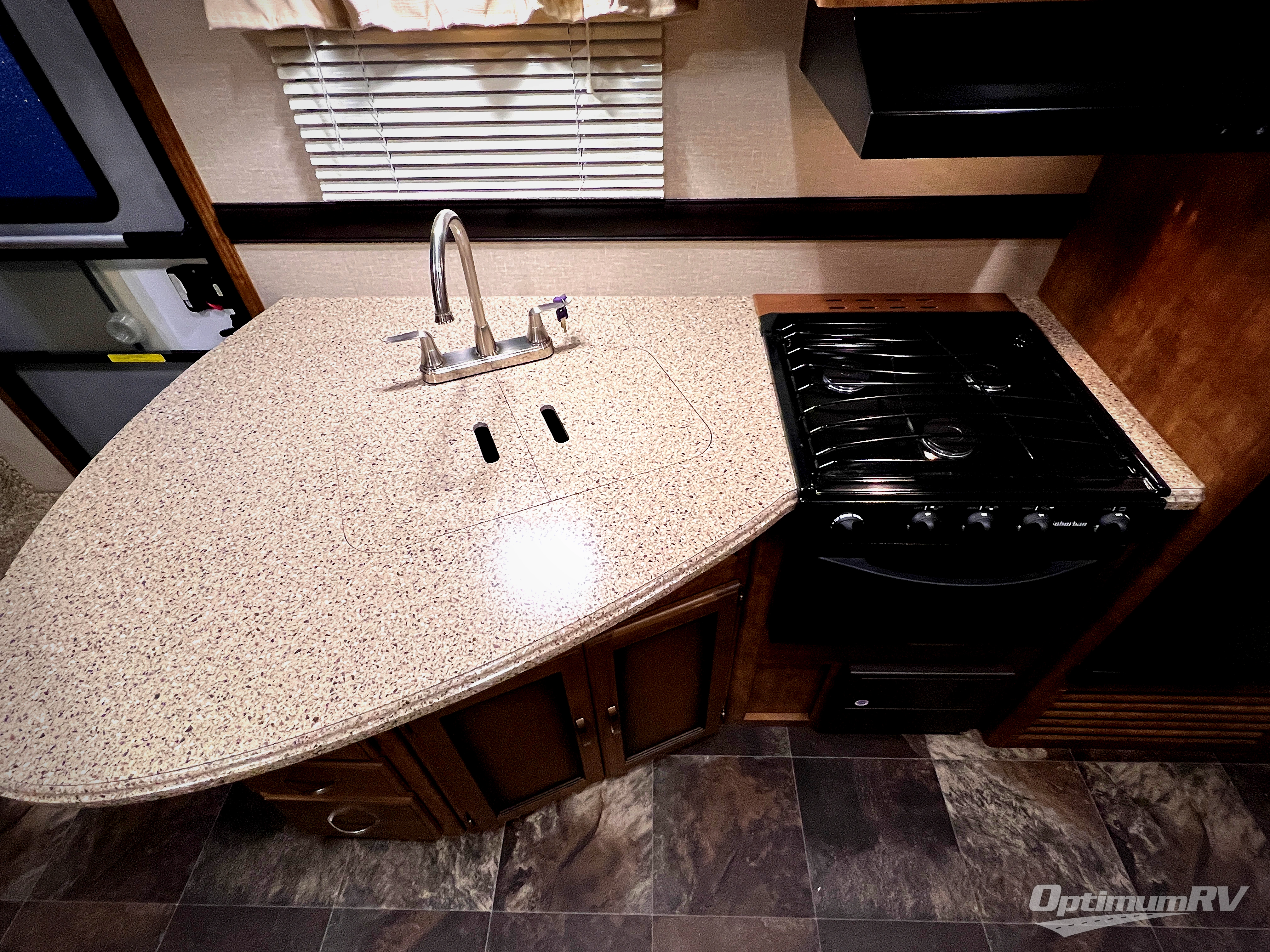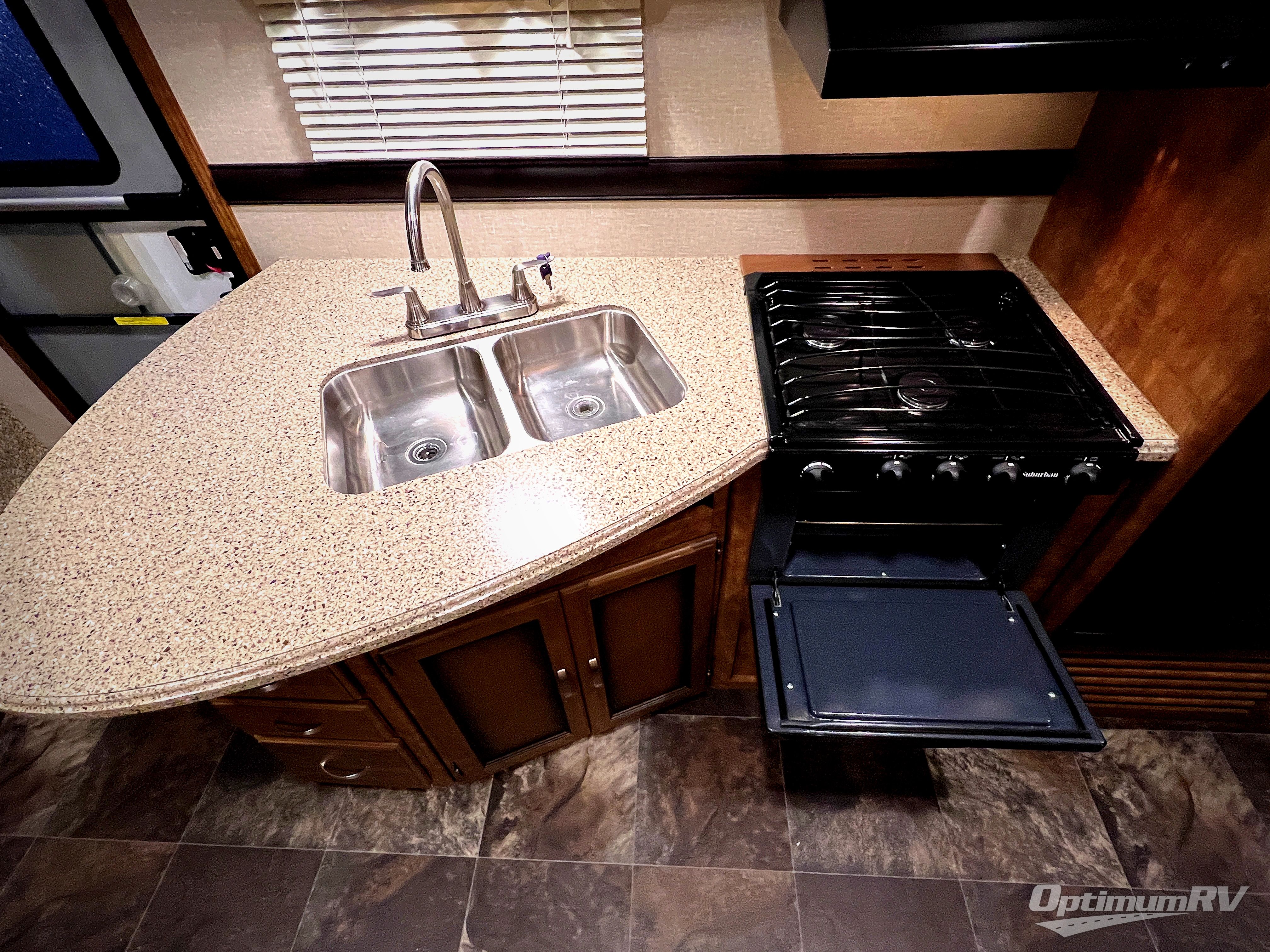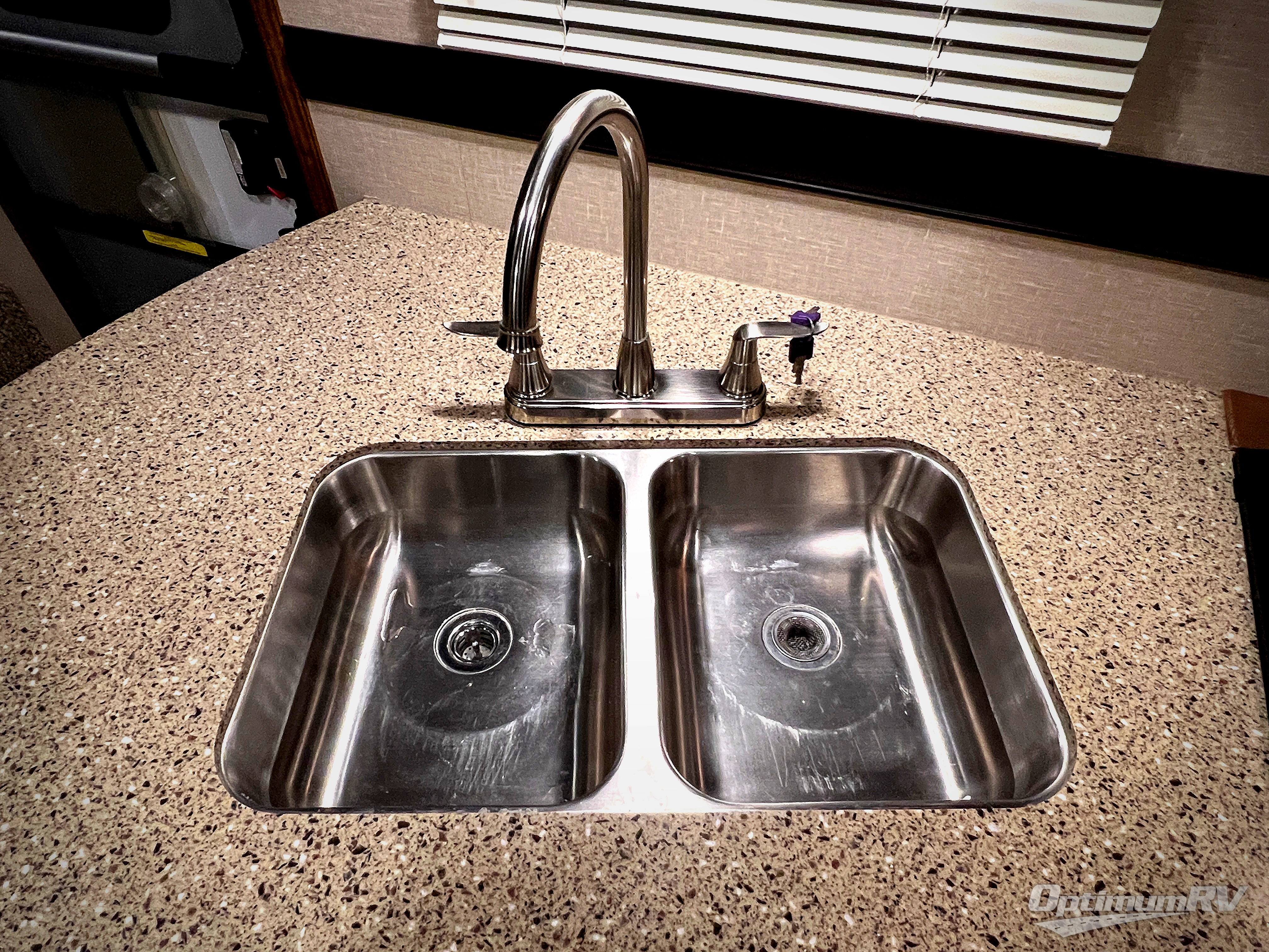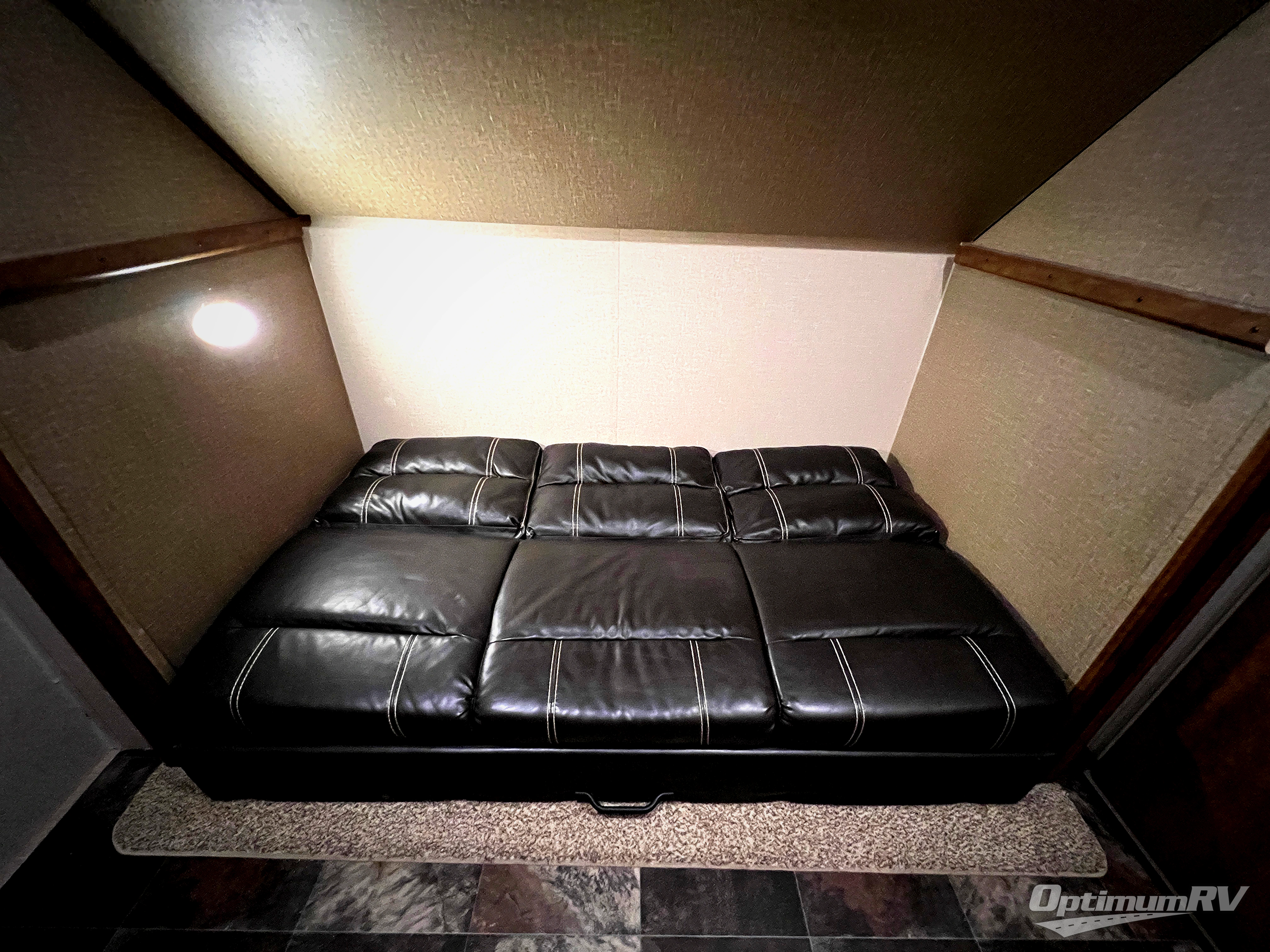 As you enter the fifth wheel, to the left is a double kitchen sink, range, microwave, and refrigerator. The opposite side has a slide with a sofa, overhead cabinet, and u-shaped dinette. Both the dinette and sofa convert into additional sleeping space at night. Next to the dinette you will find a large pantry. In the front of the living and kitchen areas there is a nice entertainment center.