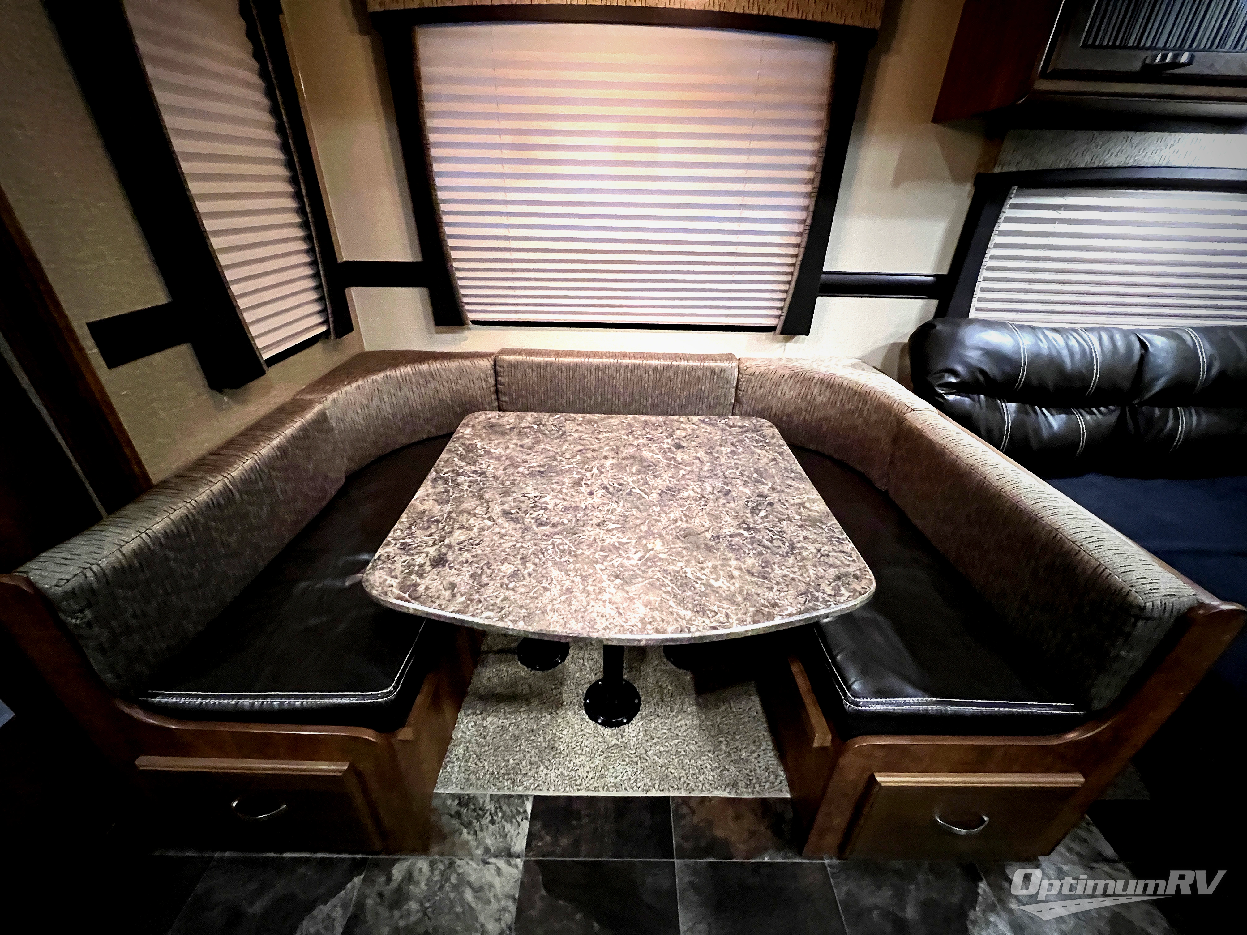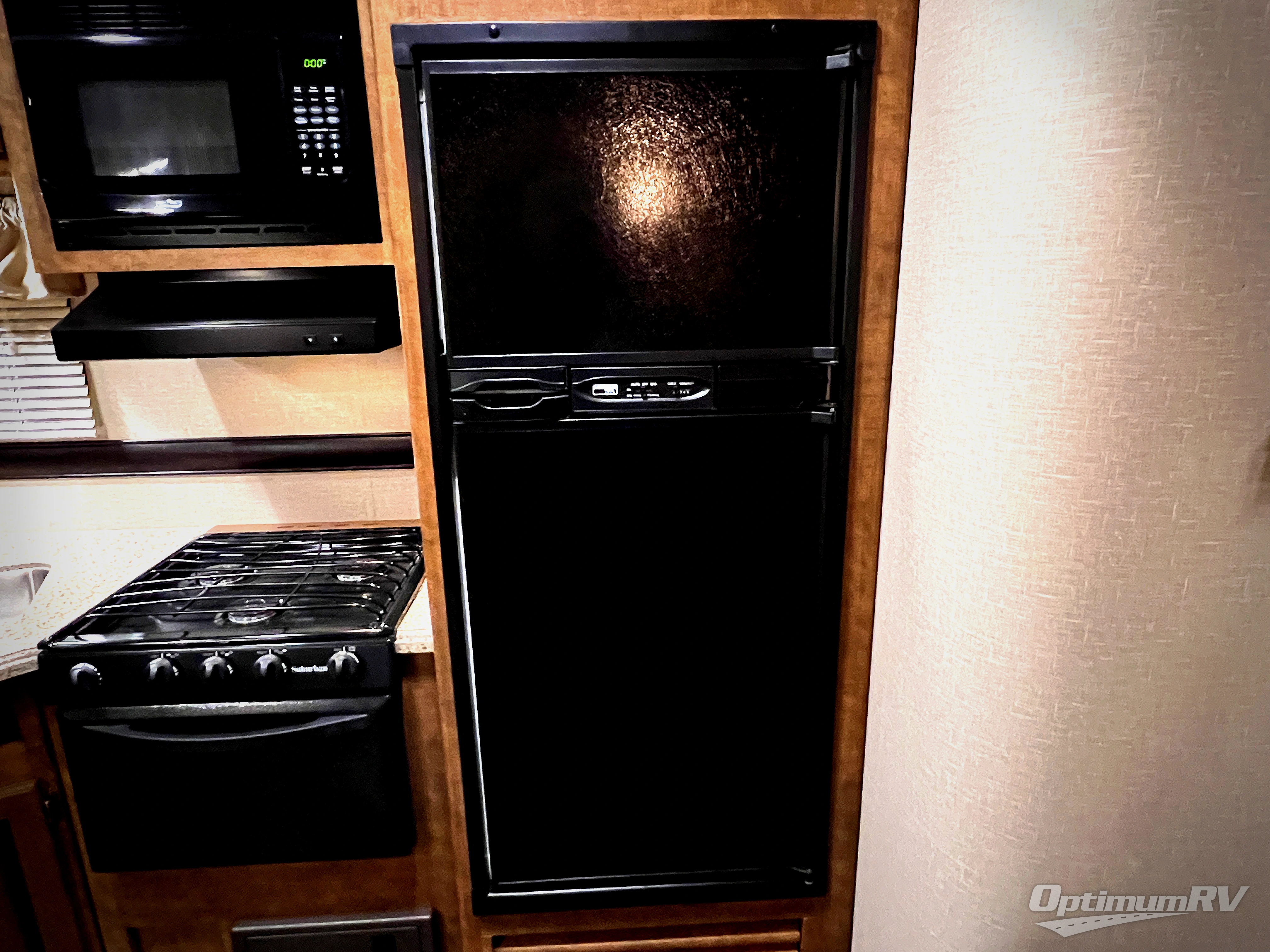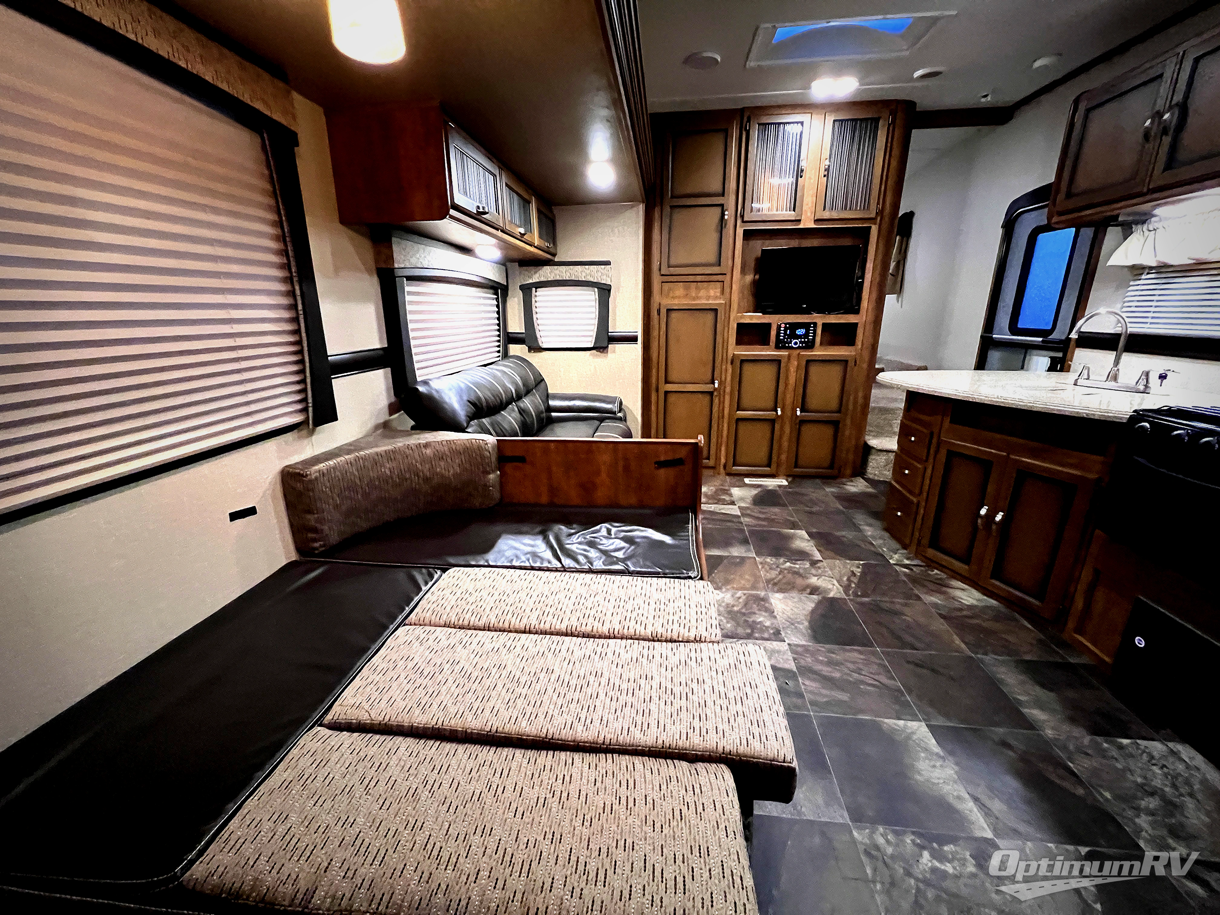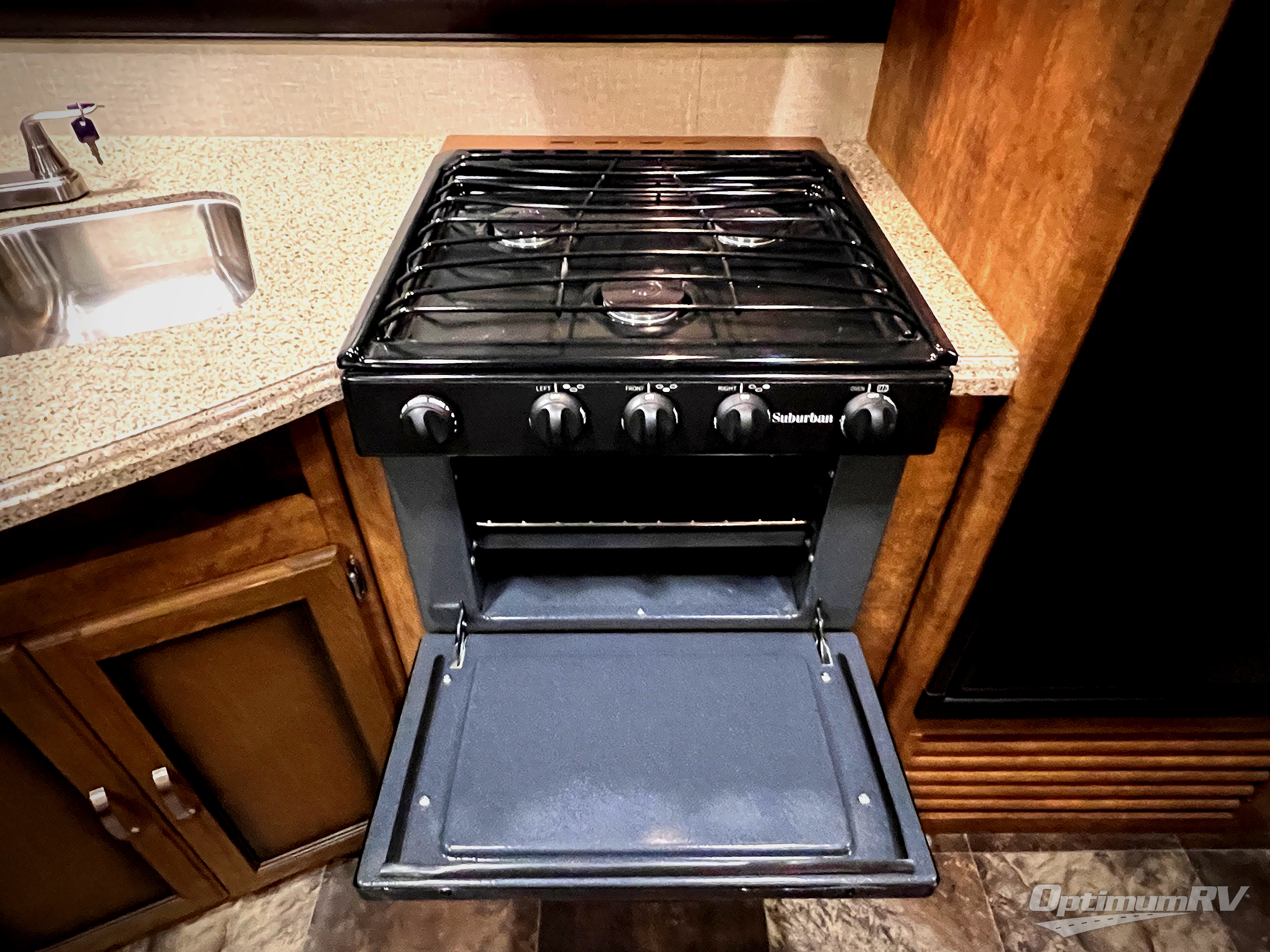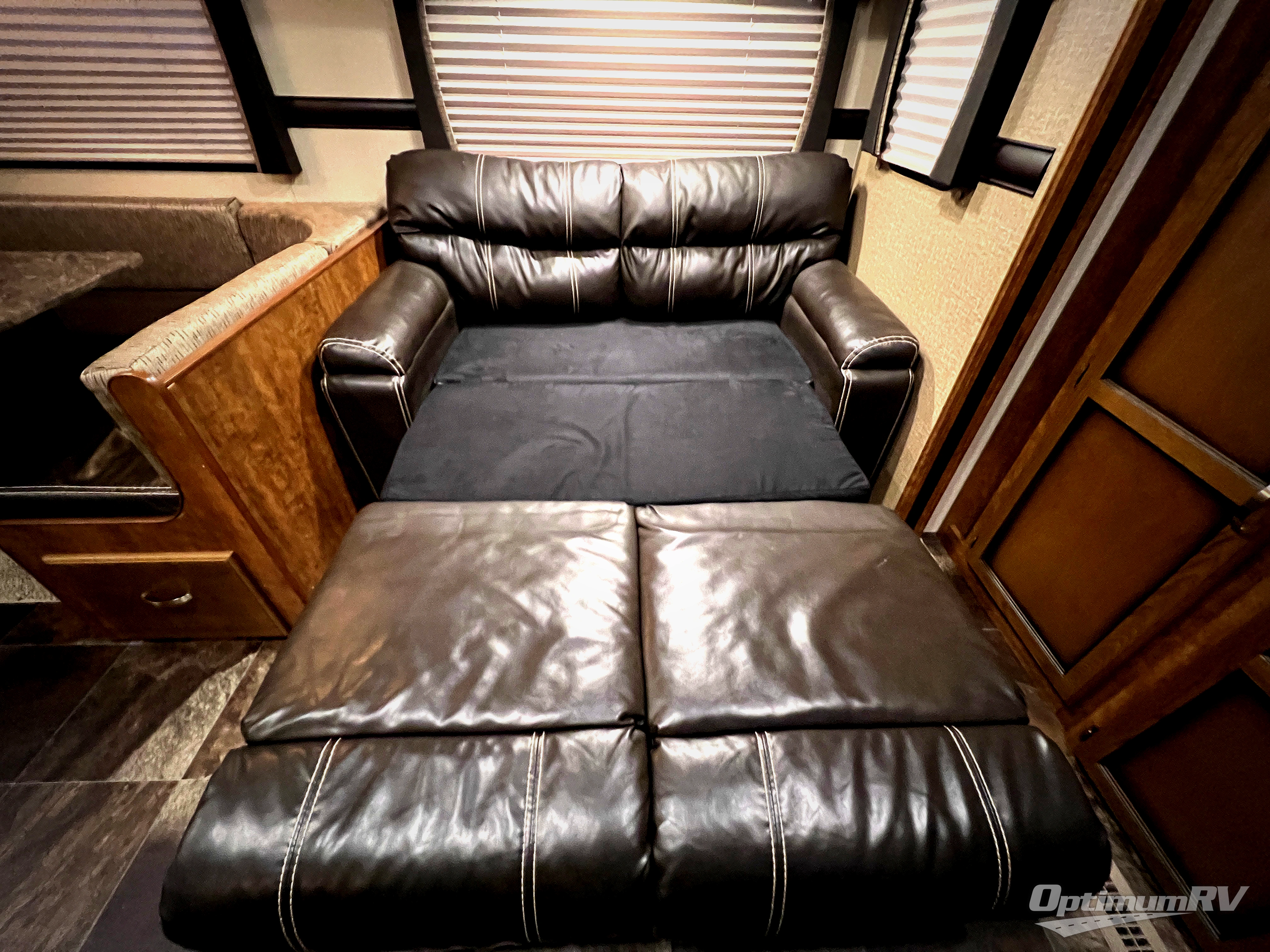 As you enter the fifth wheel, to the left is a double kitchen sink, range, microwave, and refrigerator. The opposite side has a slide with a sofa, overhead cabinet, and u-shaped dinette. Both the dinette and sofa convert into additional sleeping space at night. Next to the dinette you will find a large pantry. In the front of the living and kitchen areas there is a nice entertainment center.