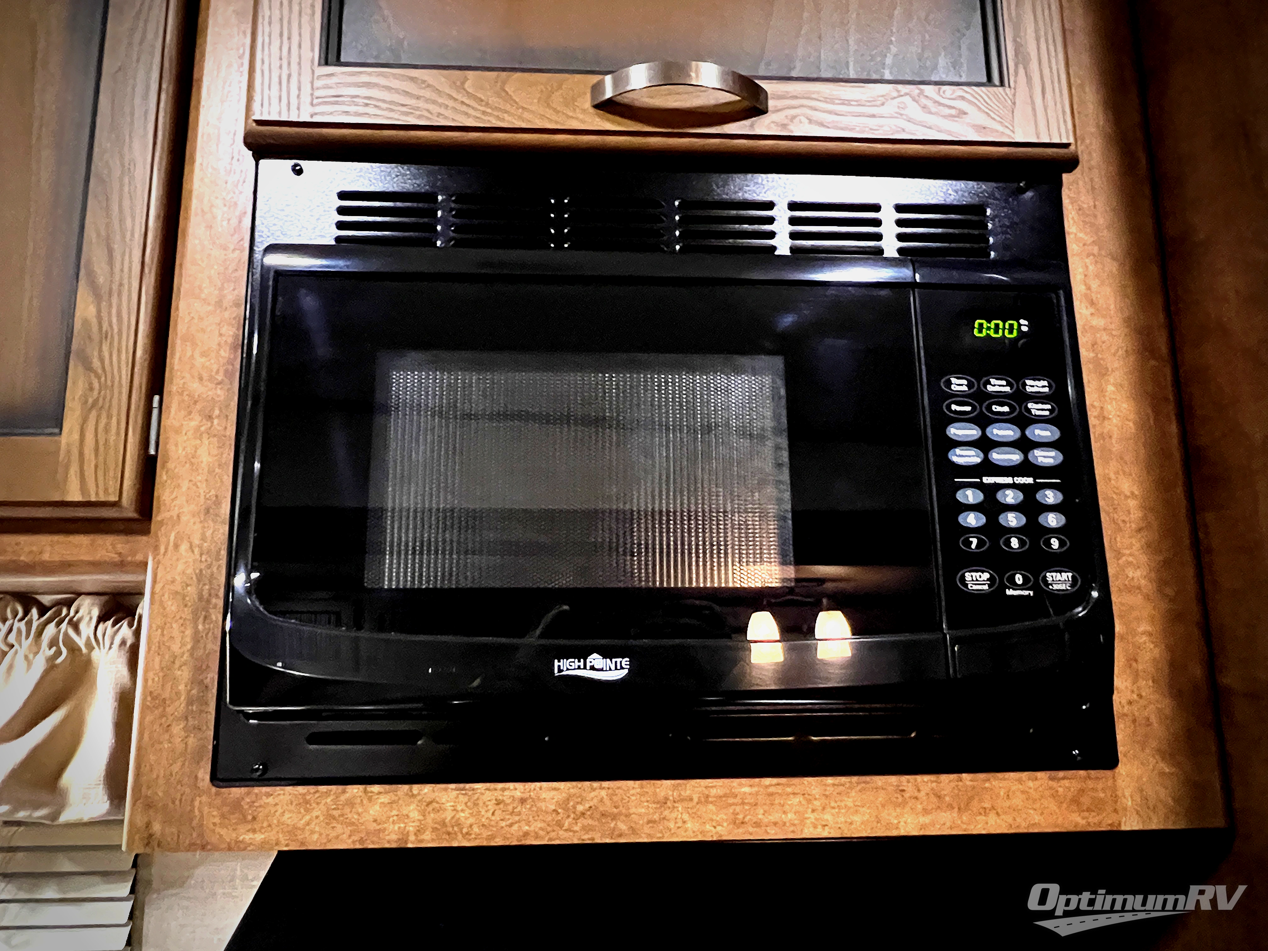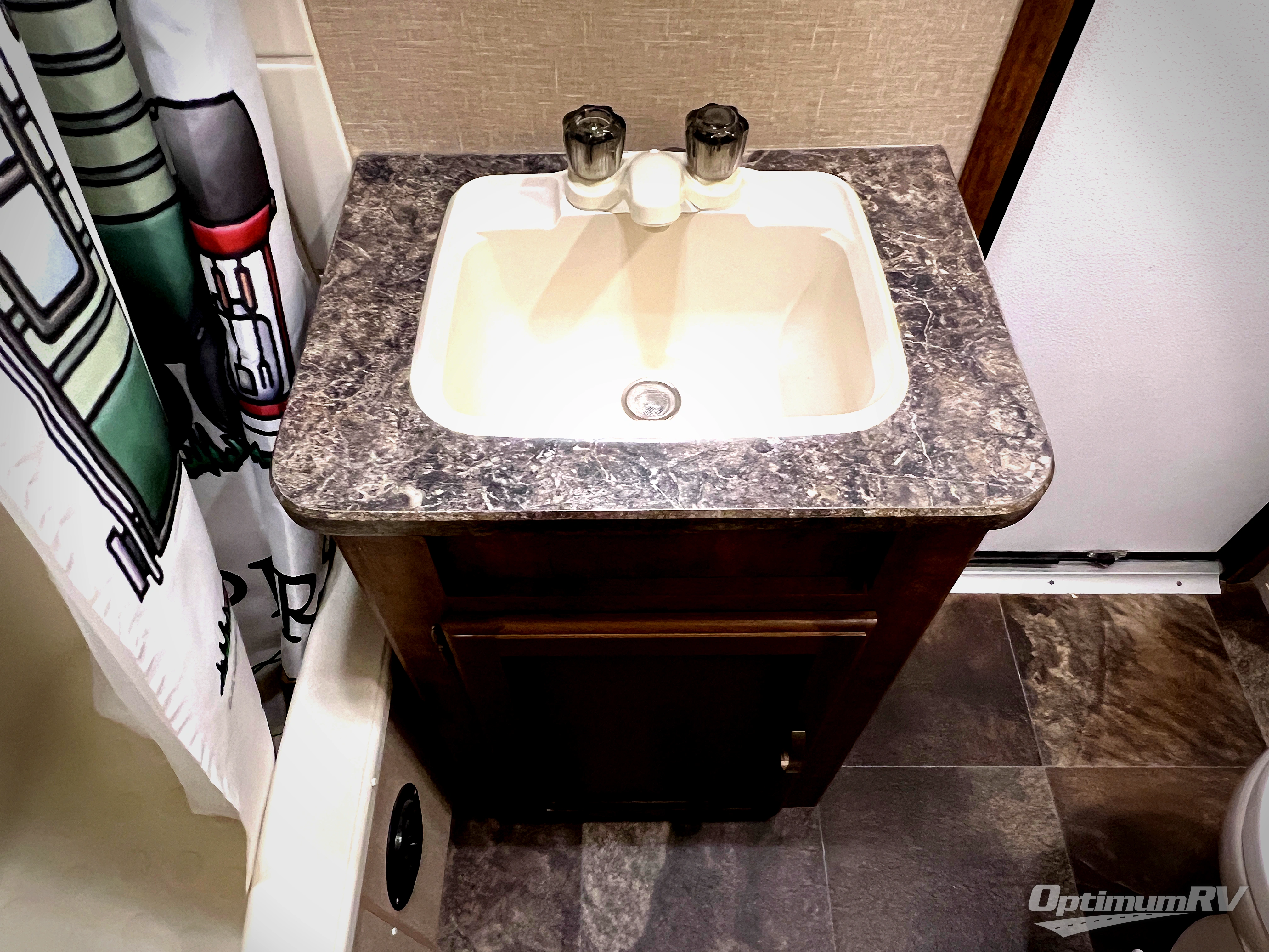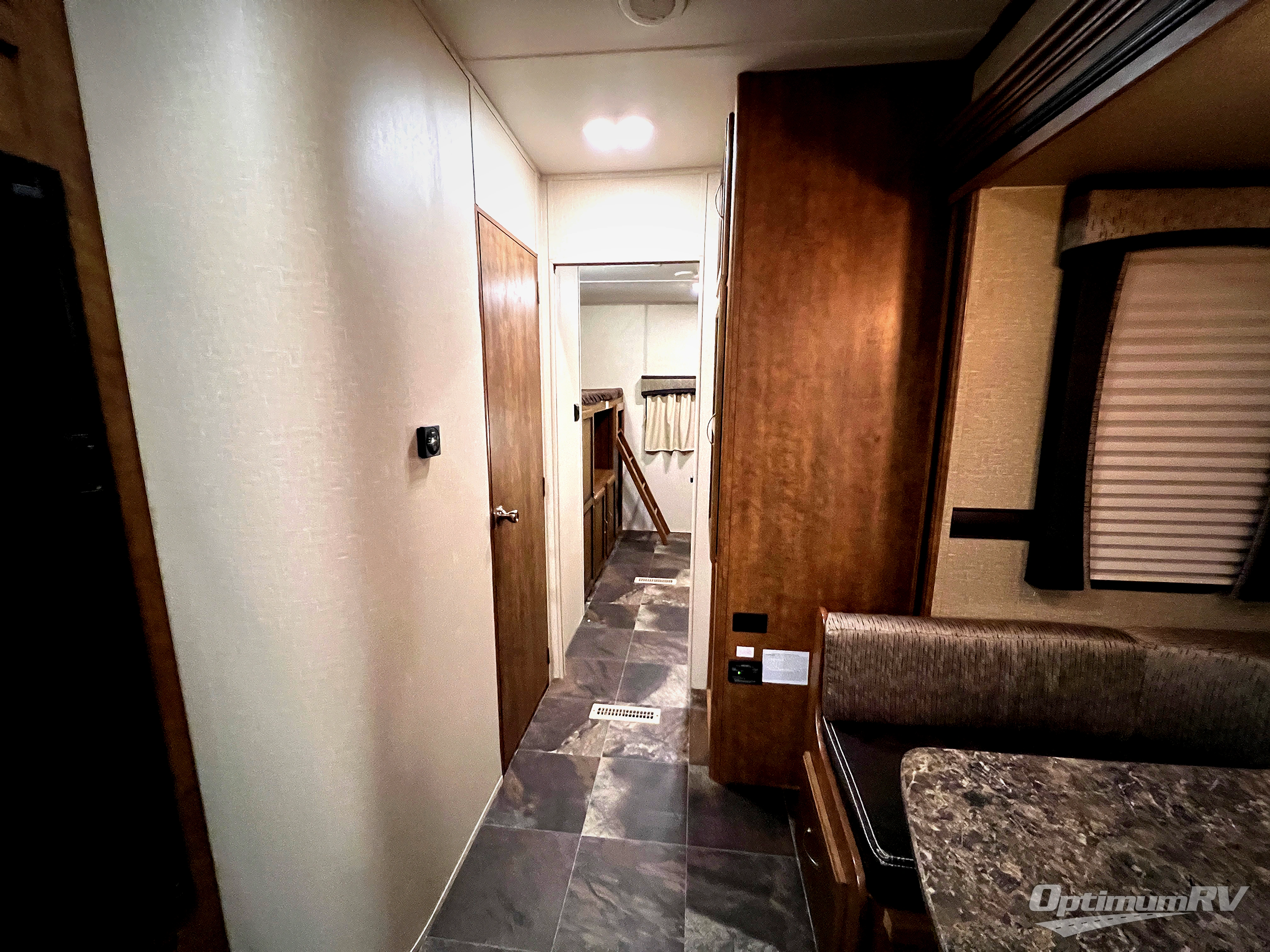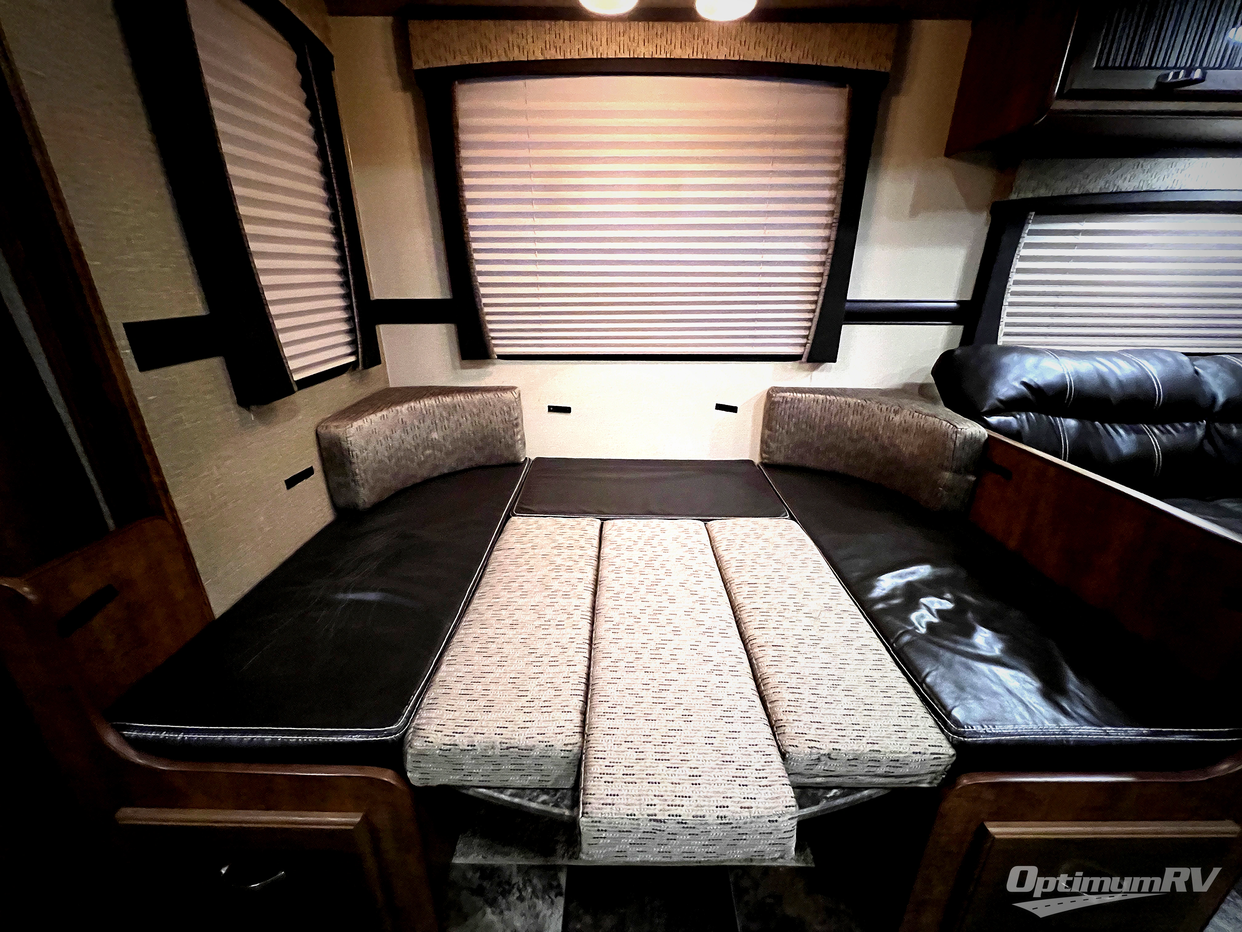As you enter the fifth wheel, to the left is a double kitchen sink, range, microwave, and refrigerator. The opposite side has a slide with a sofa, overhead cabinet, and u-shaped dinette. Both the dinette and sofa convert into additional sleeping space at night. Next to the dinette you will find a large pantry. In the front of the living and kitchen areas there is a nice entertainment center.