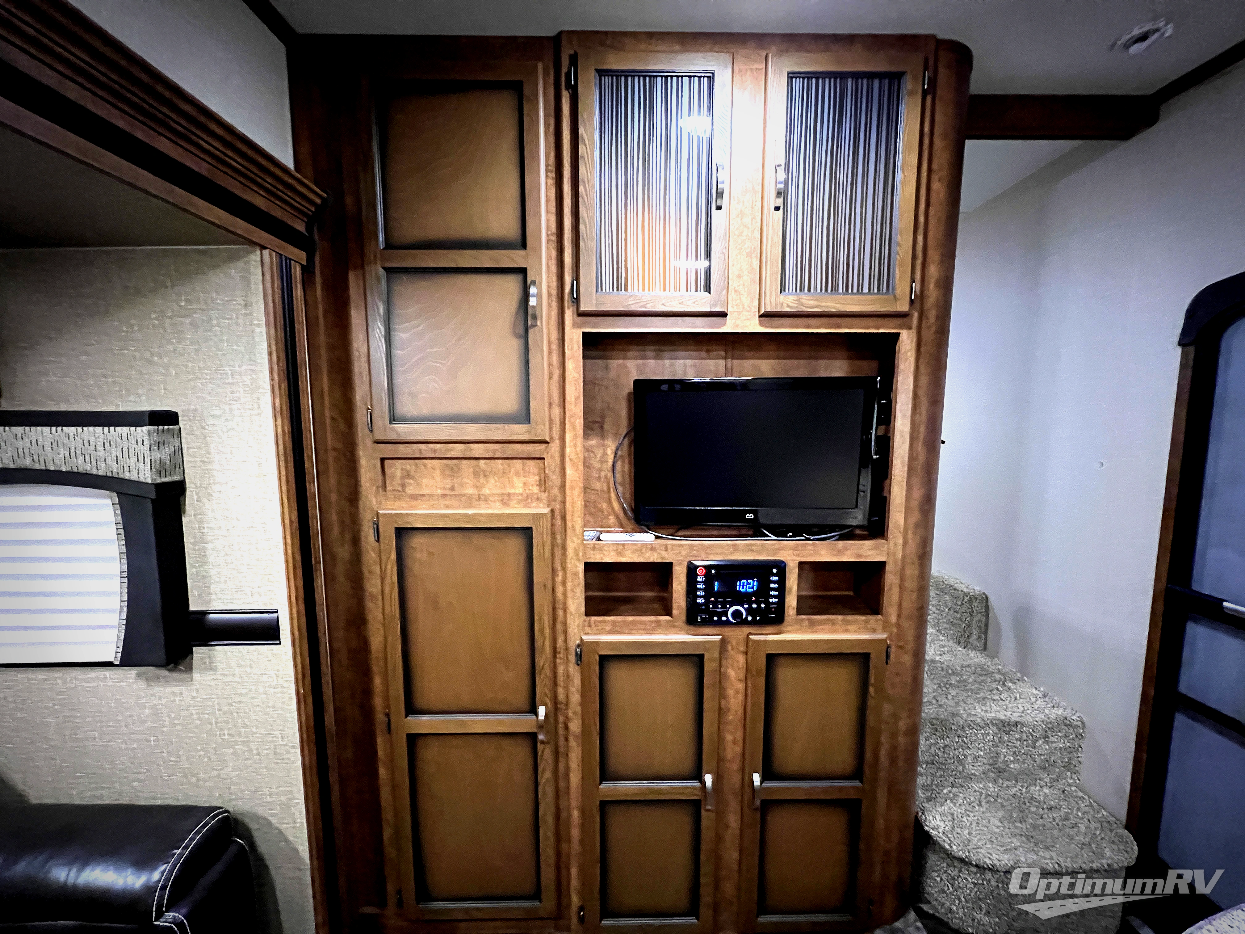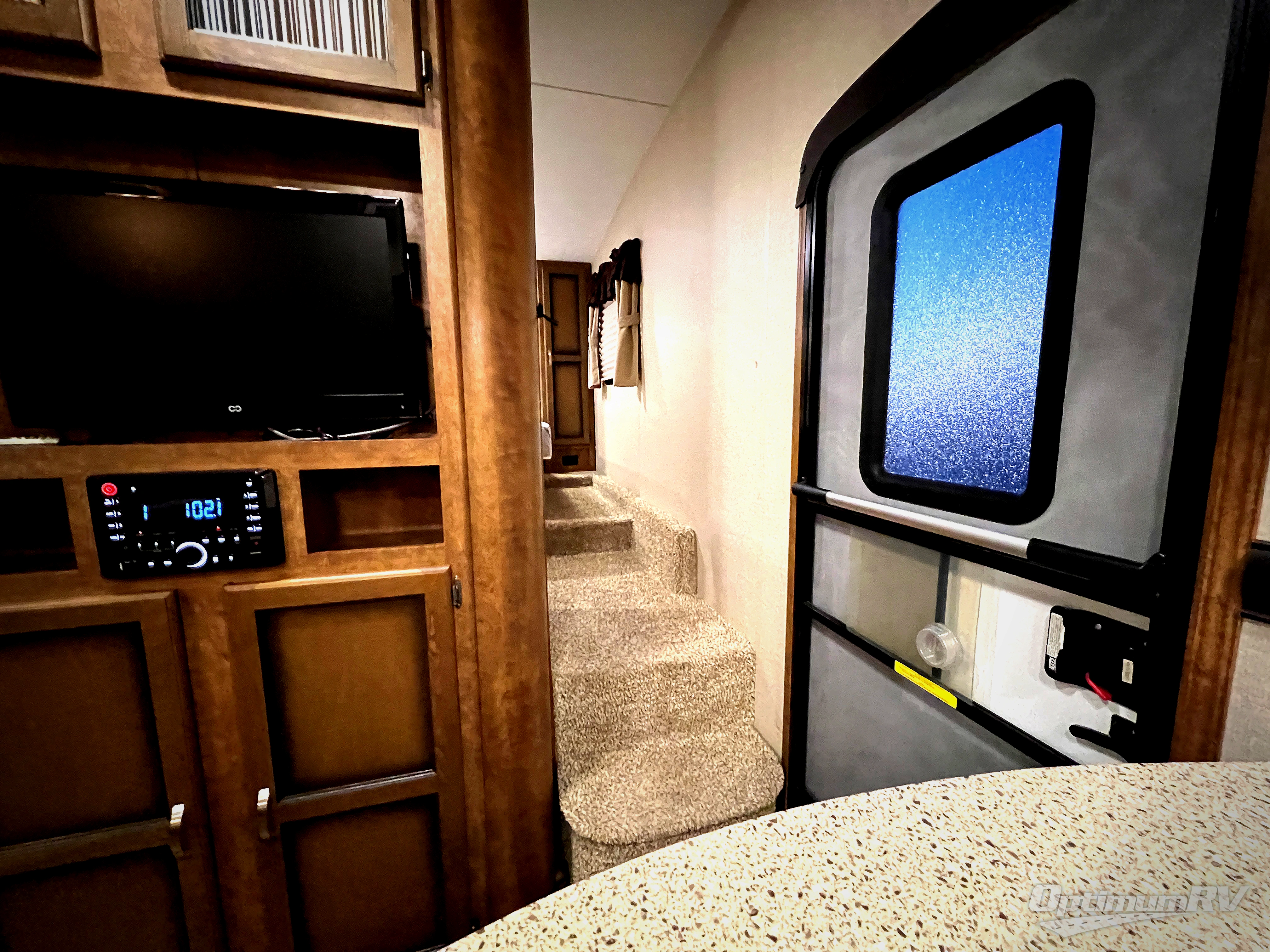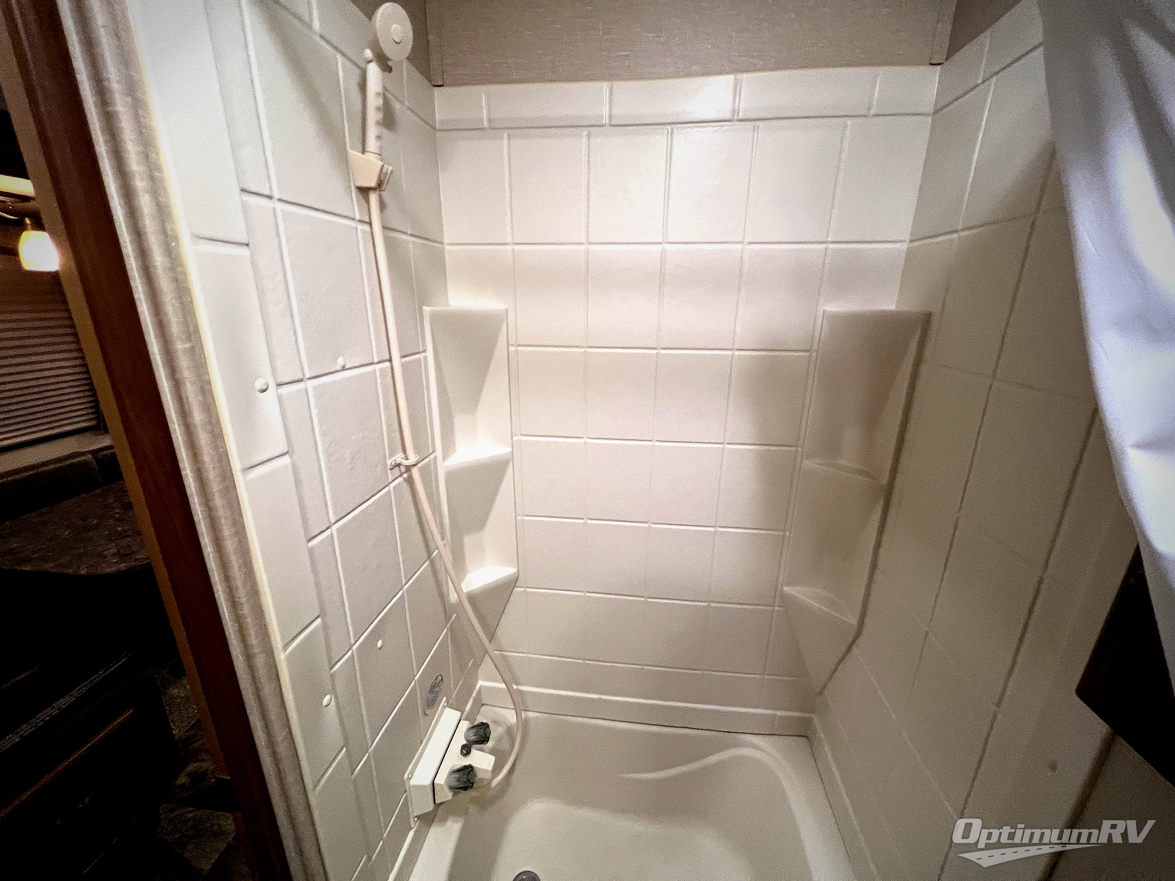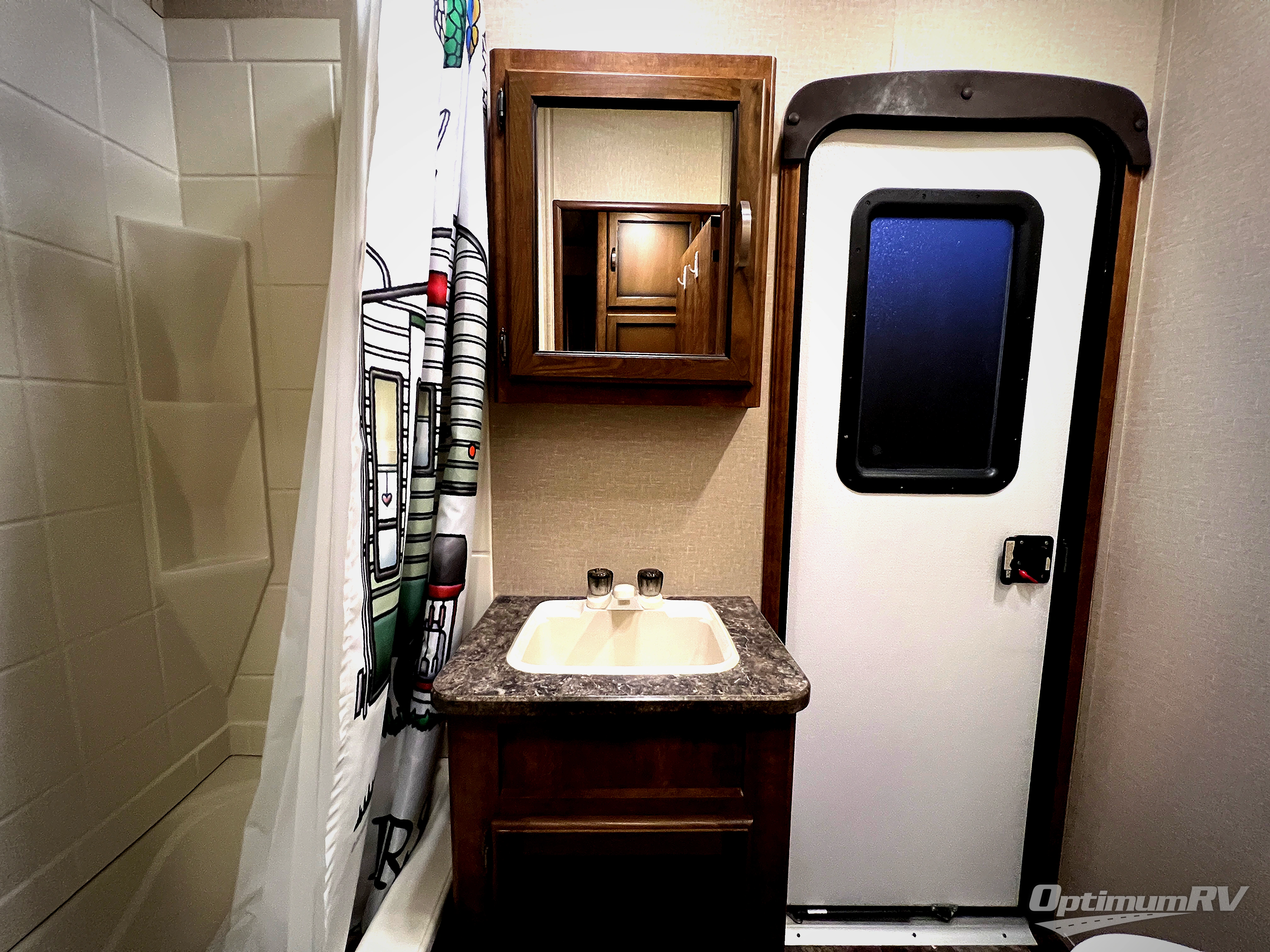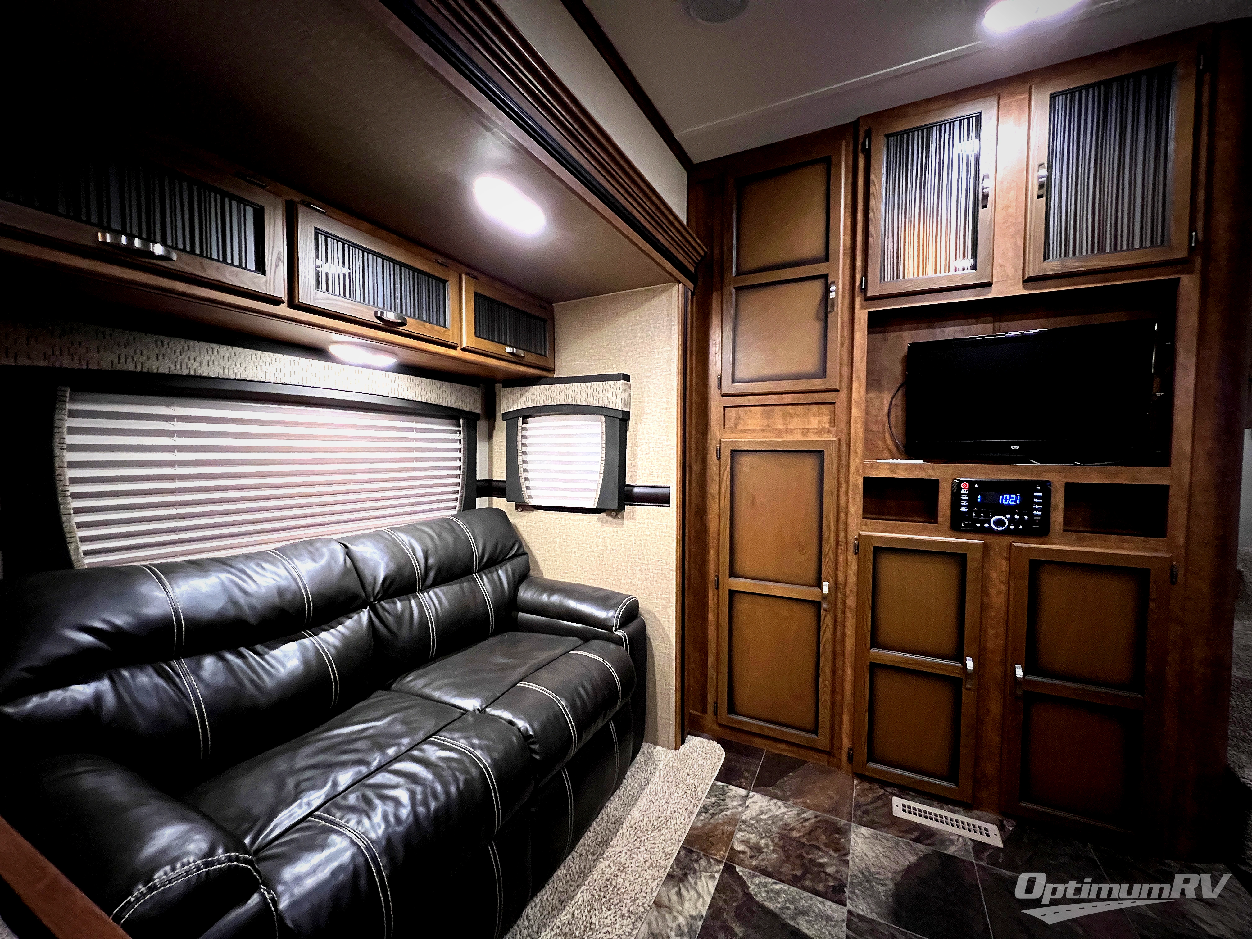 As you enter the fifth wheel, to the left is a double kitchen sink, range, microwave, and refrigerator. The opposite side has a slide with a sofa, overhead cabinet, and u-shaped dinette. Both the dinette and sofa convert into additional sleeping space at night. Next to the dinette you will find a large pantry. In the front of the living and kitchen areas there is a nice entertainment center.