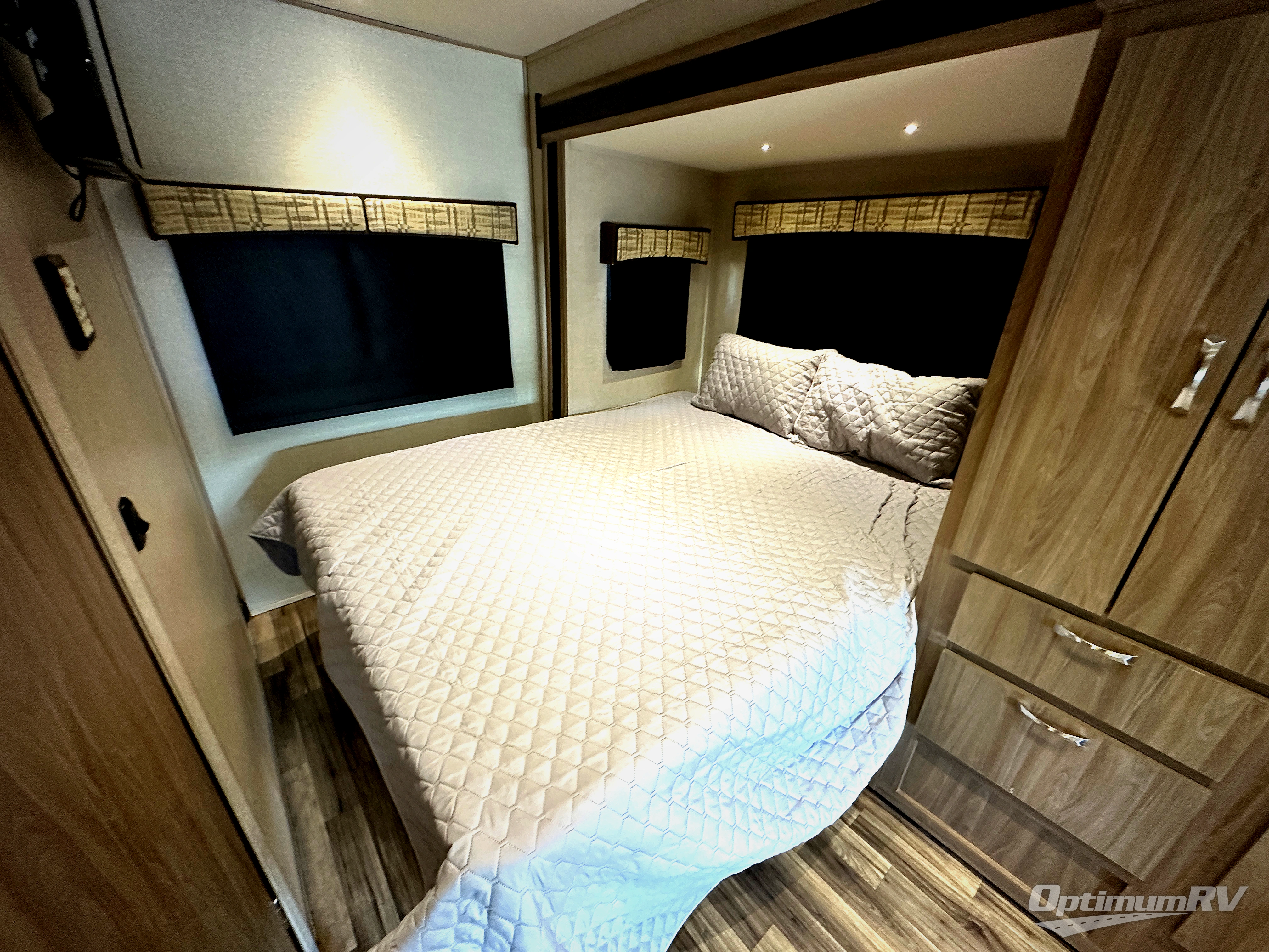 Step inside just behind the front passenger seat and find an overhead cabinet above the door. Above the cab you will find a 32" LED TV as well as overhead cabinets. There is a full wall slide out along the driver's side which creates a nice open feel inside. The slide contains a booth dinette, pantry, wardrobe, and queen size bed.