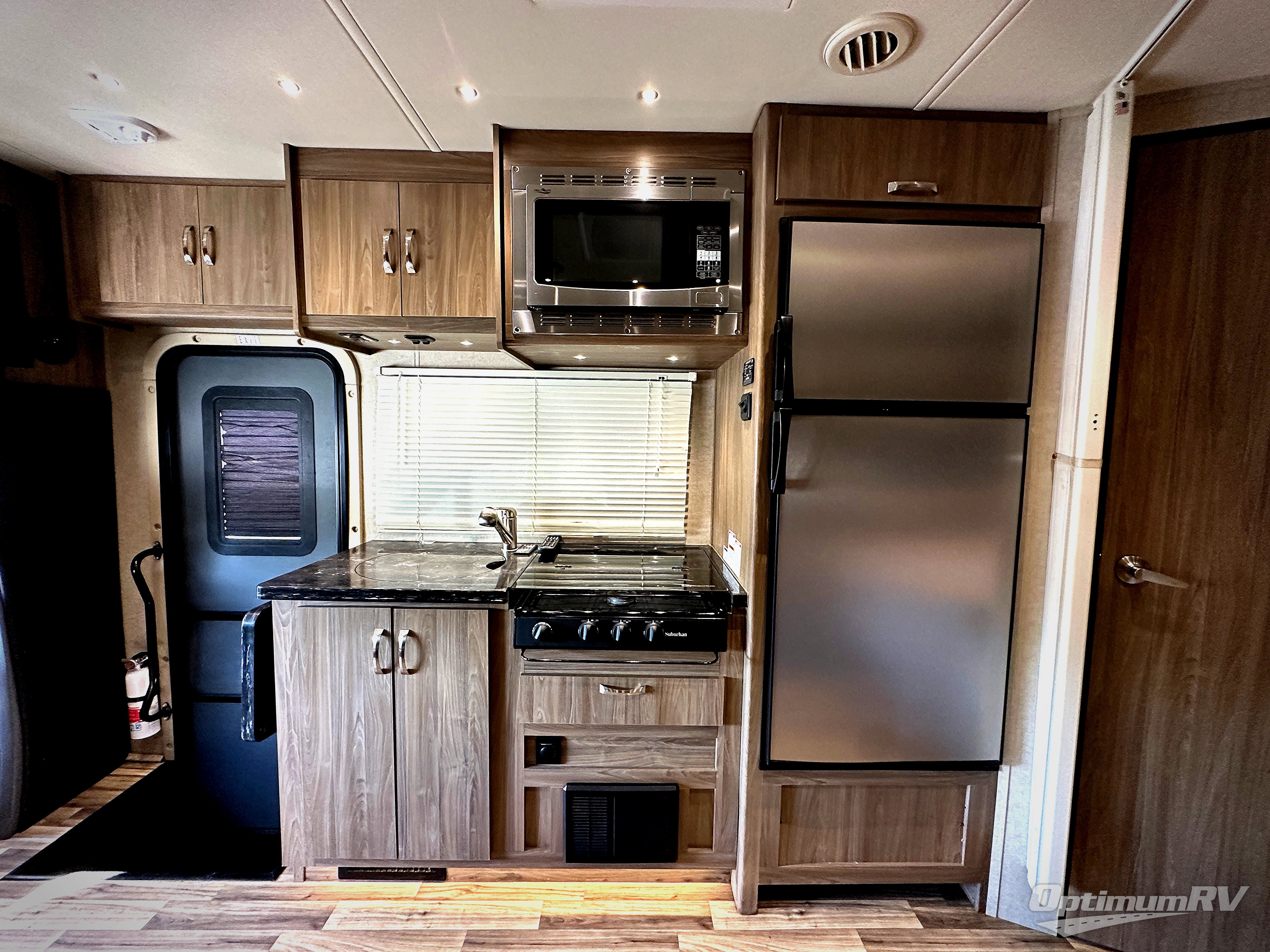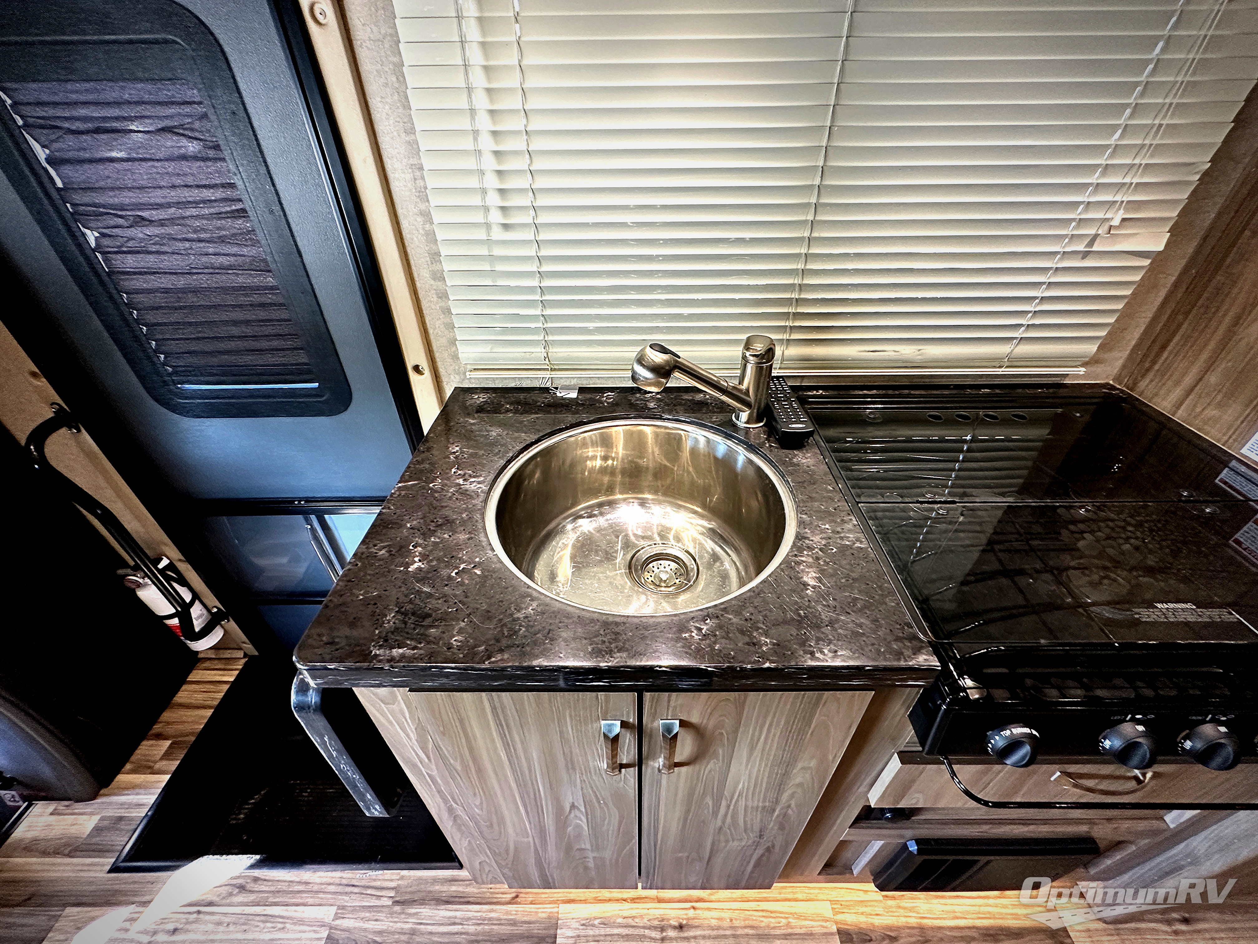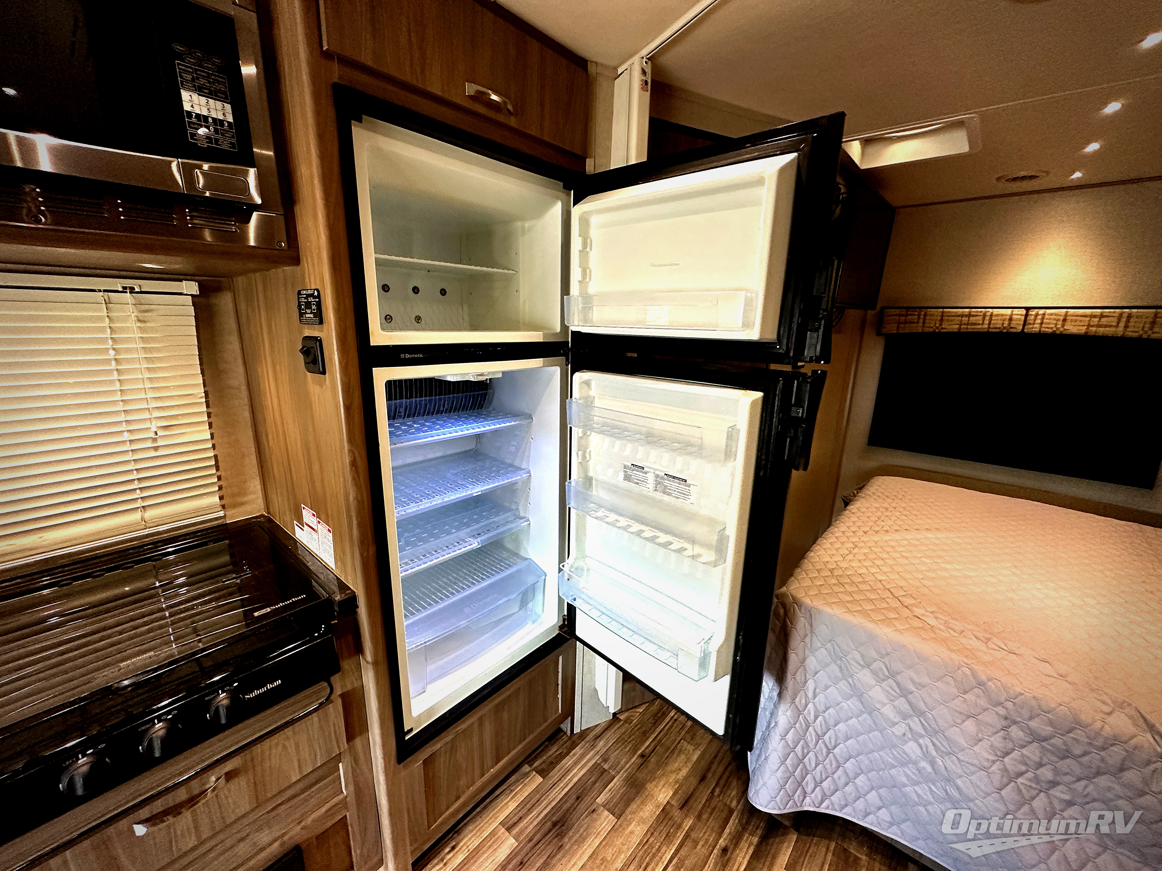To the left of the main entry door you will find the kitchen appliances which include a round single bowl sink, a three burner range with overhead microwave oven, and a refrigerator. There is also overhead storage for dishes and things you might need. Here you can easily create great meals and snacks while on the move!