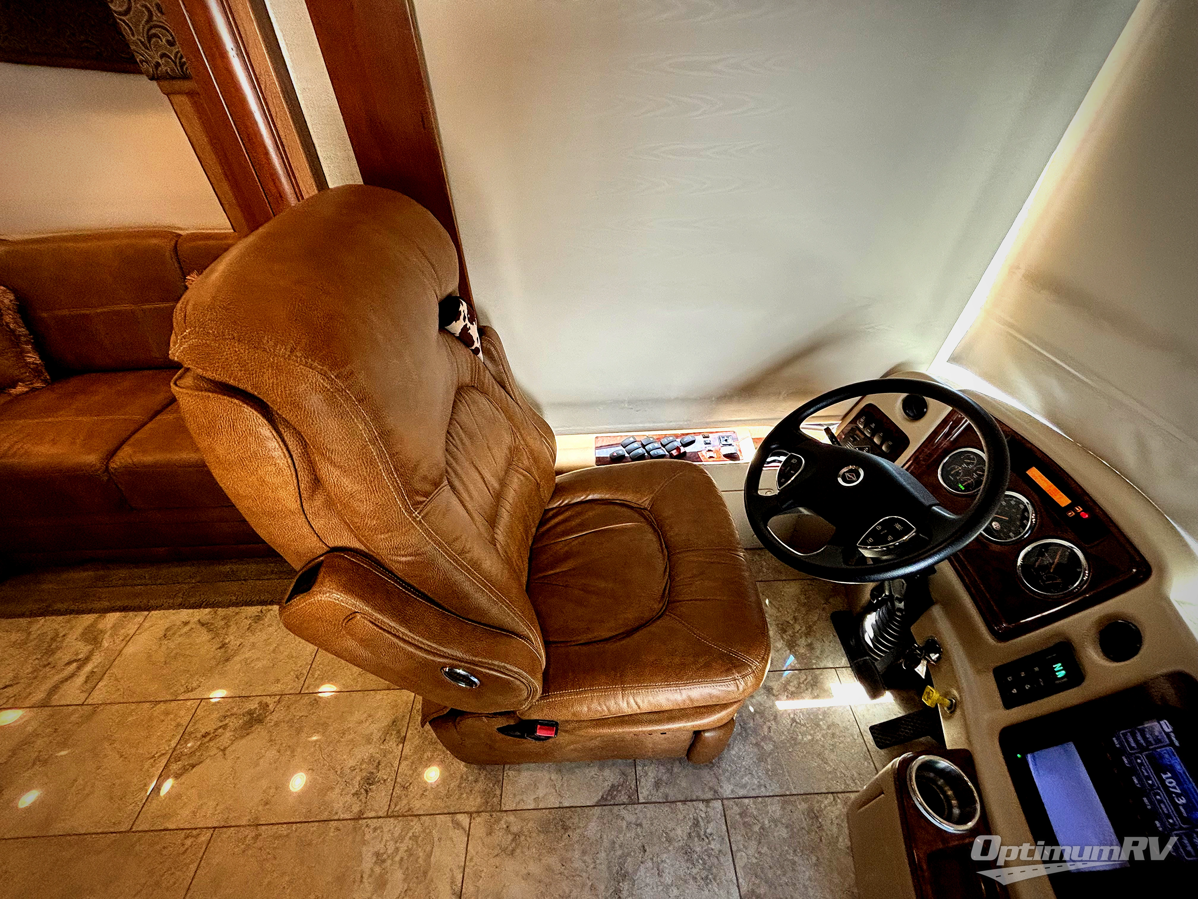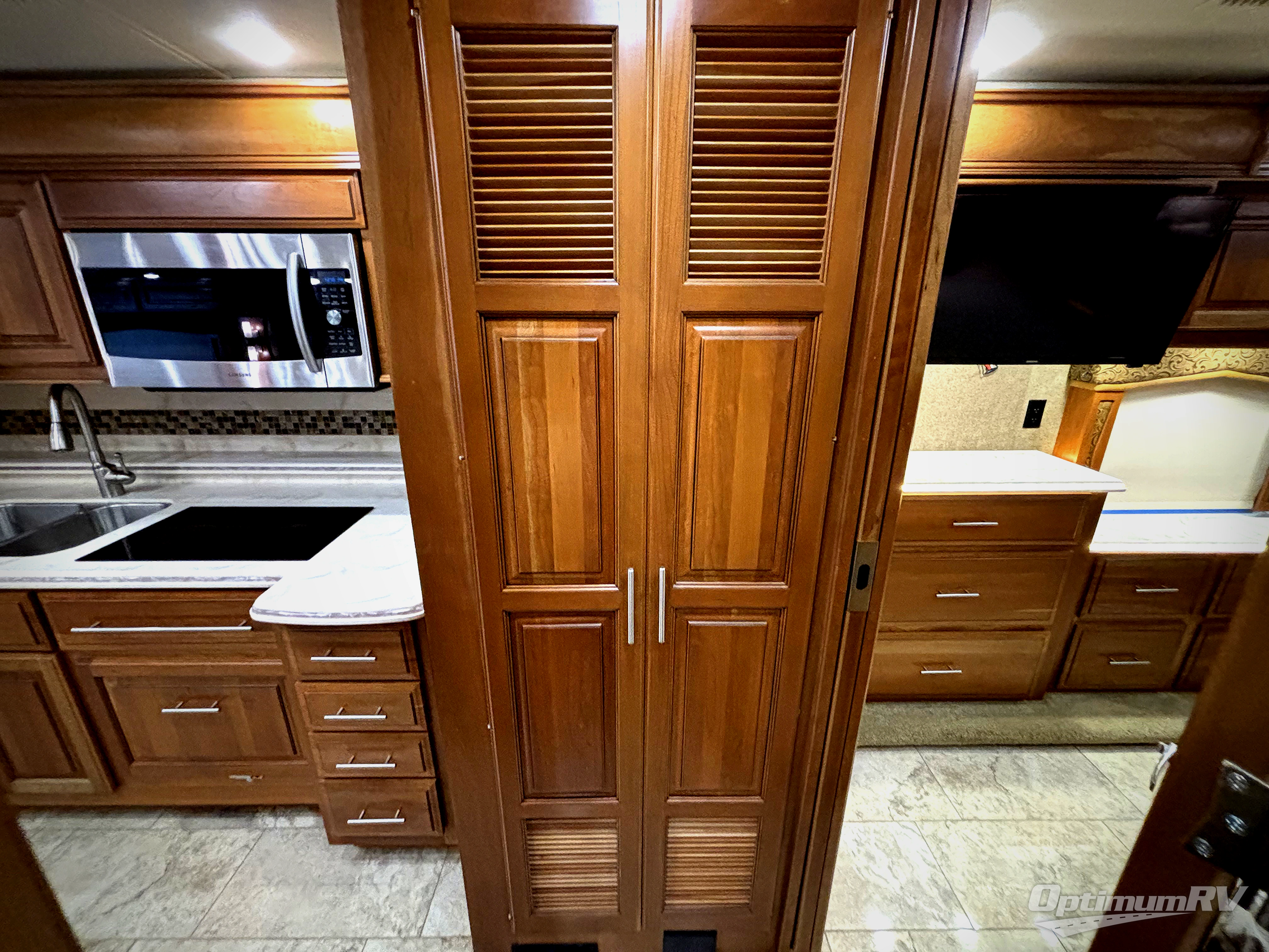 On the passenger side of the motor home, you will find a slide with a hide-a-bed sofa or an optional easy bed, a refrigerator, pantry, double kitchen sink, microwave, overhead cabinets, a shelf, and a two burner range. Next to the slide you will find a washer and dryer. The opposite side of the motor home has a slide with a sofa and dinette, or you can choose an optional free-standing table and desk with chairs plus a hide-a-bed. Next to the slide there is an entertainment center with a 48" LED TV, and a fireplace option.
