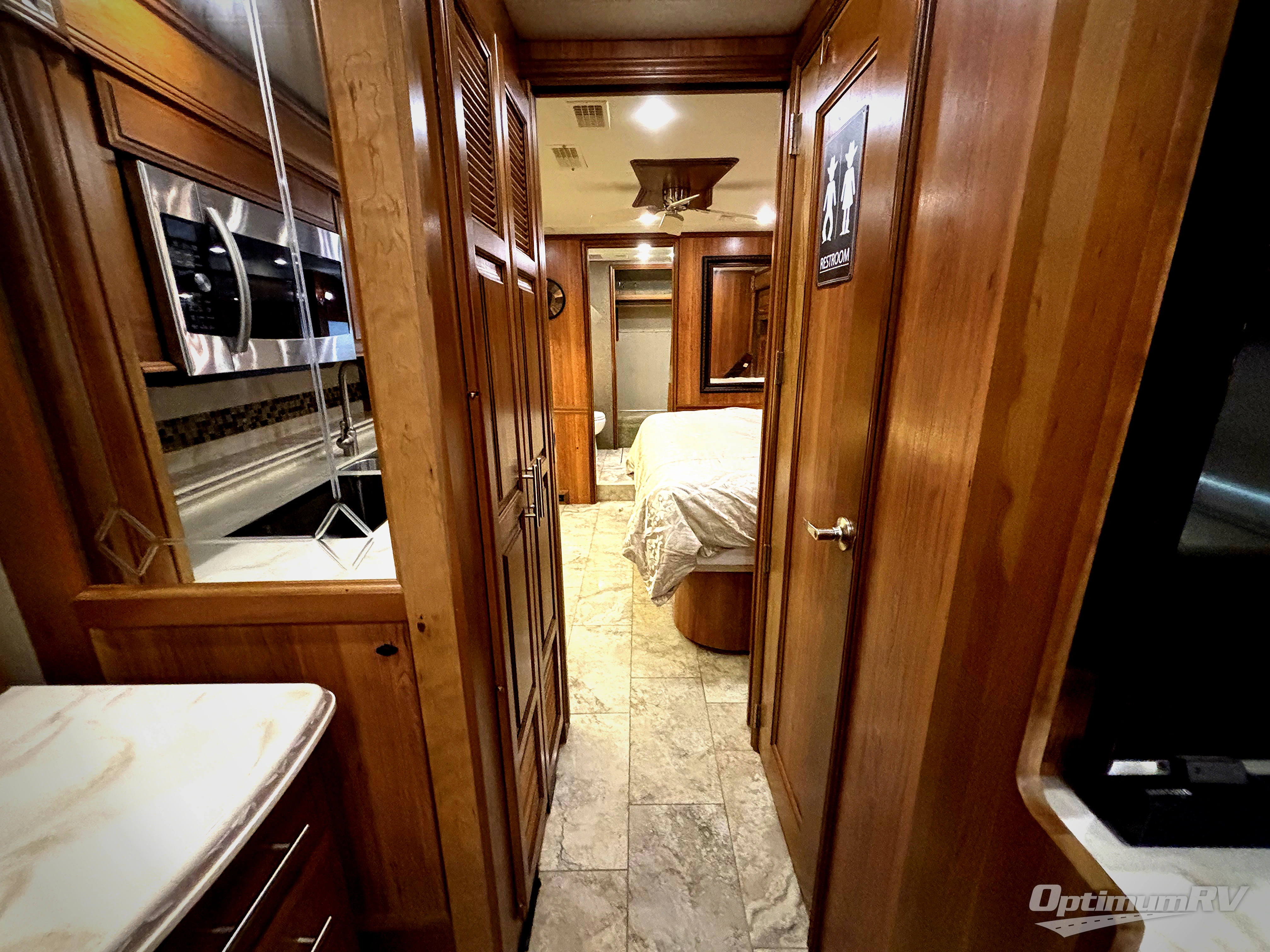 The bedroom offers a king bed slide with nightstands. Across from the bed there is a slide with a vanity and dresser, overhead cabinets, and a 32" LED TV. In the rear of the motor home you will find a master bath with a corner shower, linen cabinet, toilet, sink, and medicine cabinet. Along the full rear wall there is a wardrobe with sliding mirror doors.