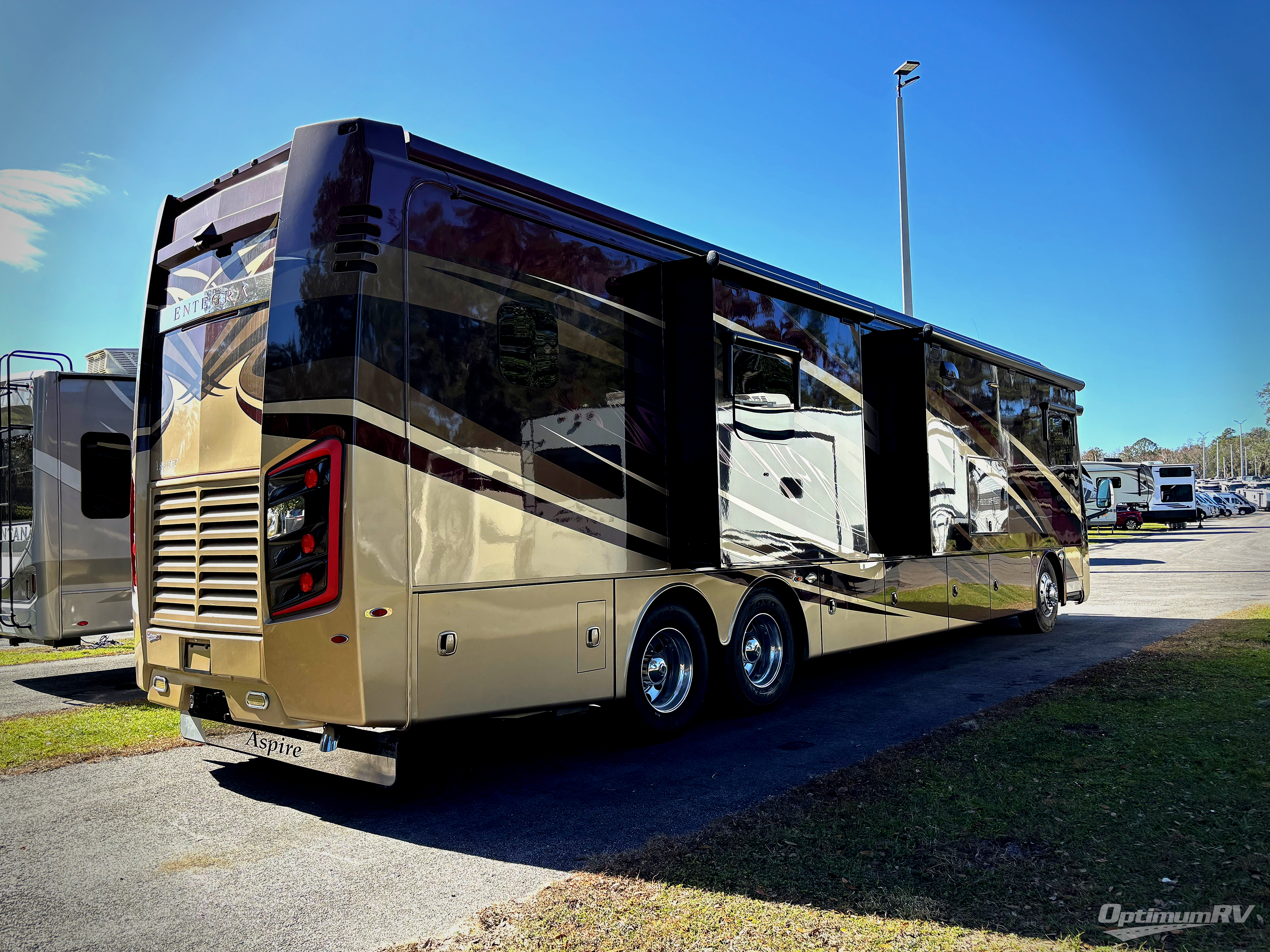 This Aspire 42RBQ class A diesel motor home by Entegra Coach offers quad slides for plenty of walking around room, a bath and a half, and an outside entertainment center with a 40" LED TV to watch your favorite shows in the great outdoors, plus more!