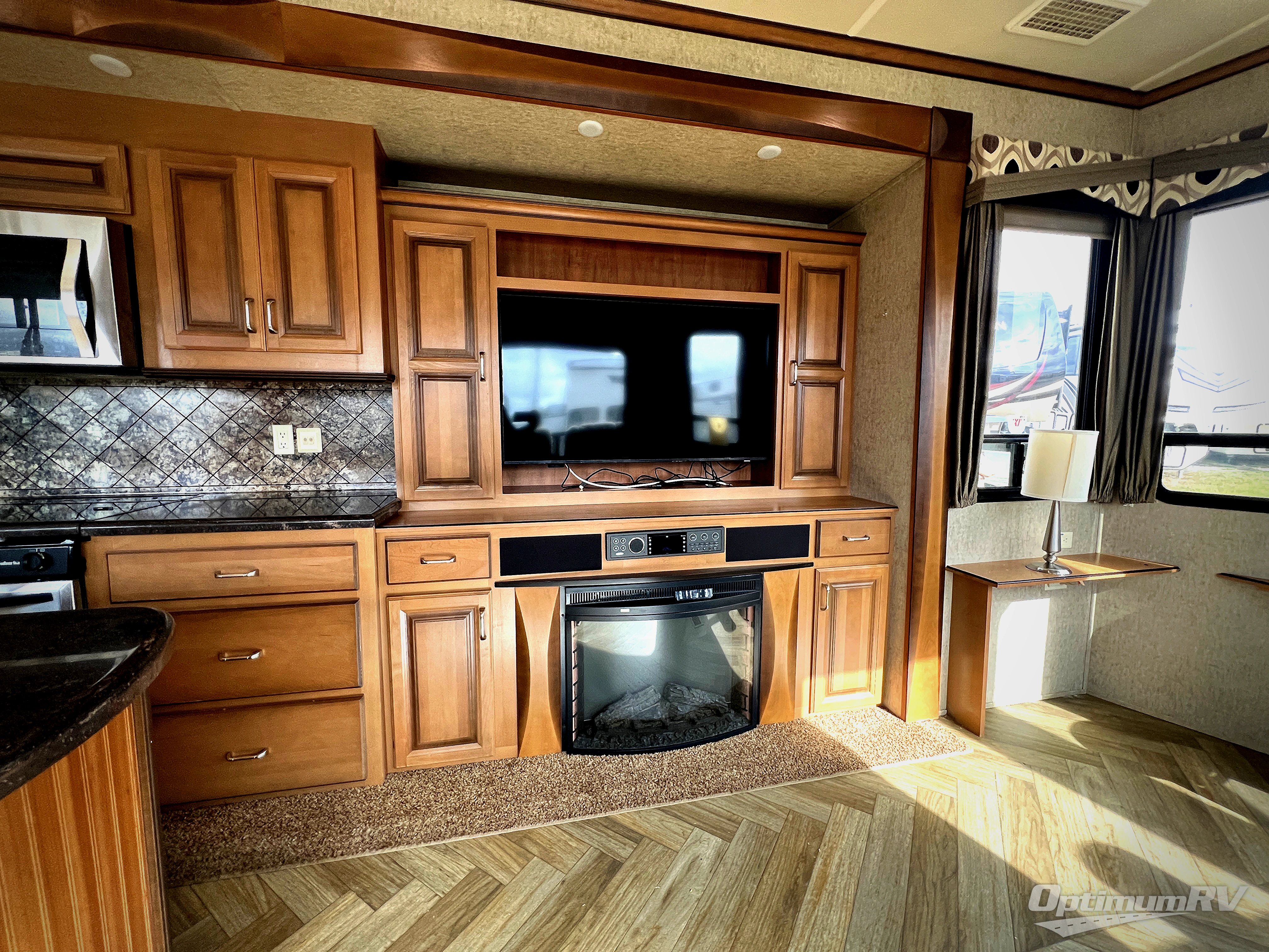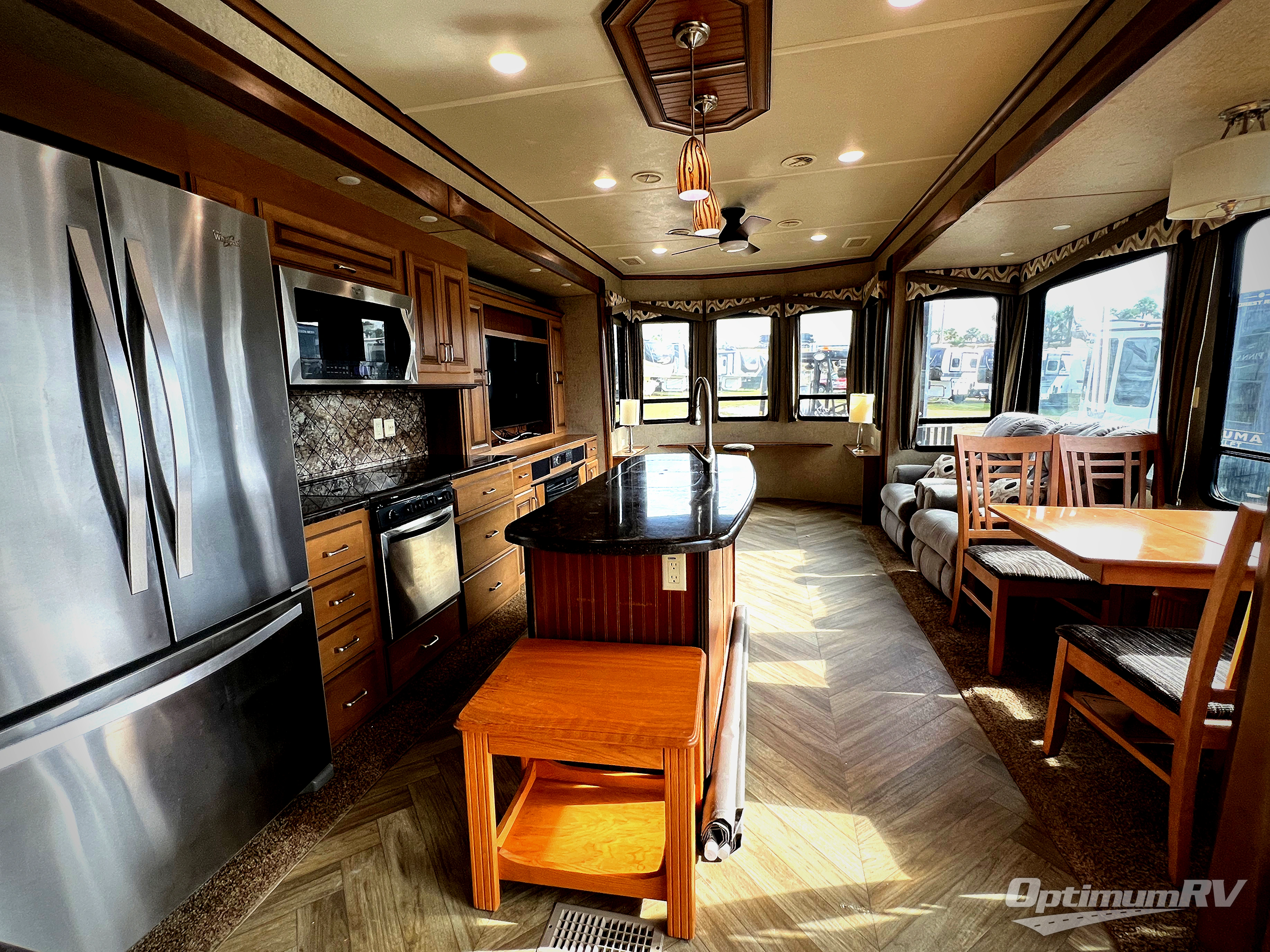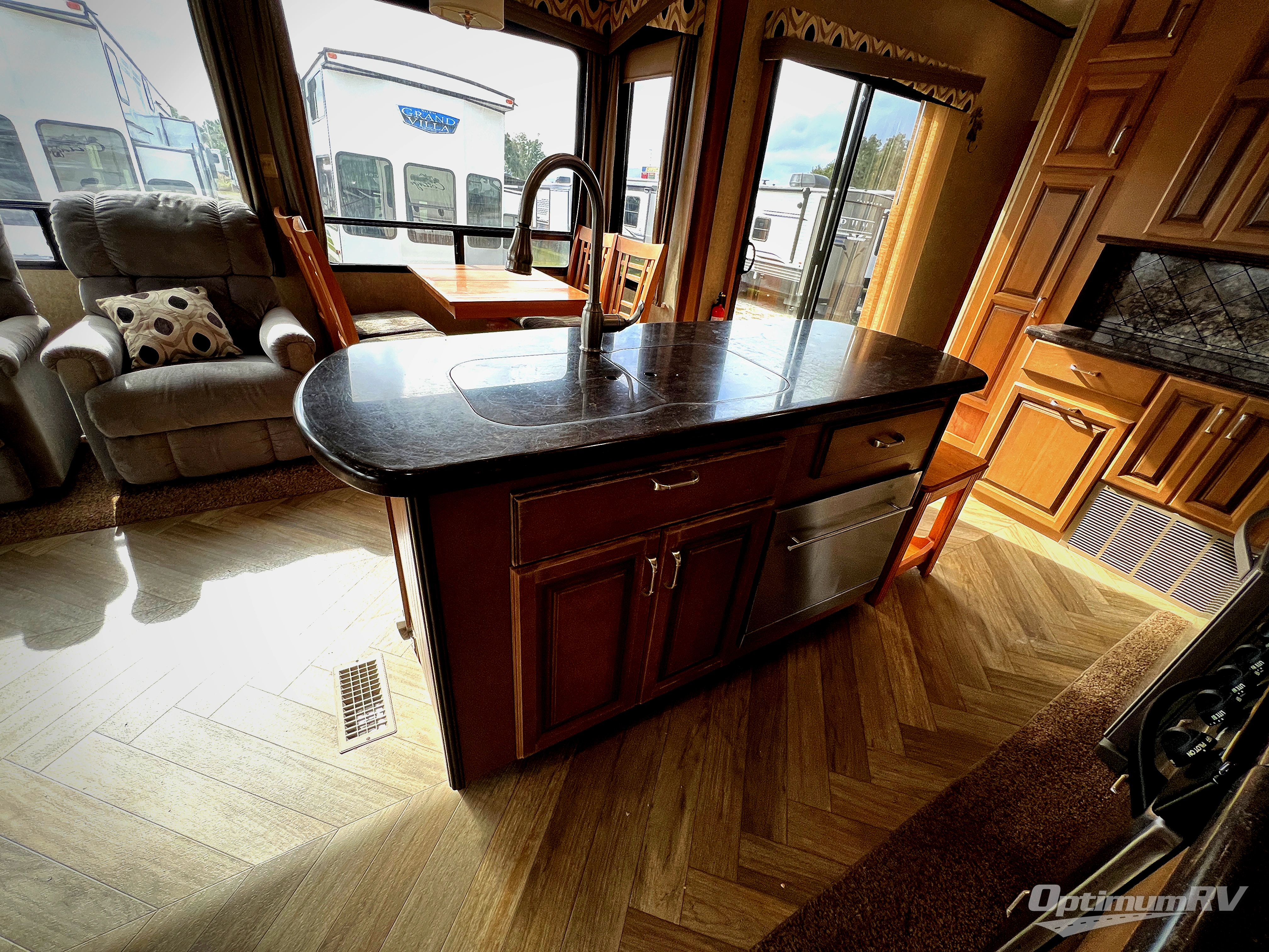Inside the front main entrance you will find to the right a kitchen and living area. This space offers dual opposing slides which provides a wide open feel space. The first slide has a free-standing table and chairs along with two additional lounge chairs. In the front of the trailer, there is a sofa with end tables. The second slide offers a refrigerator, pantry, three burner range, microwave, and pantry with dressers below. You will also find an entertainment center with a fireplace below in this same slide out. Adjacent to the refrigerator there is extra counter space as well as an overhead cabinet. Meal prep is a bit easier with the center island. You will also find that the double kitchen sink is located in the island. To help with clean-up you can opt for a dishwasher.