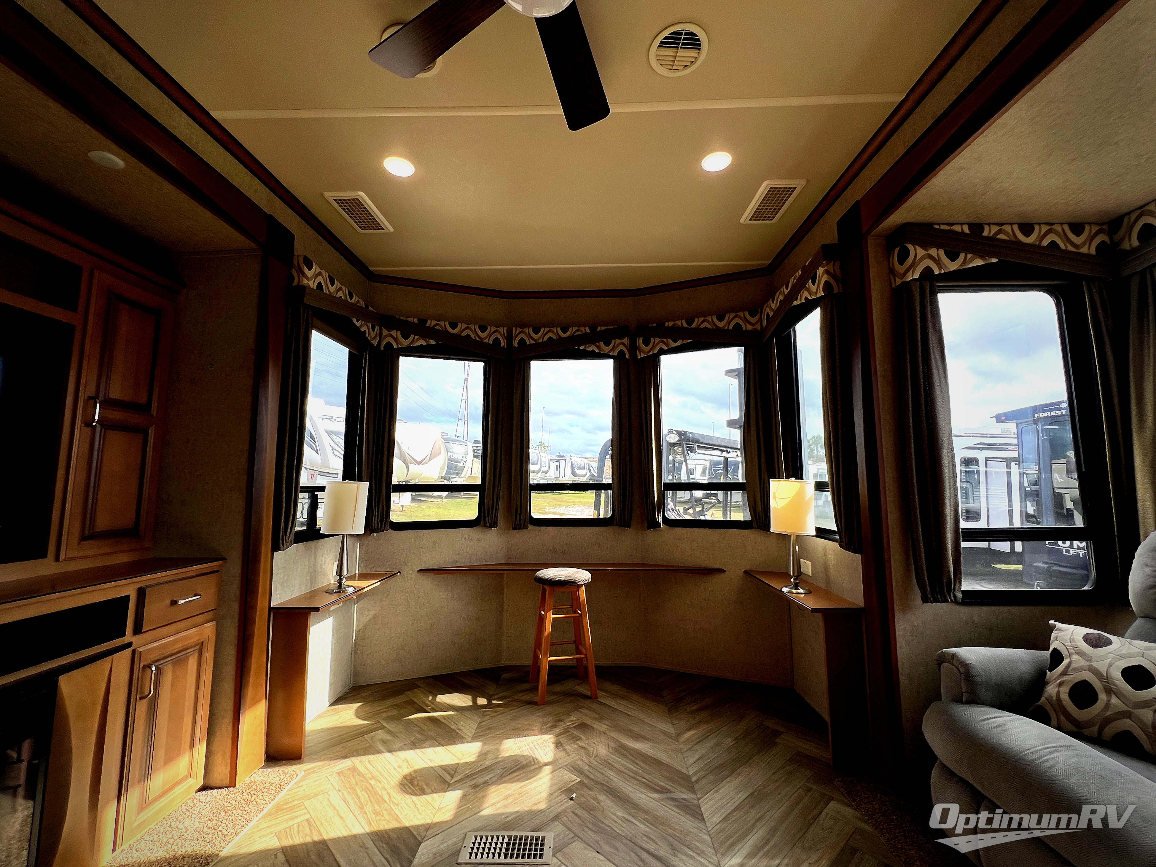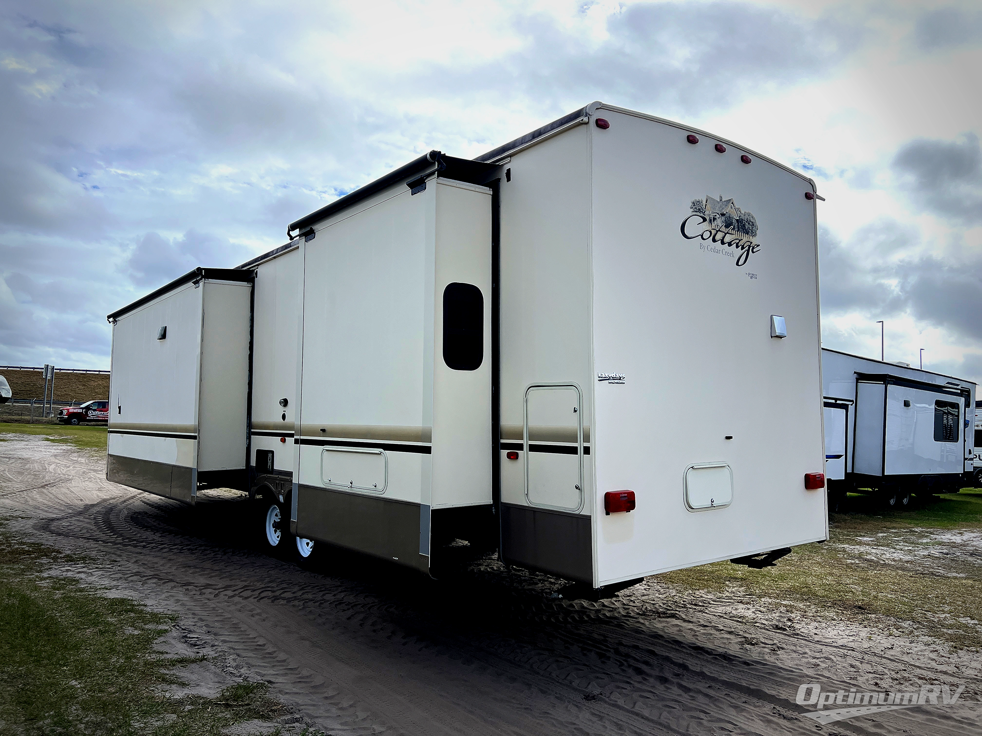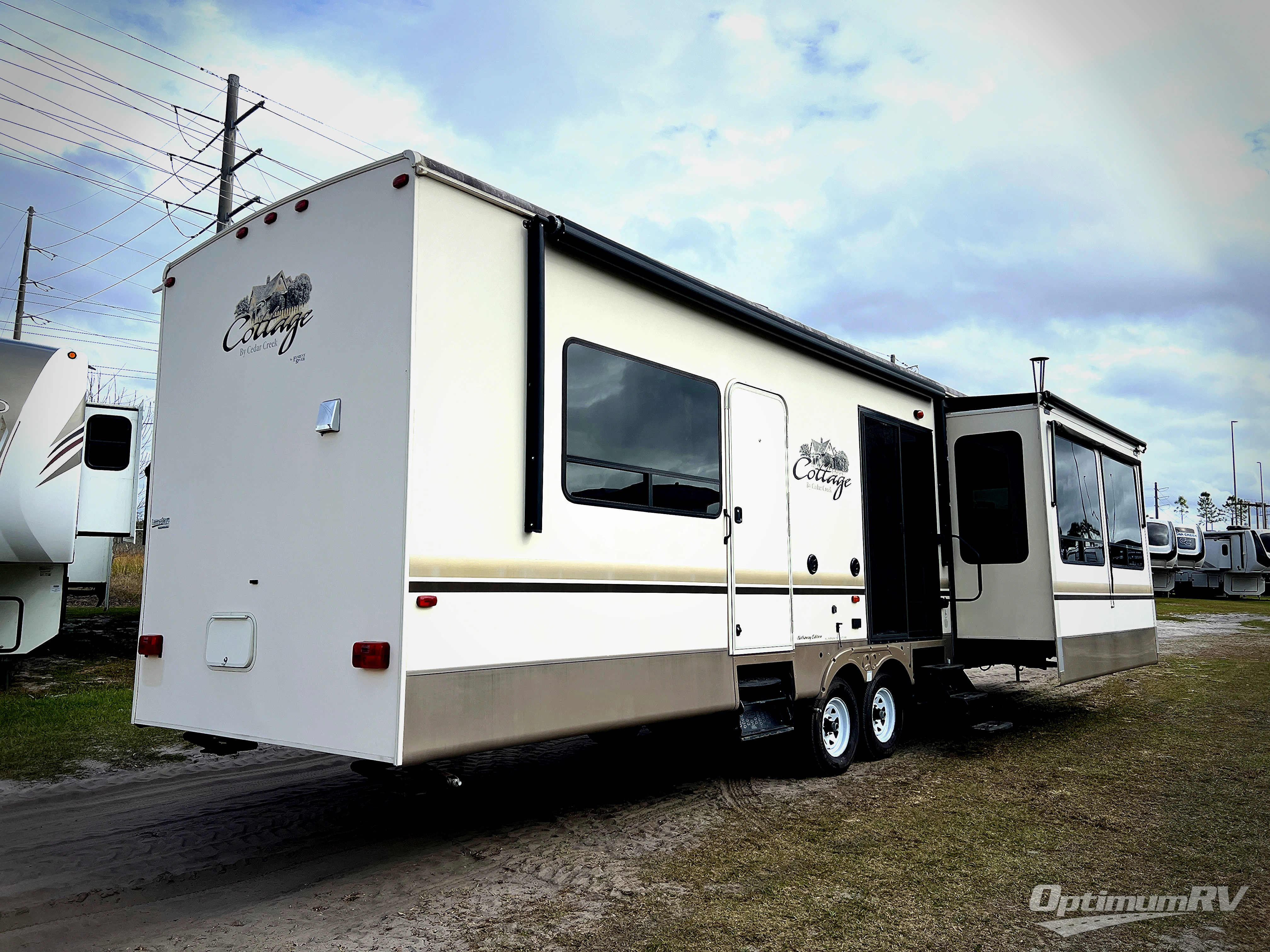 As you enter this Cedar Creek Cottage destination trailer model 40CCK by Forest River you will be wowed by the space that the triple slide outs provide in this destination trailer!