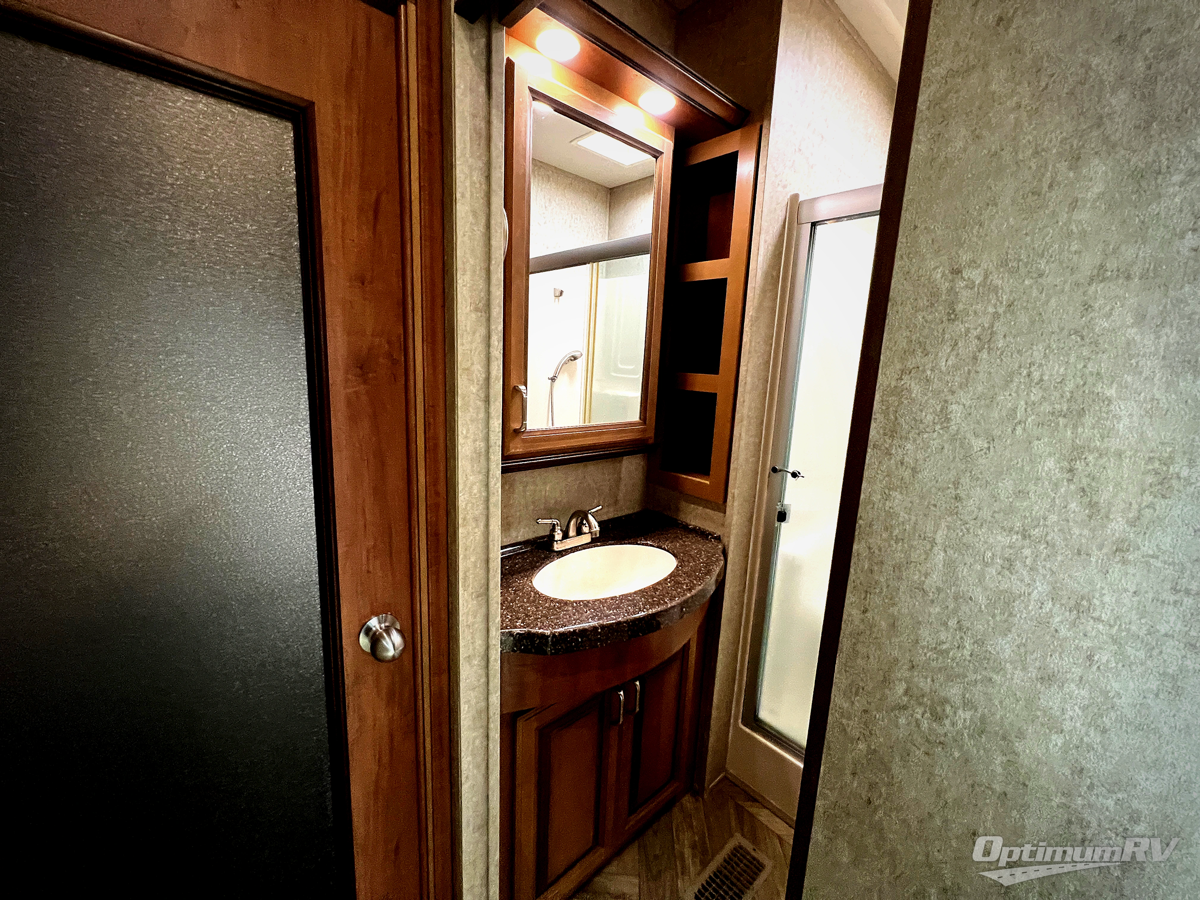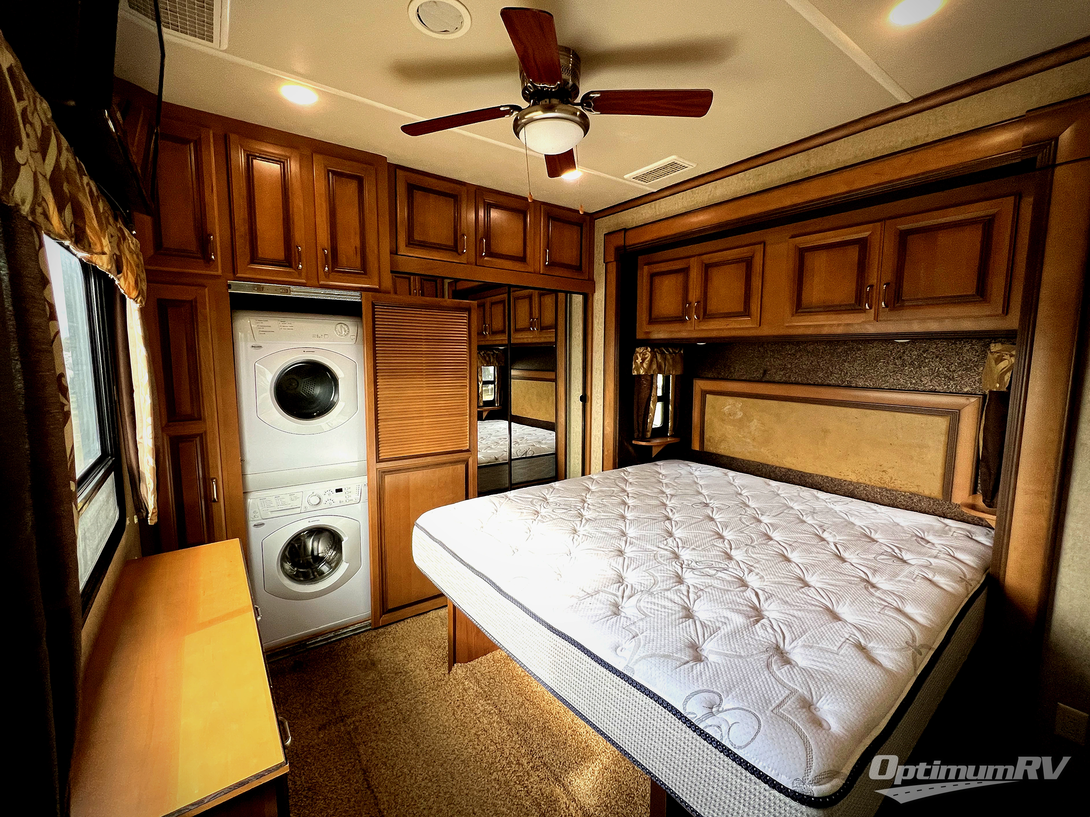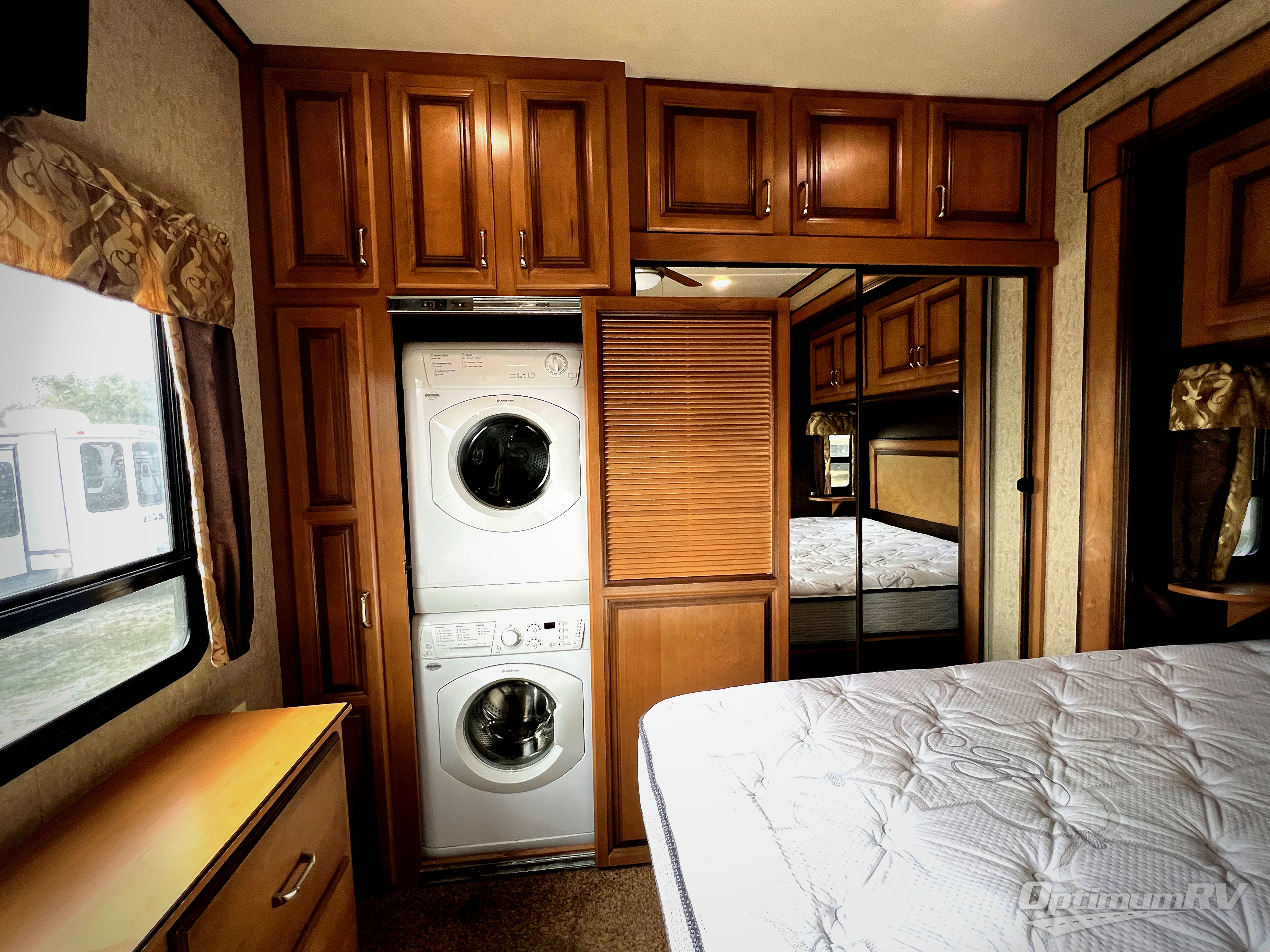 The rear bedroom provides a relaxing retreat where you can enjoy a queen bed slide with overhead cabinet, and shelves. Along the rear wall find a wardrobe, washer and dryer prepped area in case you wish to add the appliances for more convenience, and drawer space. You will also find a dresser opposite the bed for additional storage. There is a convenient second entry door into the bedroom.