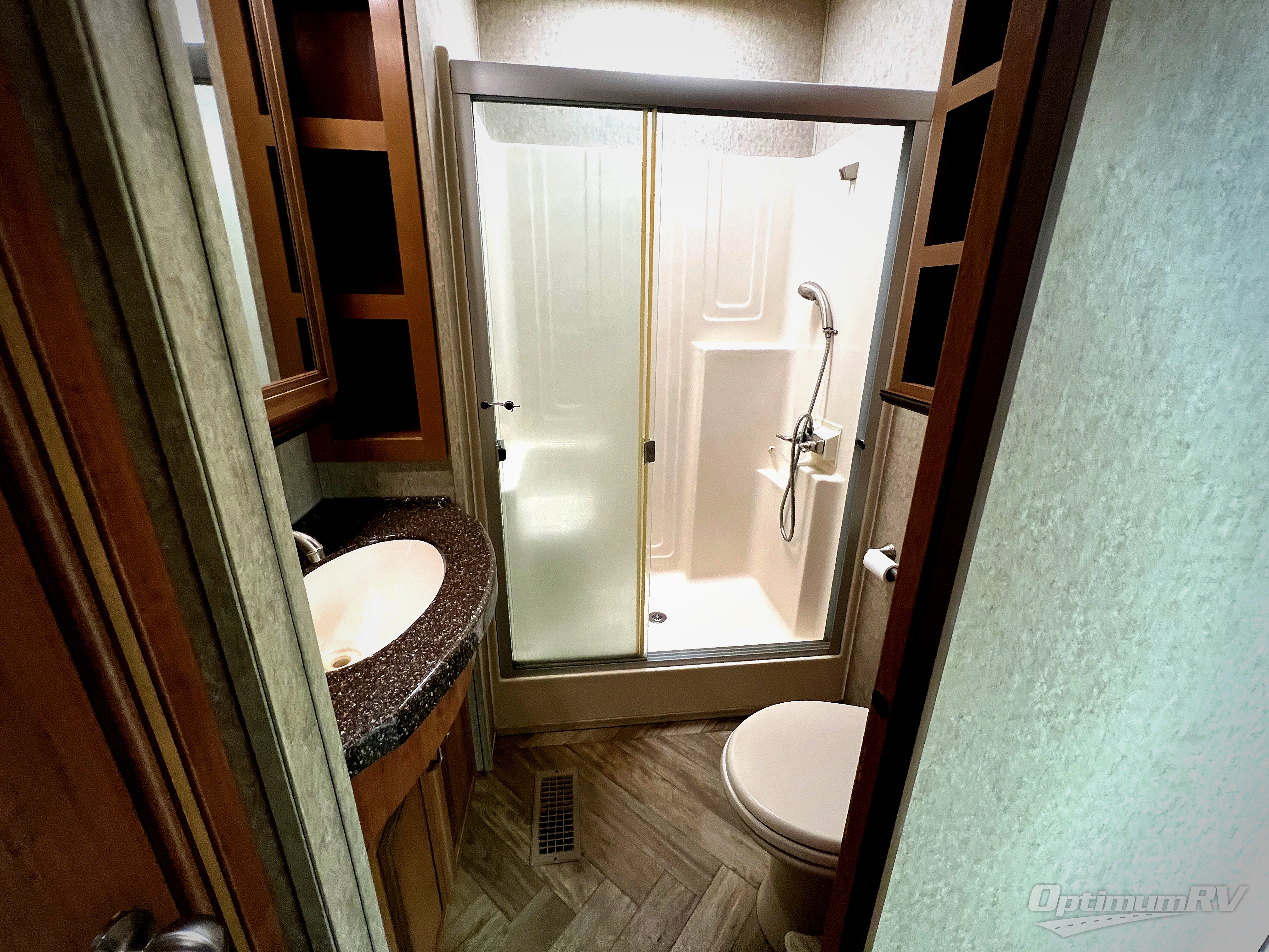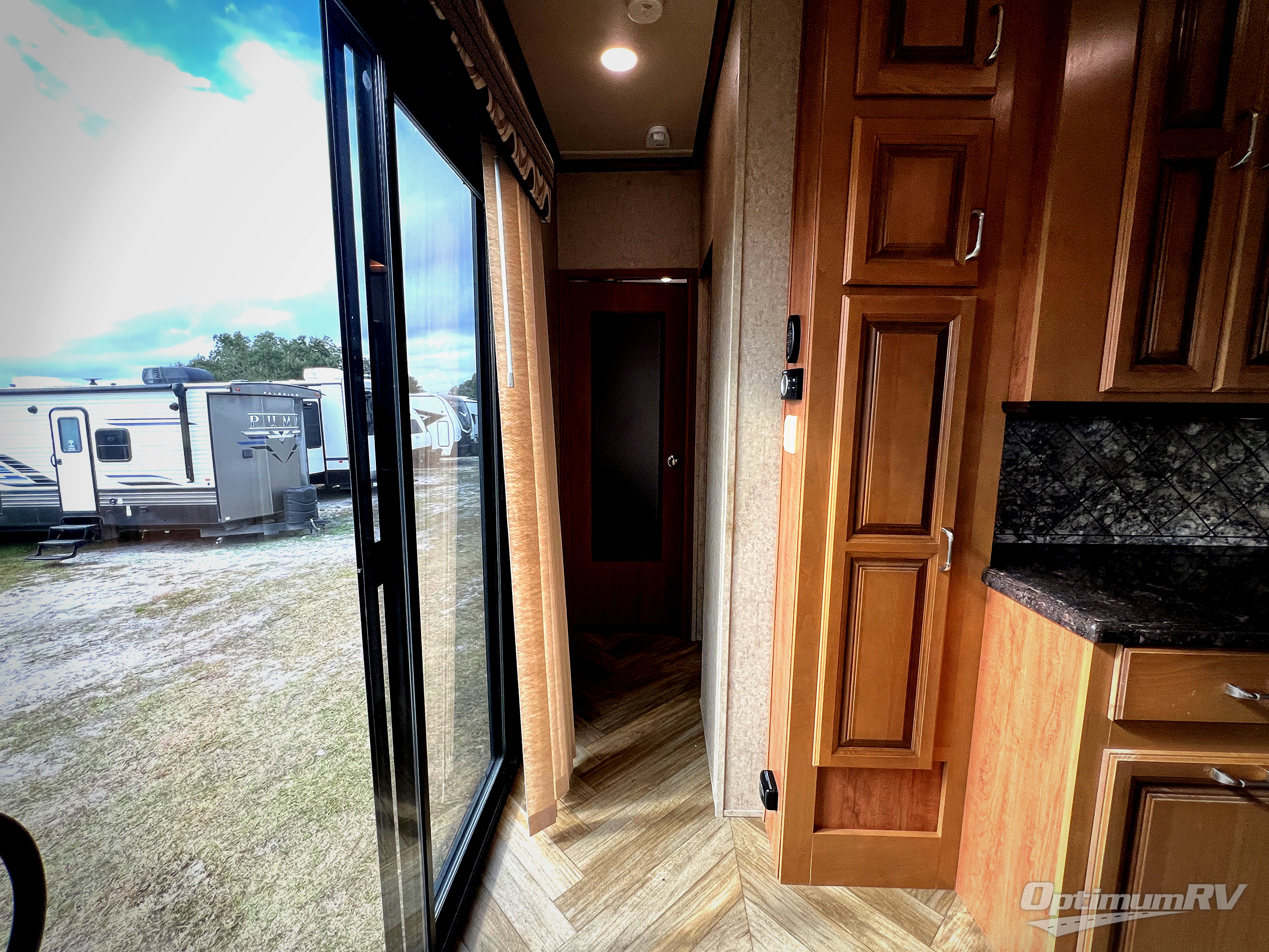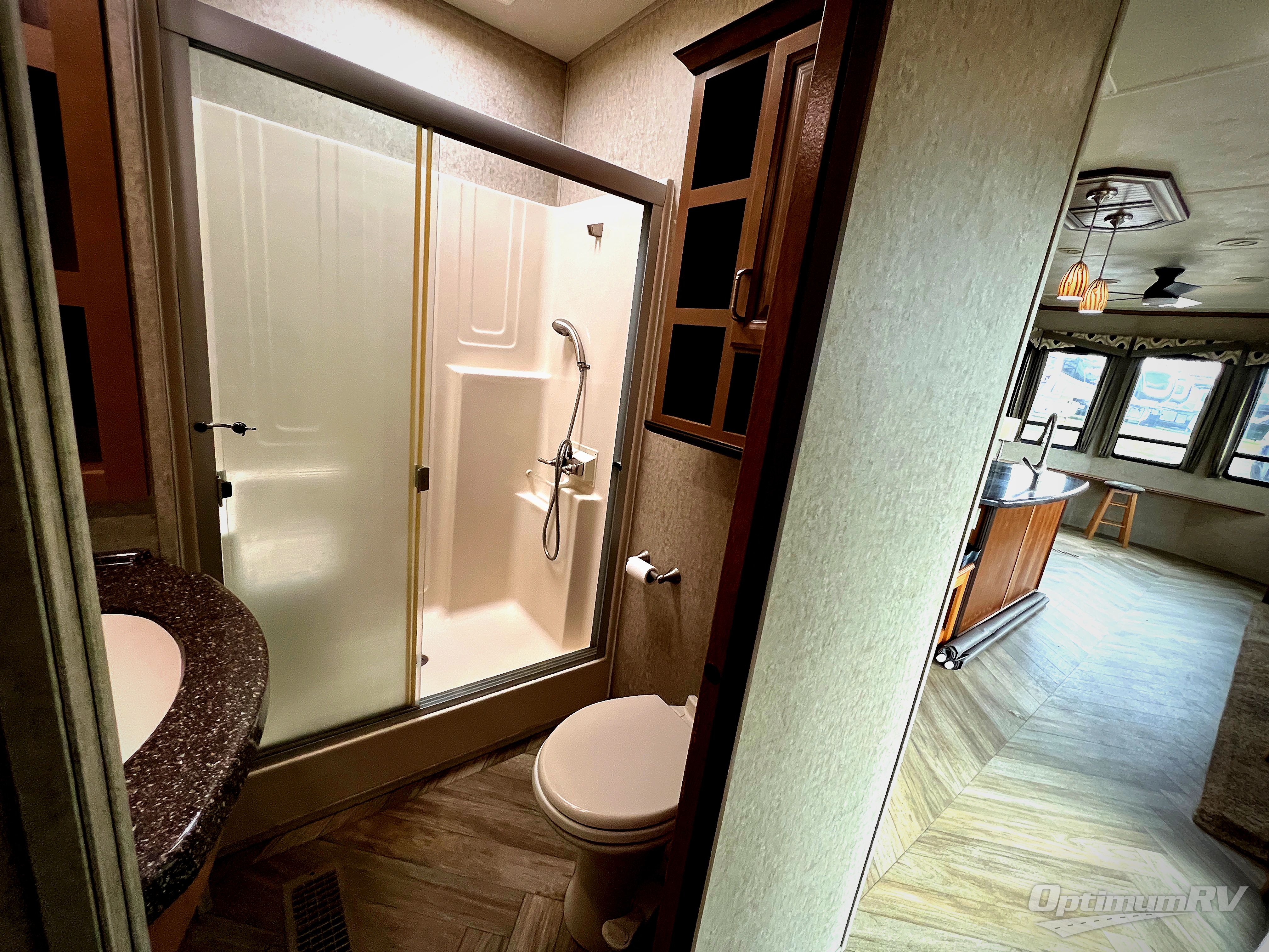 The rear bedroom provides a relaxing retreat where you can enjoy a queen bed slide with overhead cabinet, and shelves. Along the rear wall find a wardrobe, washer and dryer prepped area in case you wish to add the appliances for more convenience, and drawer space. You will also find a dresser opposite the bed for additional storage. There is a convenient second entry door into the bedroom.