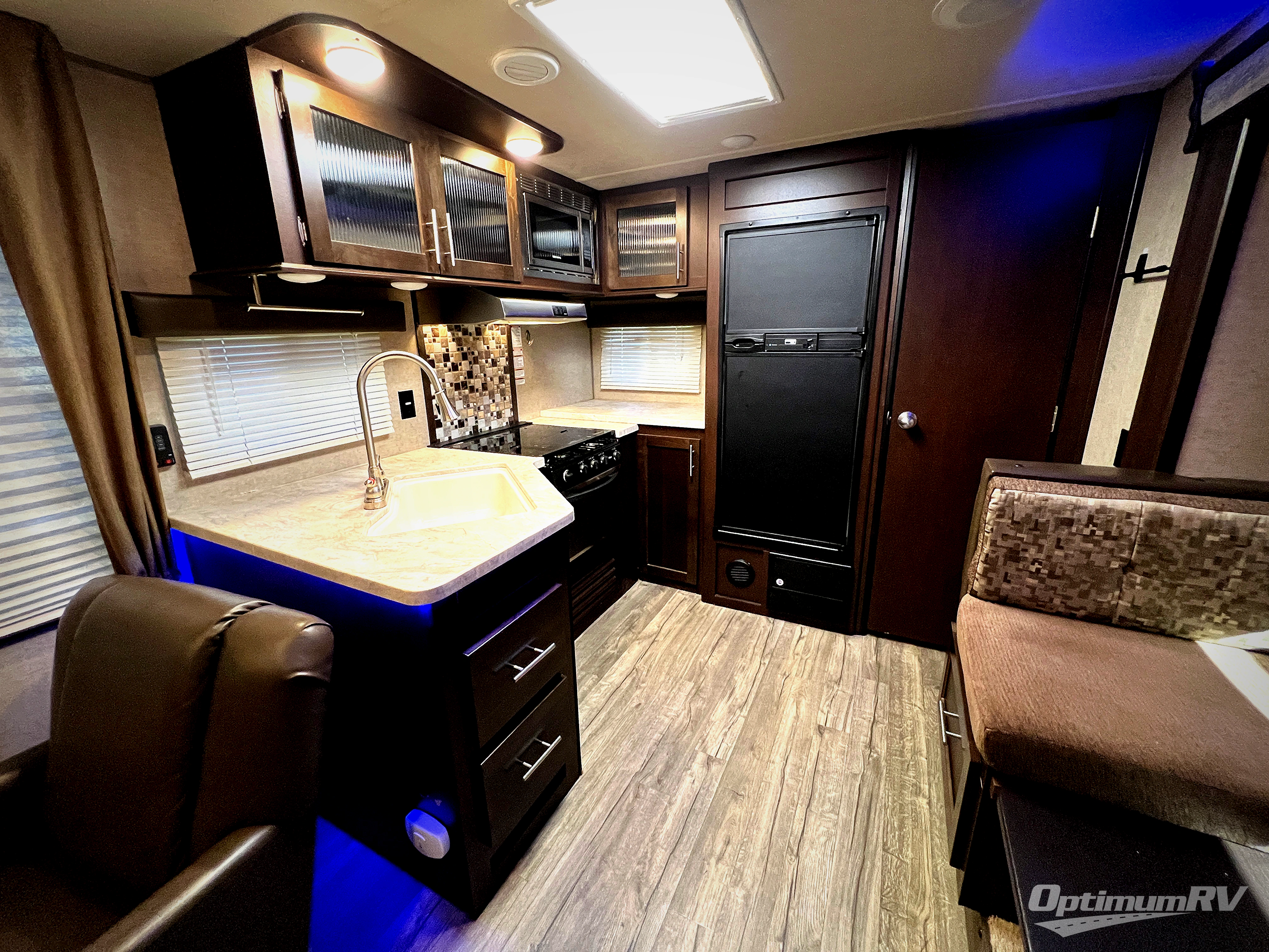 As you enter the trailer, to the left there is a lounge chair. In the kitchen area you will find a large kitchen sink, three burner range, and microwave. Along the rear wall there is a refrigerator, large pantry, and extra counter space for food prep. Along one side of the trailer you will find a u-dinette slide and adjacent to the slide there is an entertainment center.