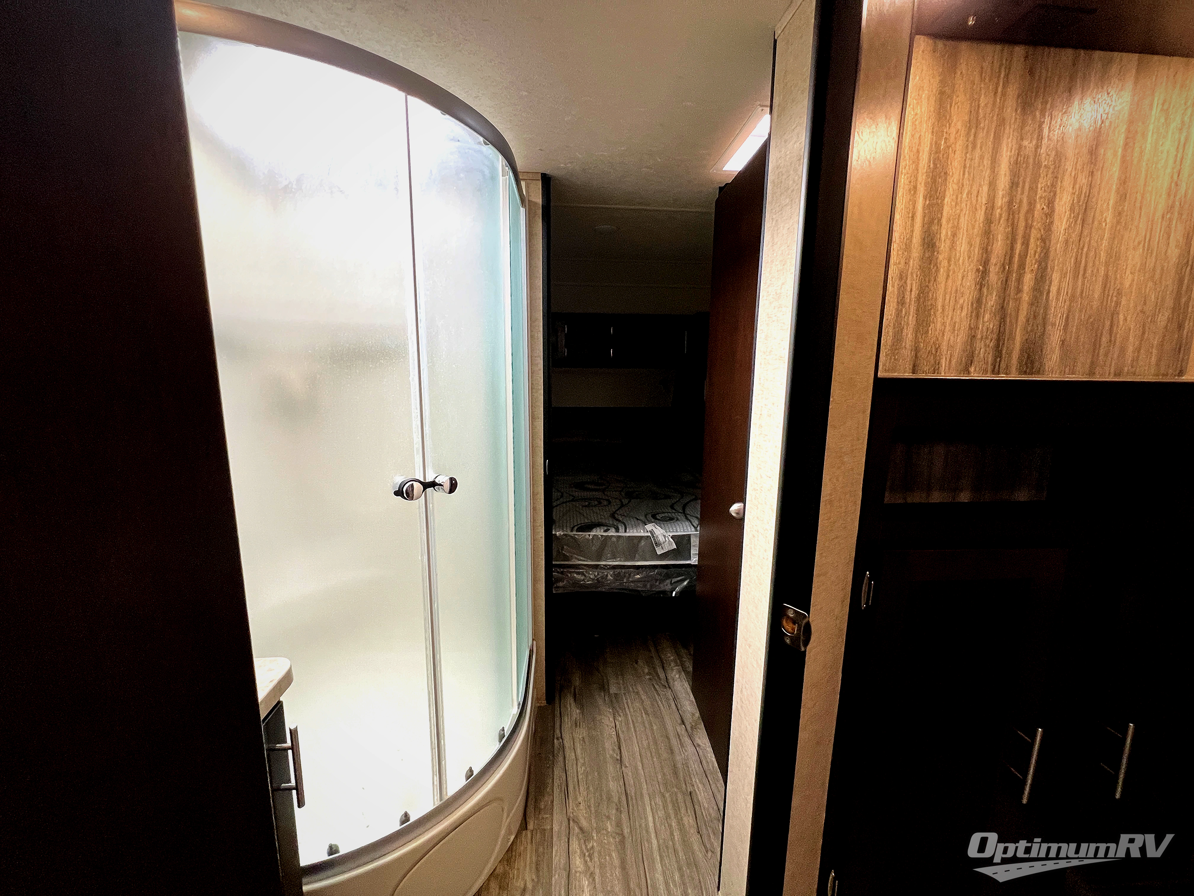 The bathroom is a walk-thru with a sink, and neo-angle shower on one side of the trailer and a toilet and wardrobe on the opposite side.