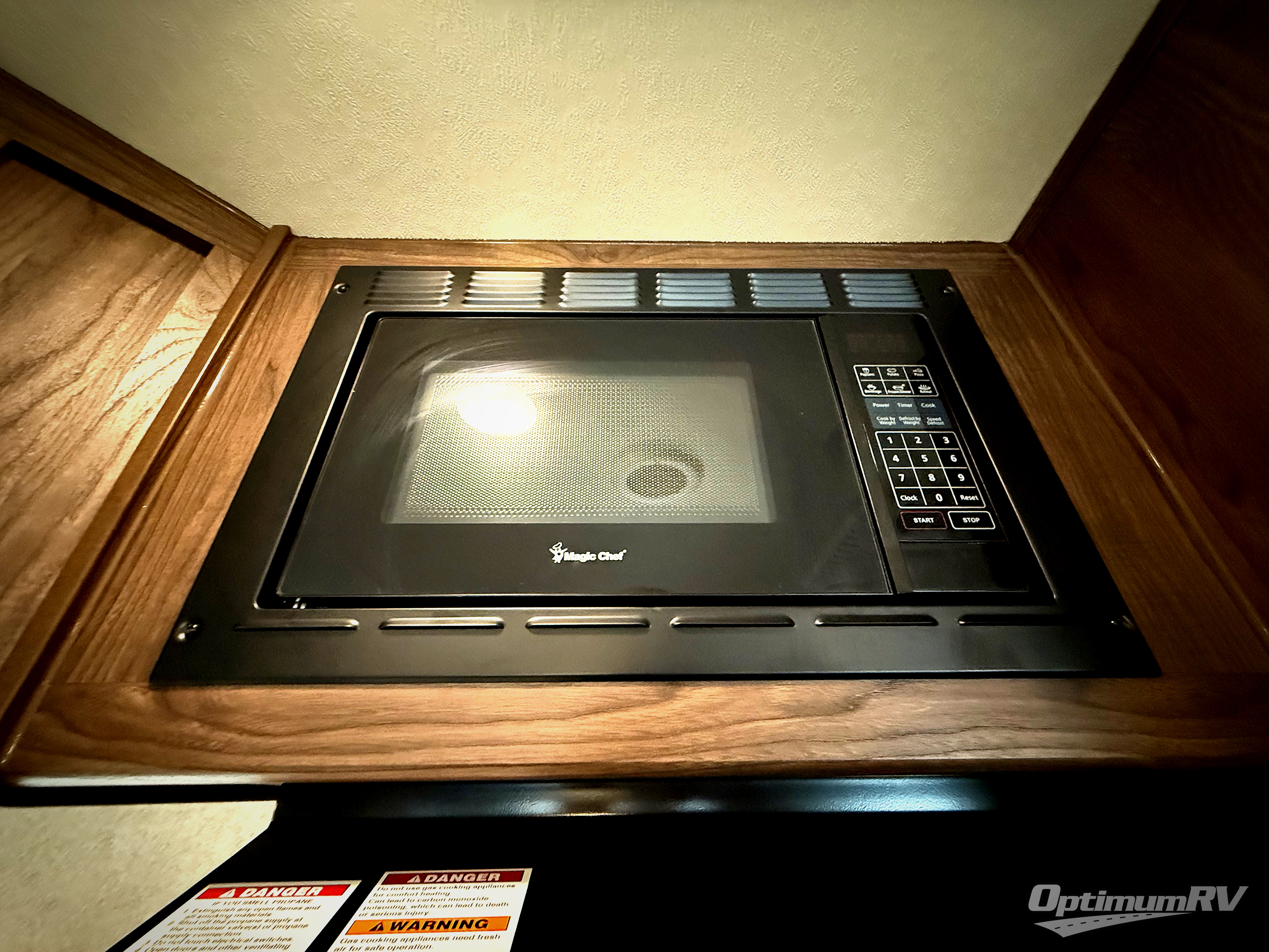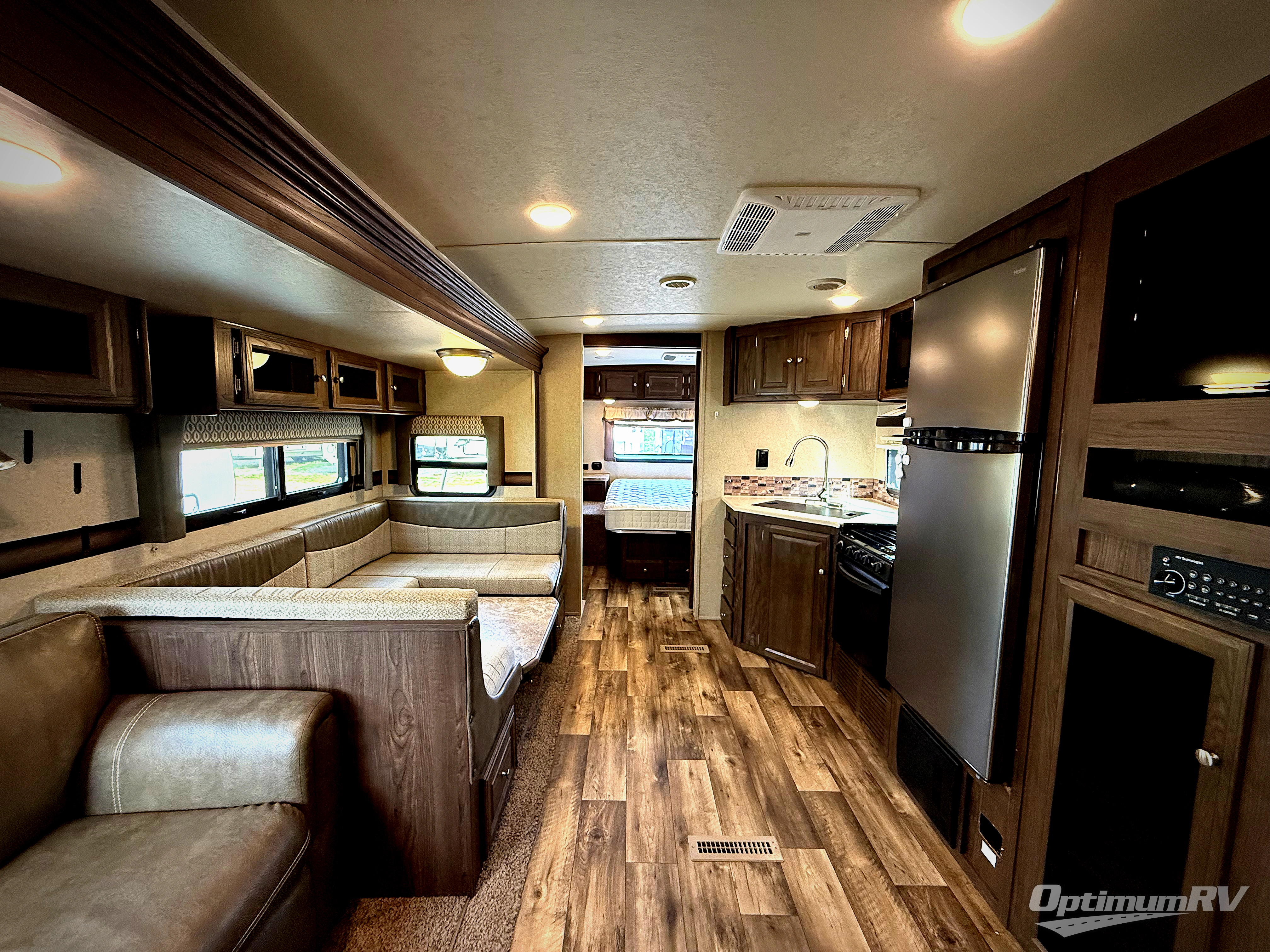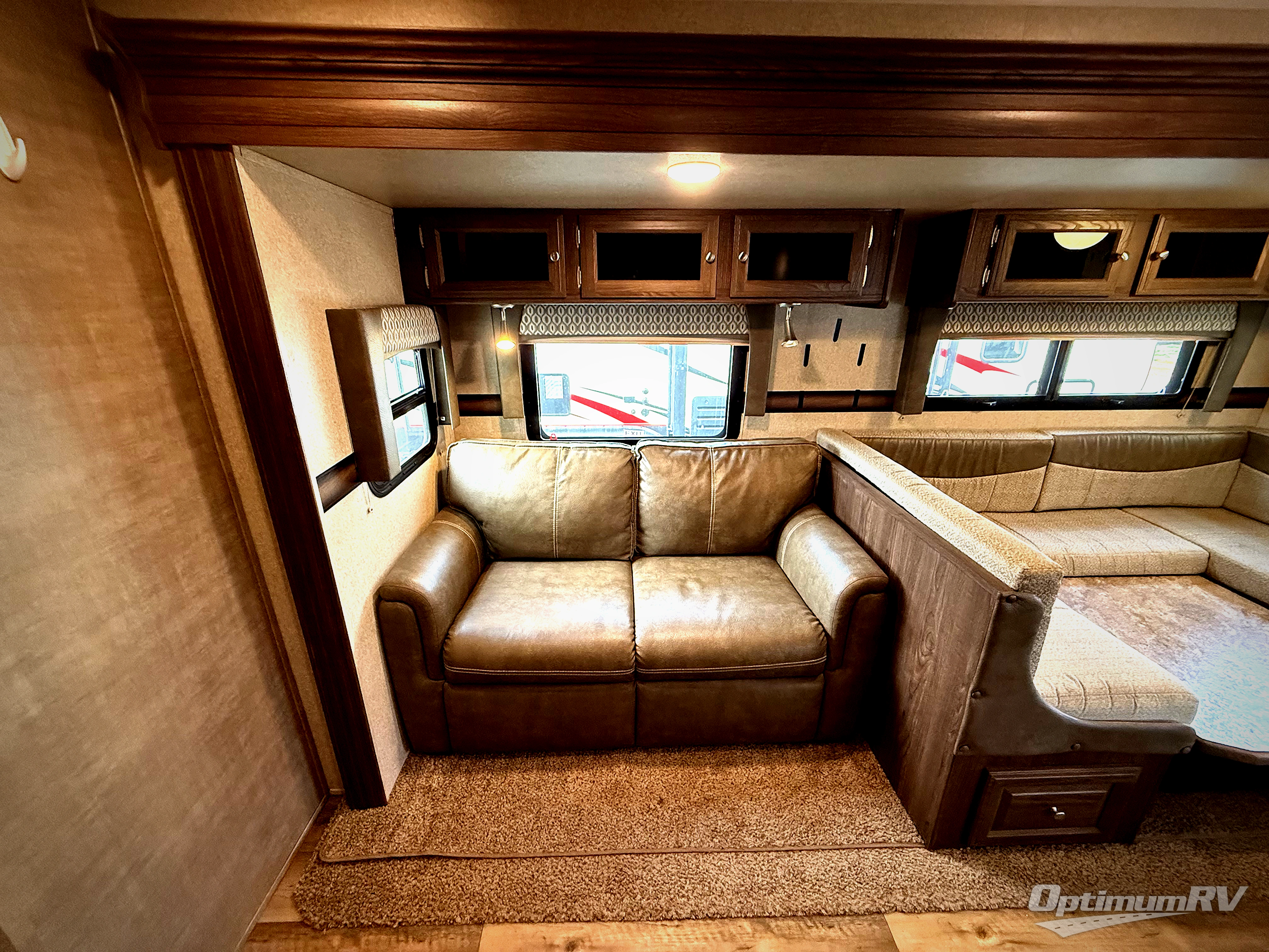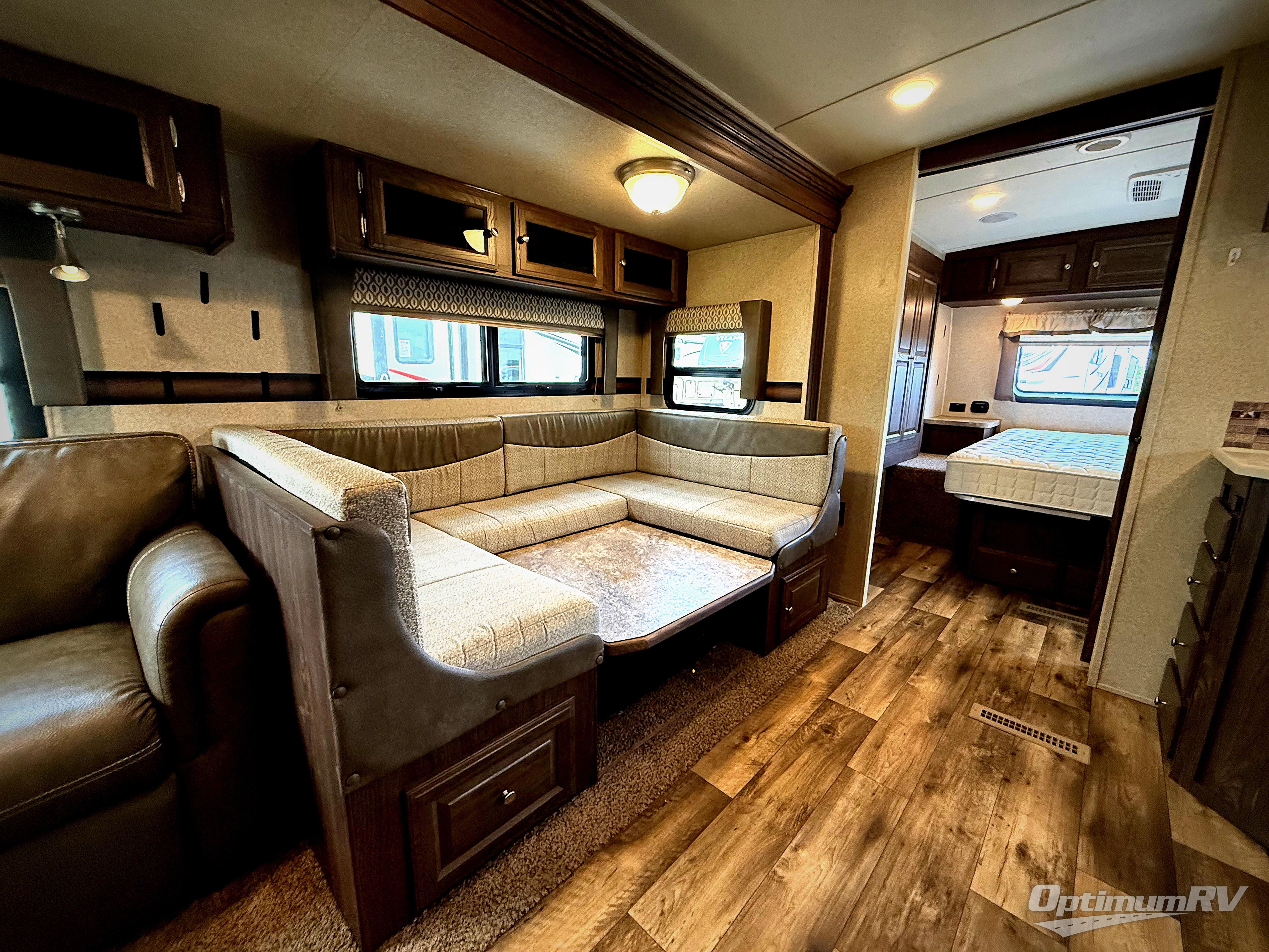 To the right of the entry door is your kitchen area where you will find a large pantry with an entertainment center above, plus a refrigerator and three burner range including an overhead microwave oven. There is also a double sink for dishes, a counter-top extension, and ample overhead storage for your daily dishes and odds and ends. Opposite the kitchen equipment you will find a 60" sofa and an 81" booth dinette both featuring cabinets above so you can tuck away all of your belongings when not in use.