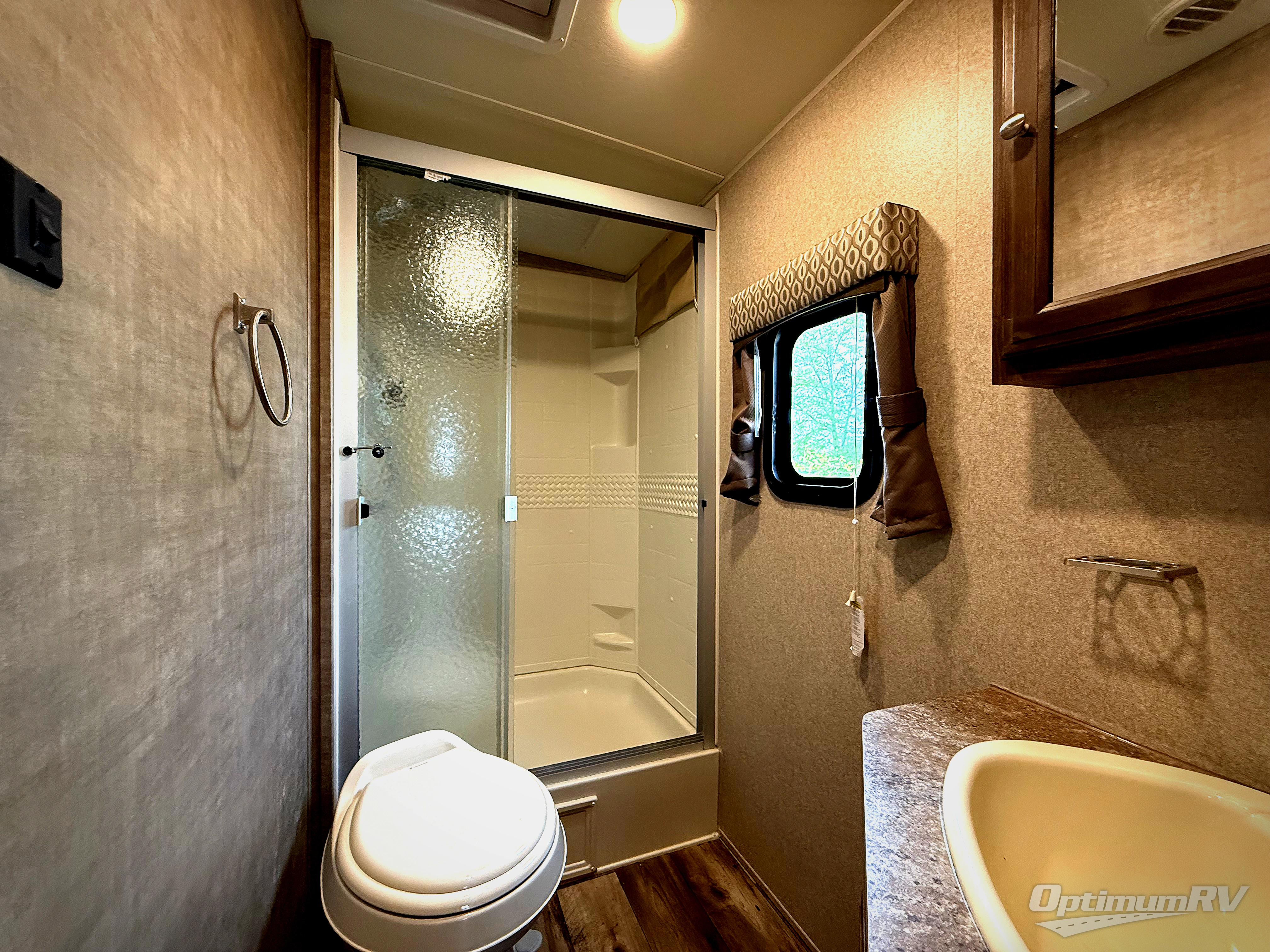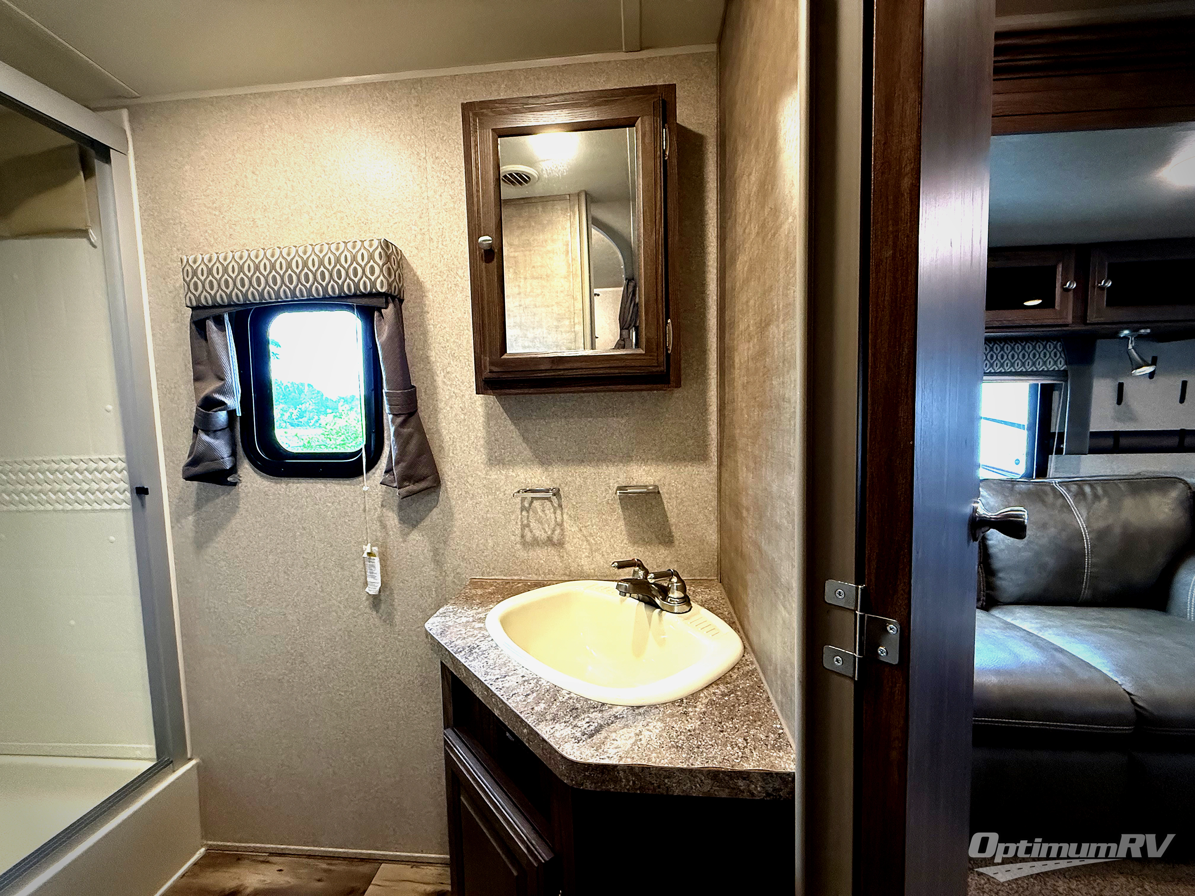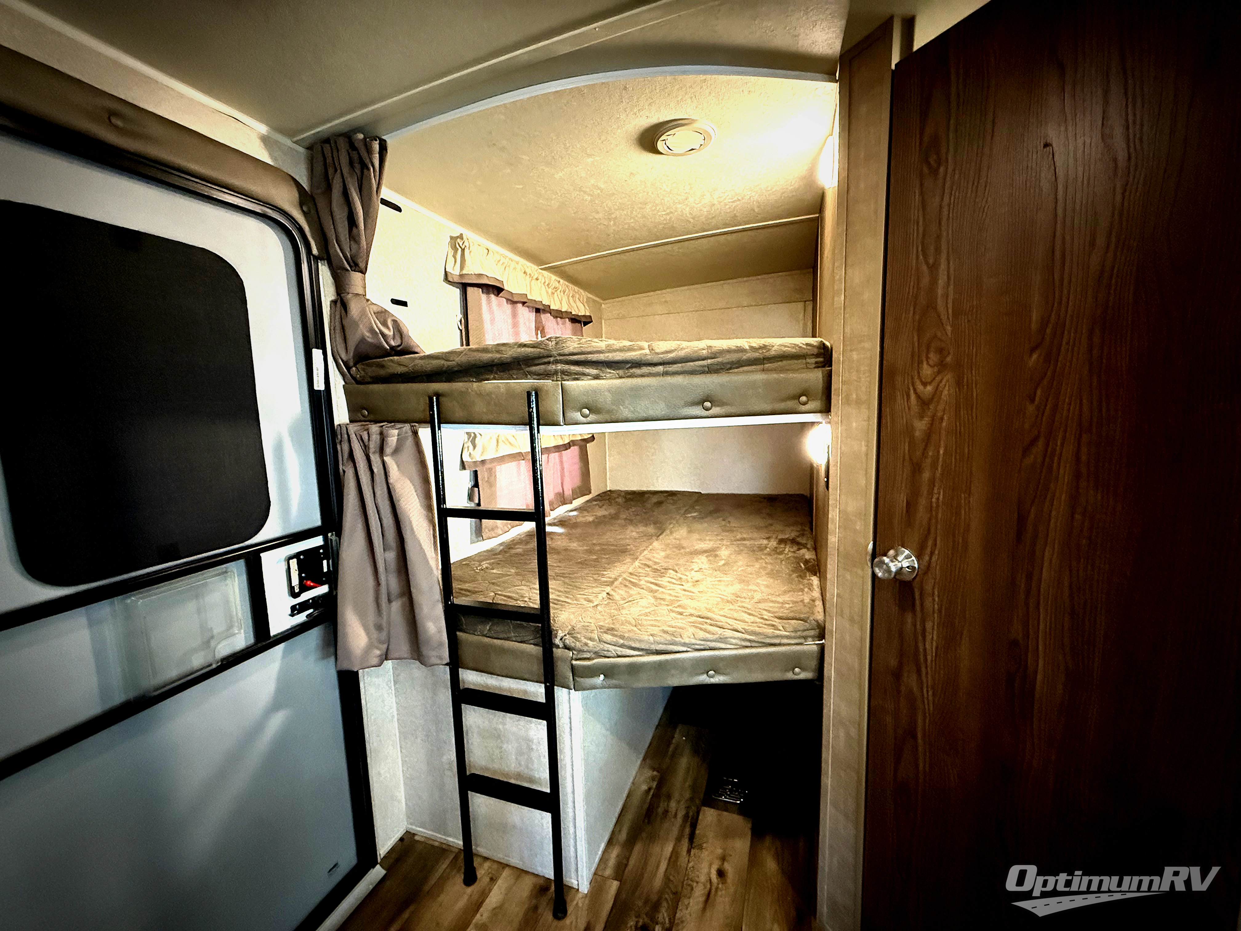 Step inside and notice the double bed bunks that are 48" x 76" in the rear left corner. Further in you will find a conveniently located bathroom complete with shower, toilet, and a corner vanity with sink.