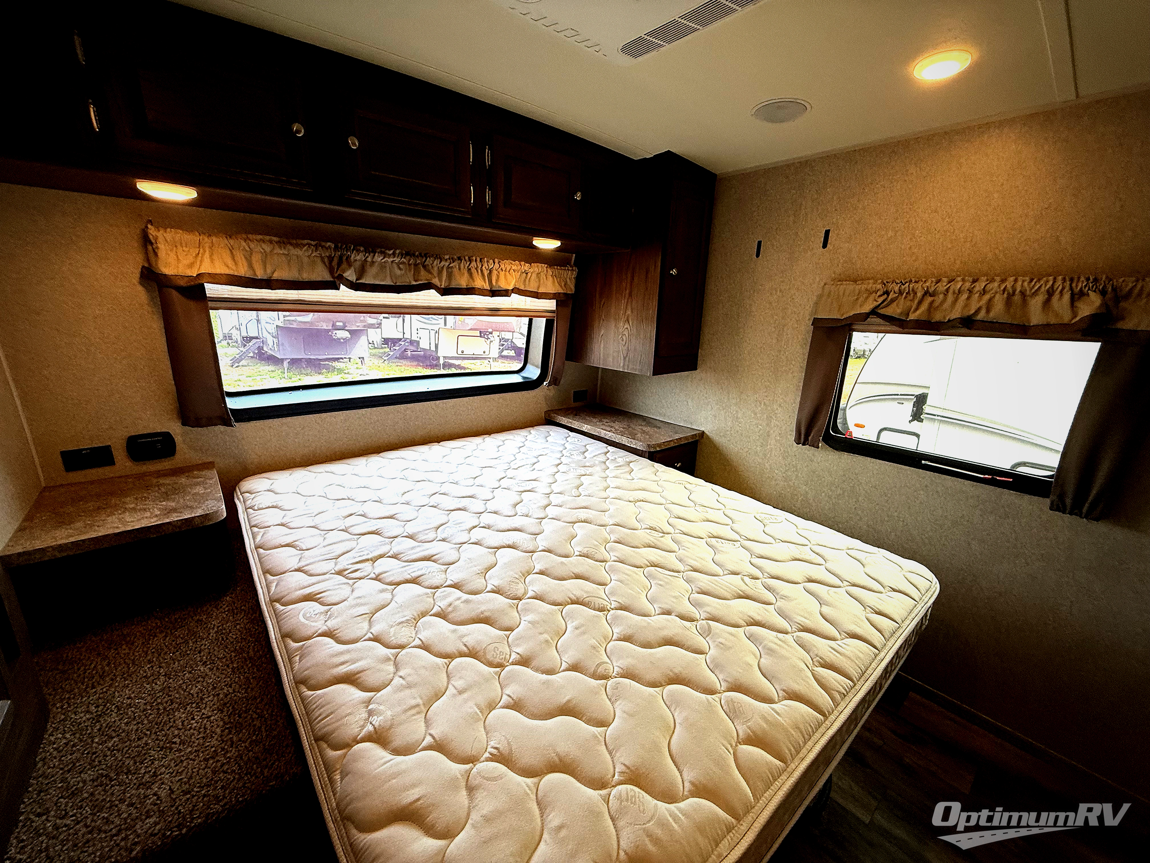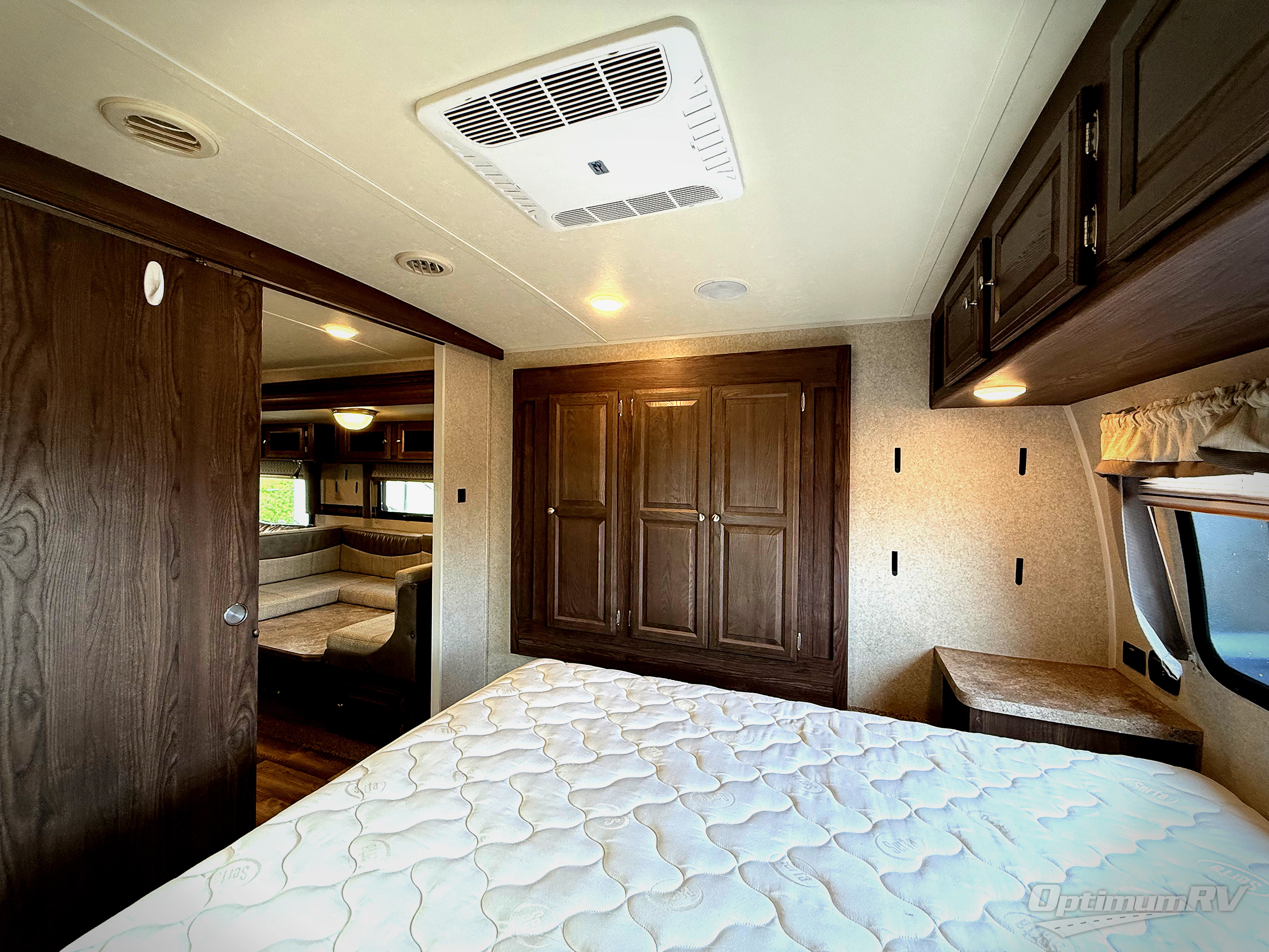 The very front of this Flagstaff Super Lite model features a private bedroom with a space saving sliding door. Here you will find a Serta queen size bed with nightstands on either side. One side of the bed even has a wardrobe for your clothes. A second larger wardrobe slides out along the road side to provide more clothing storage, and increase the walking around space inside.