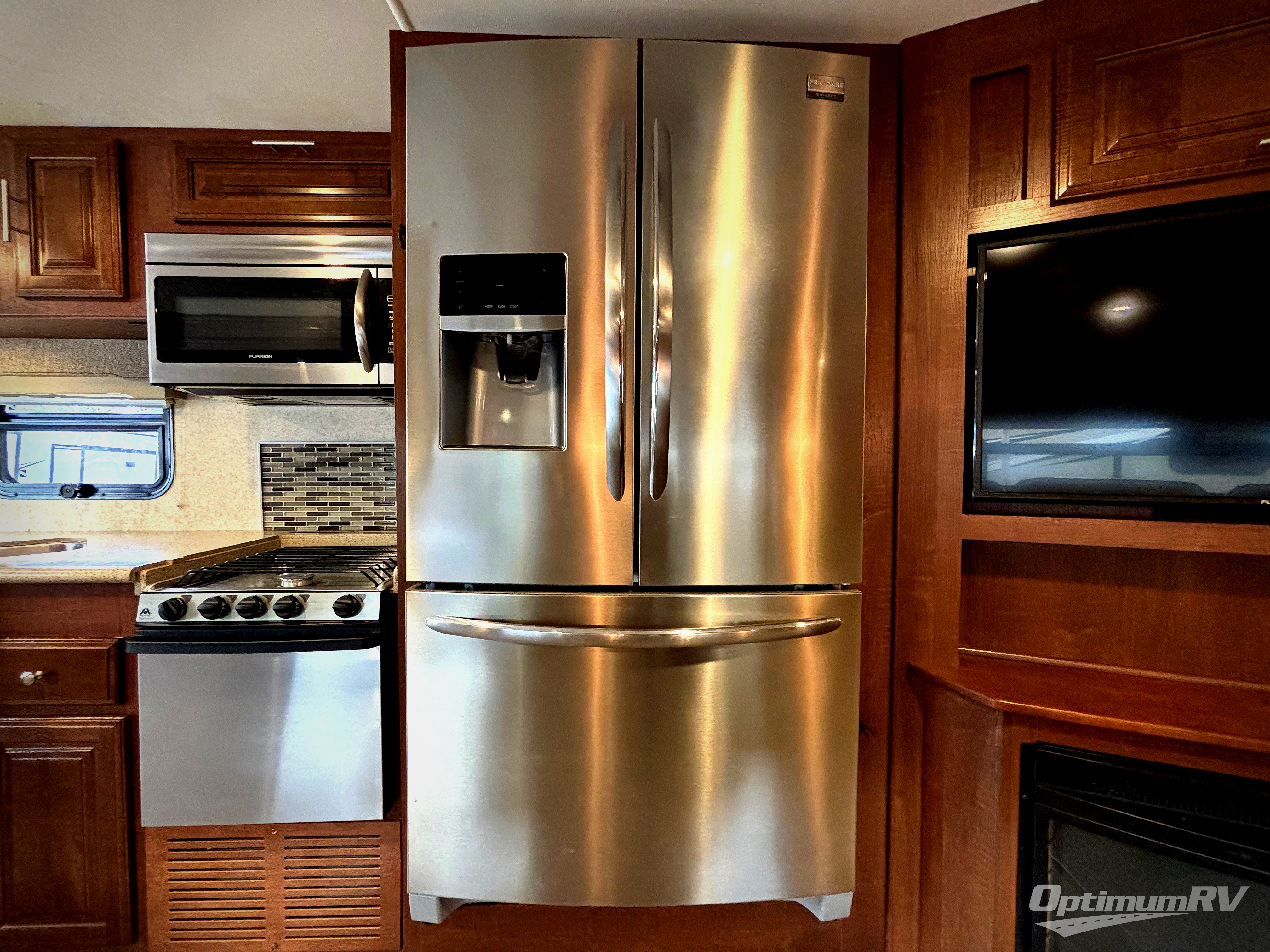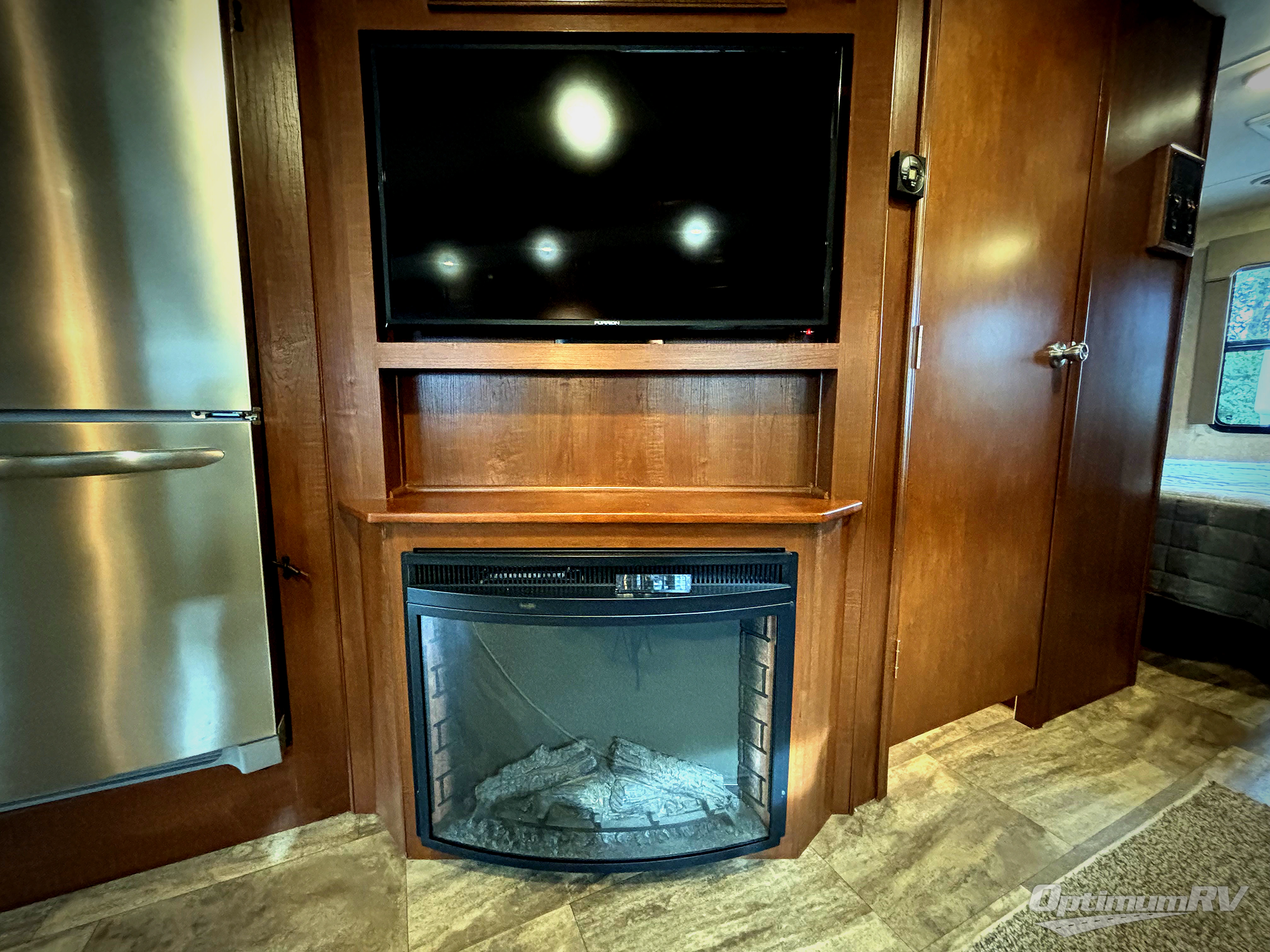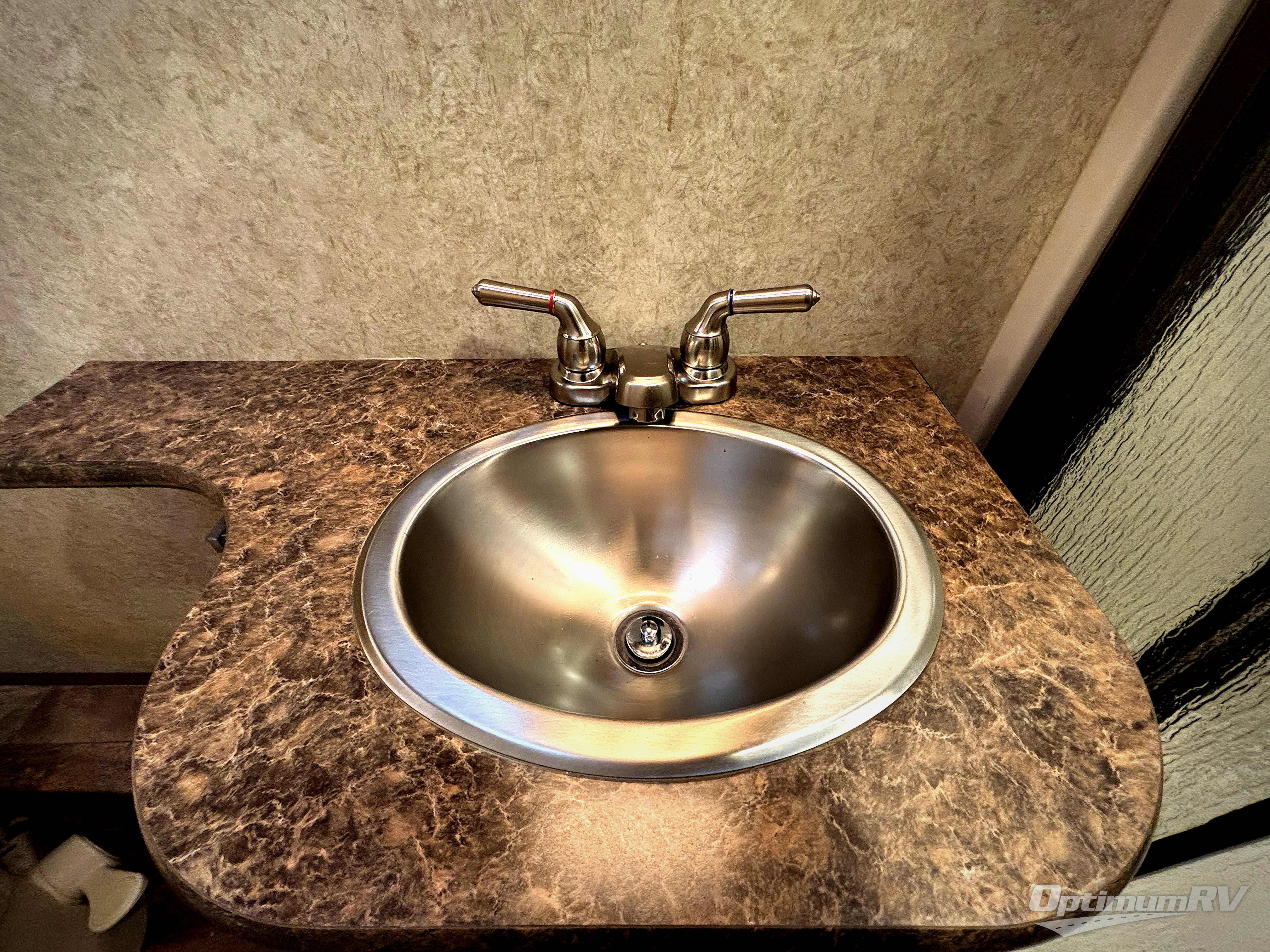 As you enter 335DS by Forest River you will see to your left, a double kitchen sink, three burner range with microwave above, a refrigerator or you can choose an optional stainless residential refrigerator, and pantry. On the opposite there is a slide out second pantry, dinette, L-shaped hide-a-bed sofa, and end table. The TV and fireplace are on the outer wall of the bath for easy viewing.