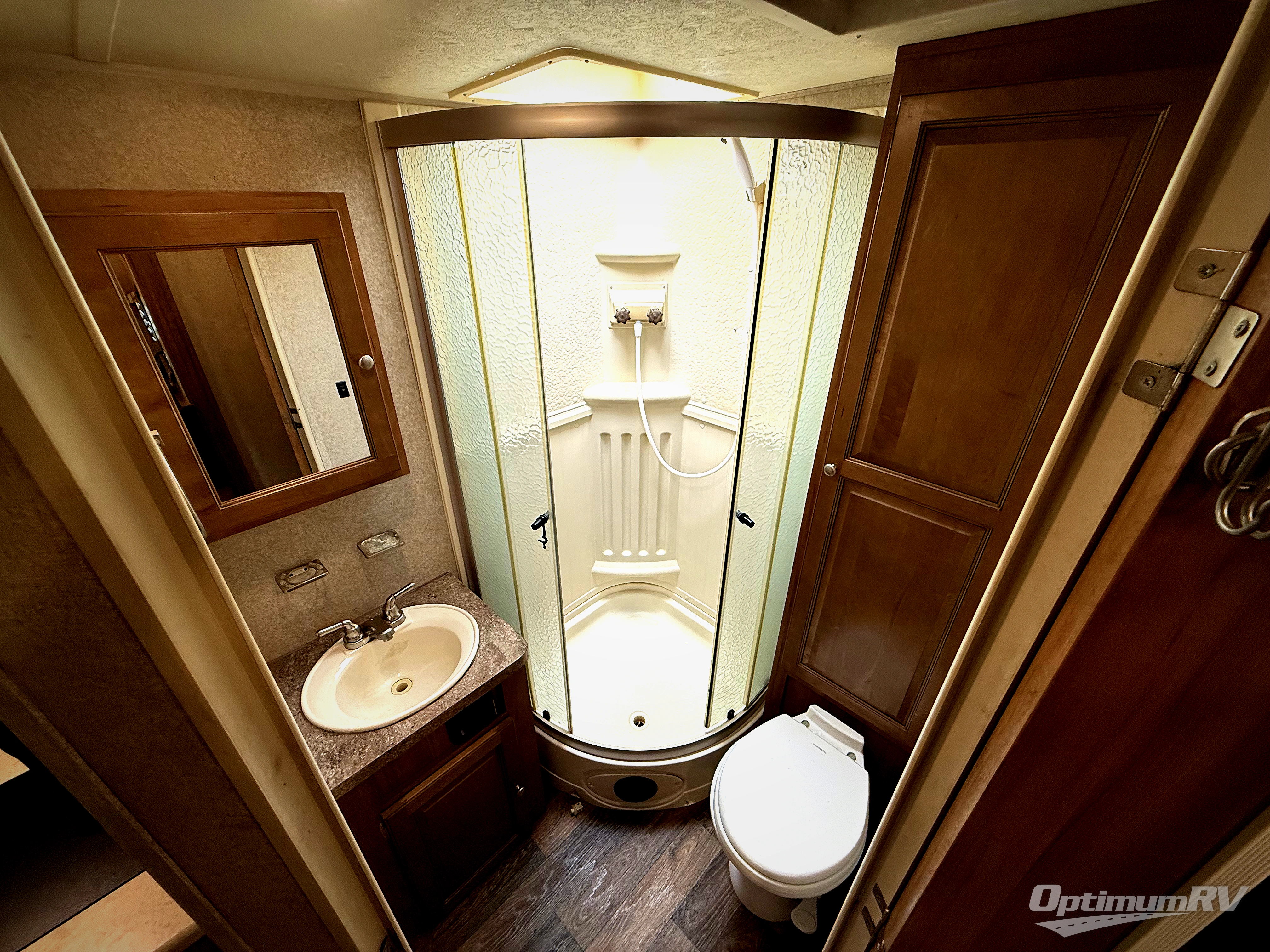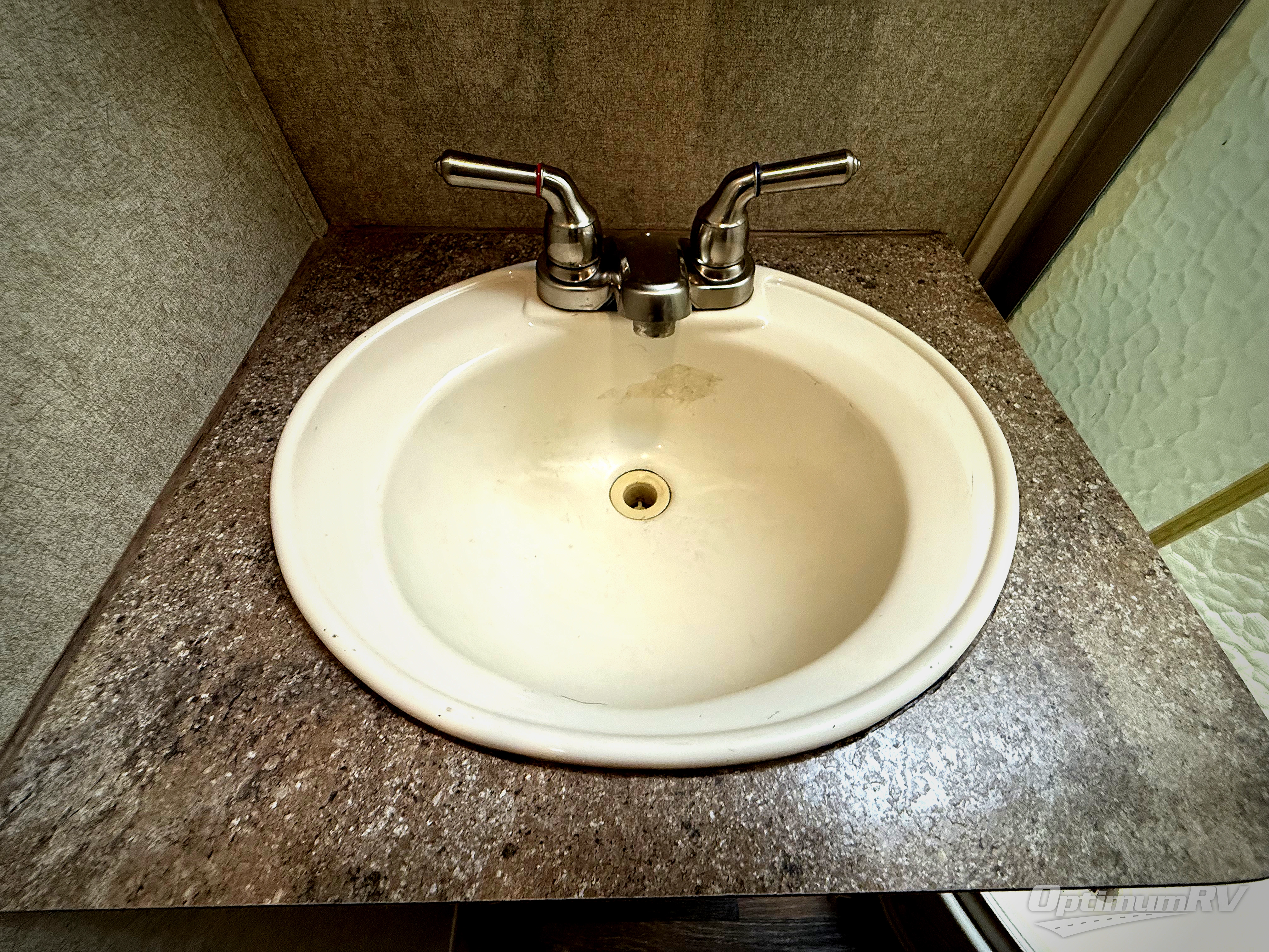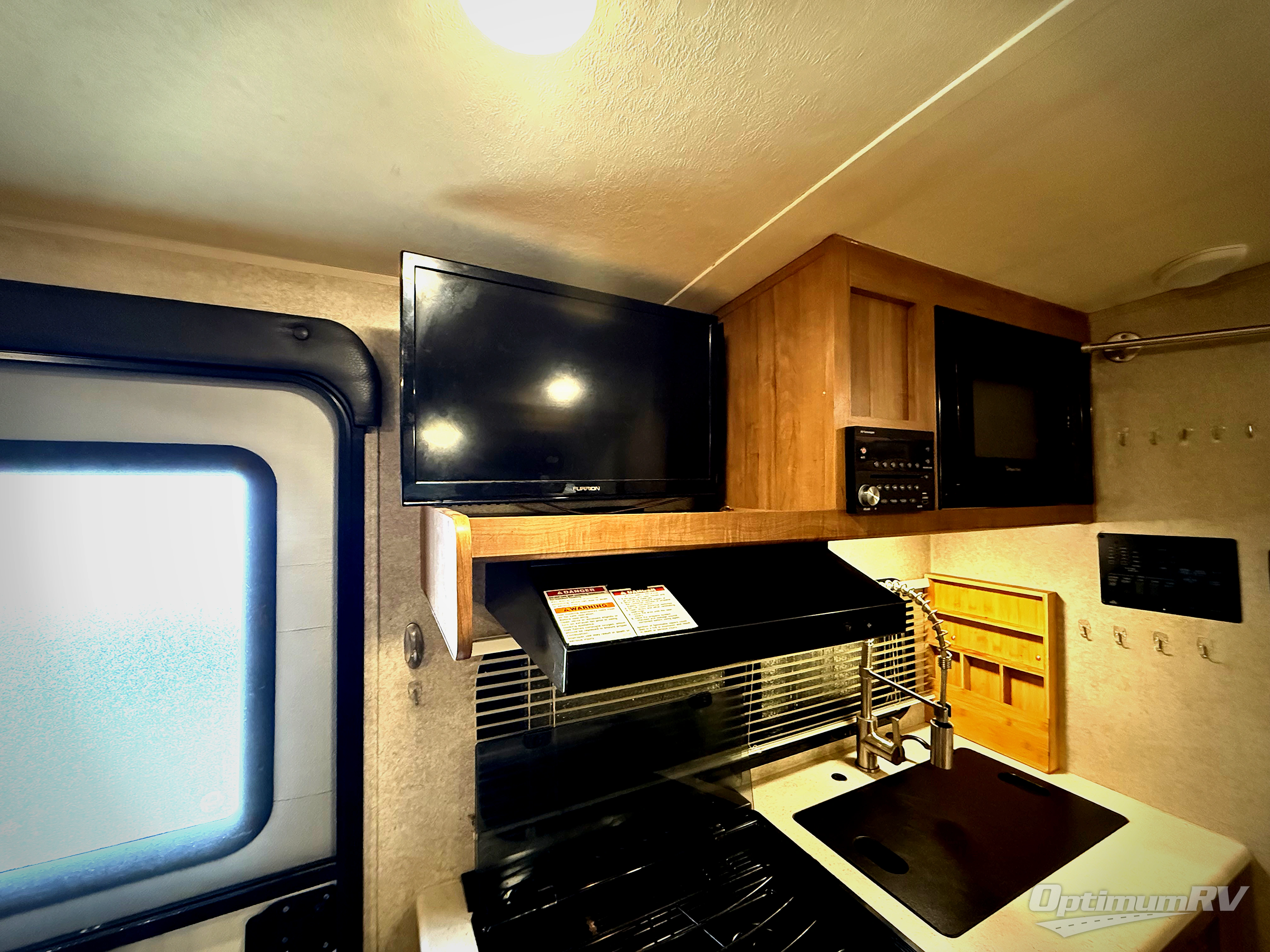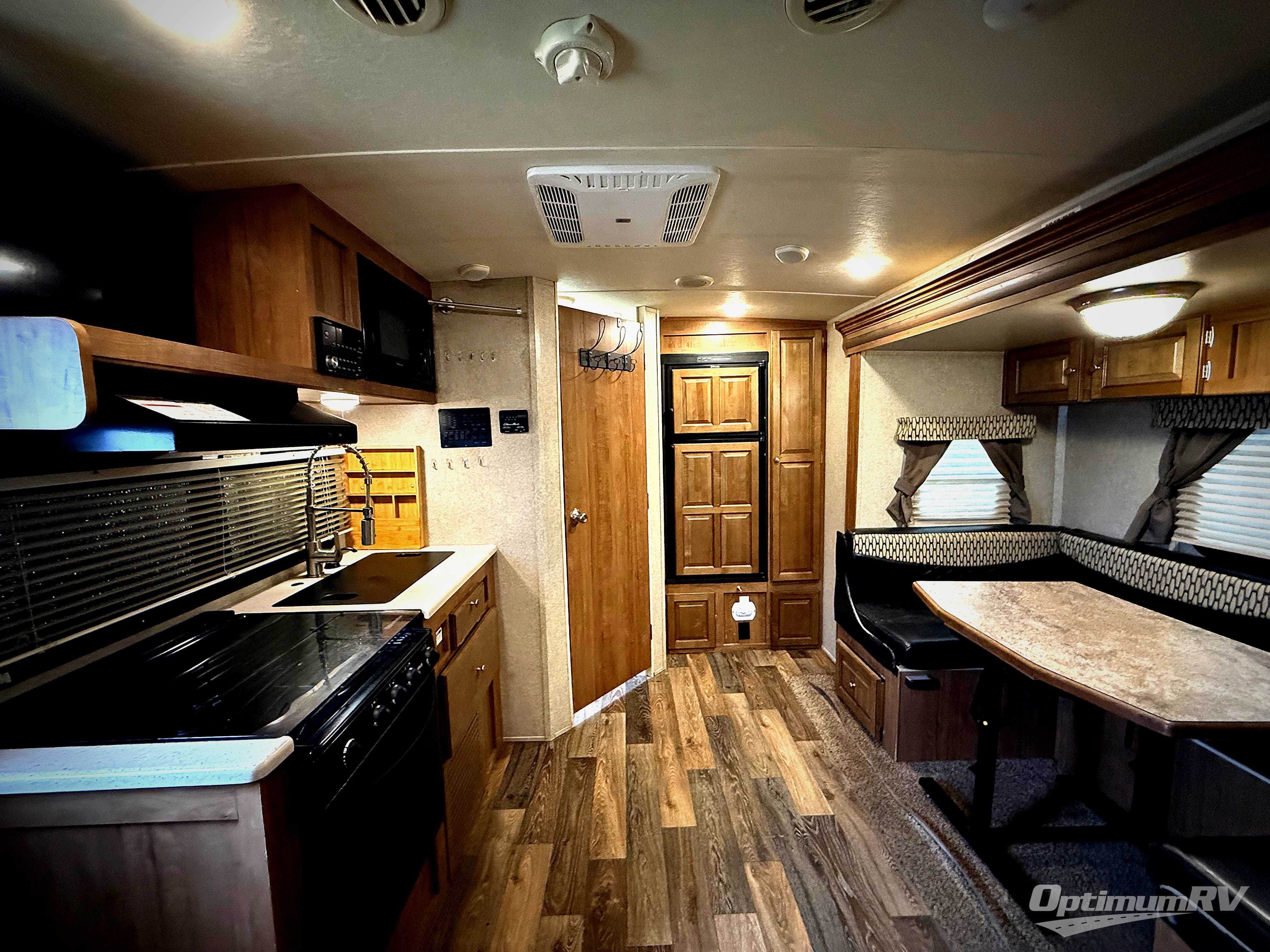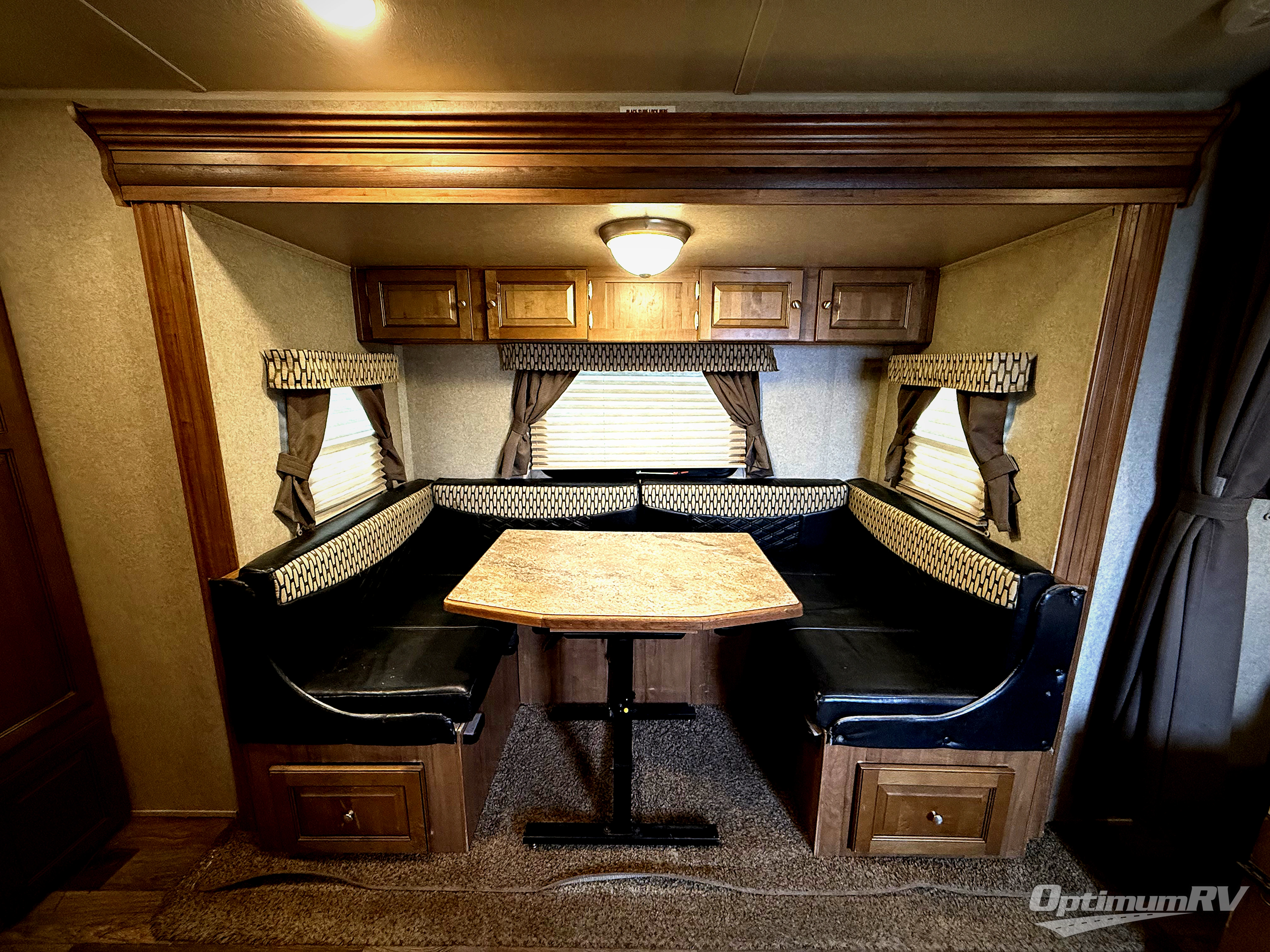 As you enter 2104S to your left there is a three burner range with entertainment center above, and a double kitchen sink with overhead microwave. There is also a refrigerator and pantry along the rear wall for your food storage needs. The u-shaped dinette and overhead storage is located on the slide out, which gives more open floor space in the travel trailer. You can choose a free standing table with chairs option if you like.