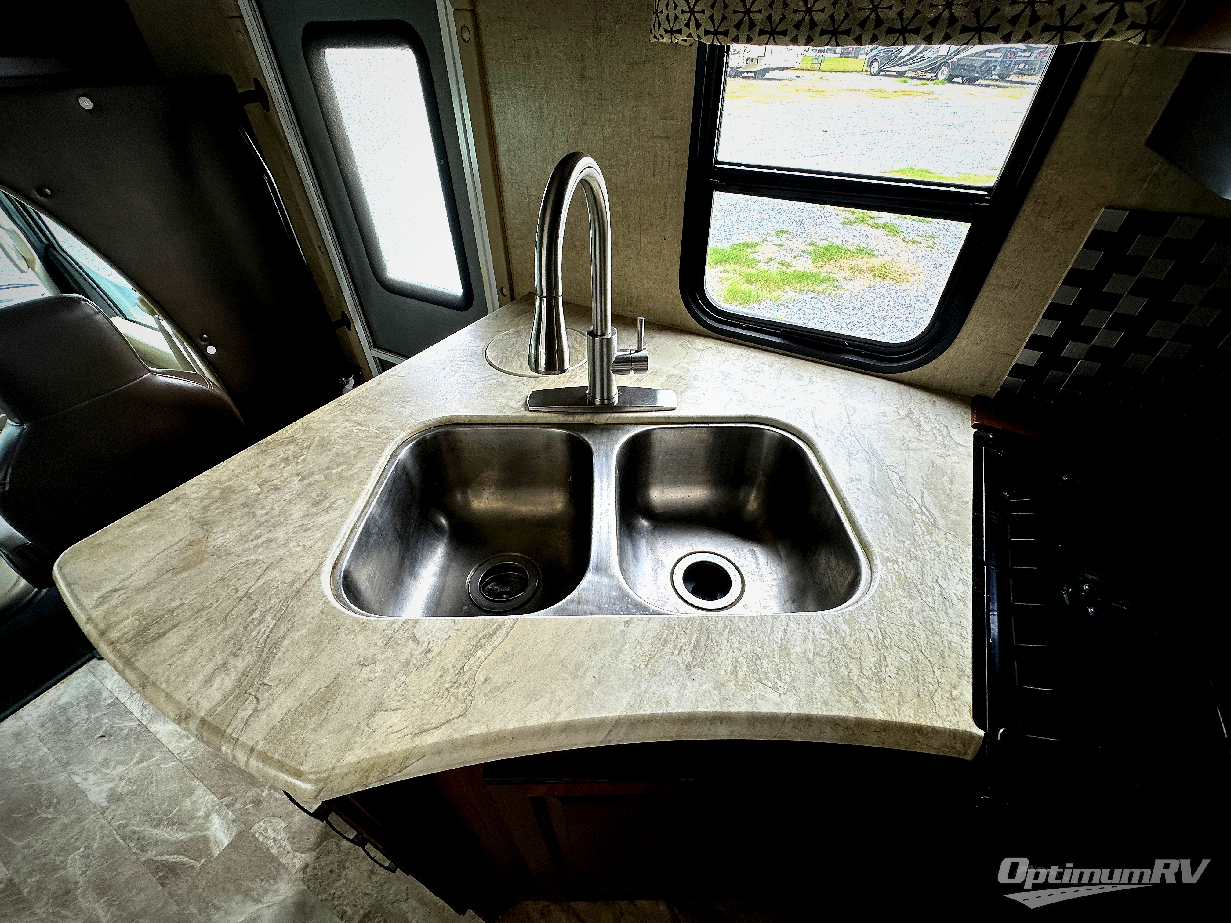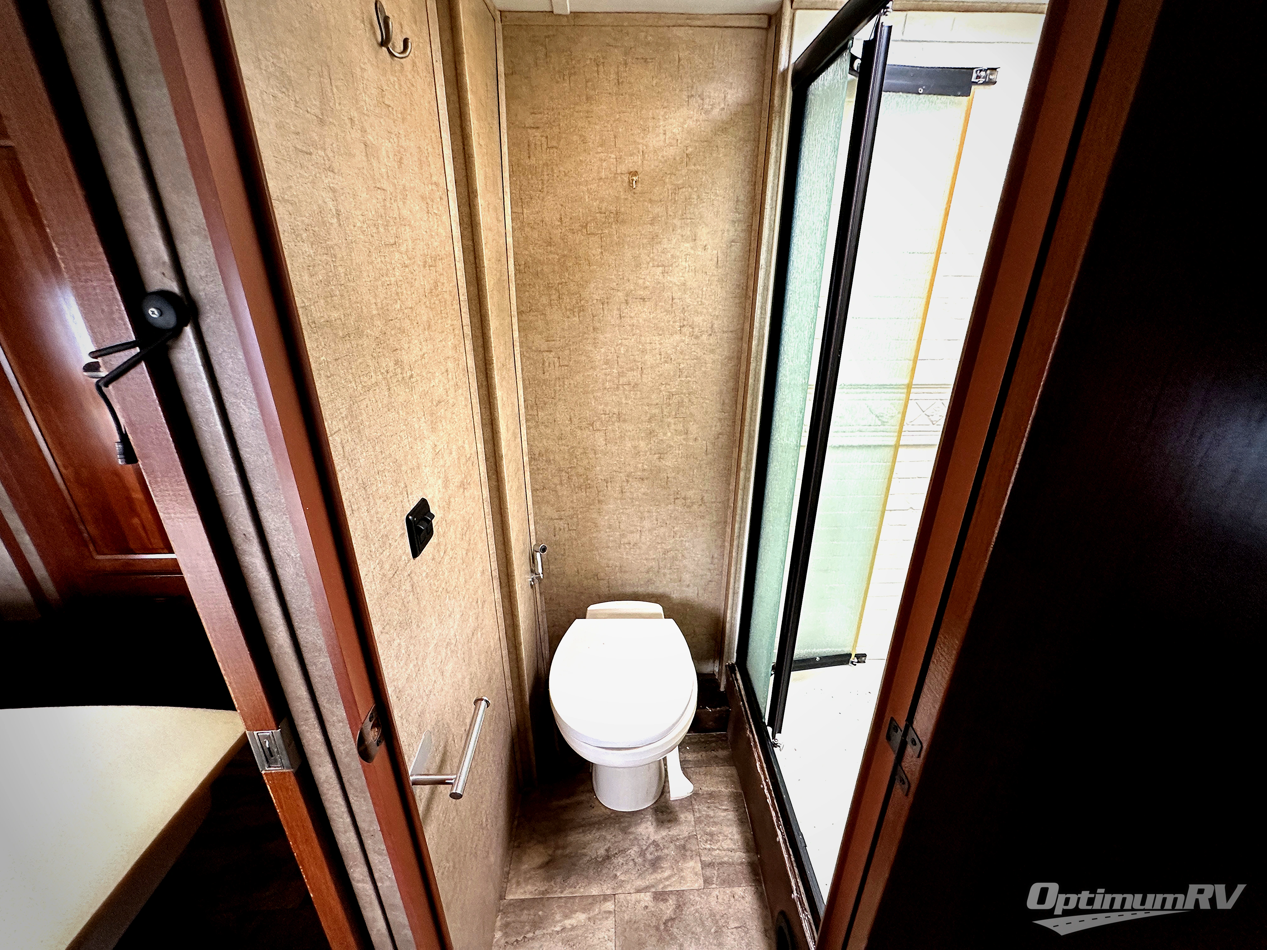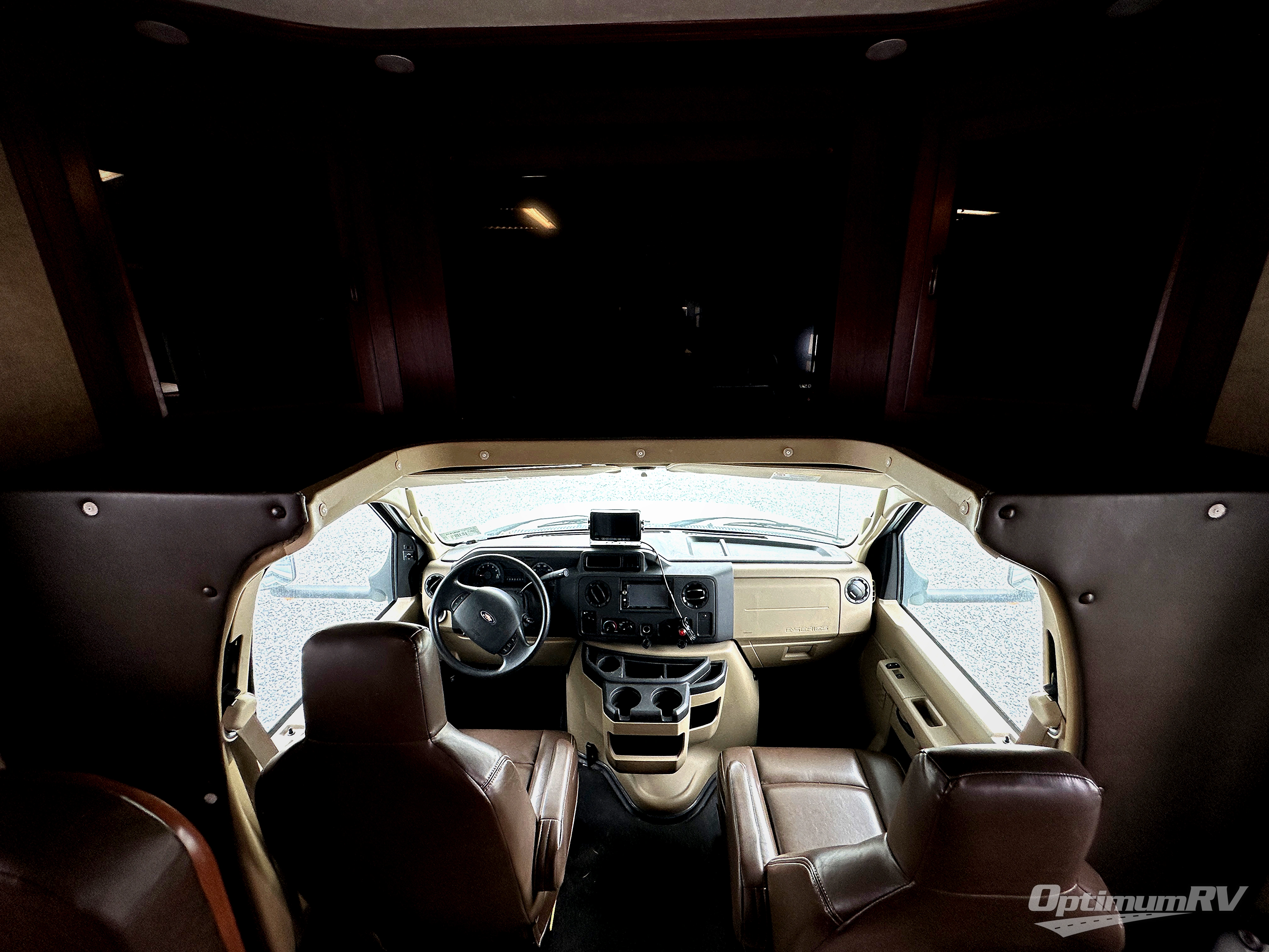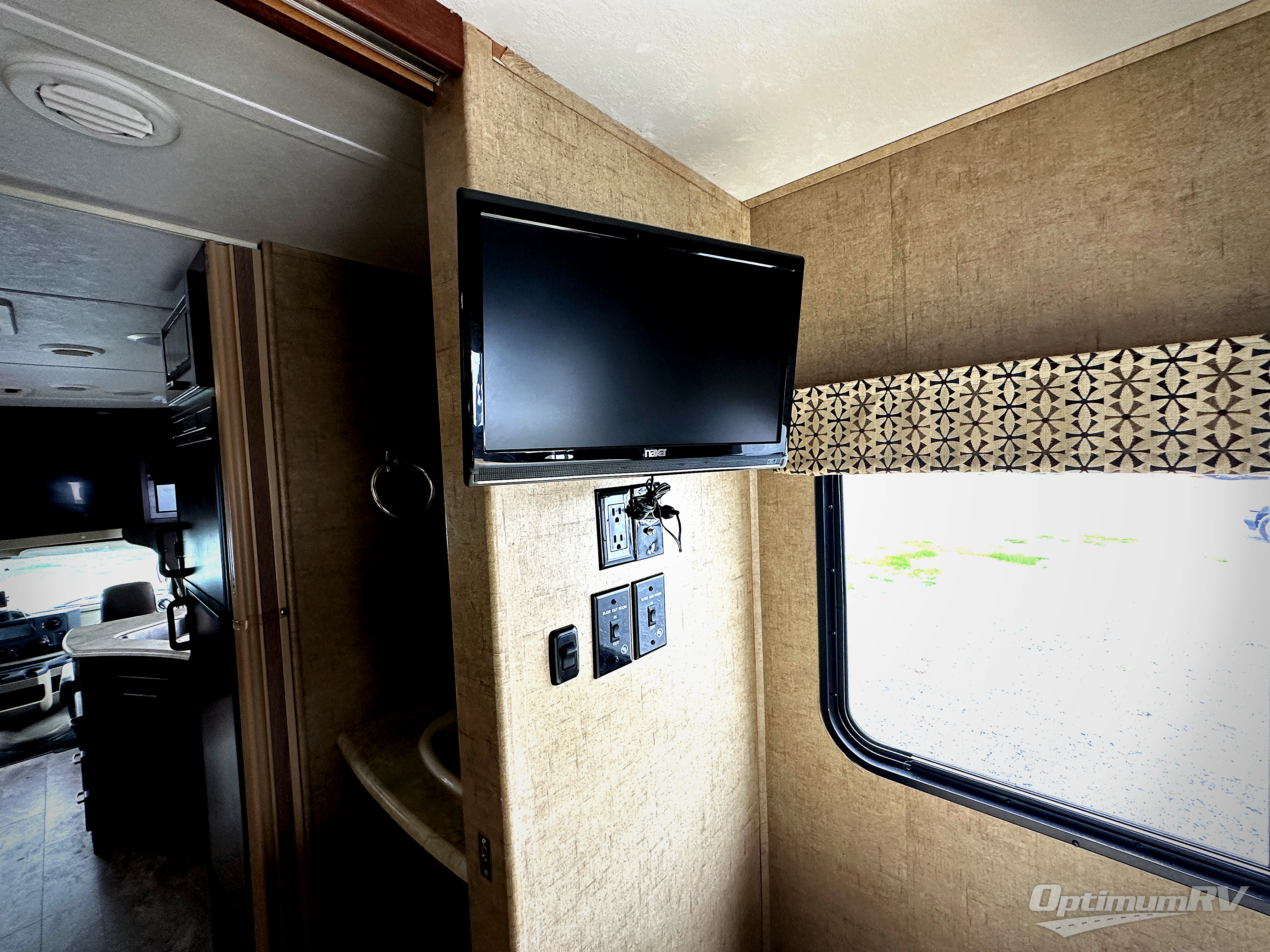 As you enter this class C motorhome, there is a 60" x 80" over the cab bunk, or you can choose optional cabinets with 42" TV or optional 32" TV with twin beds. Continuing along the driver's side, a u-shaped dinette is within a slide out. Or in place of the dinette you can choose an optional booth dinette, or a sofa with table. Next to the slide there is a pantry as well as a private toilet area with a shower. A vanity sink is located across the motorhome.