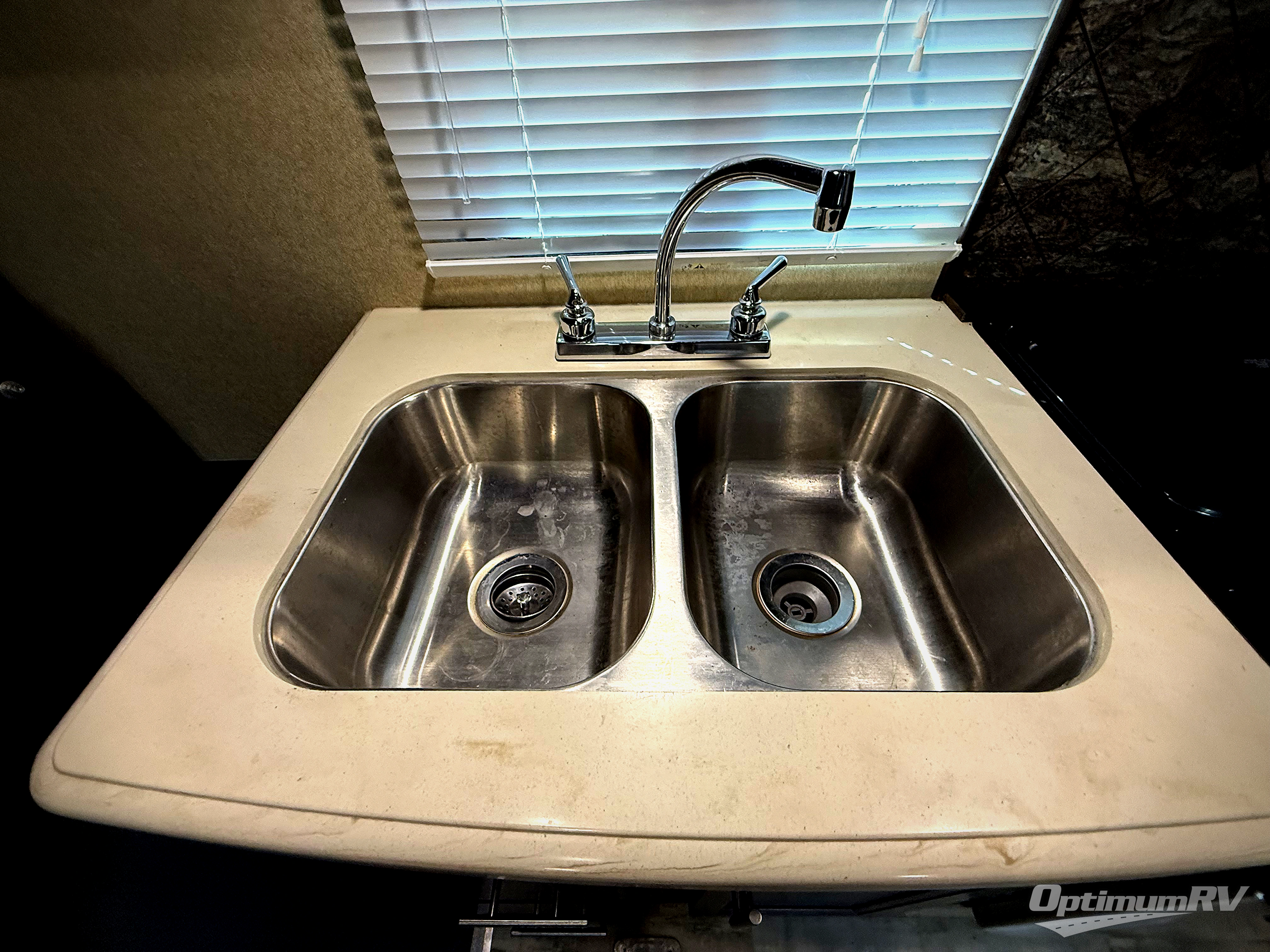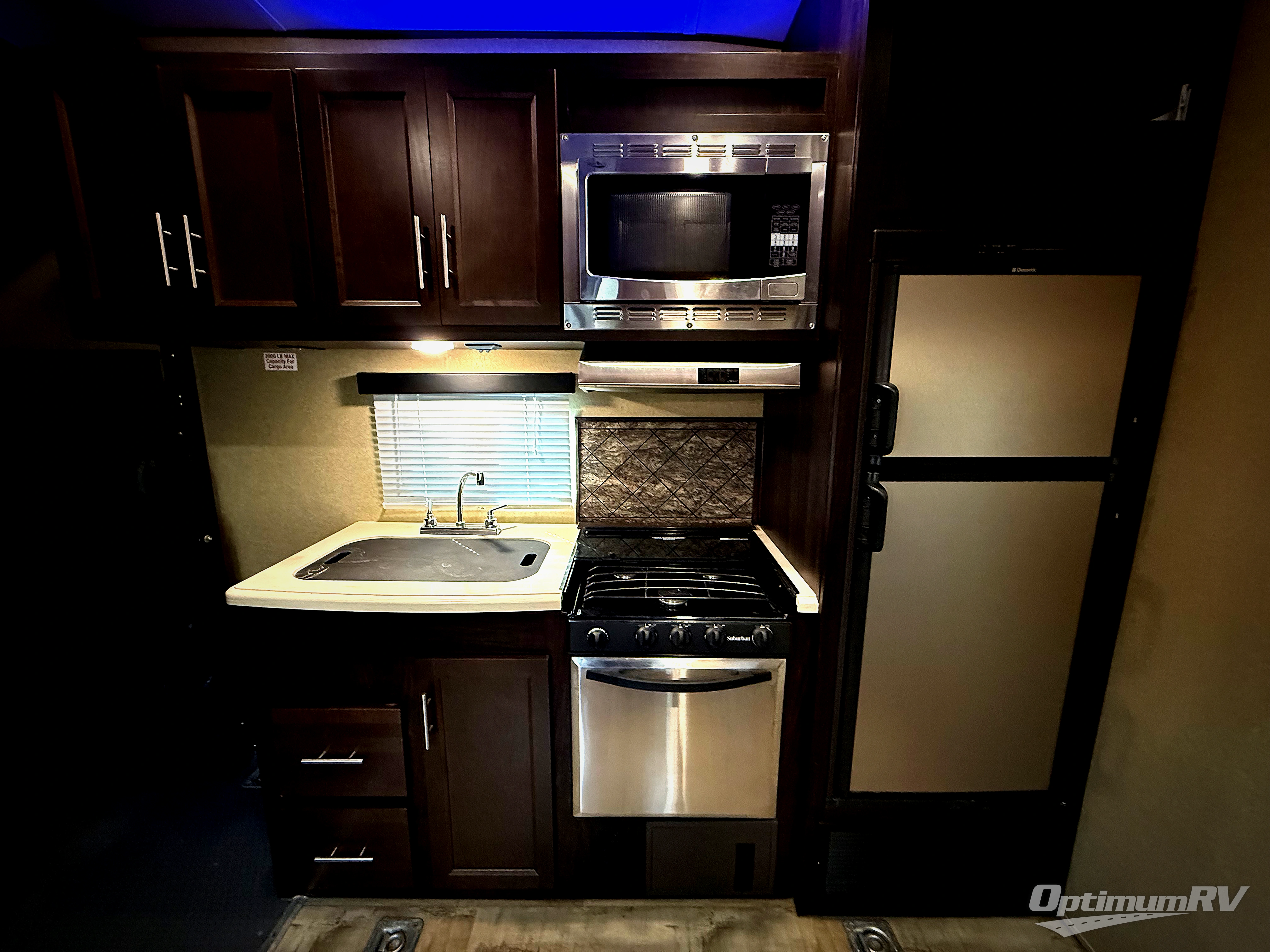 Along the curb side wall there is an entertainment center and pantry for dry and canned goods storage. The kitchen area is opposite and features a refrigerator, a three burner range, microwave, and a double sink which makes cleaning up a breeze.