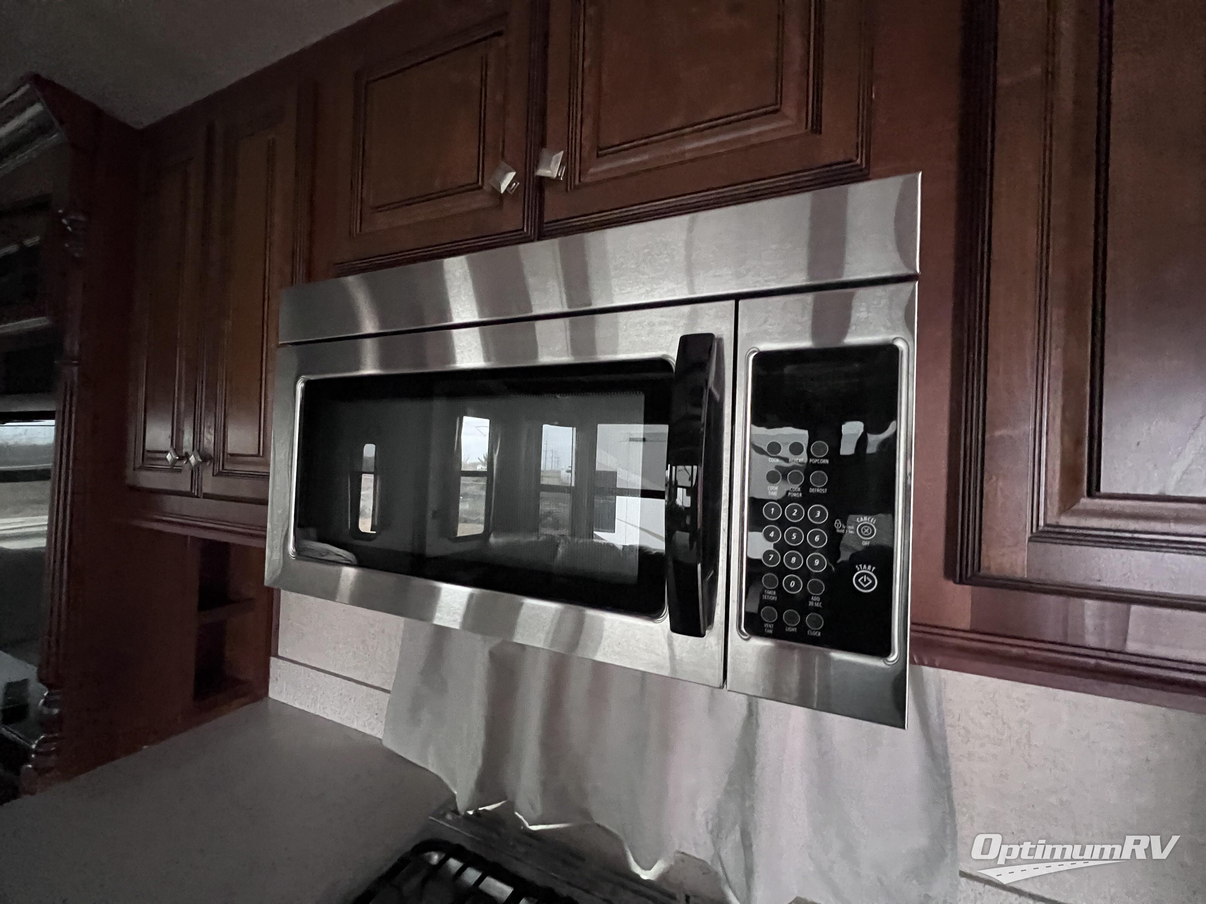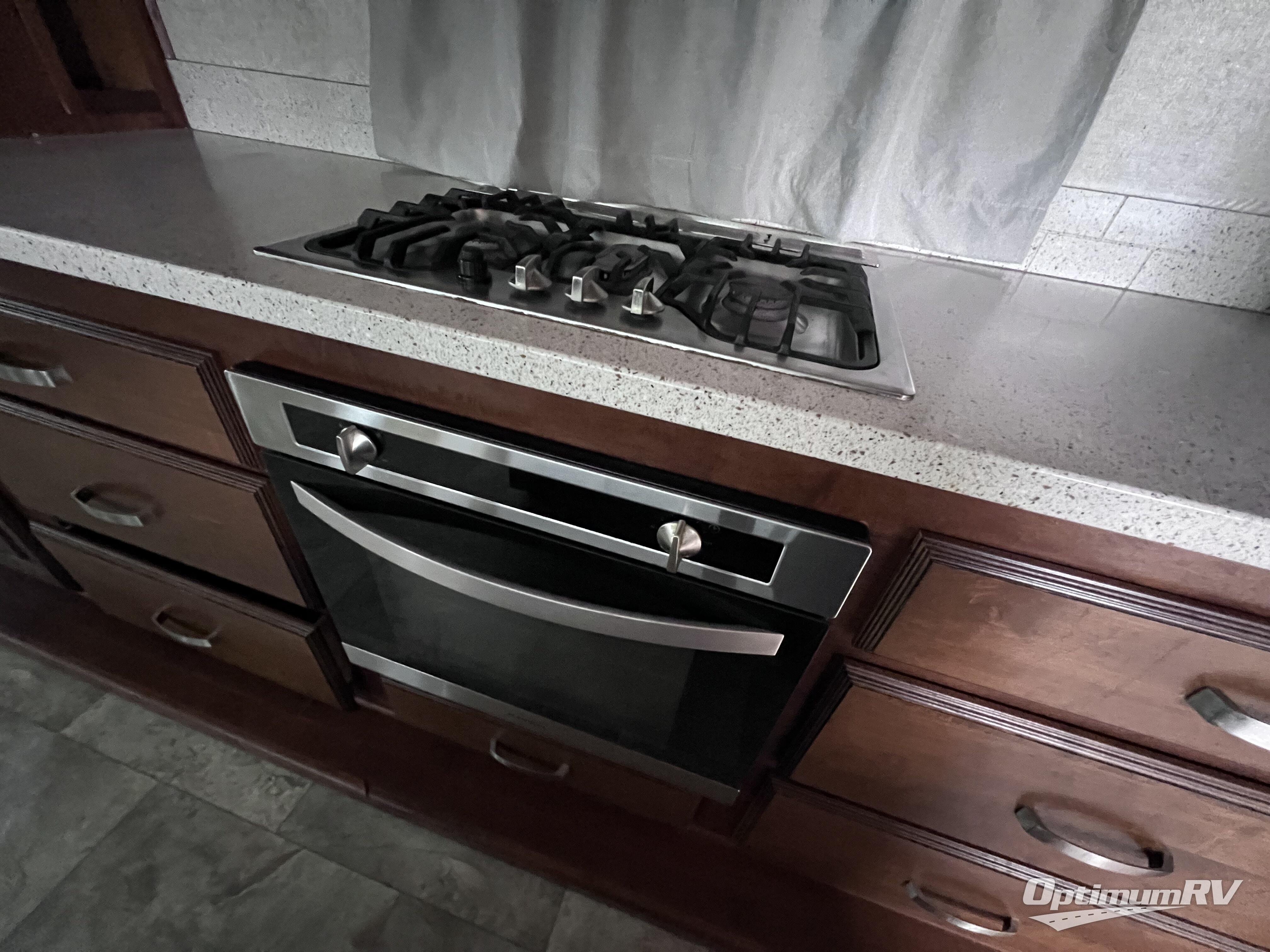 The slide opposite the door begins near the sofa with an entertainment center which includes a pull-out desk area for a laptop, and a large LED TV. This slide also contains counter space, a three burner range, and refrigerator, plus plenty of overhead storage.