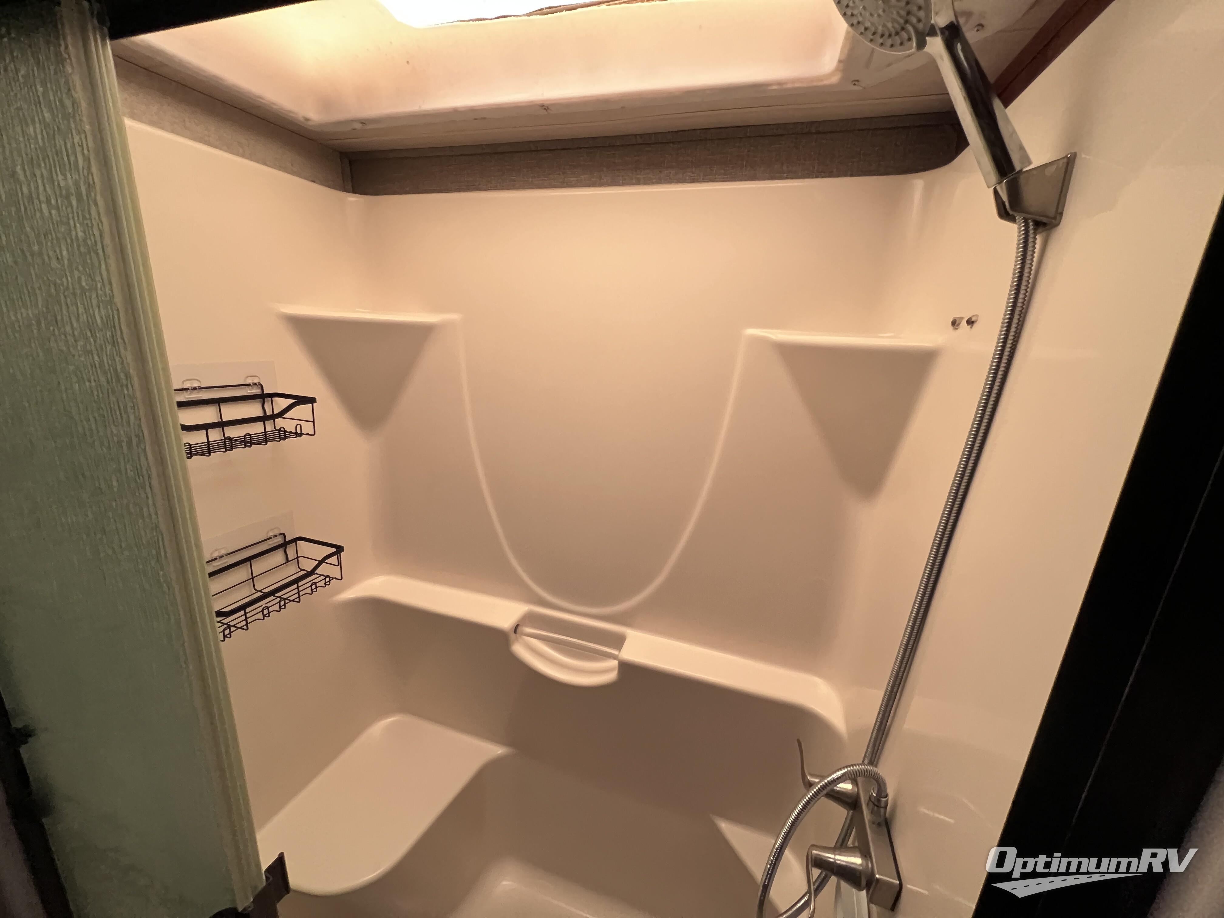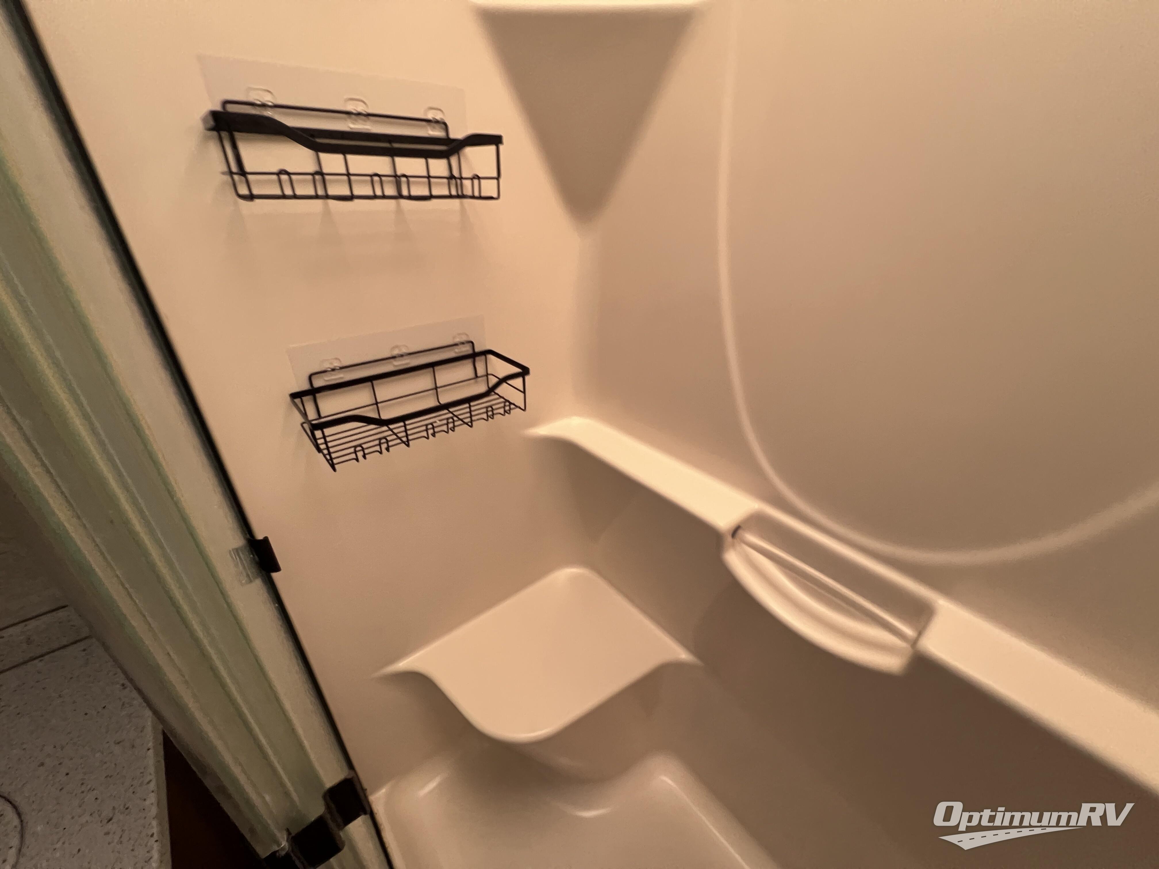 Step inside and see how spacious the main living area is with dual opposing slides. There is a dining table for two, and two swivel glider recliners in the slide to the immediate left as you enter. Along the rear wall find a sofa with end tables that provides ample seating during the day and easily converts to additional sleeping for a couple of extra guests. You will also enjoy the overhead storage cabinets with decorative glass doors above the sofa.