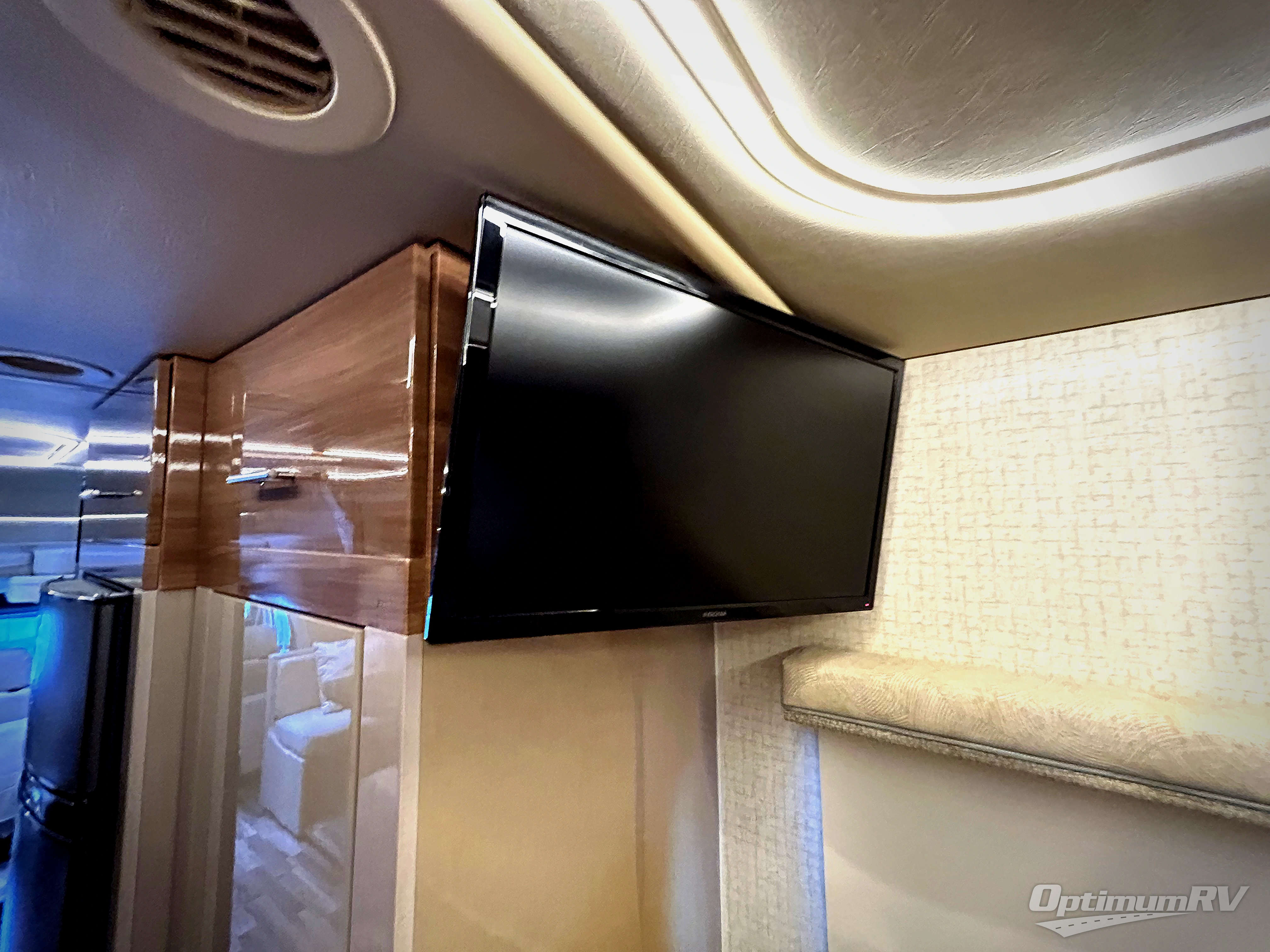 The rear bedroom in model 24G features a slide out rear queen sized bed with overhead storage cabinets for your things. There is also a spot to mount an optional flat screen 24" HDTV in the bedroom just off the foot of the bed along the wall.