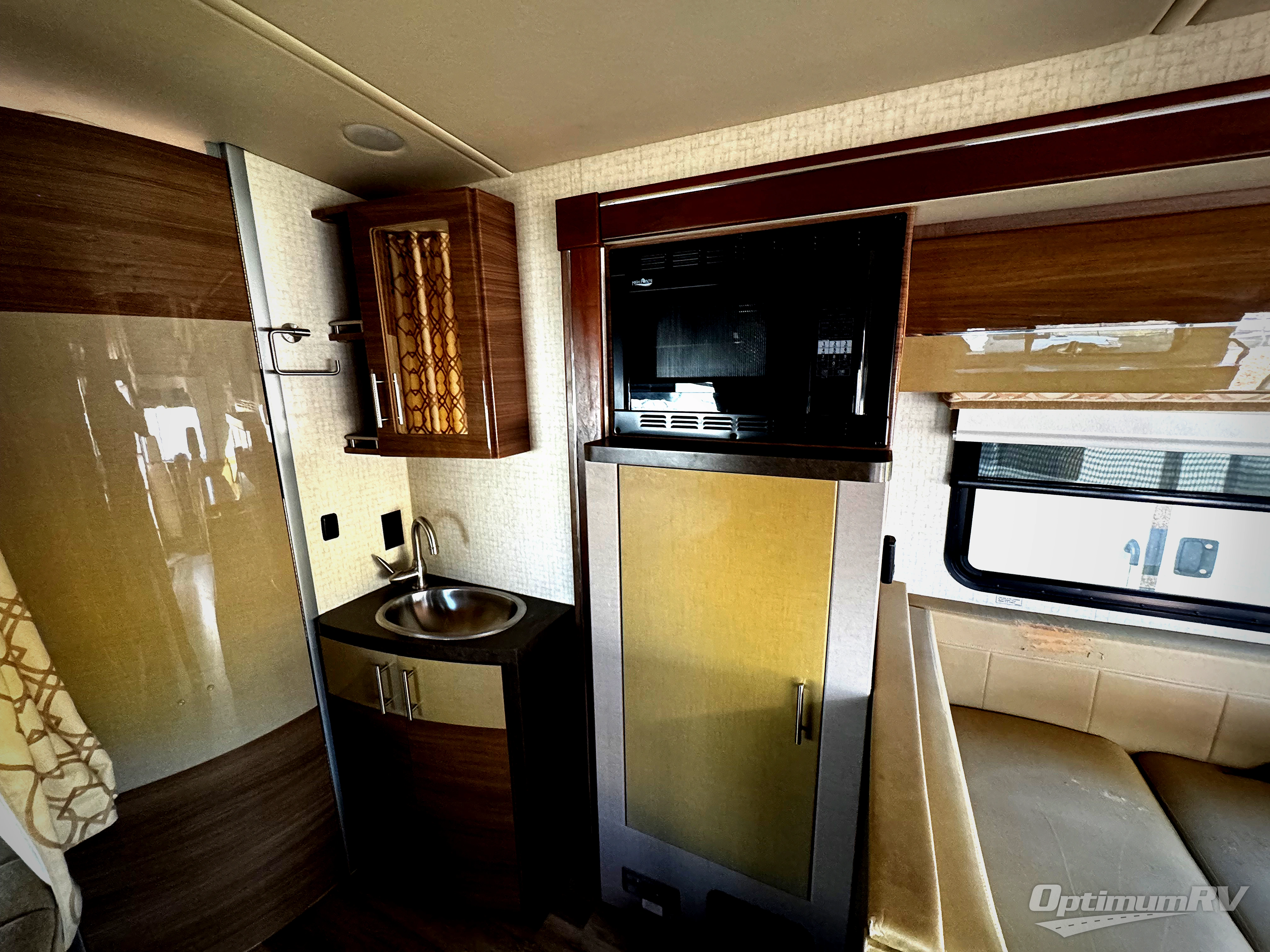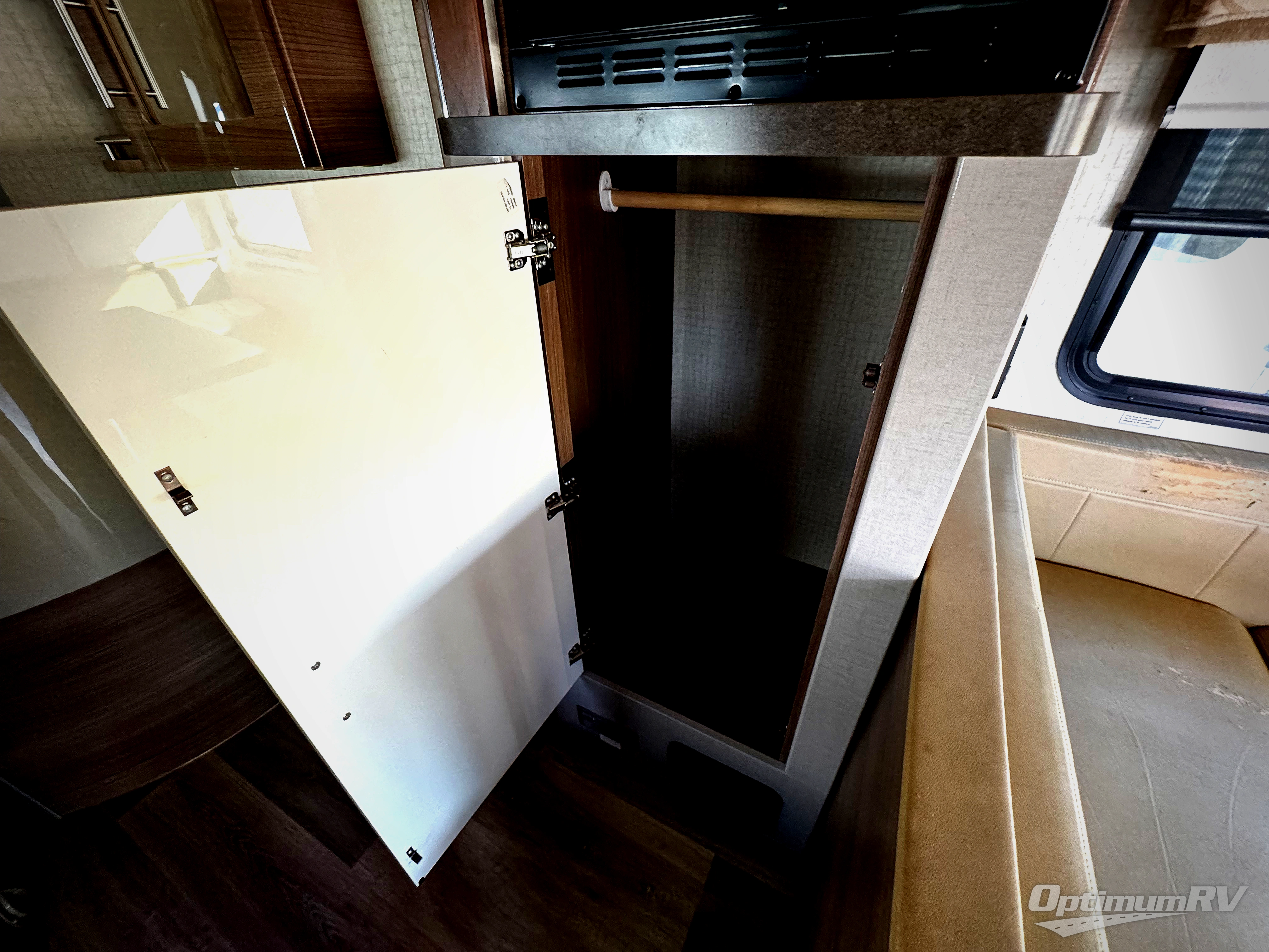 To the left of the entrance find all the kitchen amenities needed to create meals and snacks while you are on the road. There is a double sink, a two burner range top, overhead cabinets, and a refrigerator to keep your food items cold and fresh. The 28" HD TV is also located above the kitchen area which can easily be viewed from the dinette or front captains chairs.