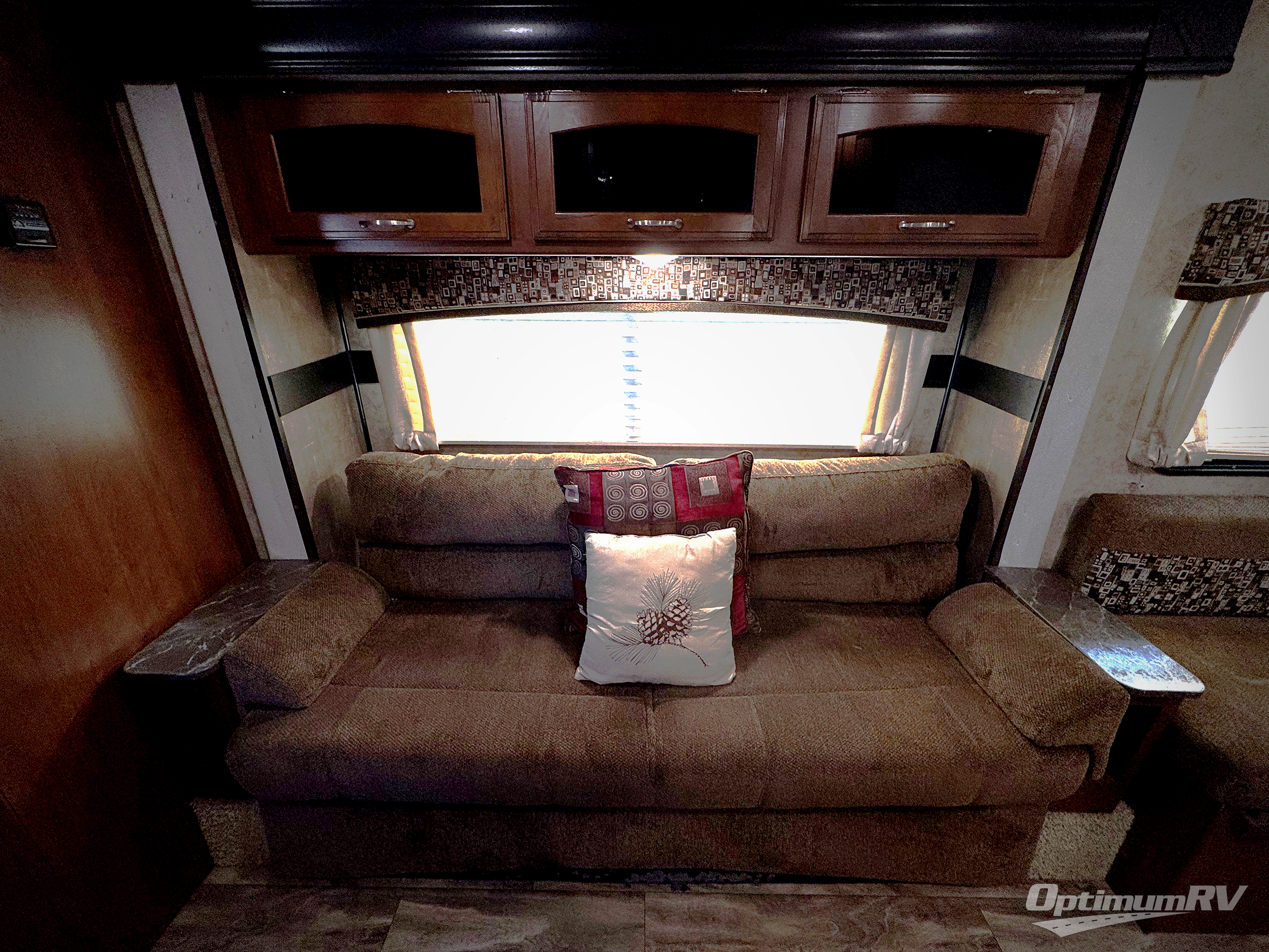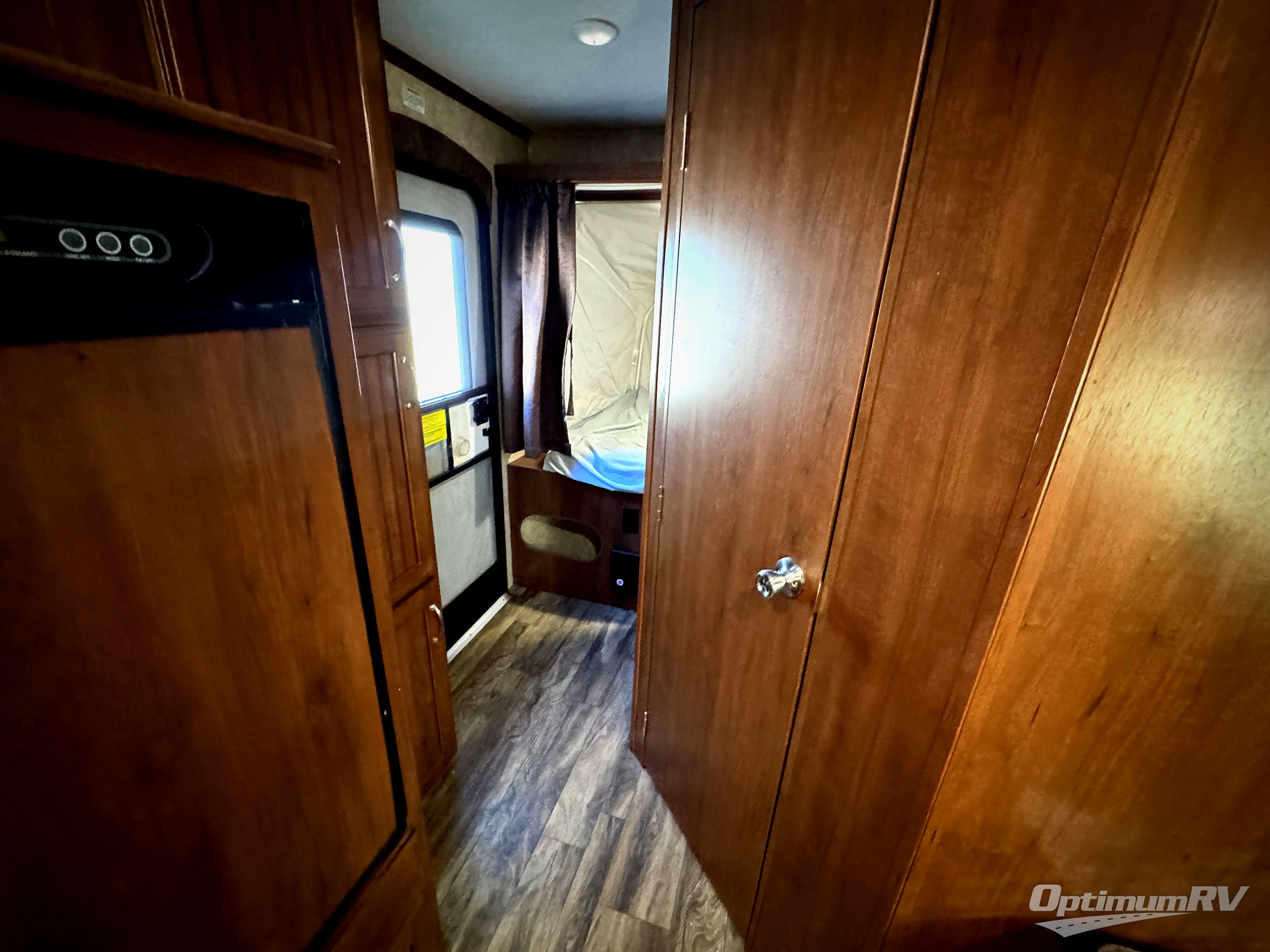 Along the opposite side of the expandable you will find a dinette with overhead storage, refrigerator, and a TV shelf.