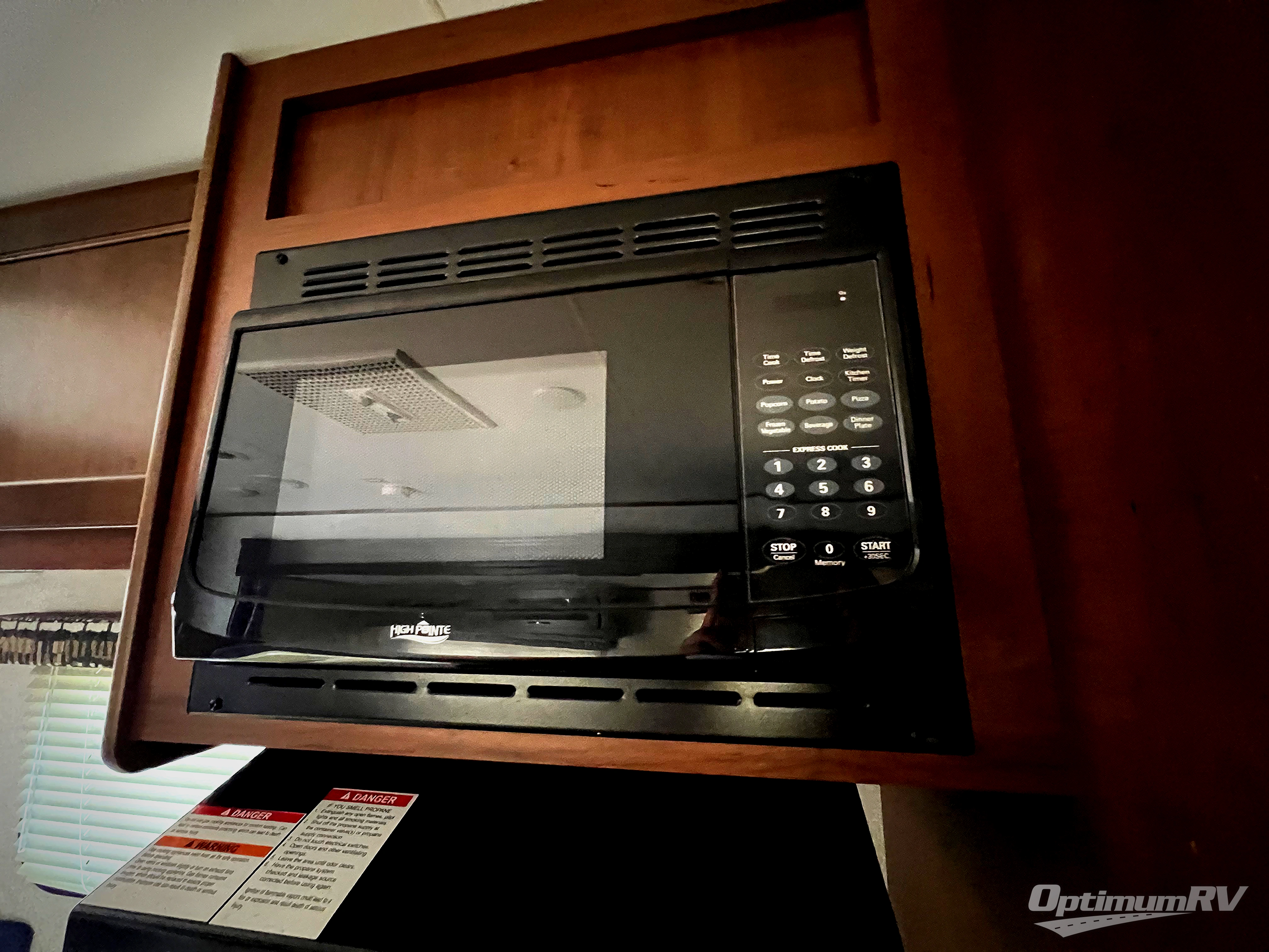 Stepping inside the travel trailer, to the left you will find a double kitchen sink, three burner range, microwave, refrigerator and large pantry. You will also notice how open and spacious the kitchen and living area are since there is a slide. The opposite side of the trailer features a slide with a dinette, sofa, and overhead cabinet above the sofa. Along the front of the living area you will see a large entertainment center.