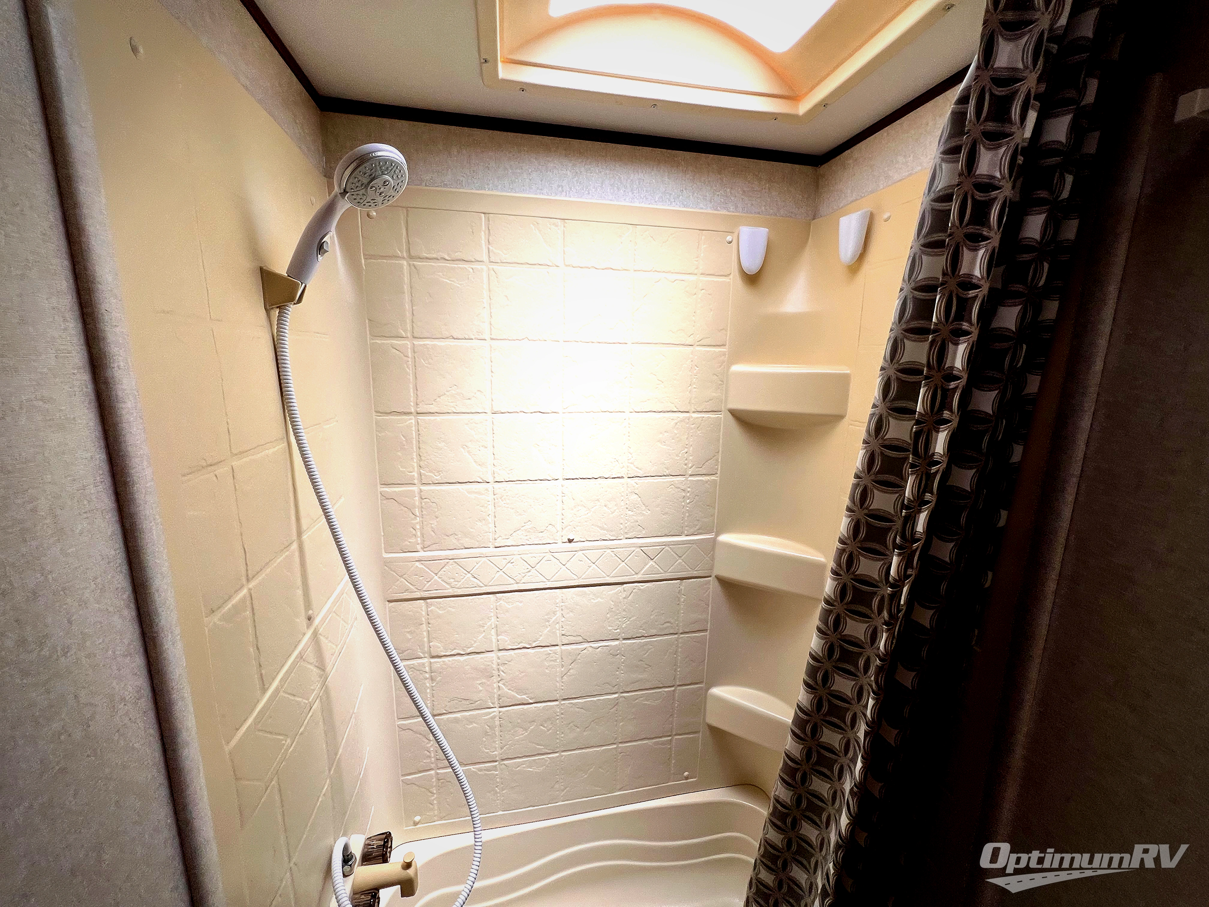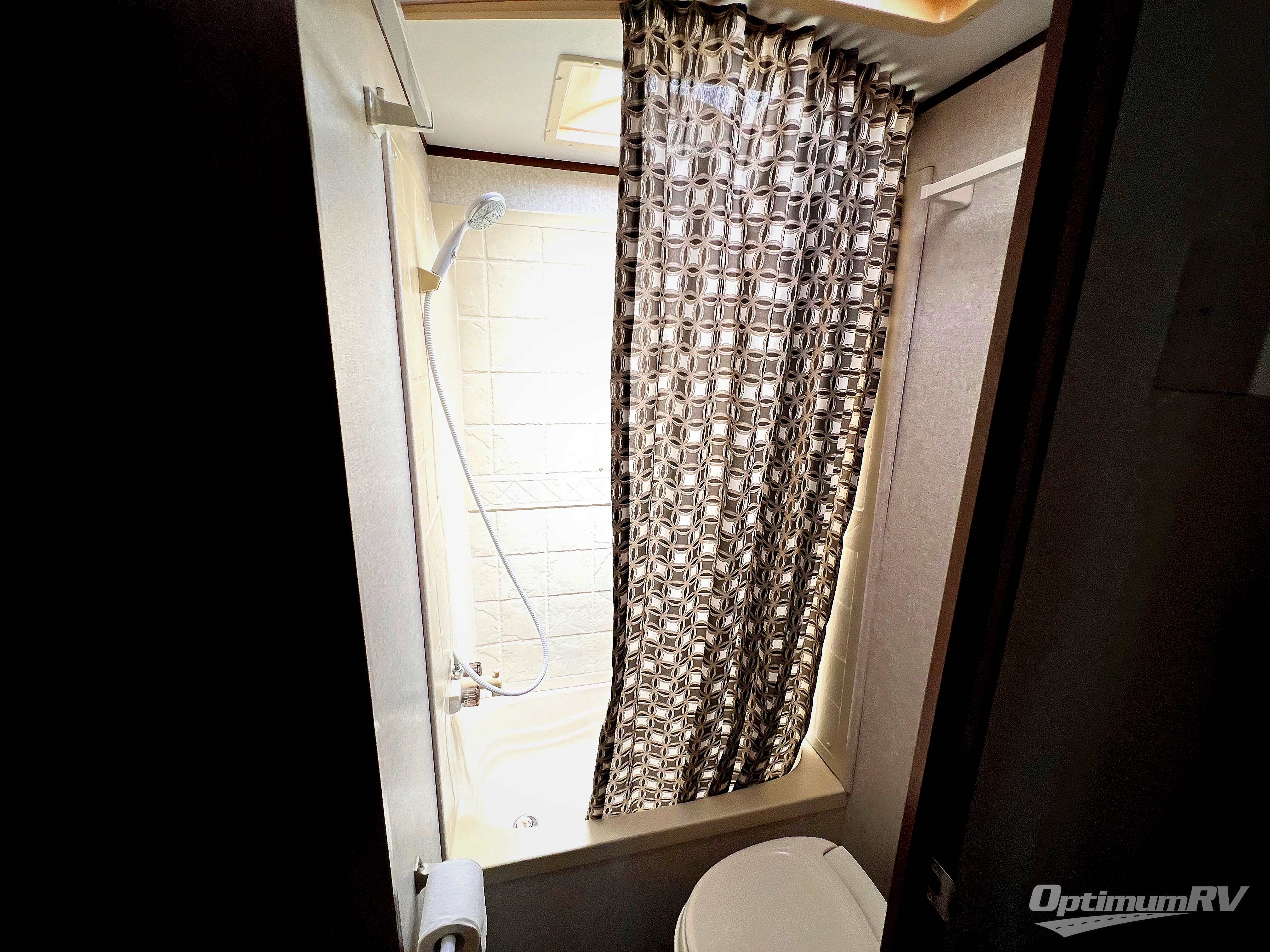 As you proceed toward the rear of the trailer you will come to the rear bathroom in the right corner. Inside the bathroom there is a toilet, tub/shower. Just outside of the bathroom is the sink.