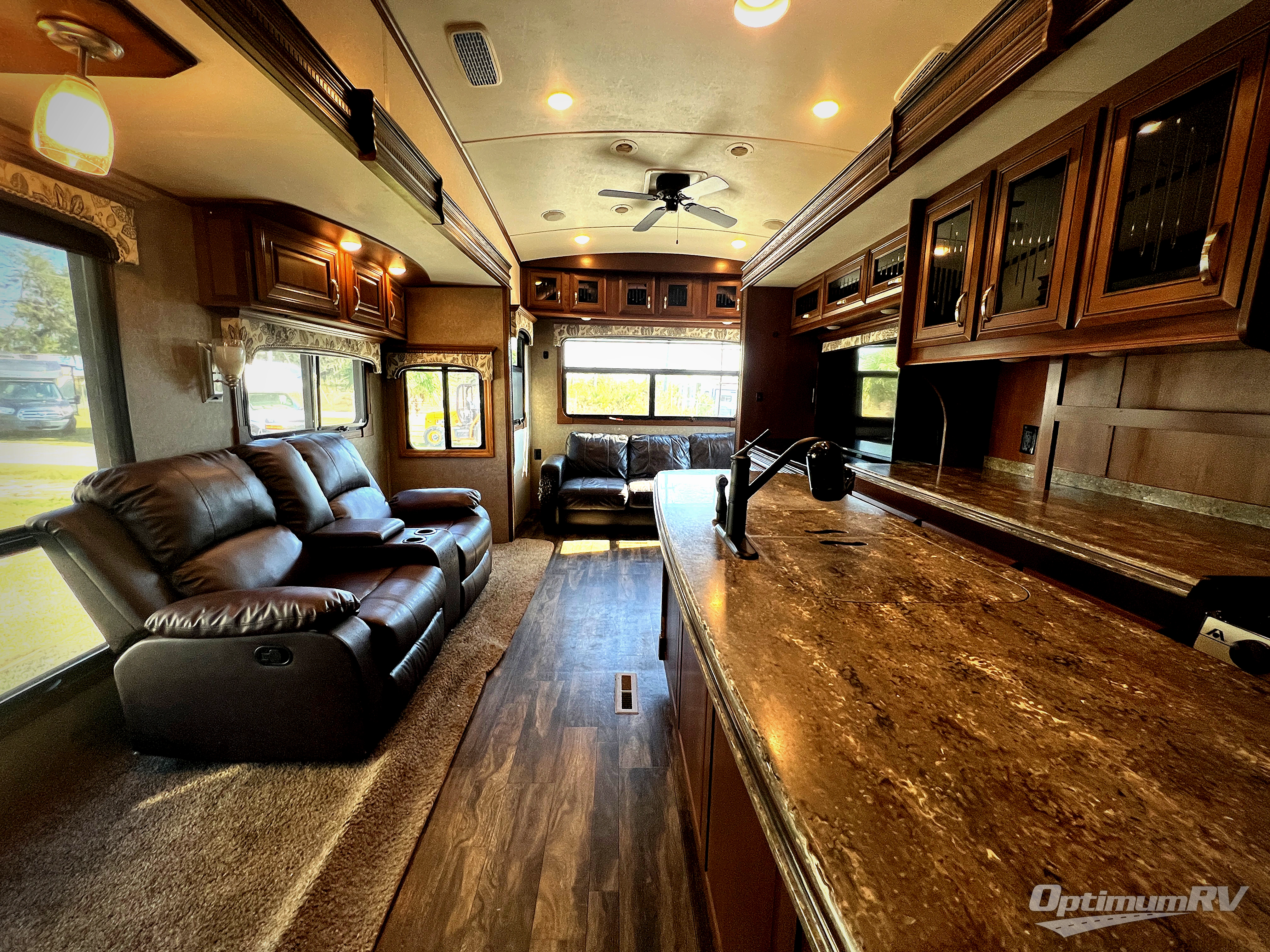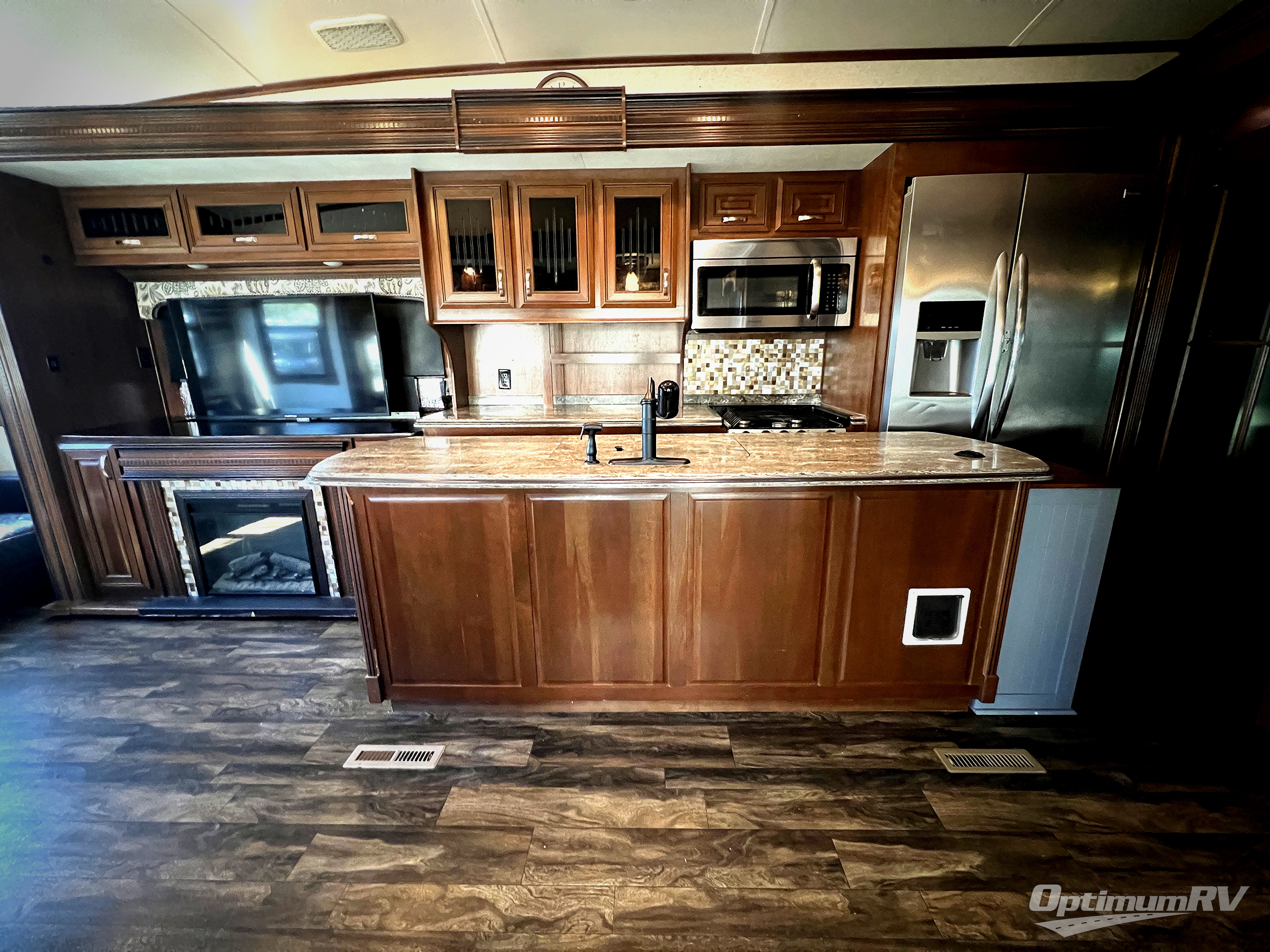 As you enter the fifth wheel, to the left there is a slide out with a free-standing table and chairs which can comfortably seat four people, and a theater sofa or you can choose two recliners in place of the theater sofa. Along the rear wall there is a tri-fold hide-a-bed sofa with an ottoman or choose the optional reclining sofa. The slide out along the road side features an entertainment center with a TV lift and fireplace below, three burner range, microwave, and residential refrigerator or choose an optional 18 cu. ft. refrigerator. Adjacent to the slide you will find a pantry for your canned goods. The kitchen island has a double kitchen sink and extra counter space.