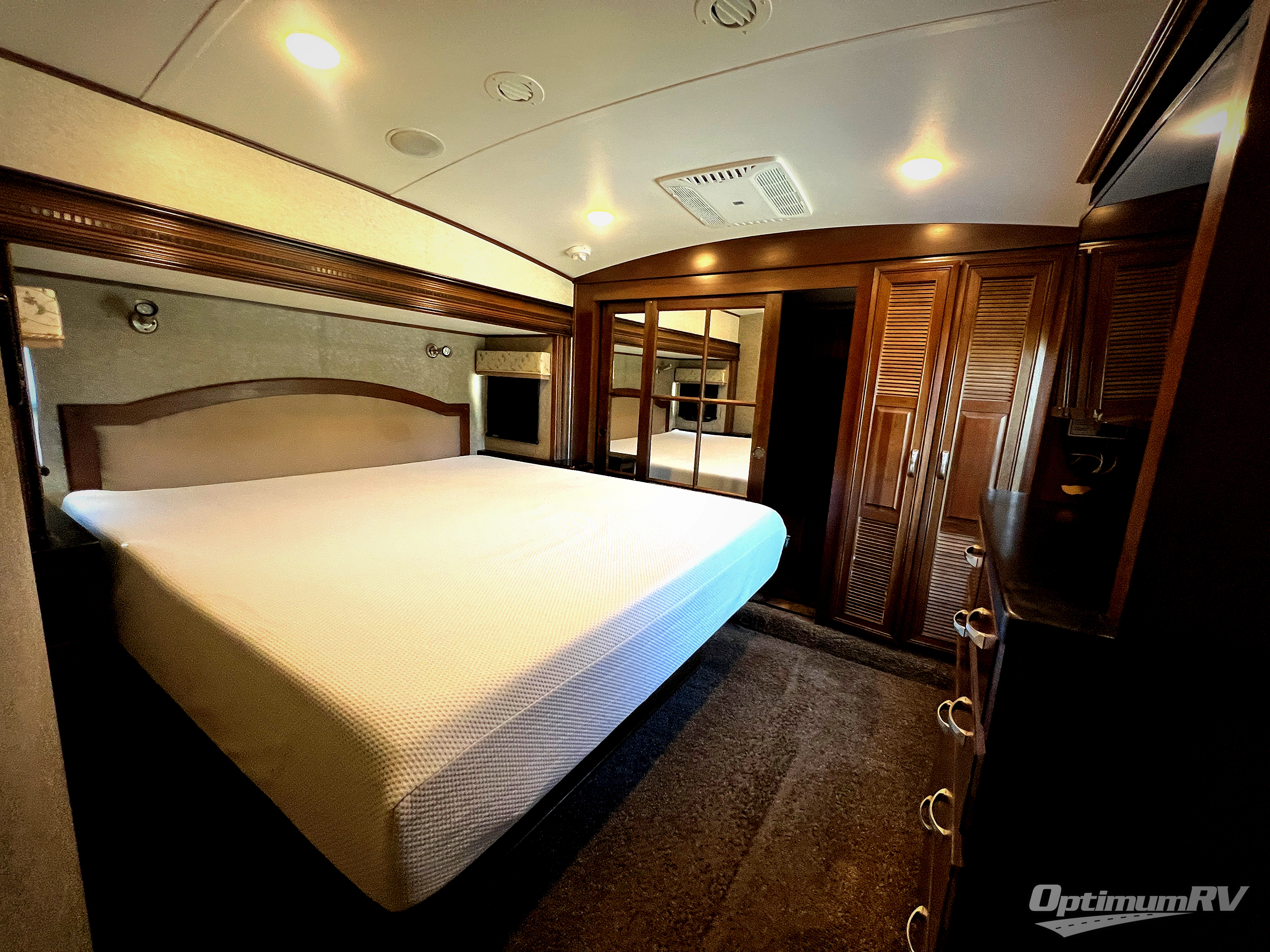 Stepping up the stairs, you will enter into the bedroom. Along one wall you will find a king bed slide out with shelves, or choose an optional queen bed with chests. Along the opposite side of the bedroom there is a chest with a TV.