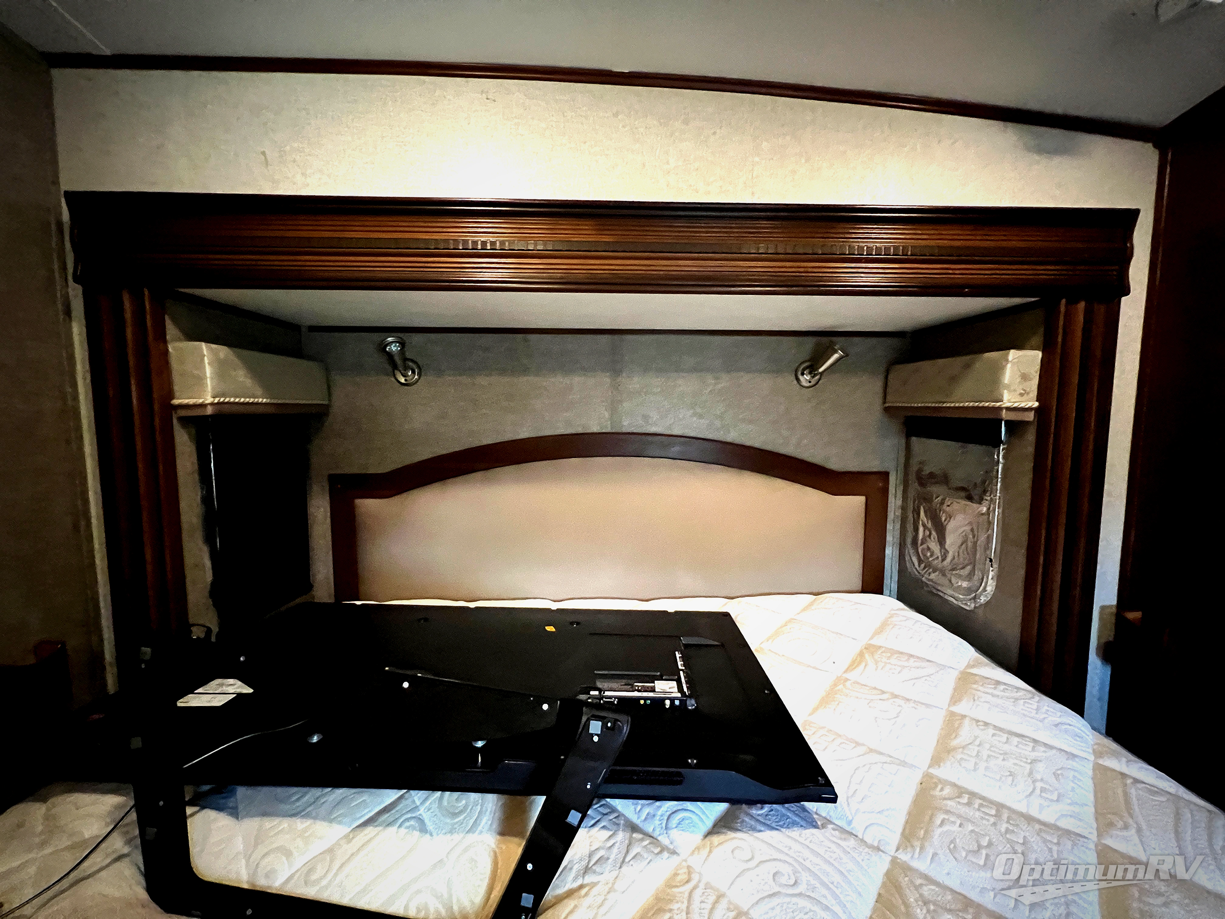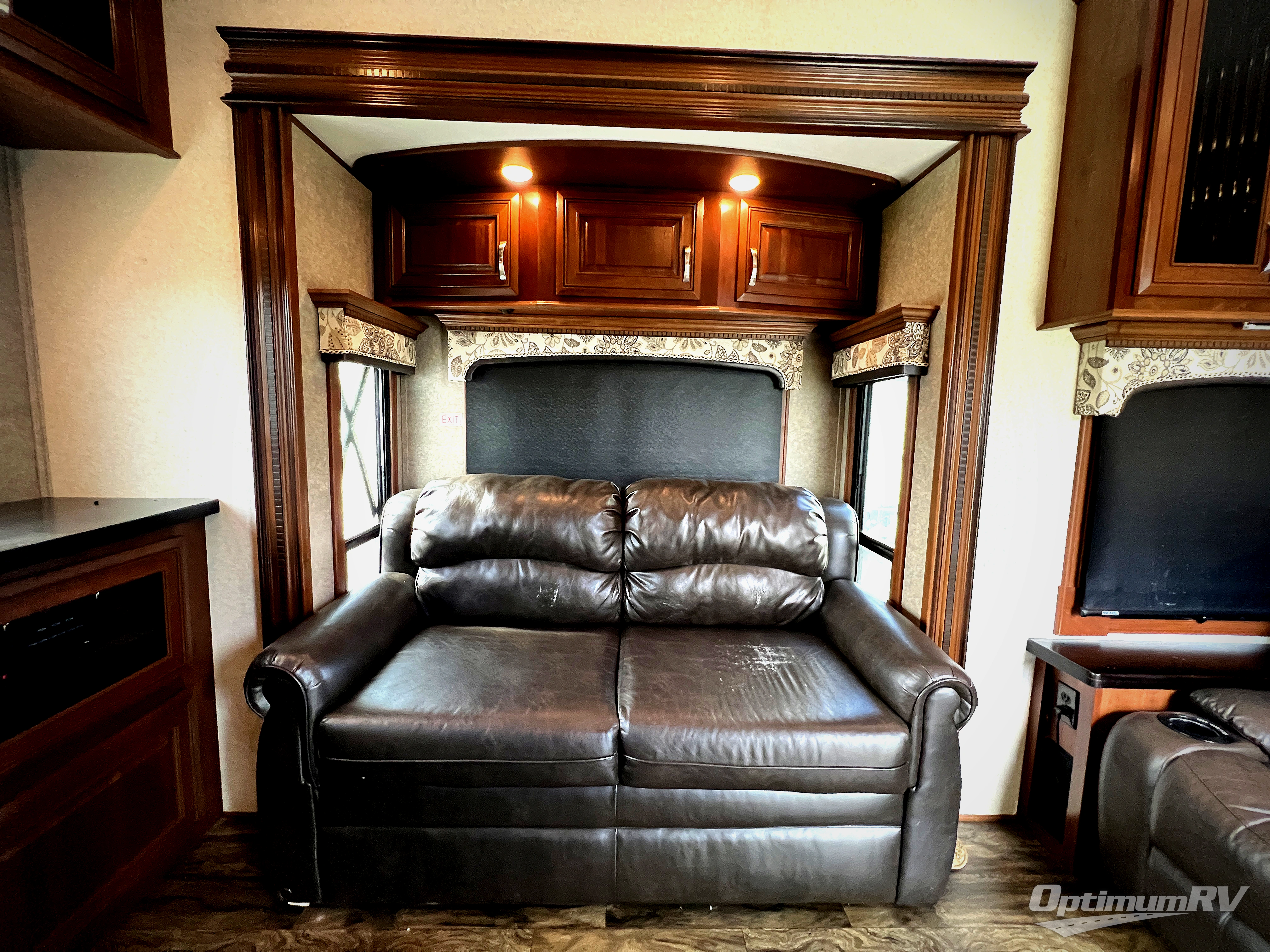 Start out by entering the rear most side 60" glass patio door. This leads to the rear living area where your family and friends will enjoy hanging out. Here you will find dual opposing slide out hide-a-bed sofas. One is a bi-fold, the other a tri-fold. There is also a theater sofa along the interior of this room plus an ottoman, so come on in and put your feet up. Along the rear wall find a full entertainment center with fireplace below. The TV lifts up when viewing and can easily glide down out of site when not in use. You will also love all of the overhead storage throughout the space.