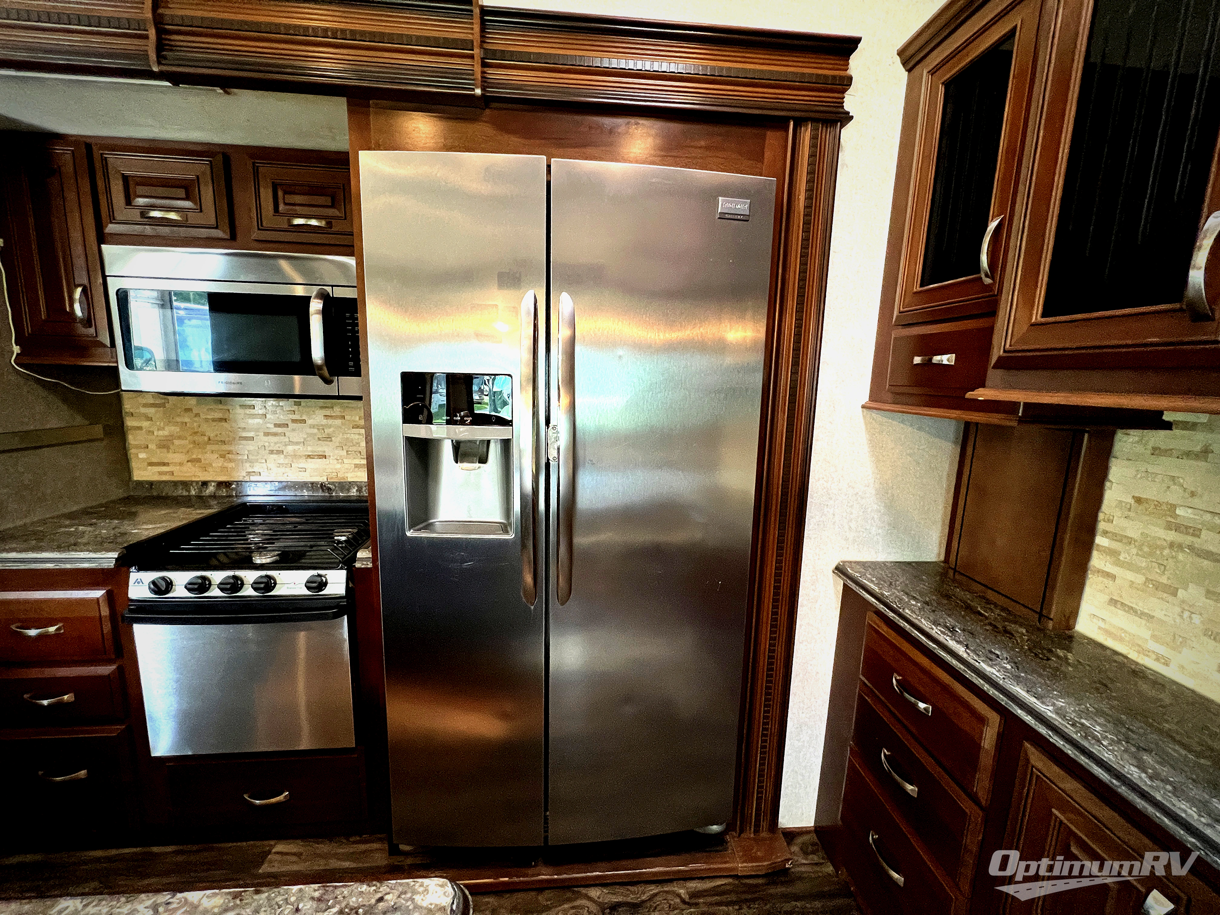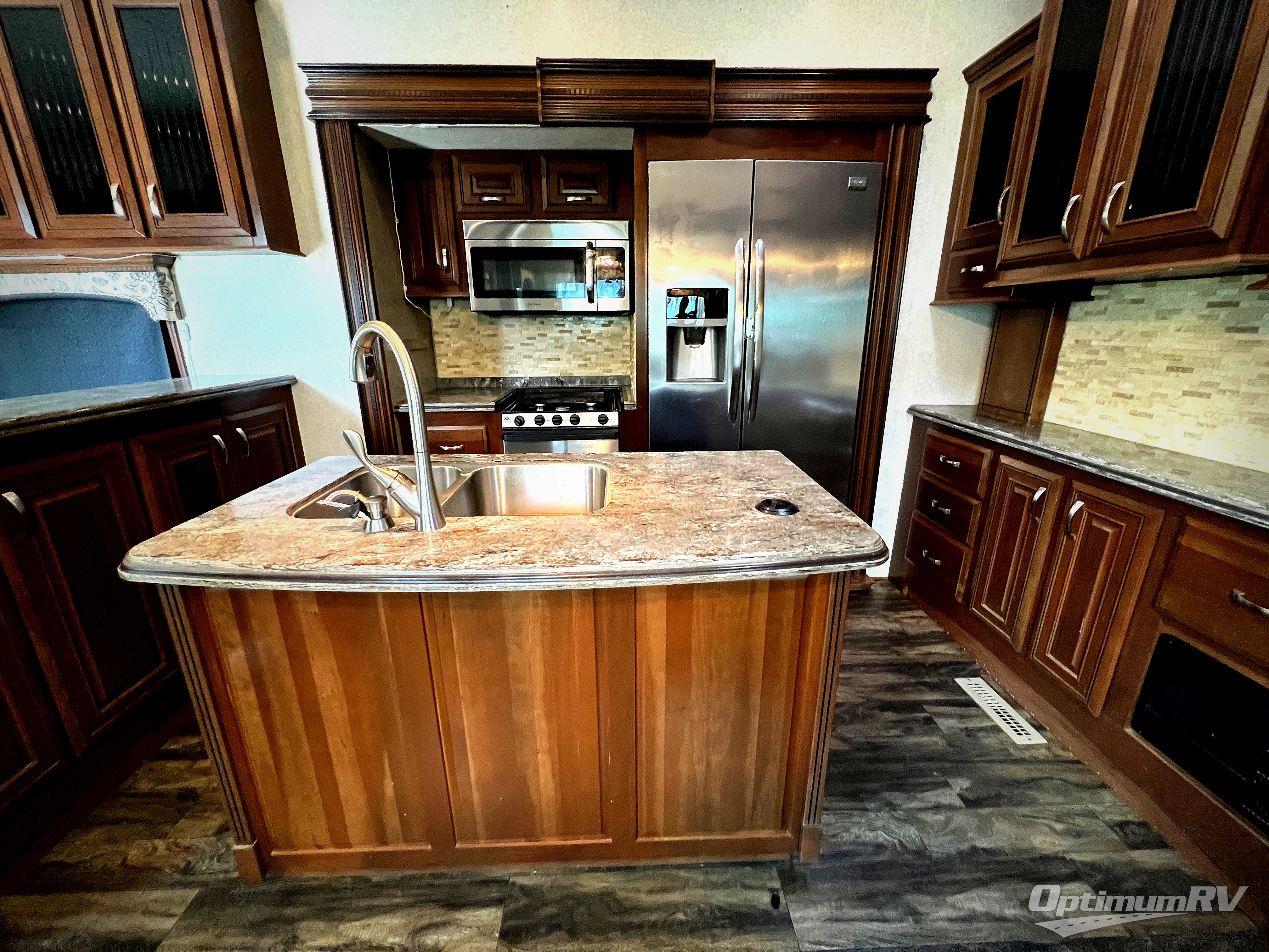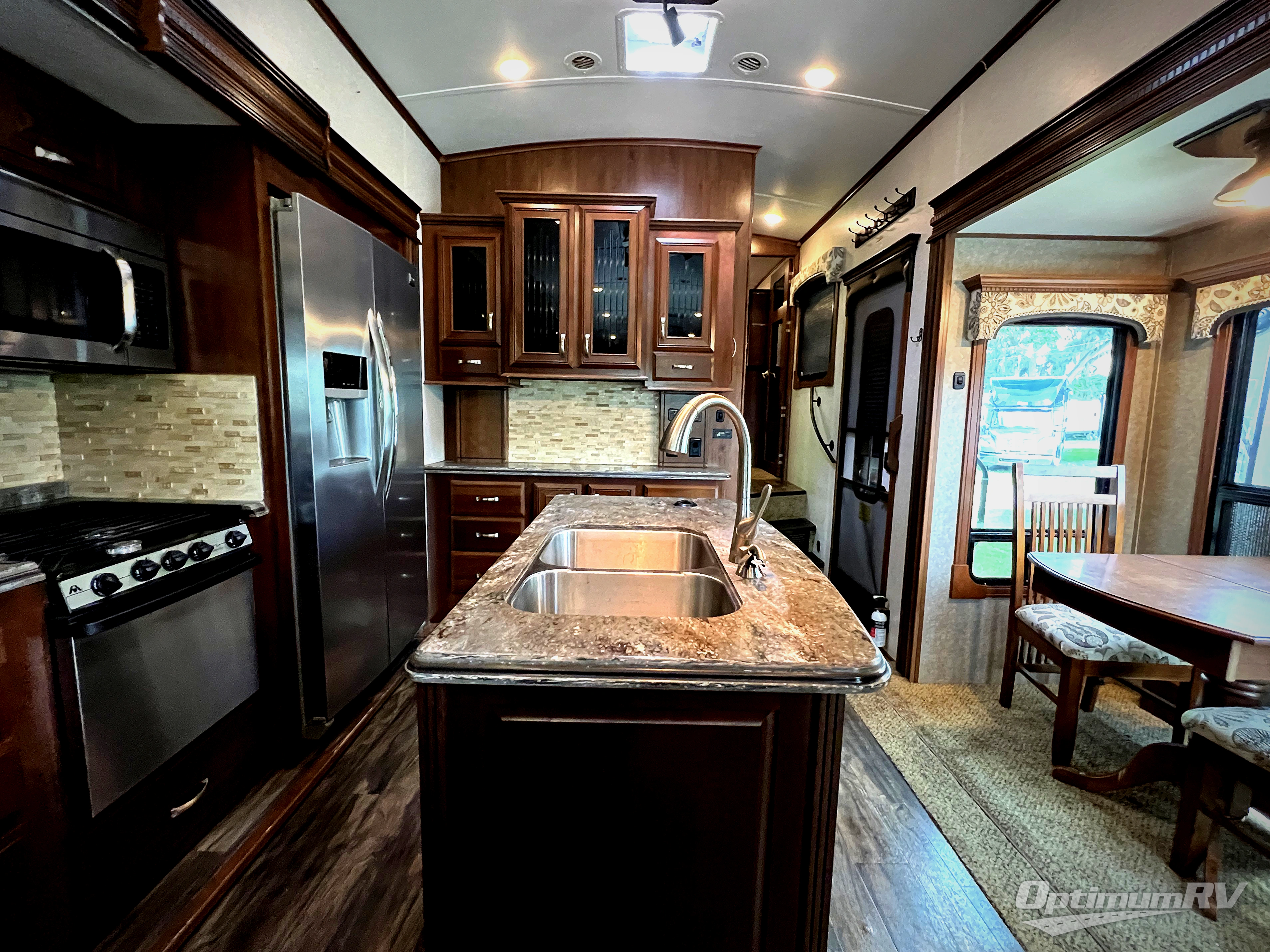 Head right through those same patio doors into a spacious kitchen area that will feel just like home. This too features dual opposing slide outs to create a wide open space. There is a slide out dinette for four along the curb side, a bar top with storage beneath along the interior rear space, and a bank of cabinets along the interior front wall. Along the road side find a slide out residential refrigerator, or choose an 18 cu. ft. option, a three burner range with overhead microwave oven, and a bit of counter space. There is more counter prep space at the kitchen island which also includes a double sink.