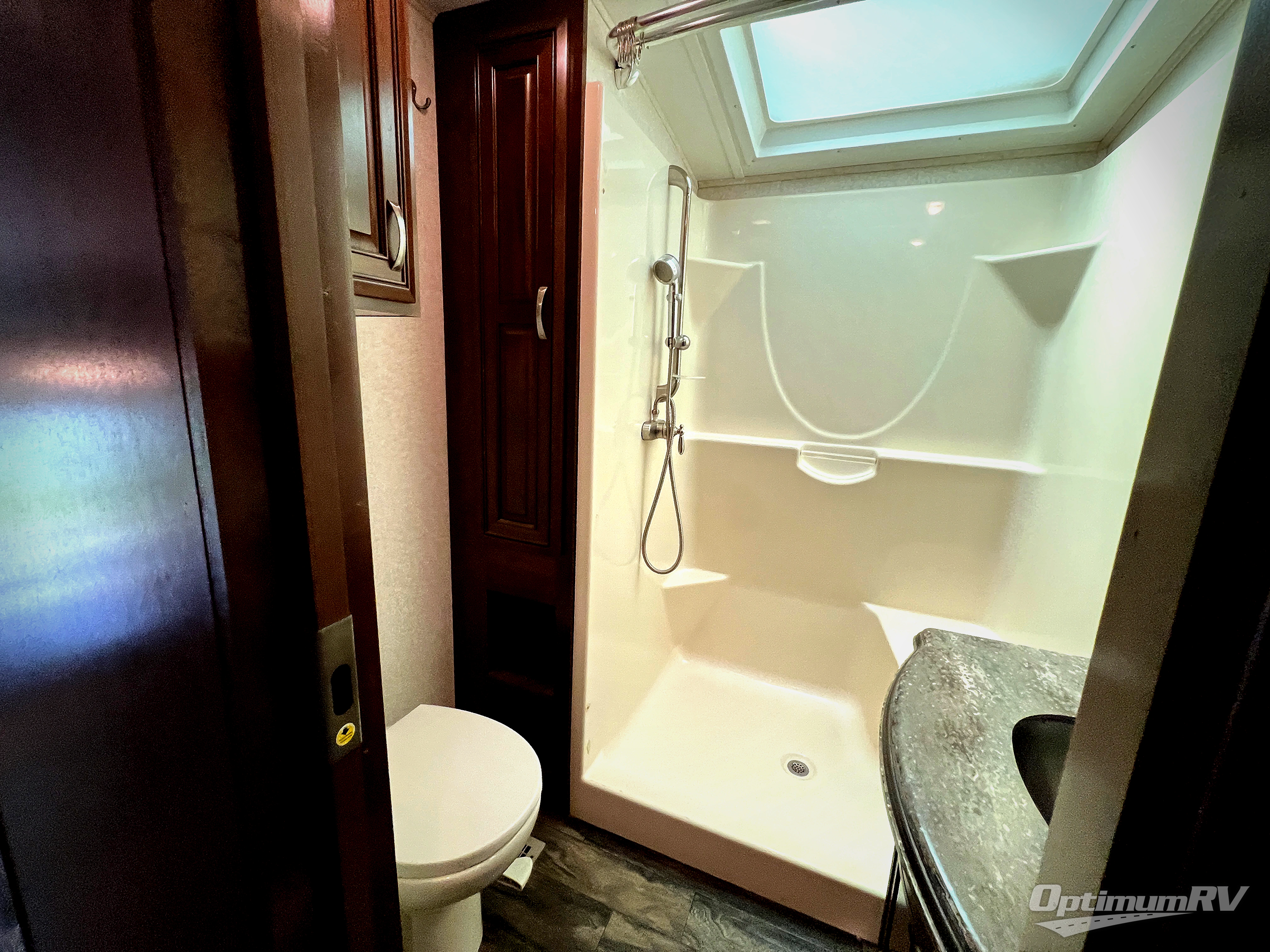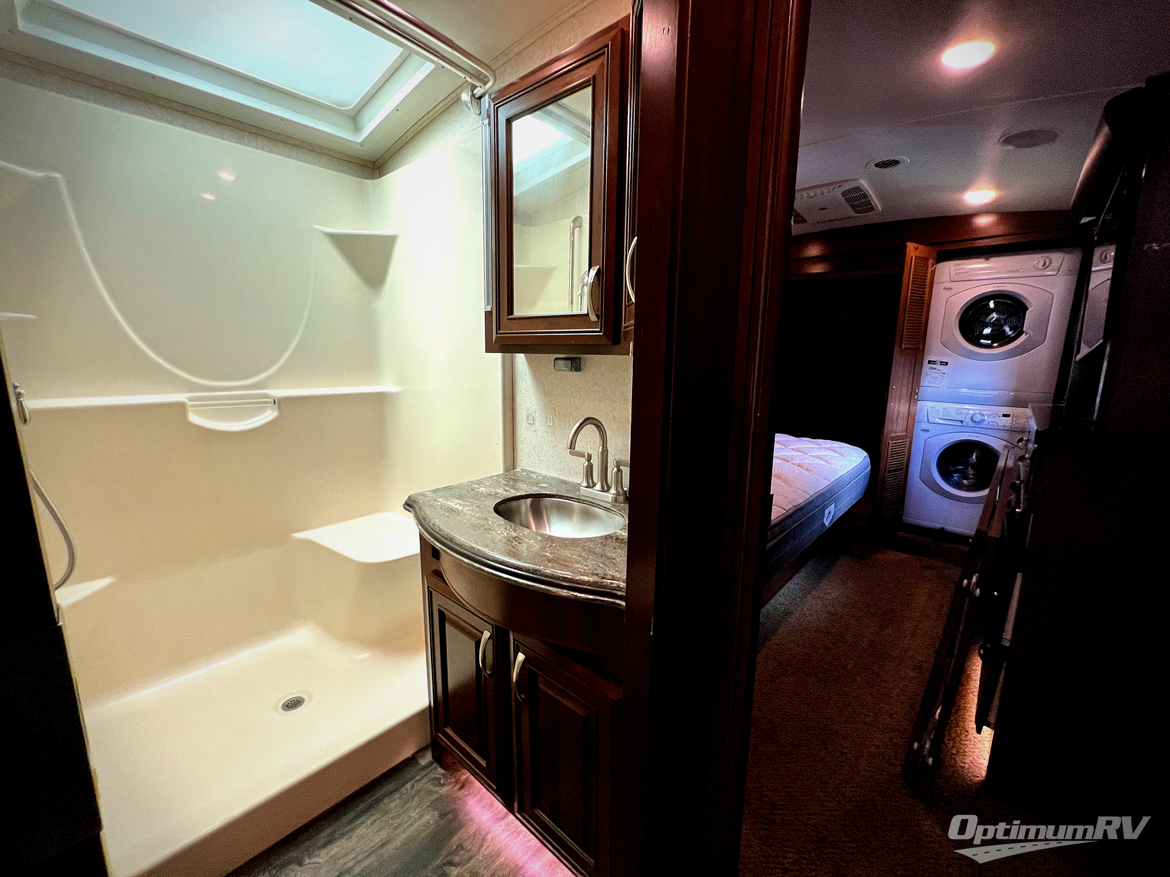 Head up the steps just to the right of the front most side entry door. Here you will find a complete bath on your left that includes a 36" wide shower, toilet, and a vanity with sink and overhead storage. You will also find a linen cabinet for your towels and toiletries.